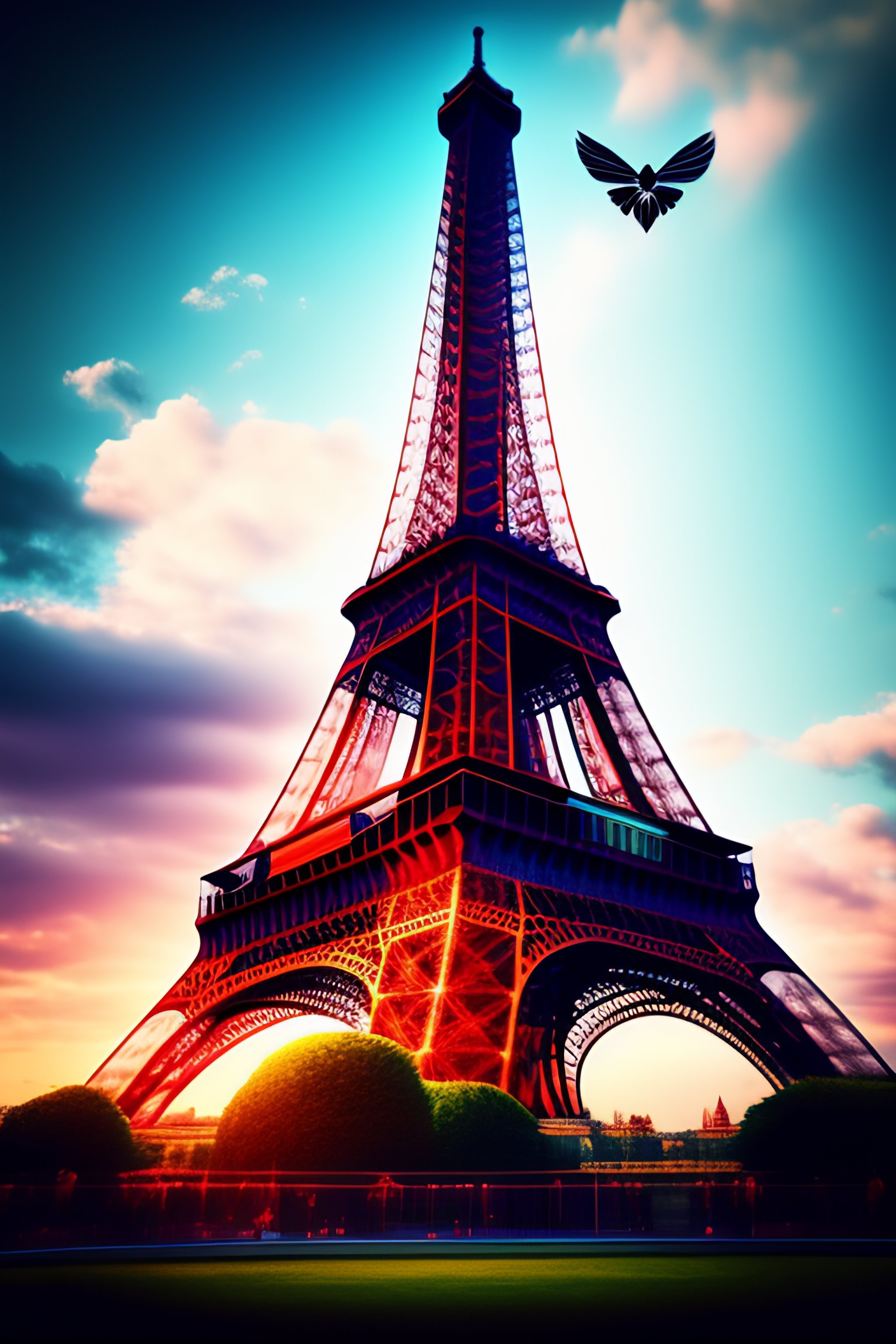 The eiffel tower with spiderman swinging from it