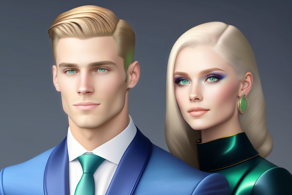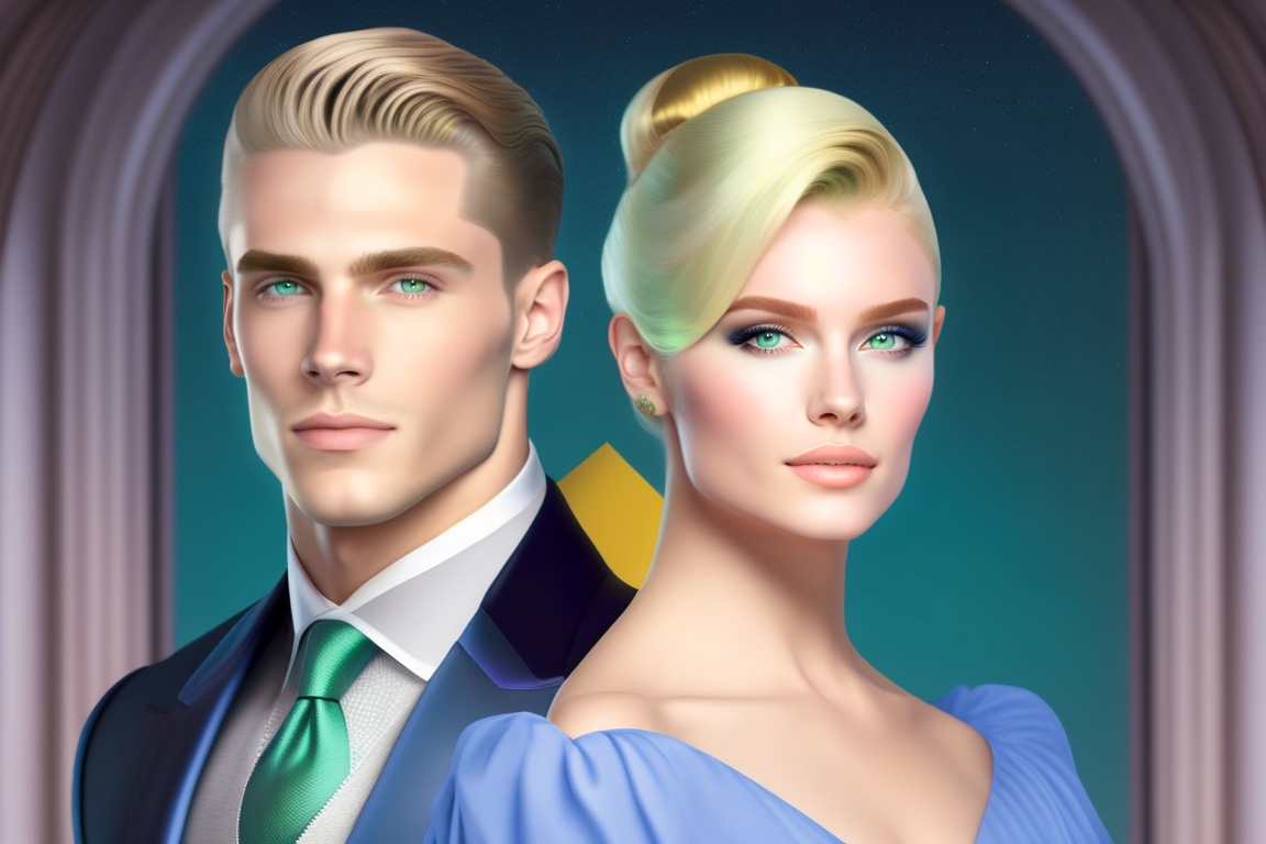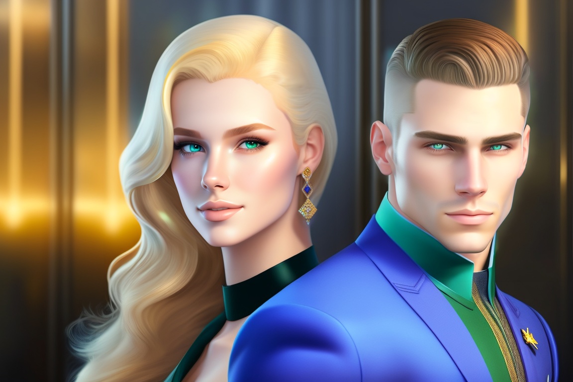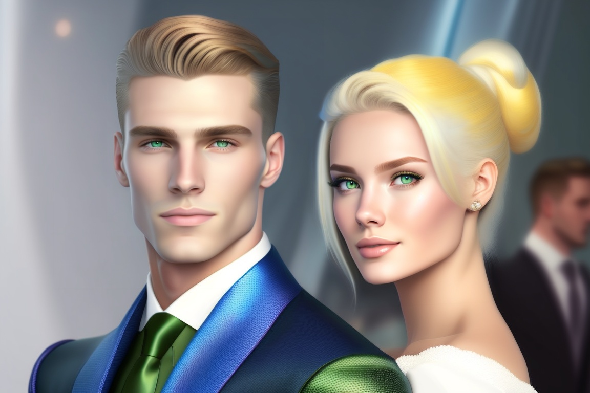 A white young man with green eyes, handsome, with a slicked-back hairstyle, and sitting next to a white girl with blue eyes, wearing a blue dress, and yellow hair