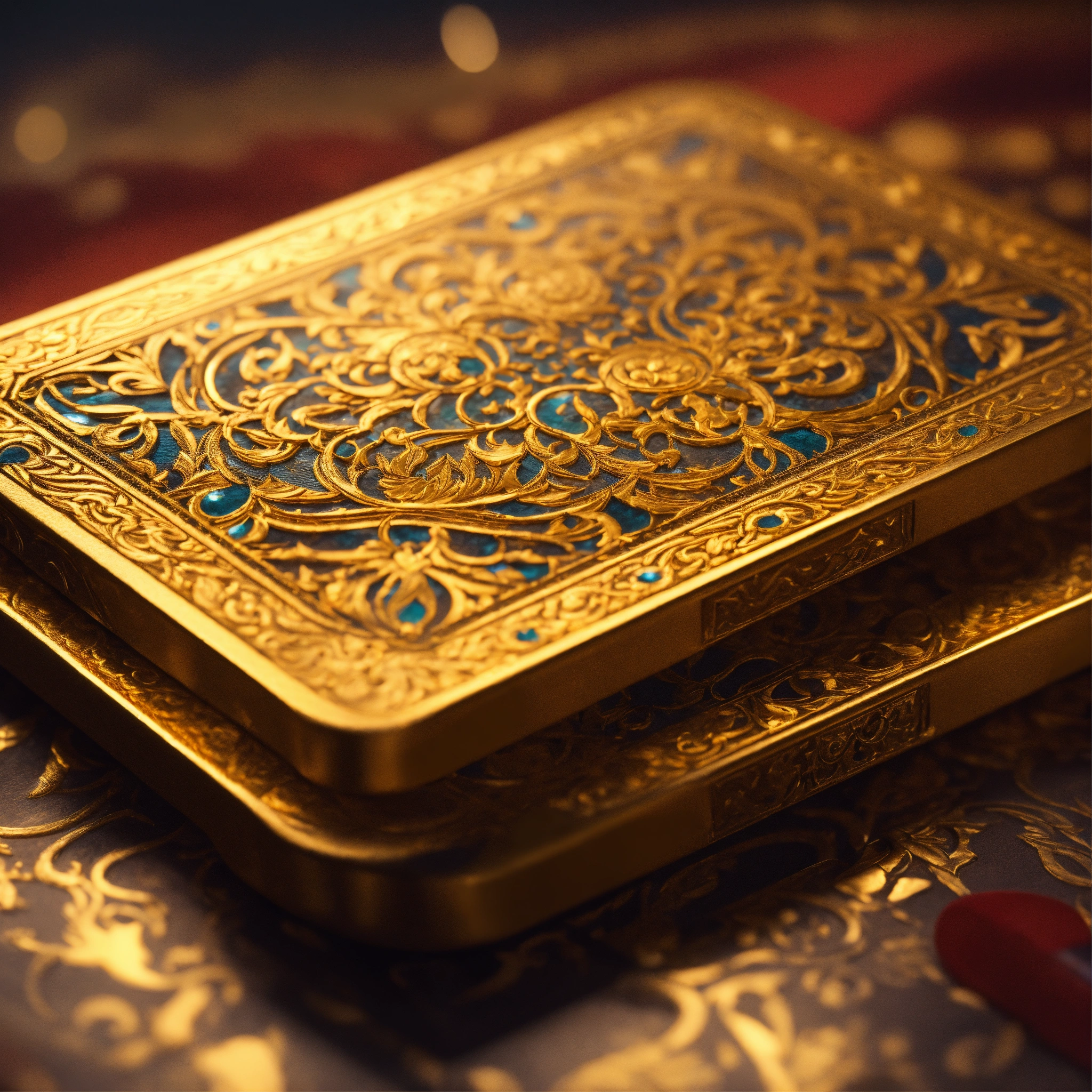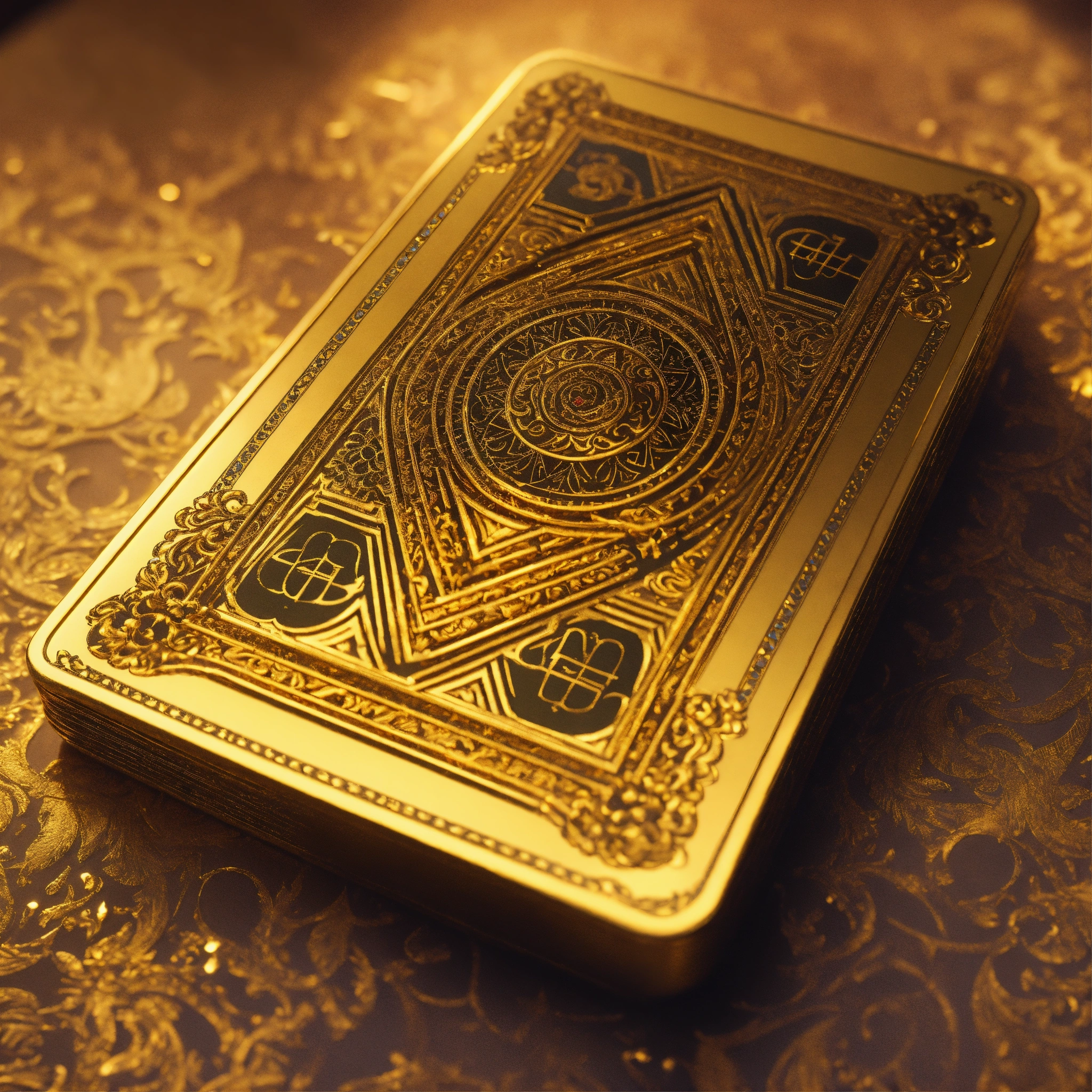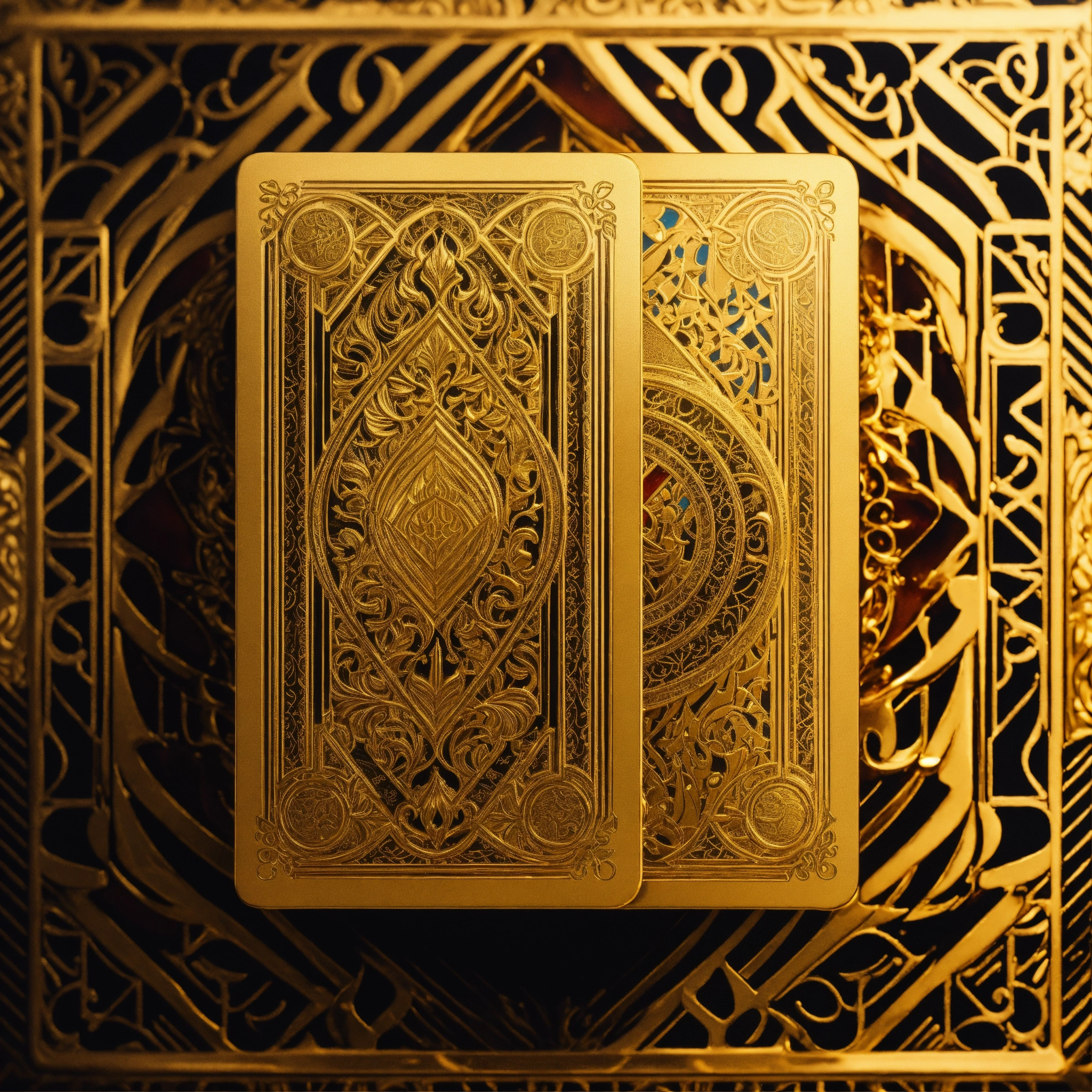 Two gold playing cards face down with an arabic pattern (pixar art style)++ highly detailed digital painting, art stations, concept art, soft focus, hard focus, illustrations. cinematic, visual effects, hdr, unreal engine 5, ray tracing, soft light, 8k, high detail, sparkling backlighting, luxury gem, game art, 3d, cartoon, colorful, magical, mysterious