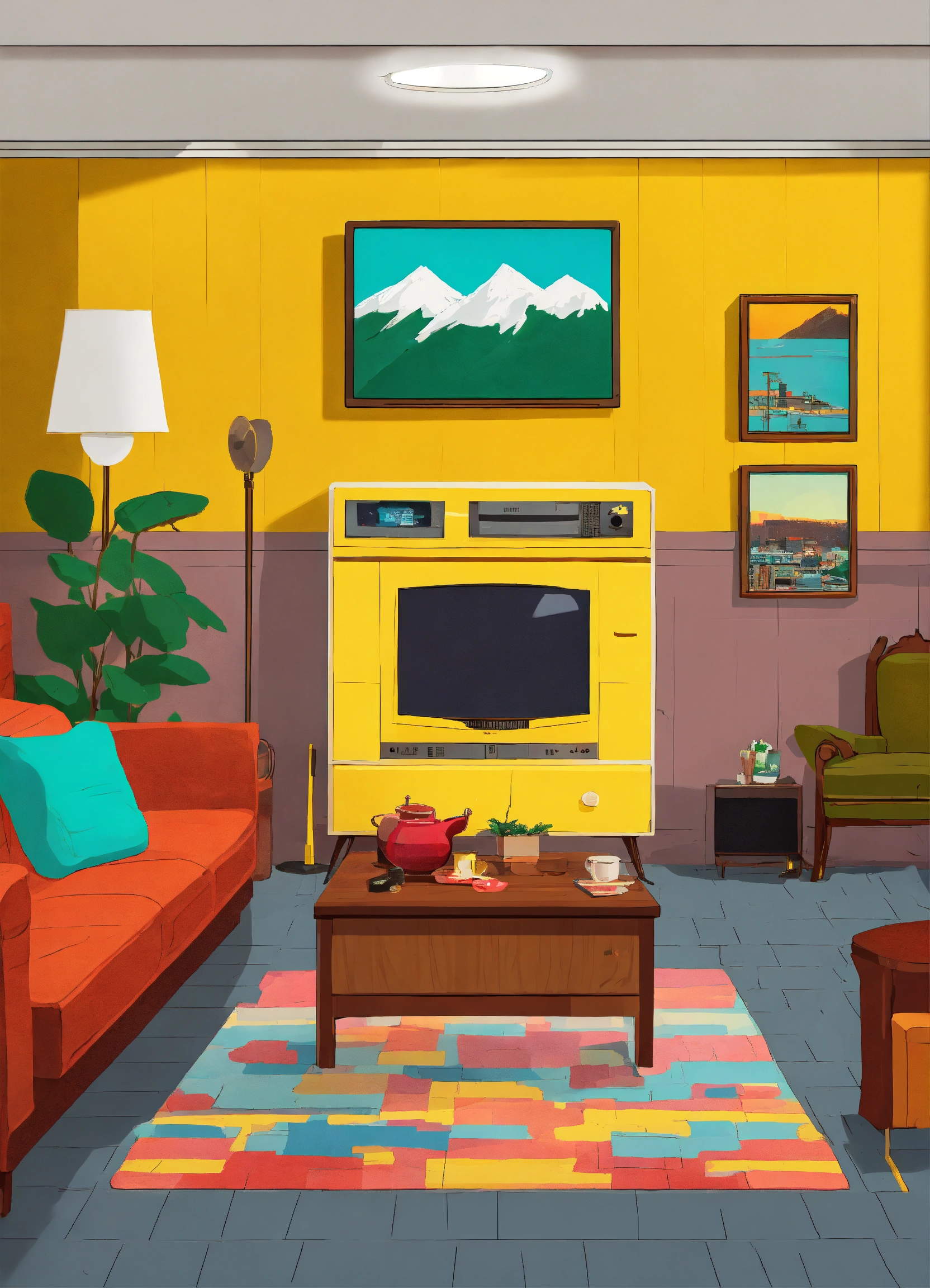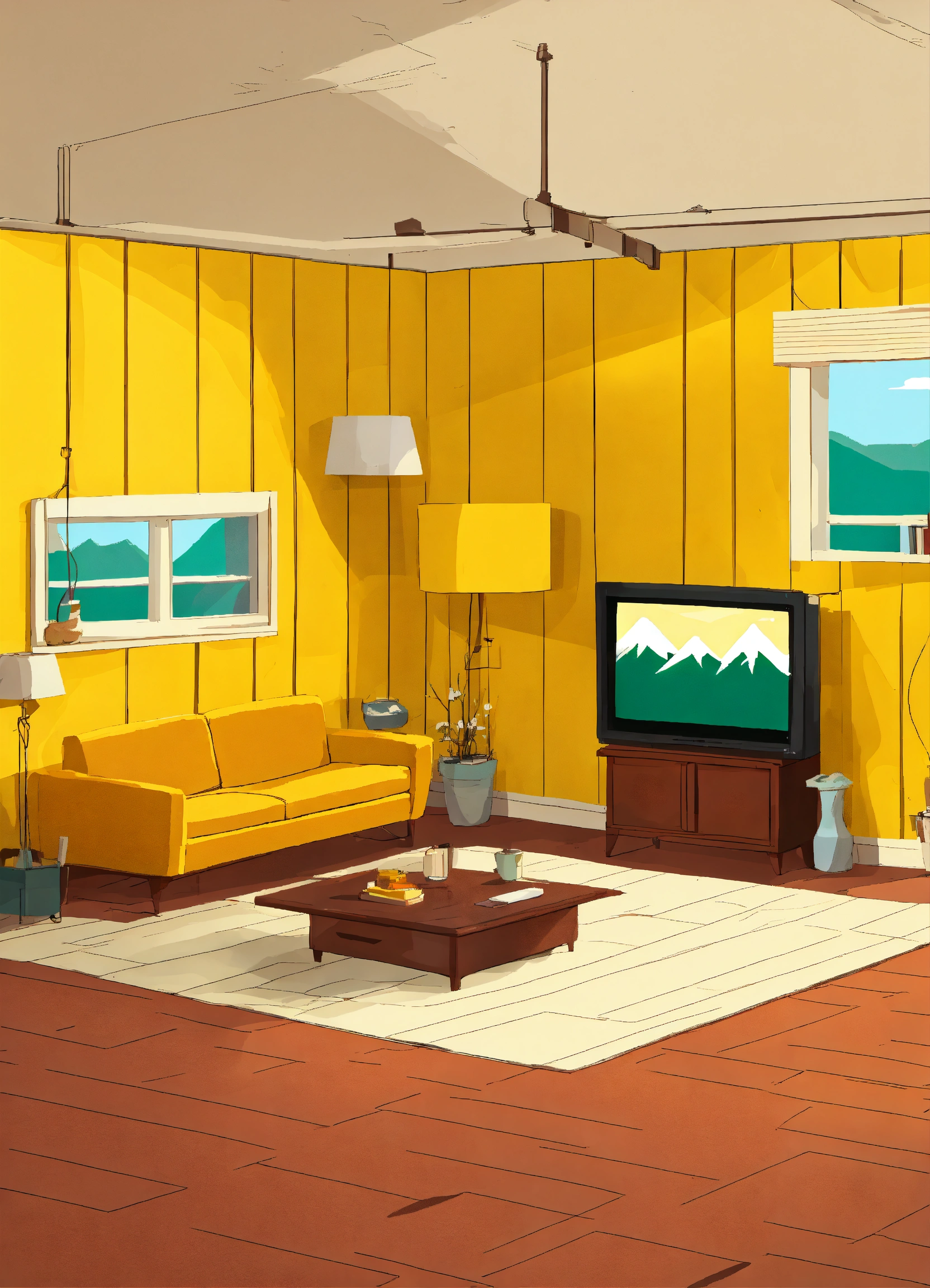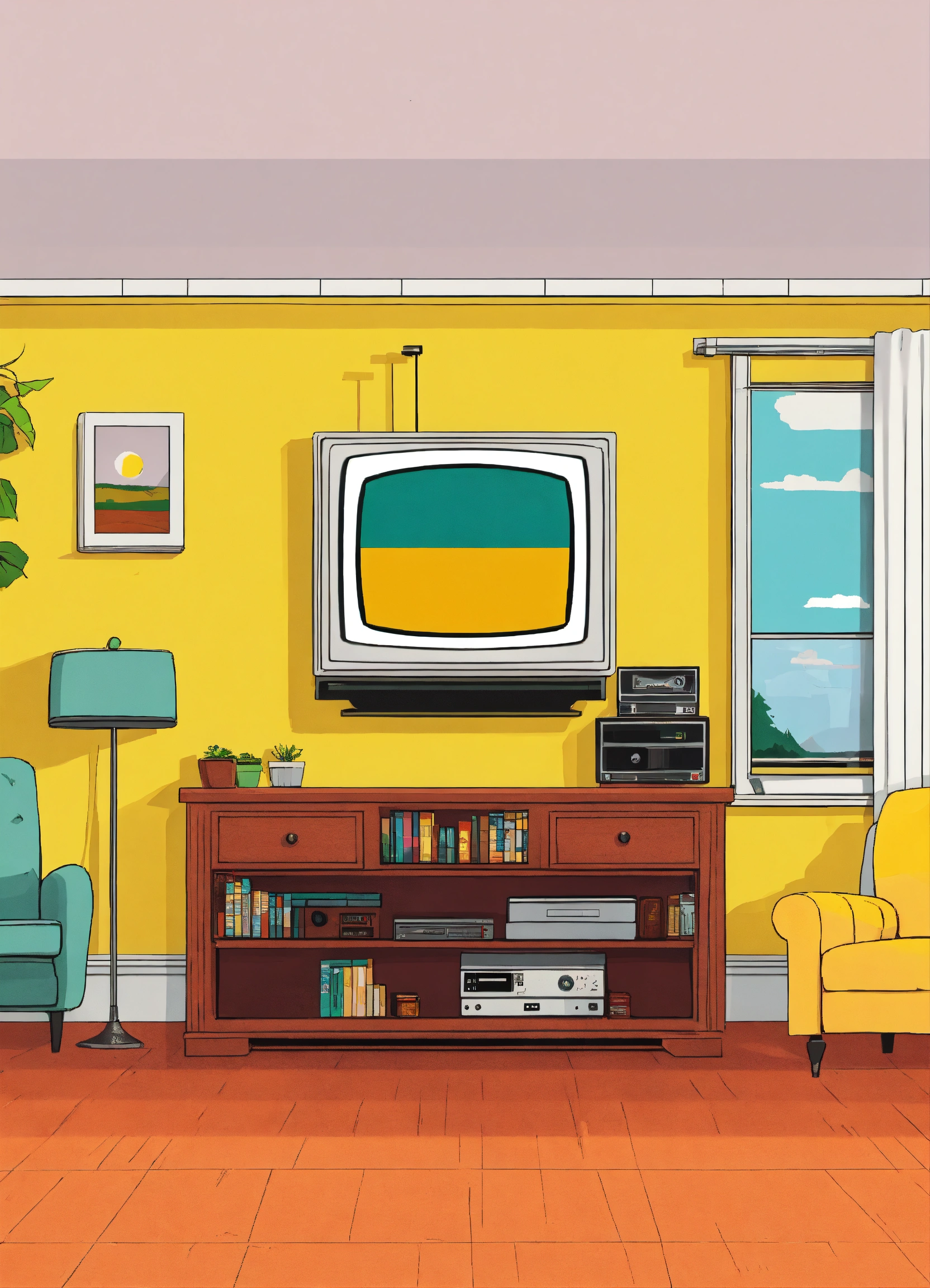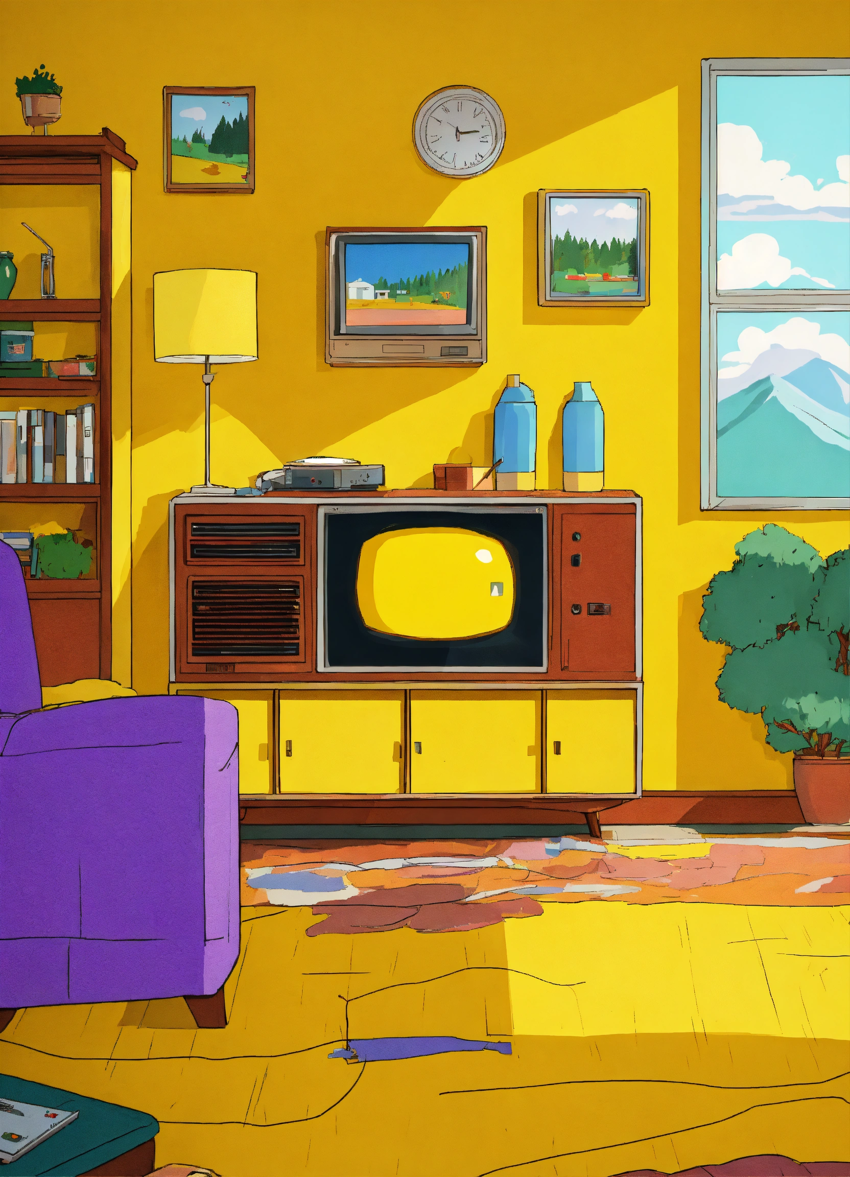 2d yellow and white background in the style of south park of a tv in a 1980's style living room