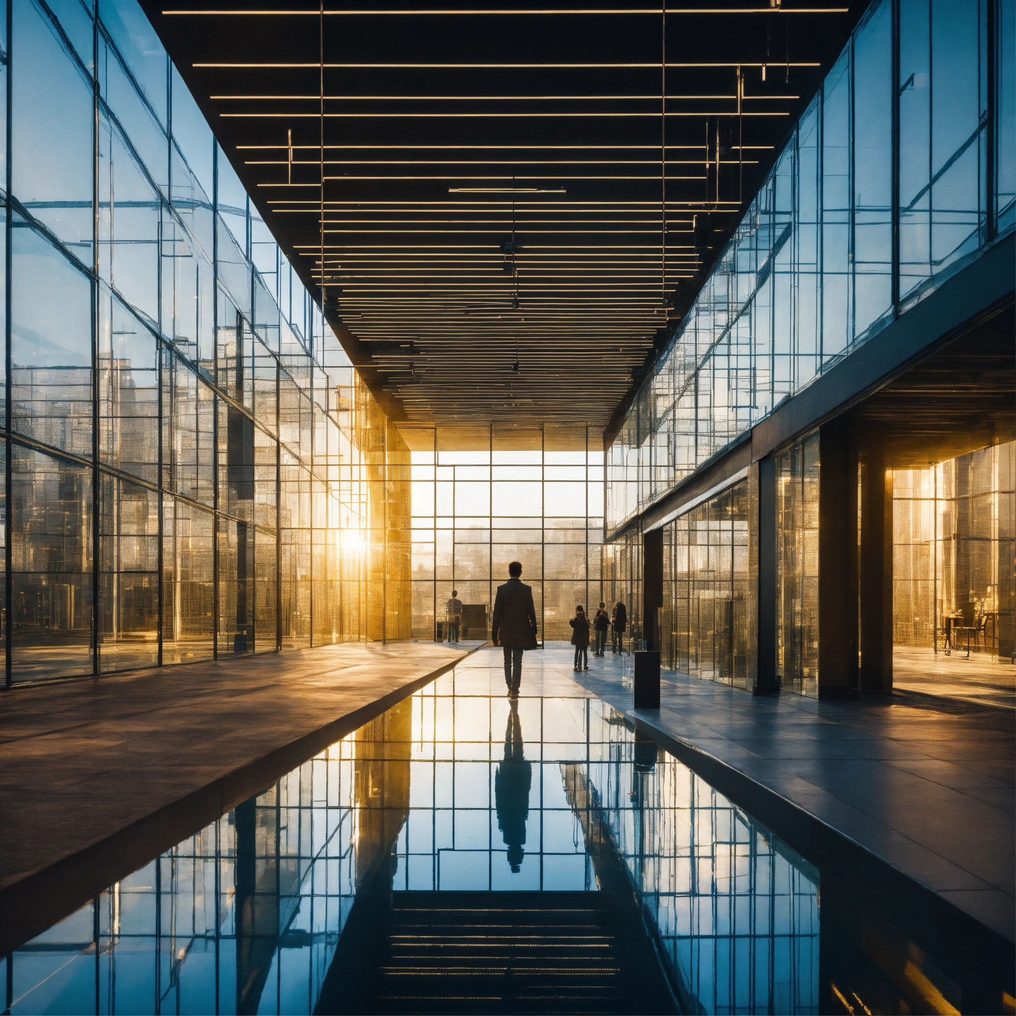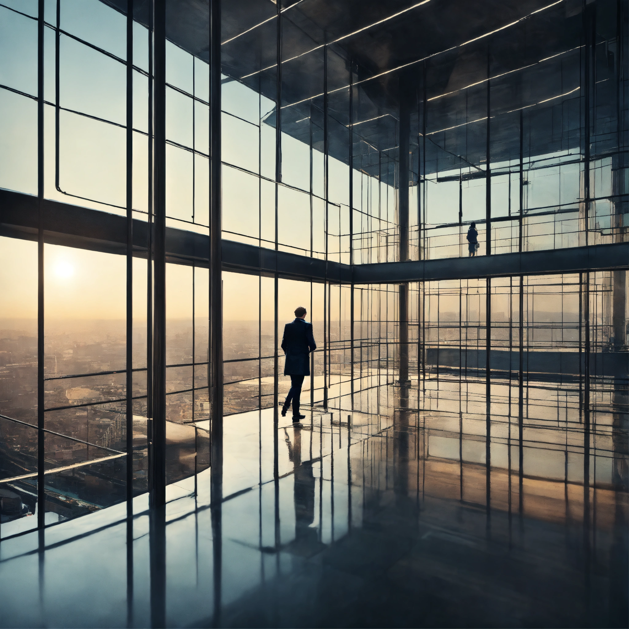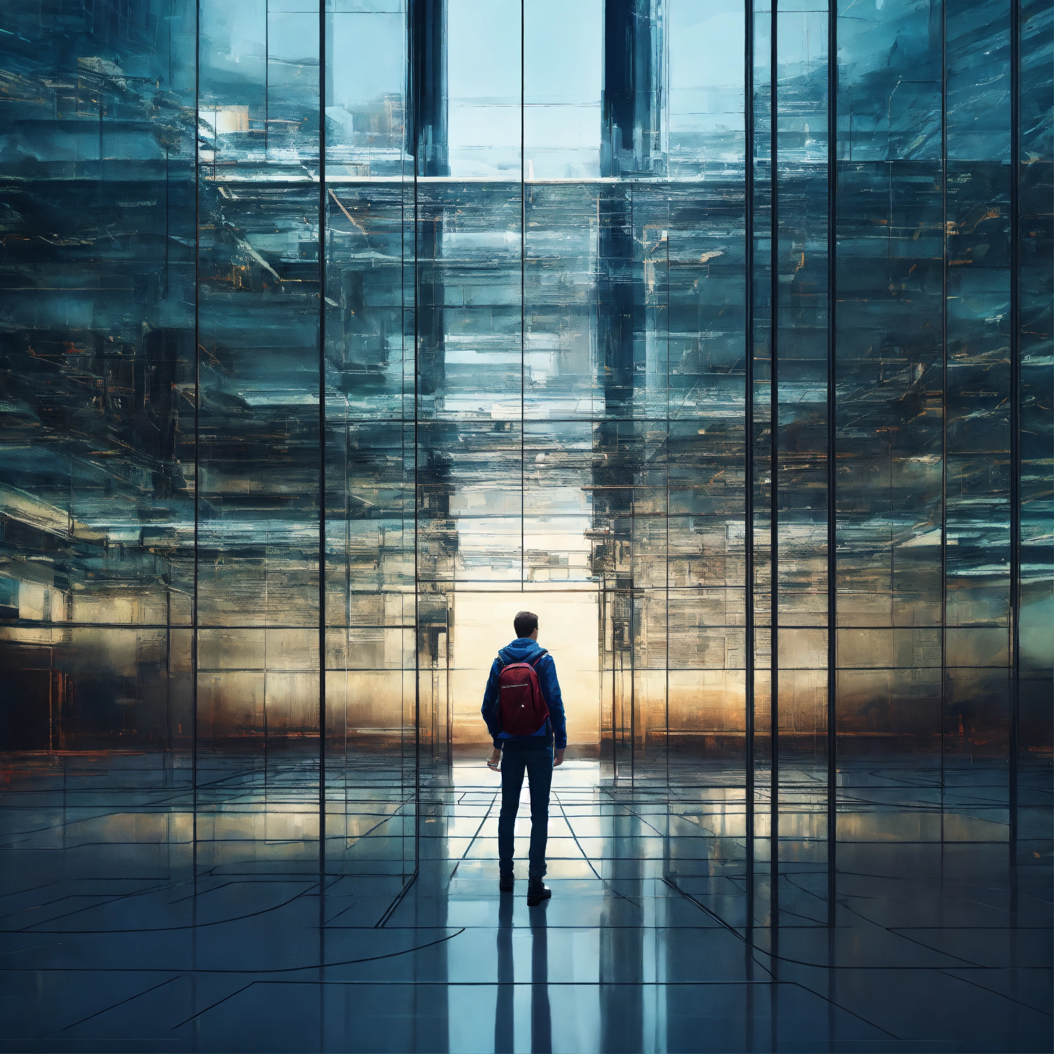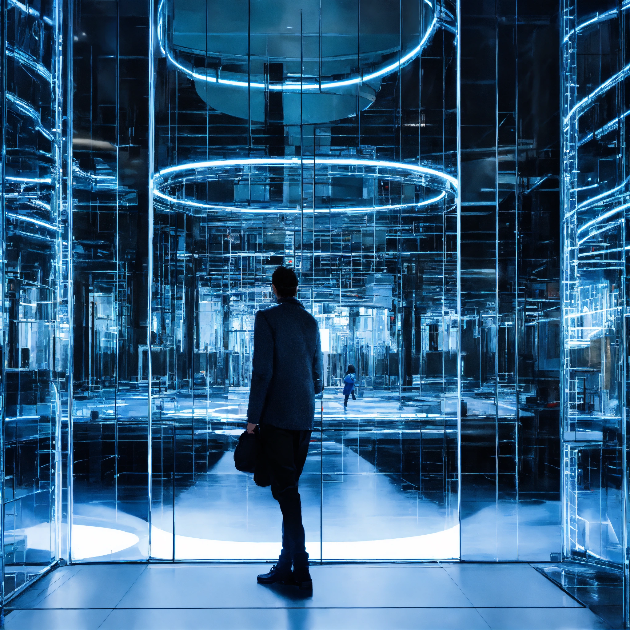 Person in the labyrinth high glass walls modern hightech