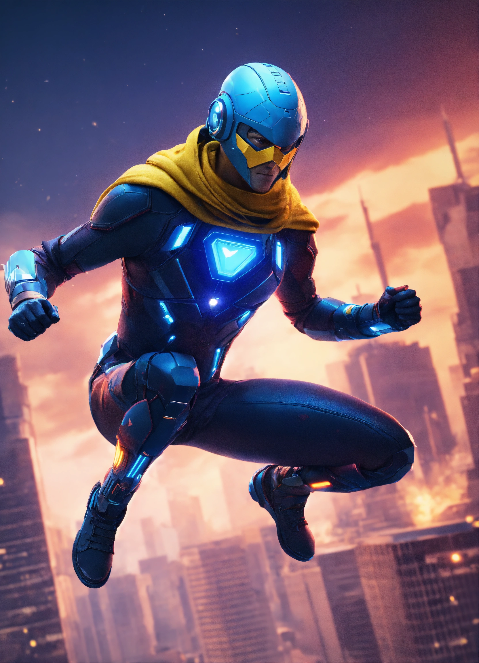 An futuristic superhero jumping over the world, 3d godot engine, ultra widescreen, acid colors, focus detailed