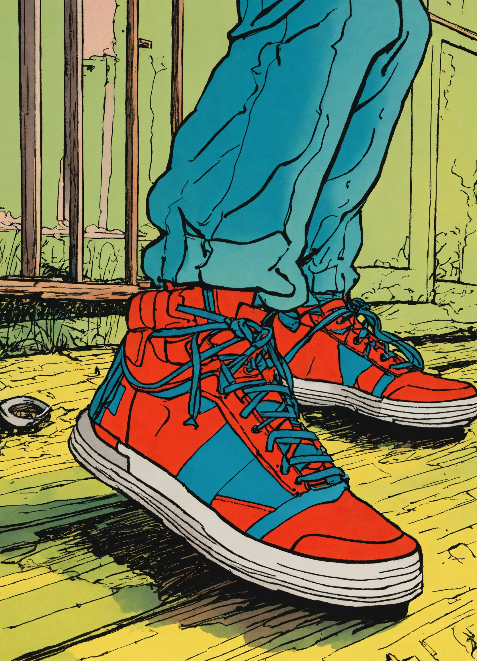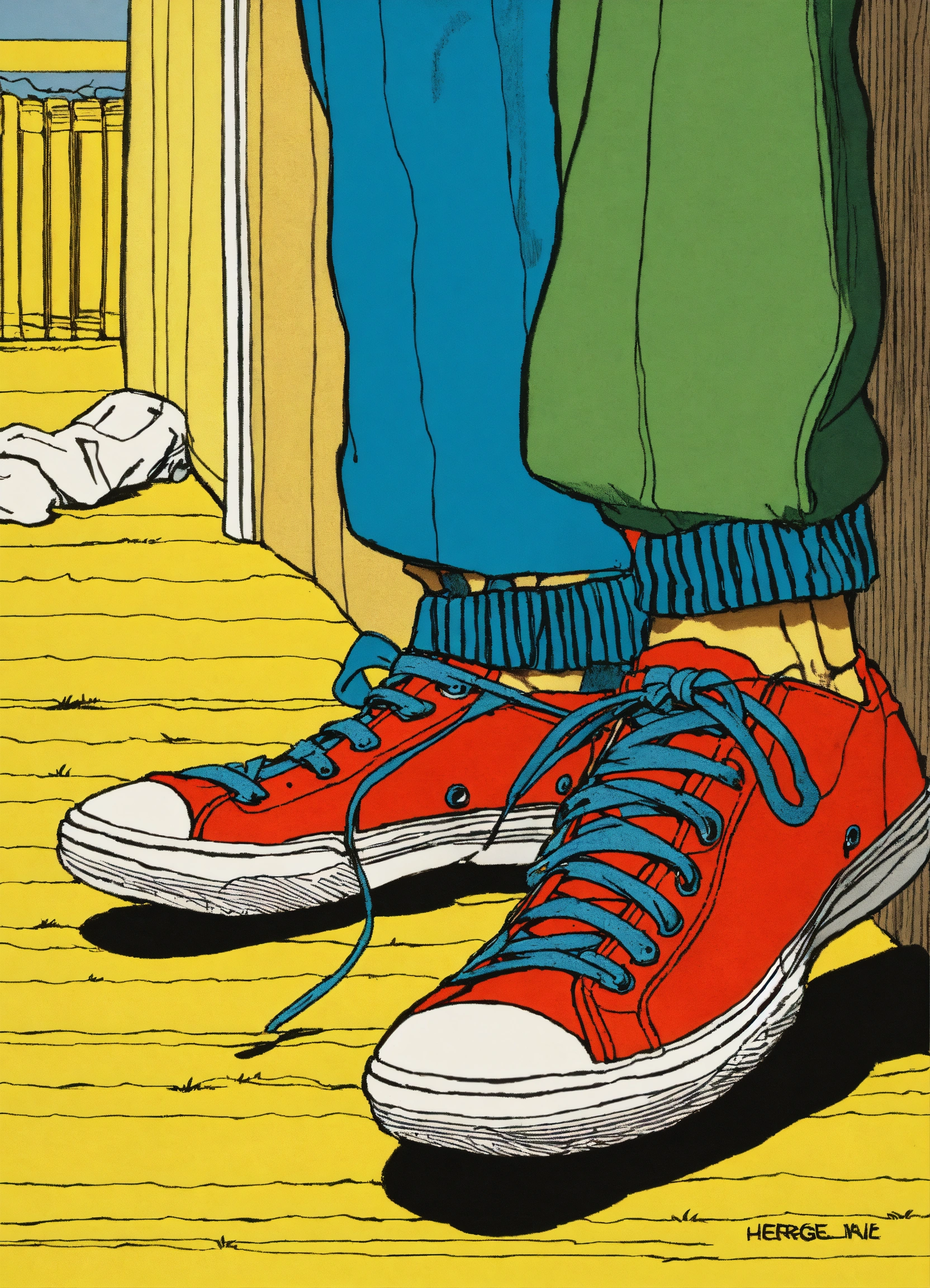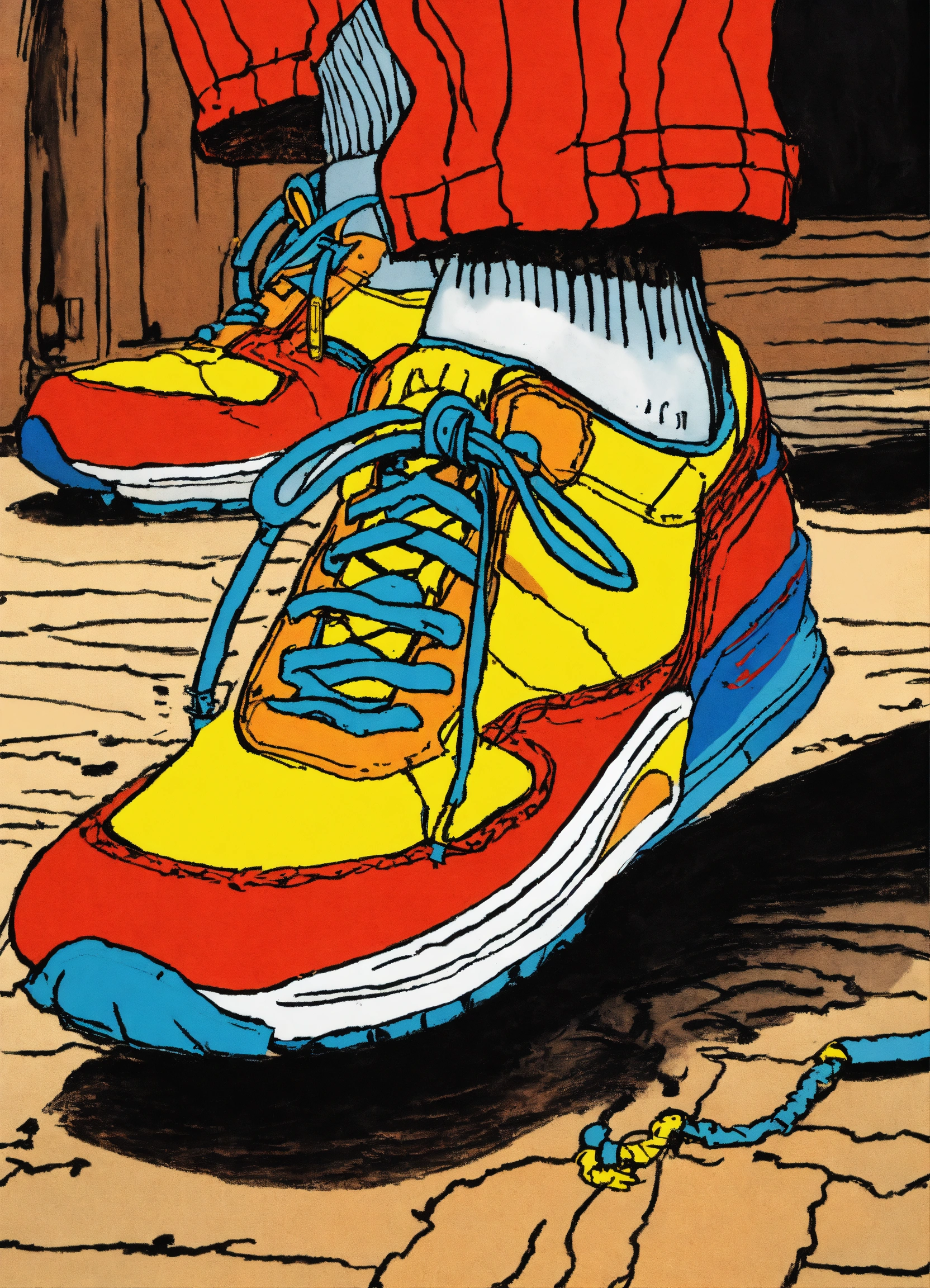 Pen and ink, illustrated by hergé, a close-up shot of an old man's running shoes, the laces are tightened up as he gets ready to run. sad, vibrant and bold colors, masterpiece
