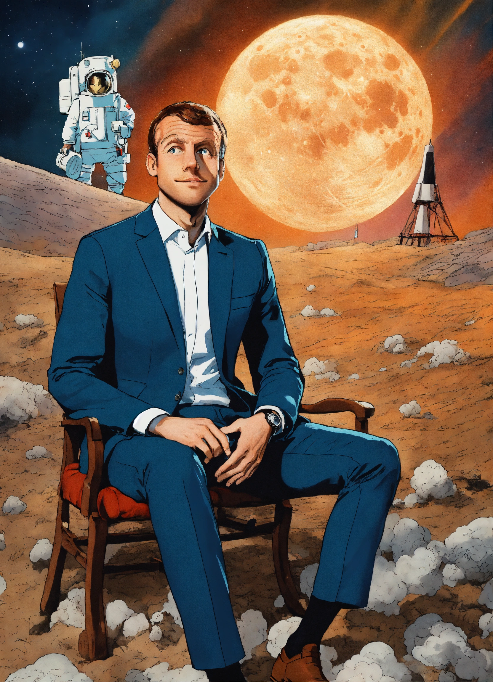 Emmanuel macron who is on the cover of the tintin cartoon going to the moon
