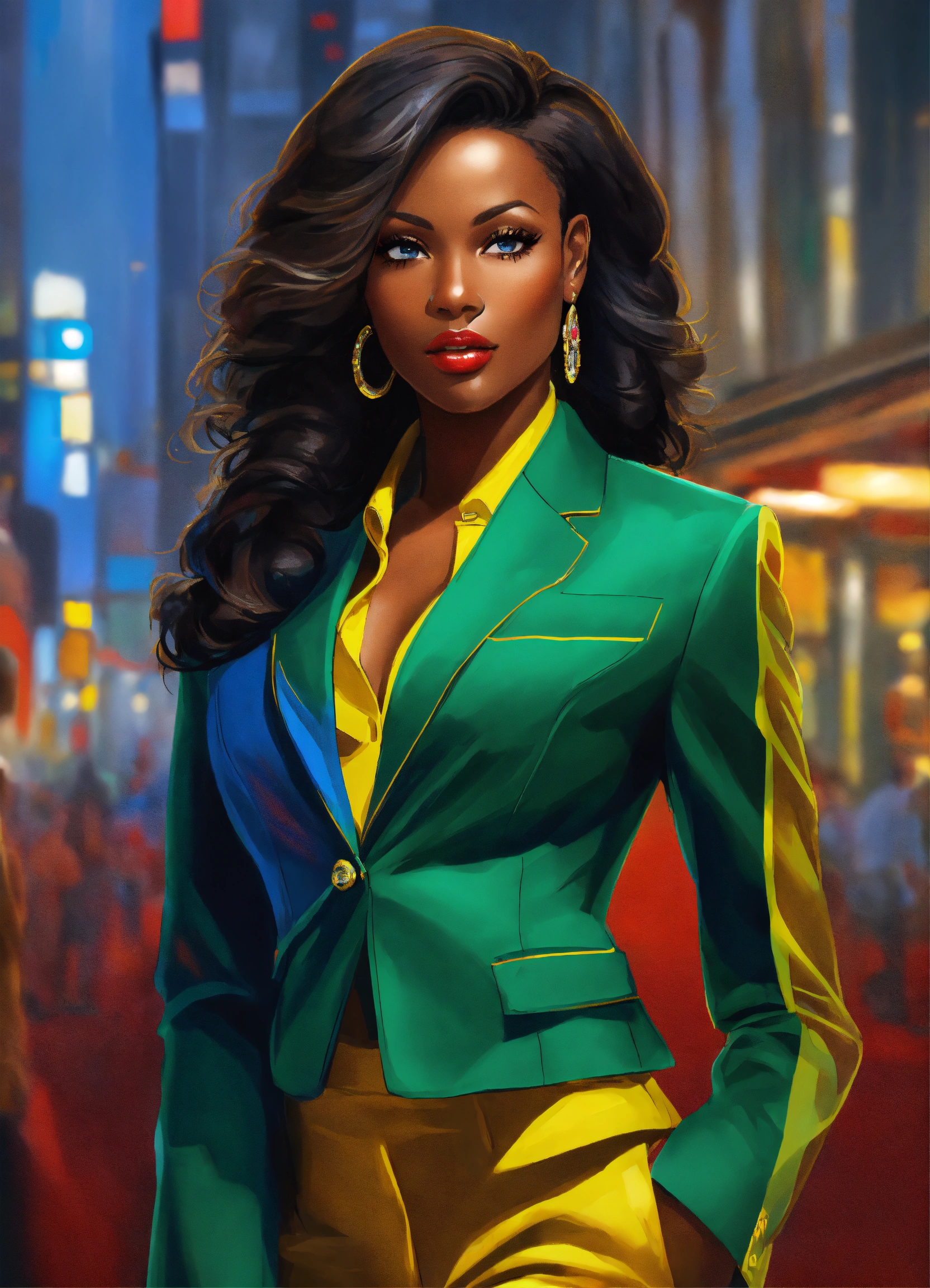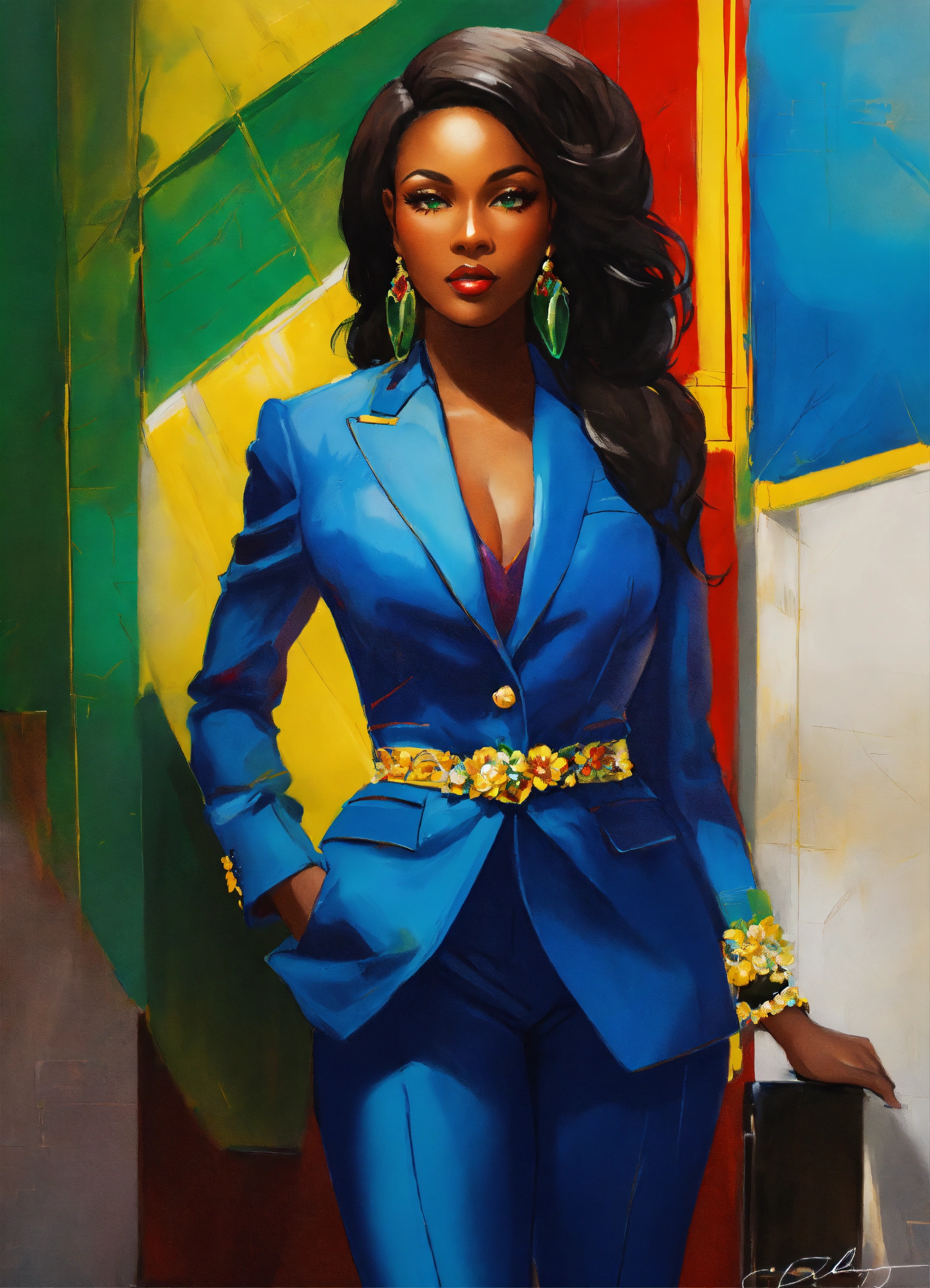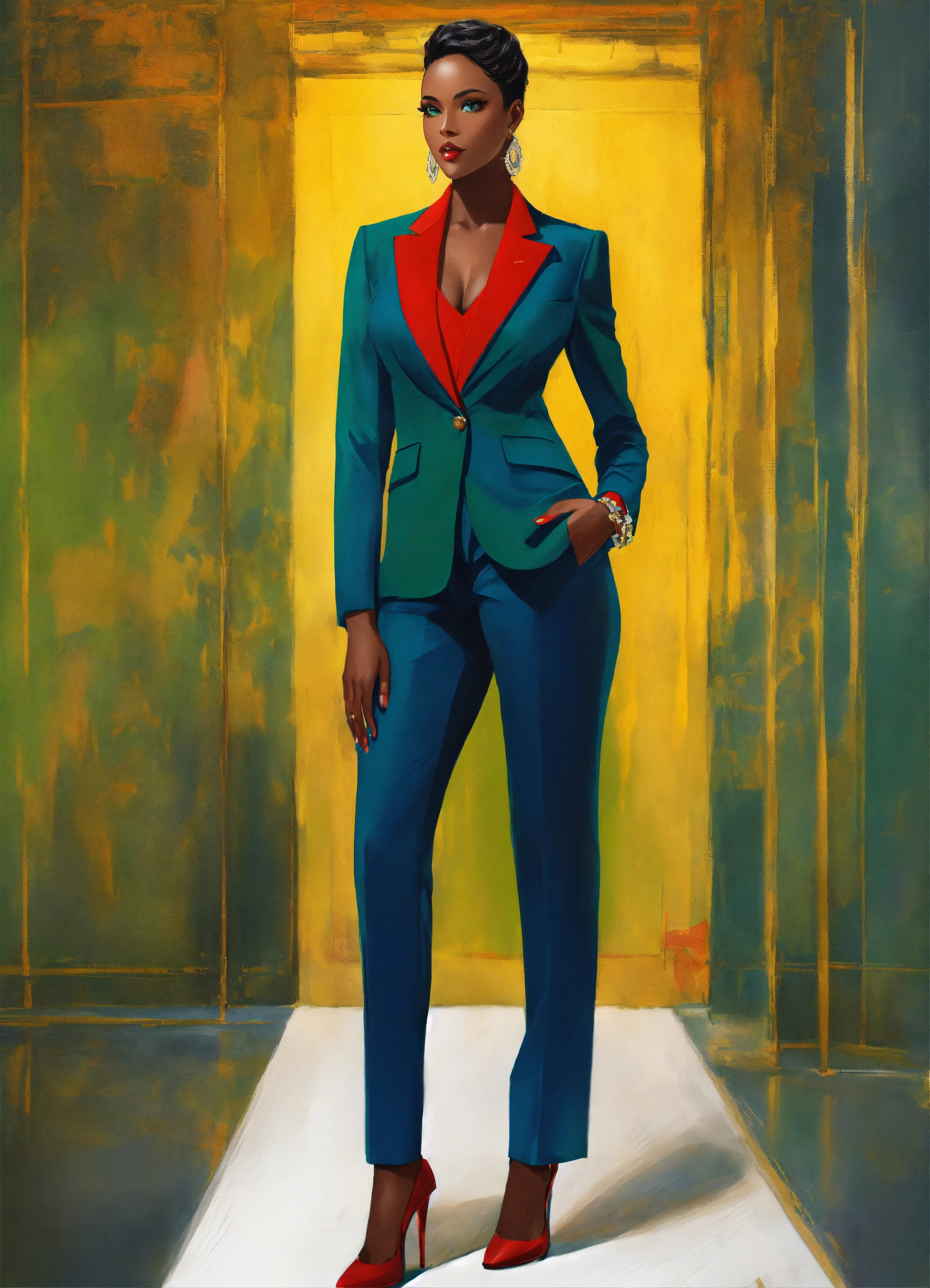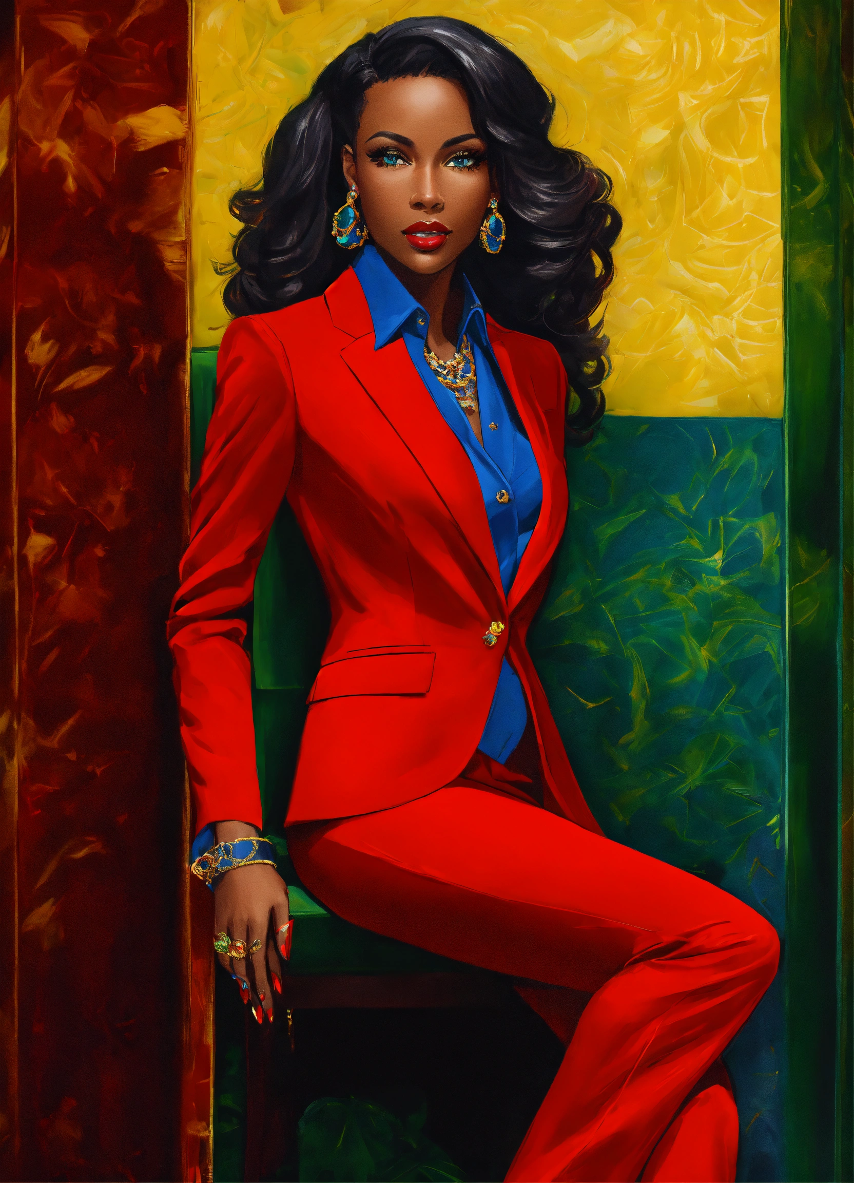 Beautiful black businesswoman gorgeous "dark face skin, " wearing stylish haute couture conservative haute couture business suit jacket and pants outfit, in colors, "bright red, bright blue, "dark green, " yellow and white, " stiletto heels, detailed line art, fine details, no background full body view, head to toe, clear white background, center, greg rutkowski