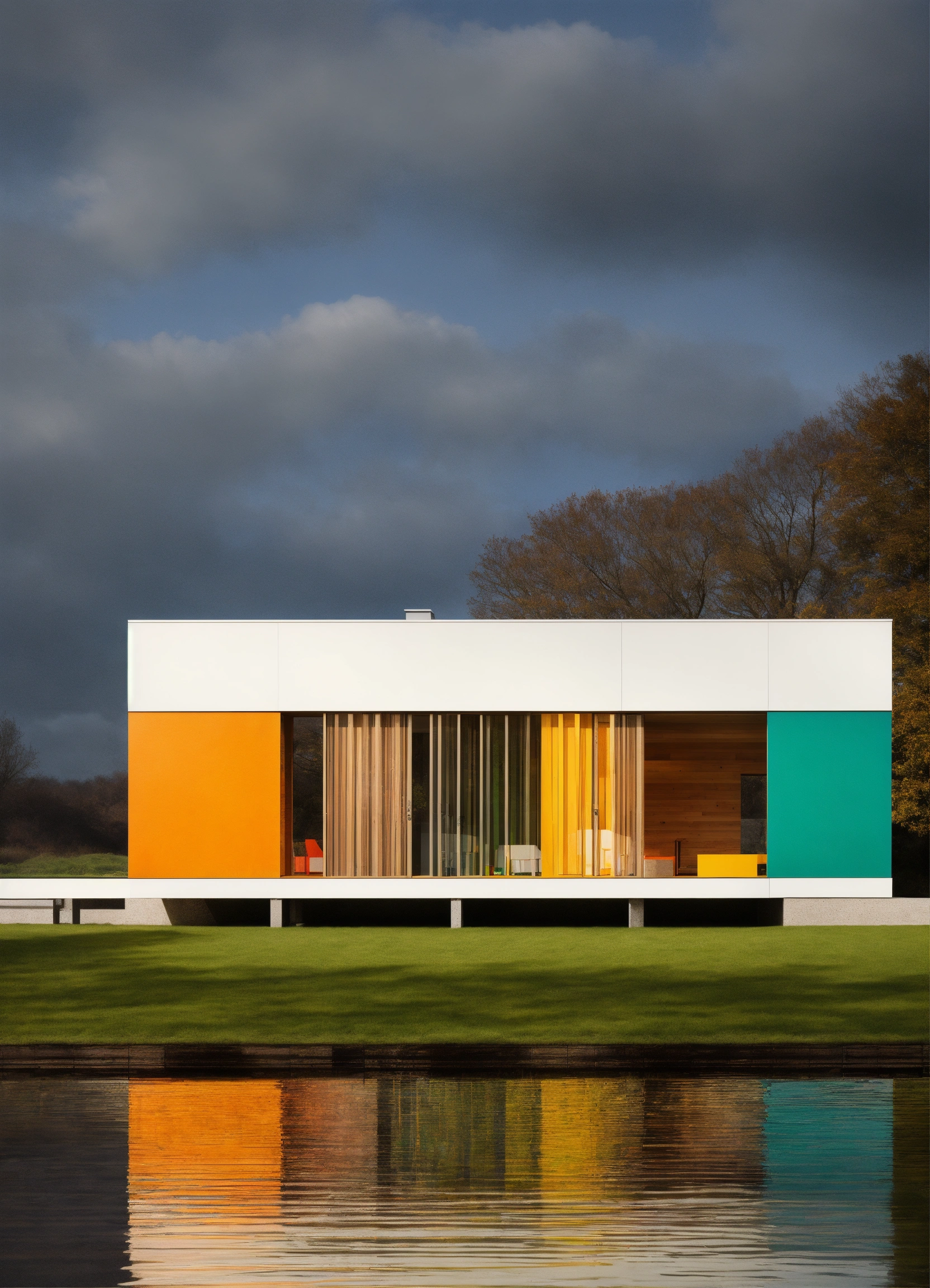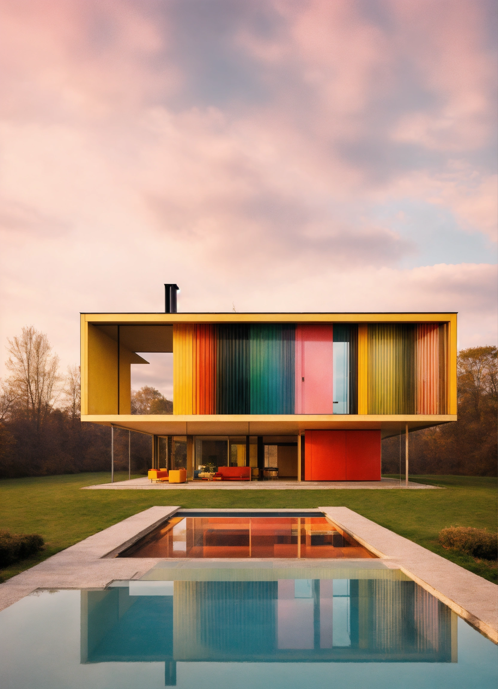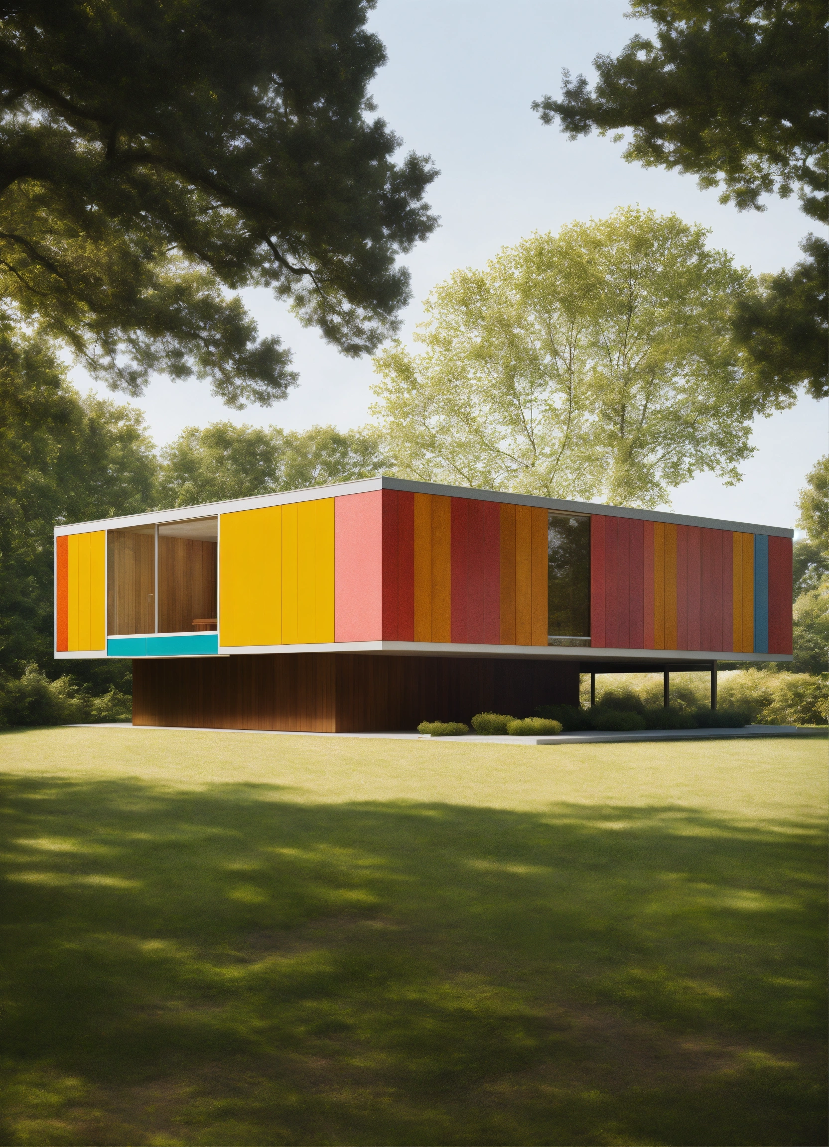 Mies van der rohe minimalist colorful plastic and wood house photorealistic from the front