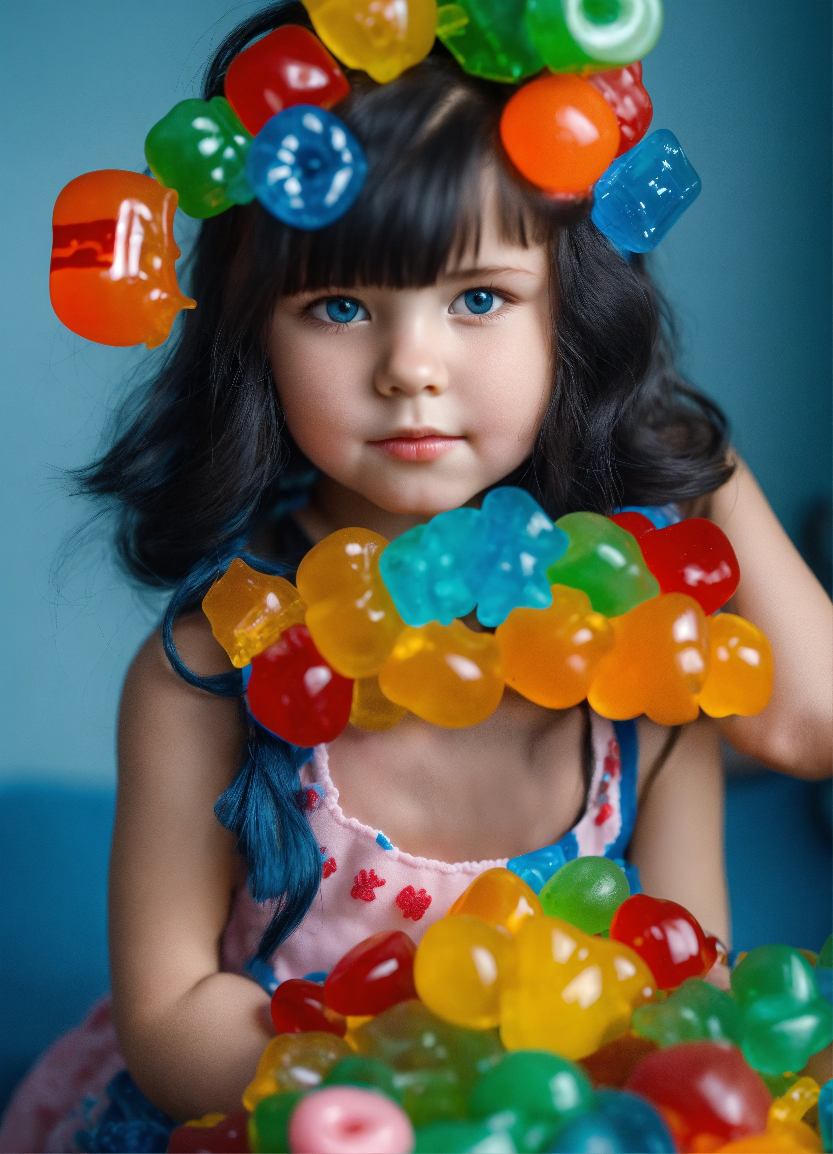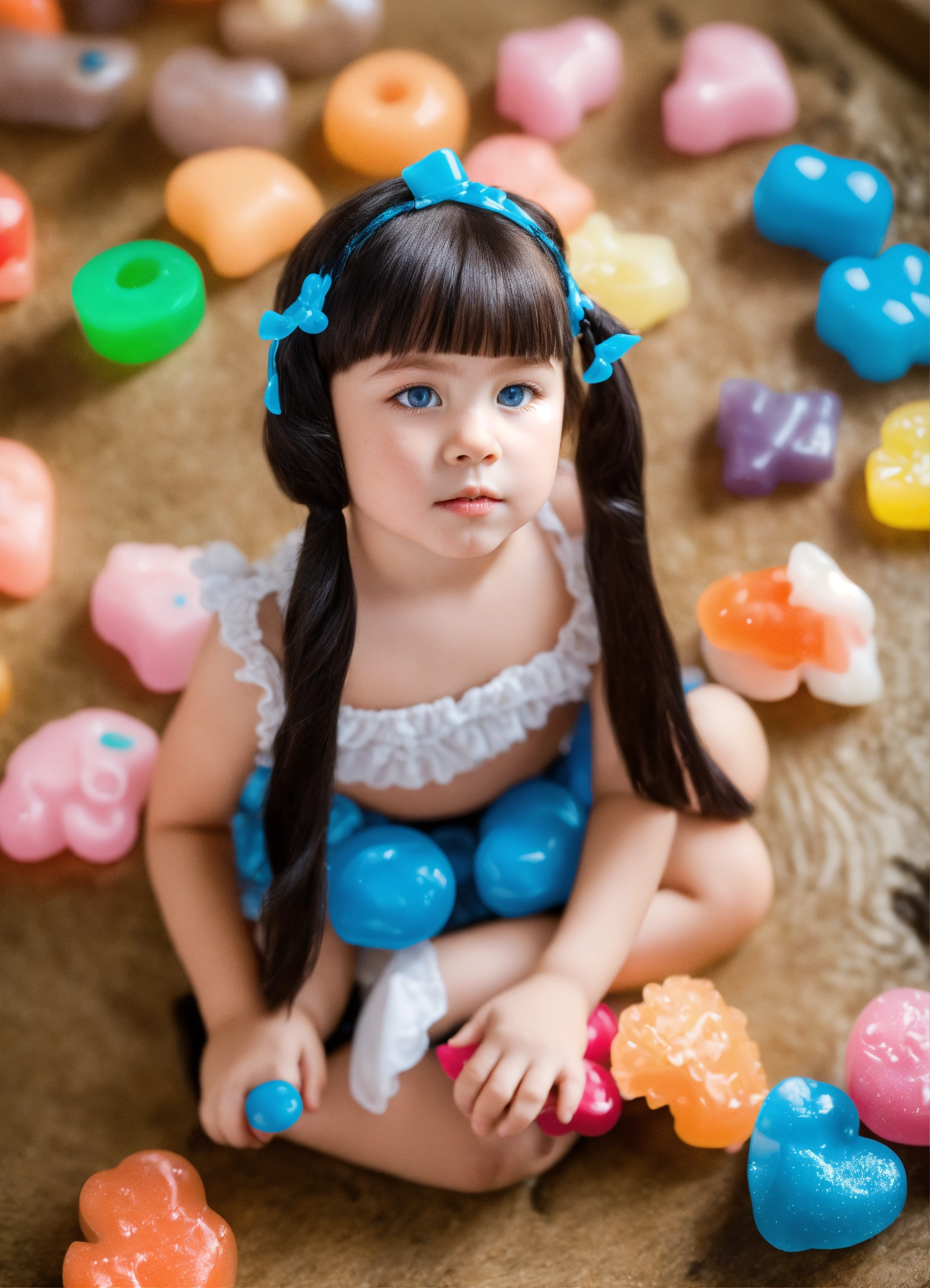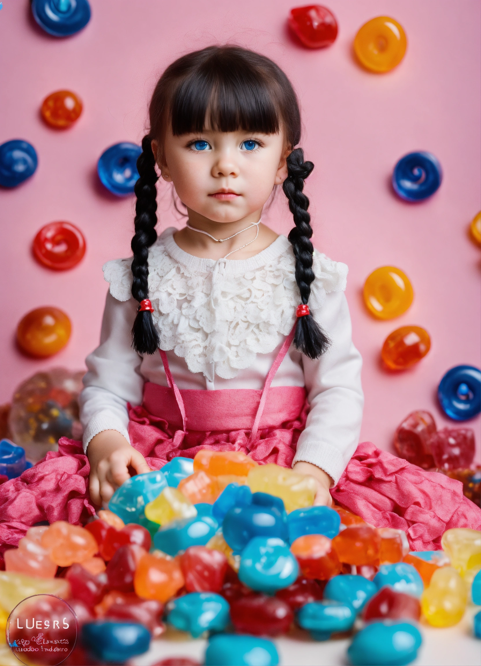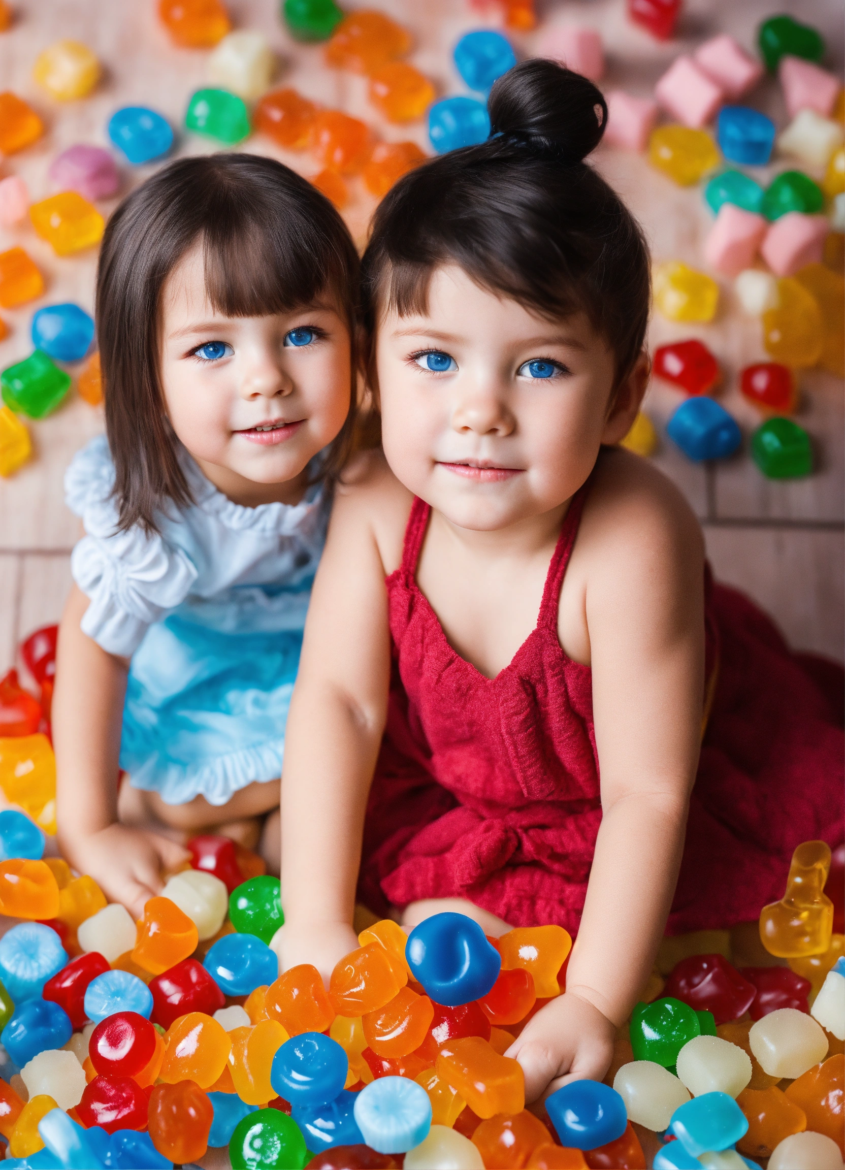 Length studio photos of a russian girl and boy with white and black hair, blue eyes, 5 years old, yet gummies candy, play 44 kats figures of toys