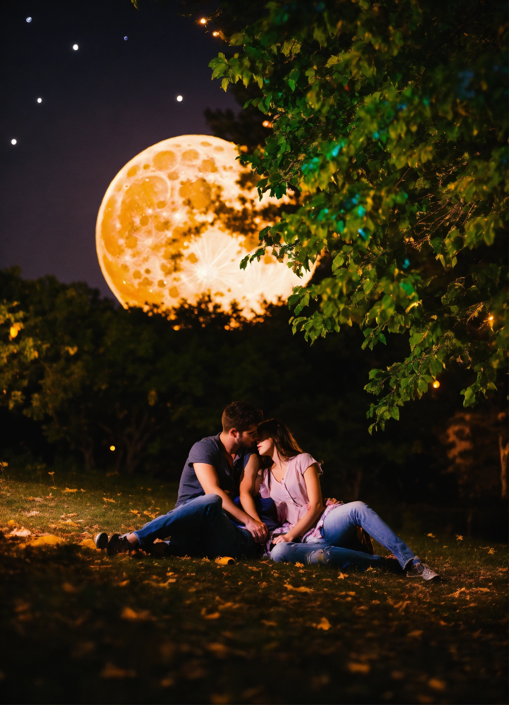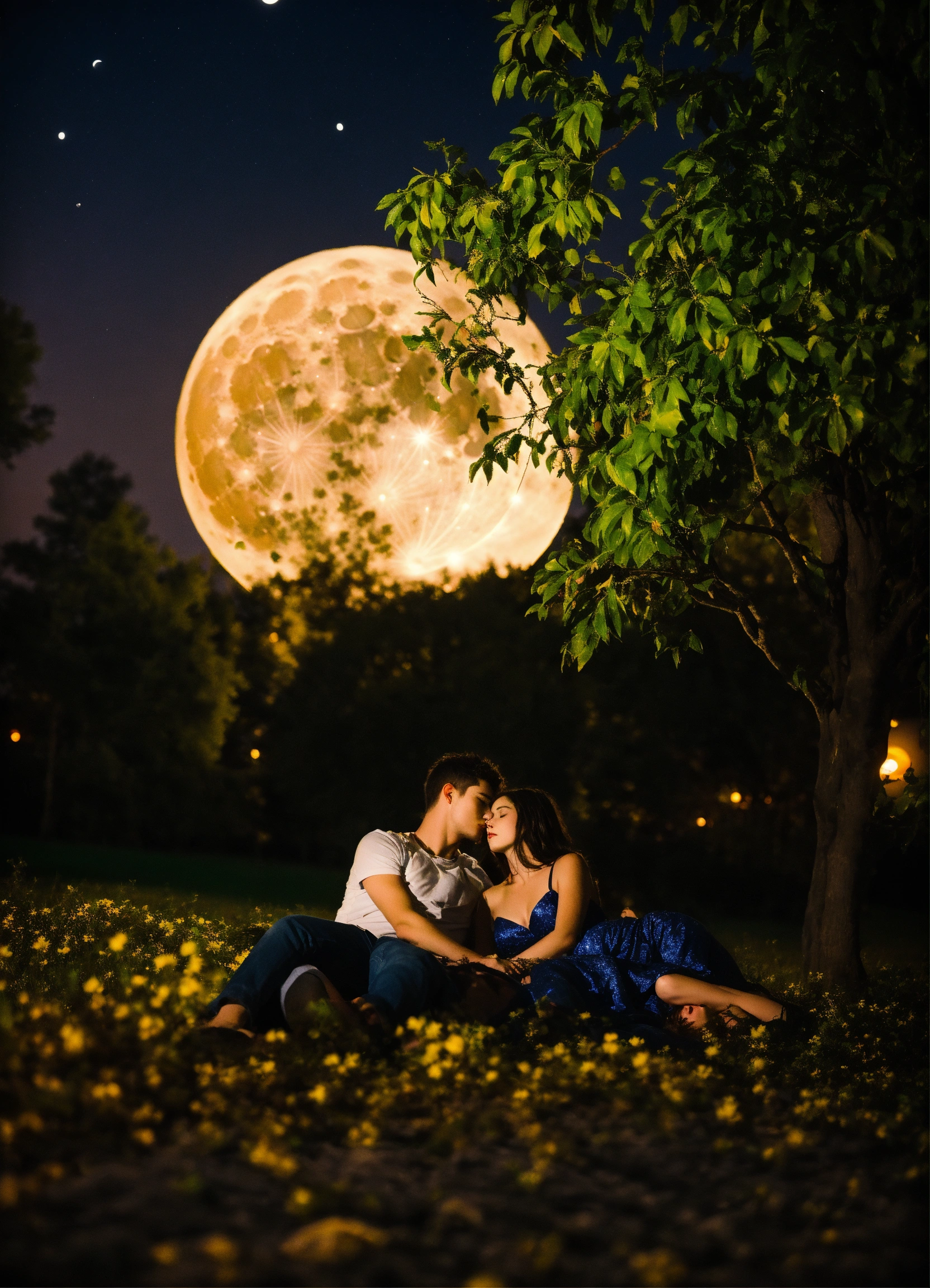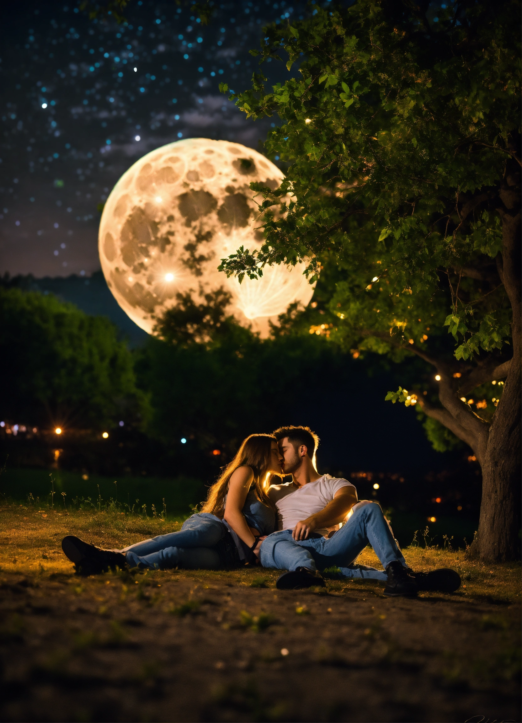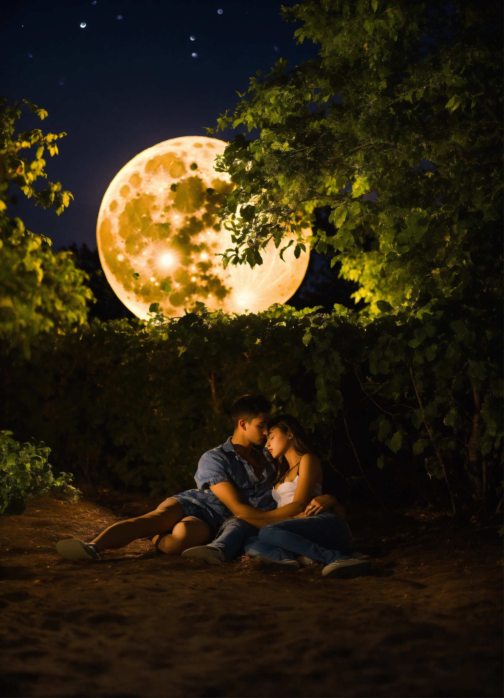 Two attractive young lovers a night under a tree under a full brite moon laying down in each others arms