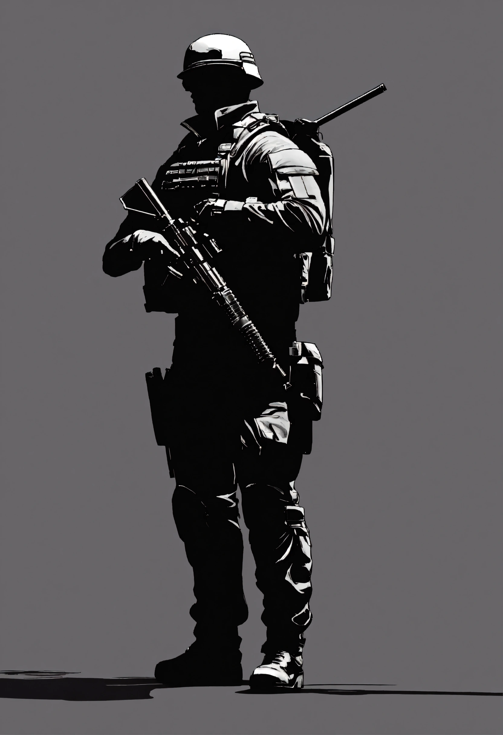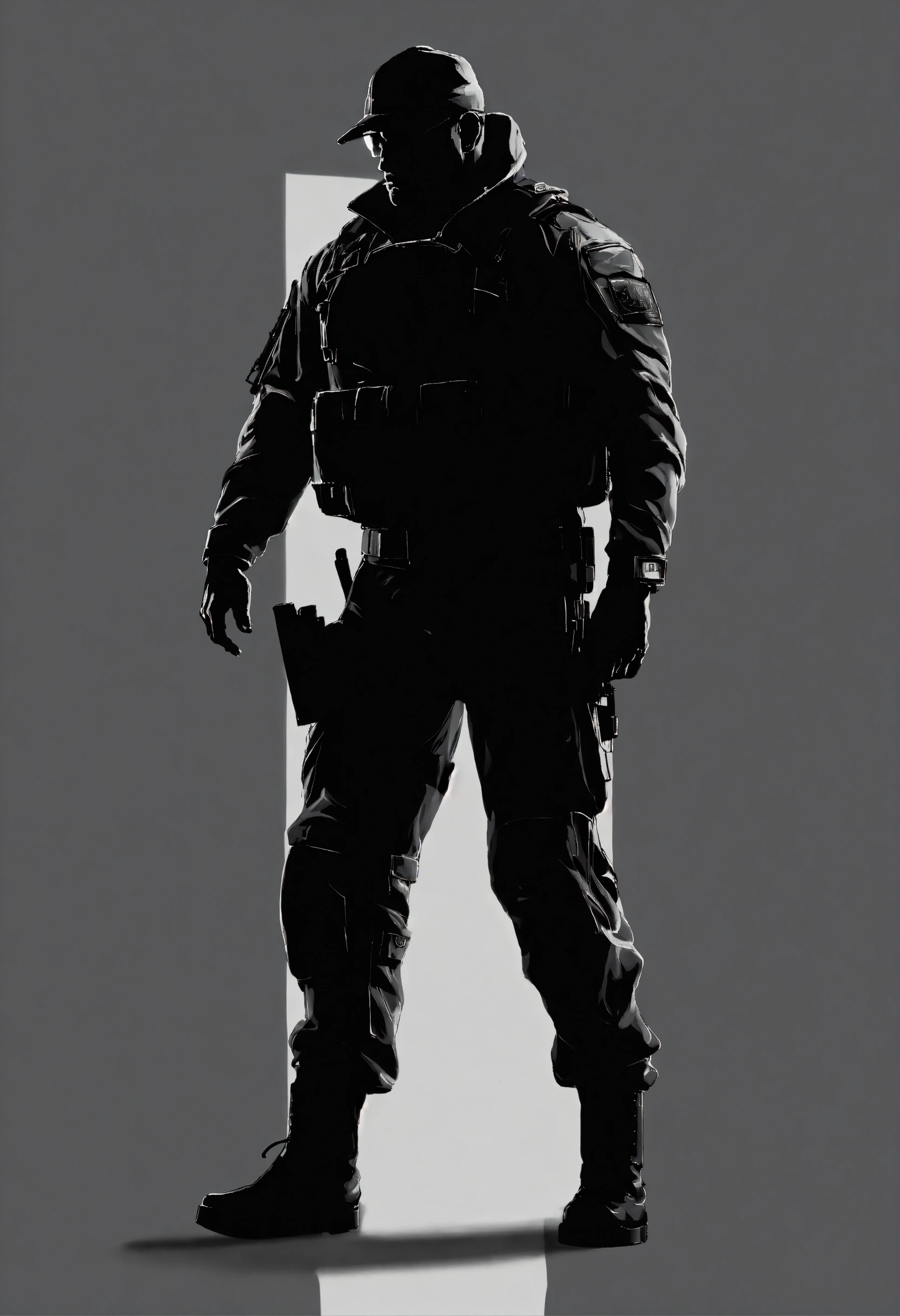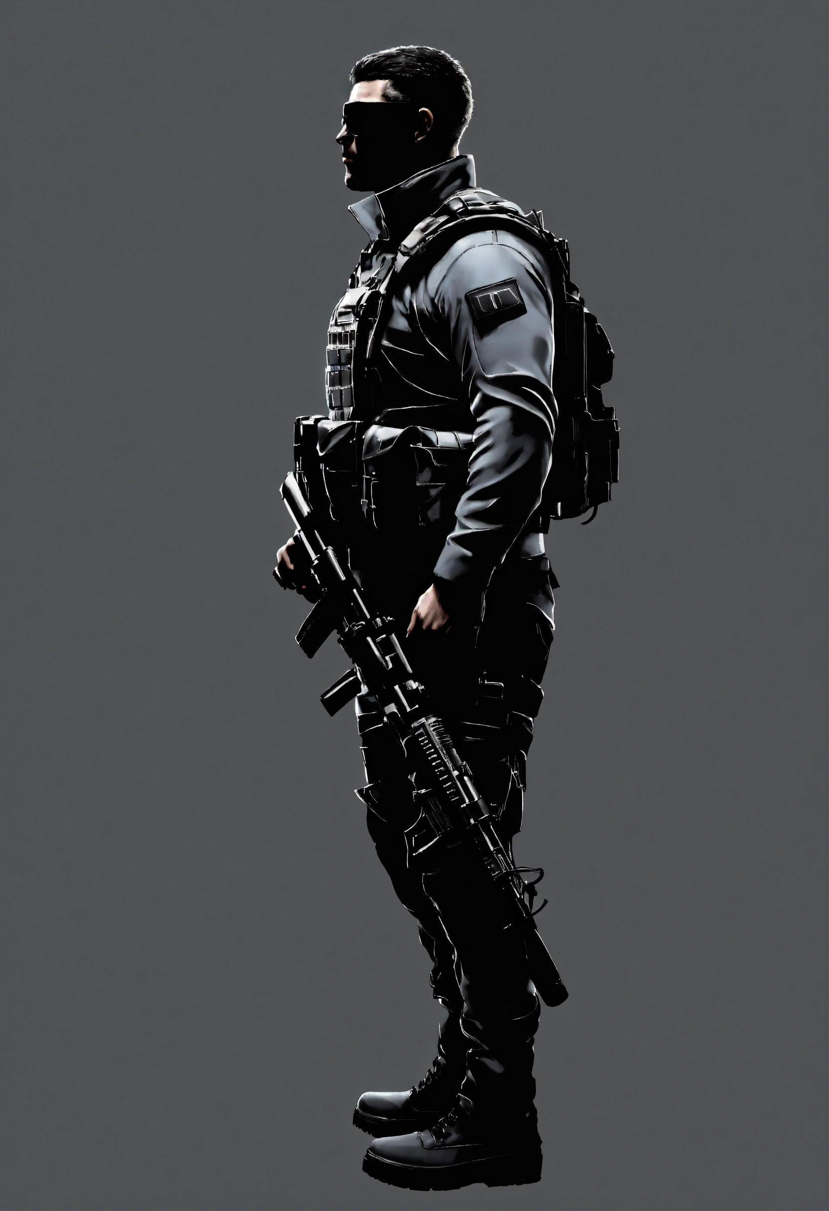 Armed muscular security bodyguard silhouette, subtle, grey aesthetic, high detail, realistic, side view