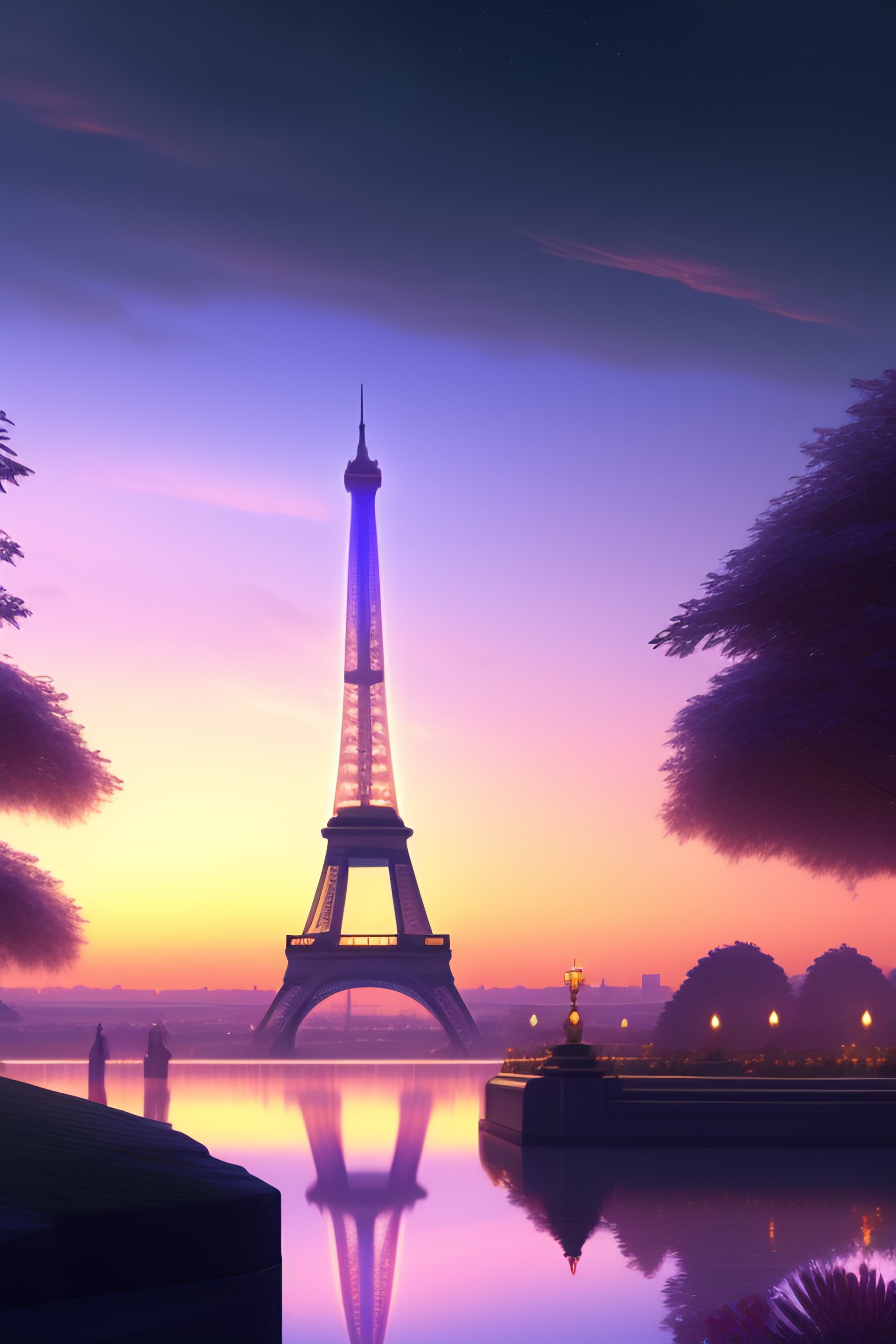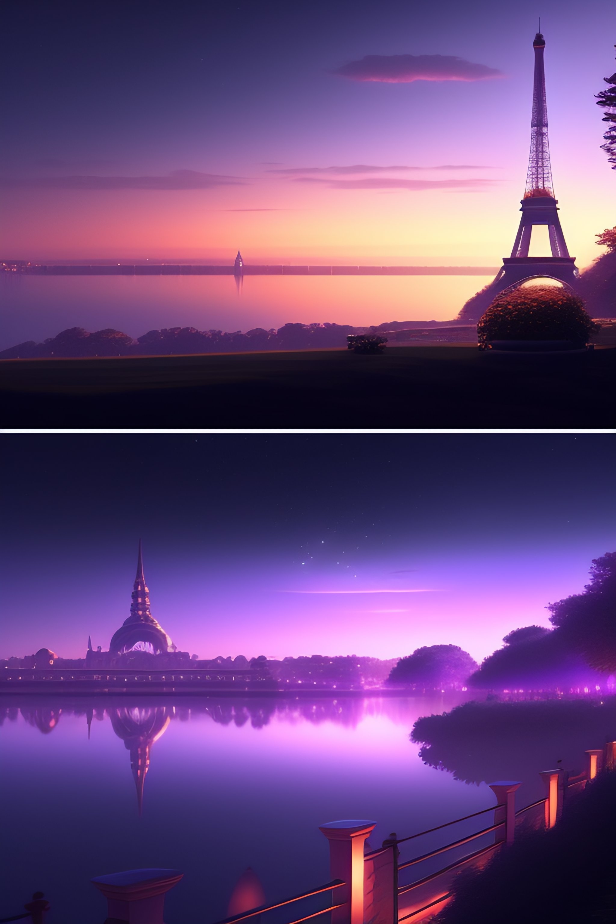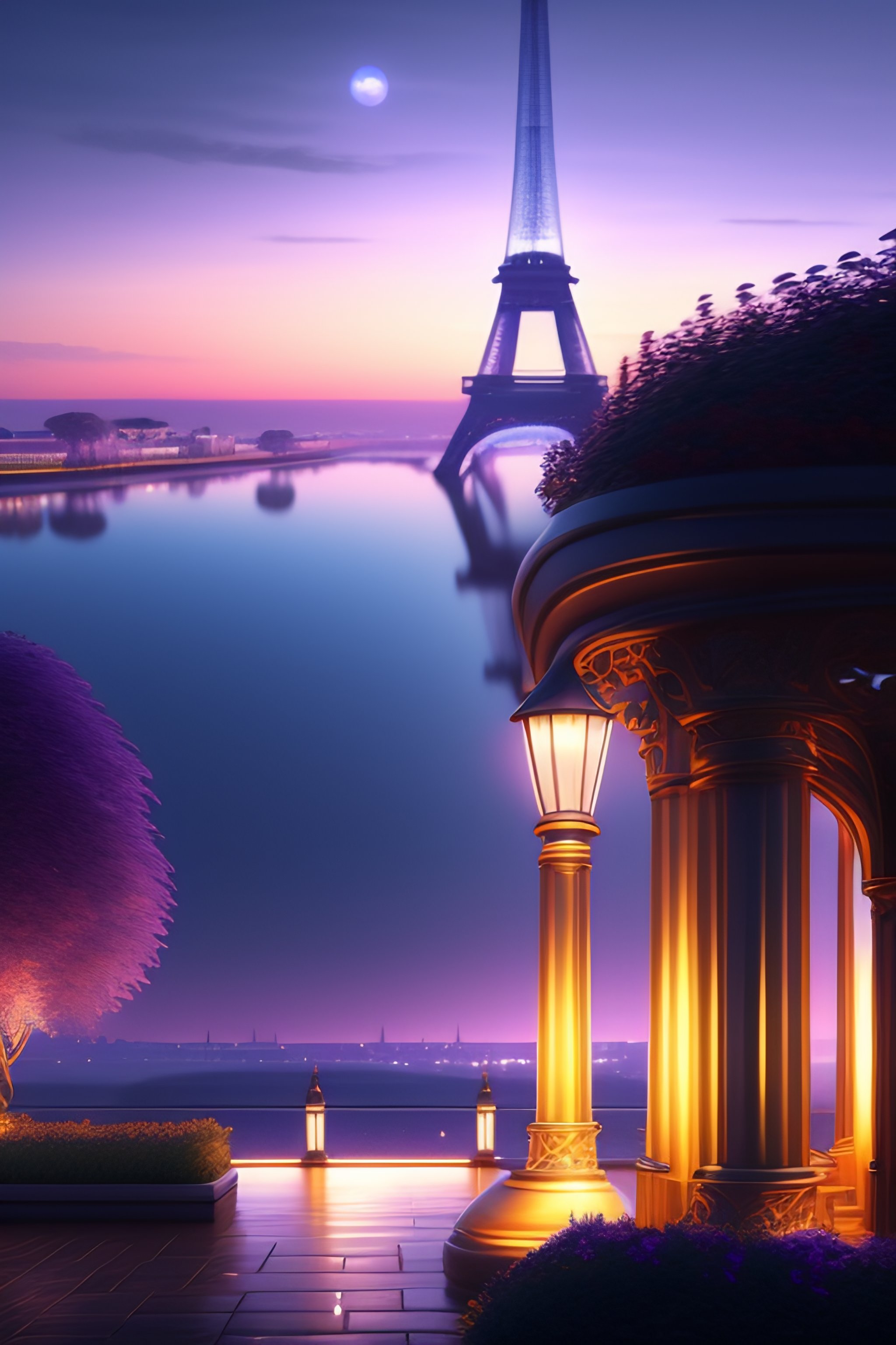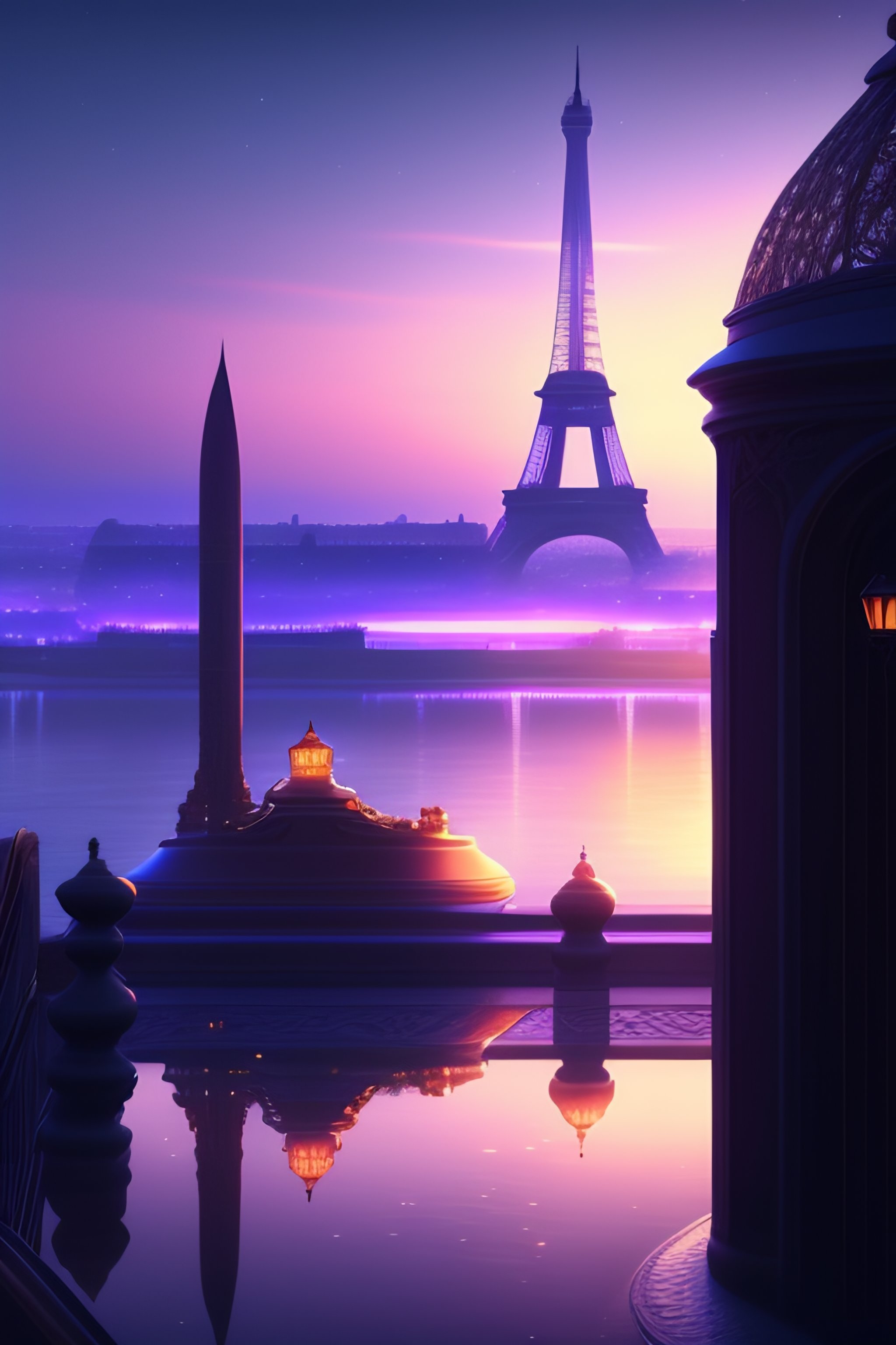 Over the shoulder landscape painting of violet evergarden, behind are distant lights from paris, eiffel tower, next to the reflecting ocean, nighttime, by philipp a. urlich and pengzhen zhang and andreas rocha, fantasy, intricate, elegant, highly detailed, digital painting, artstation, blender, unreal engine 5, octane render, smooth, sharp focus, illustration