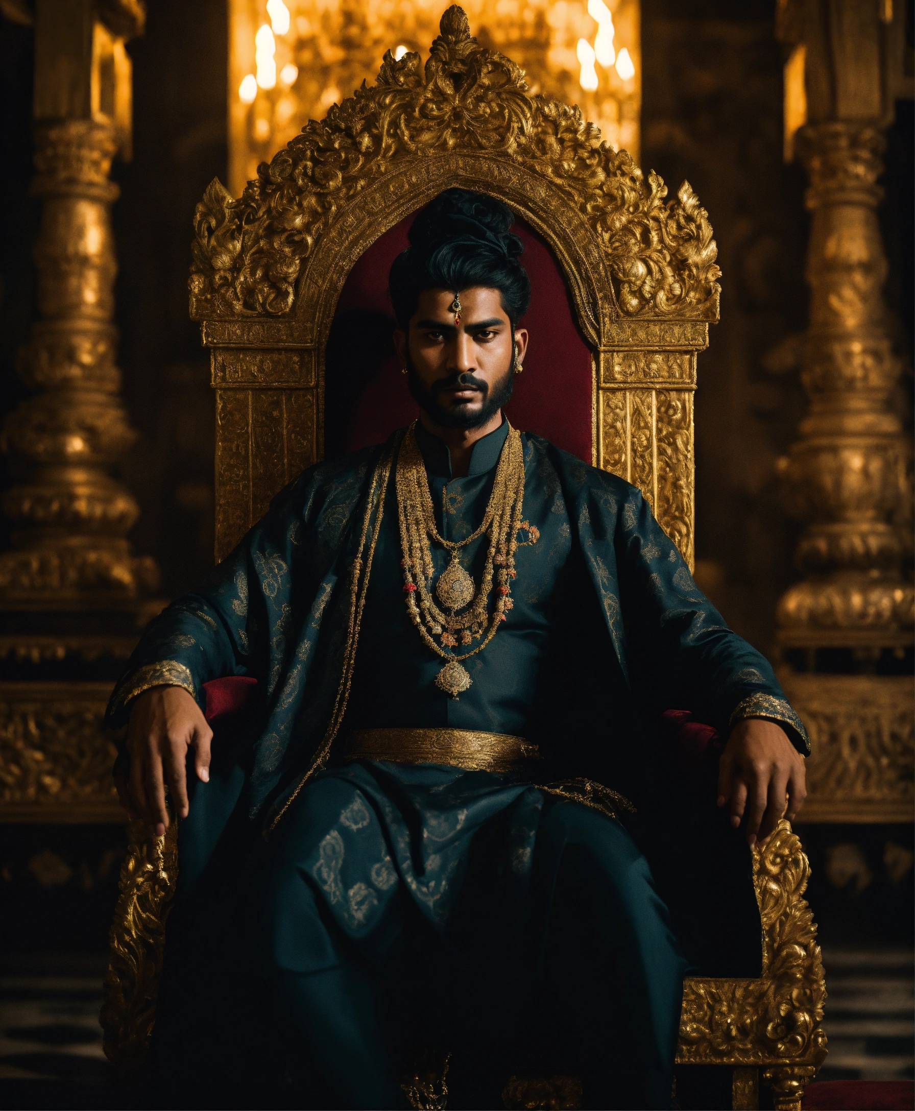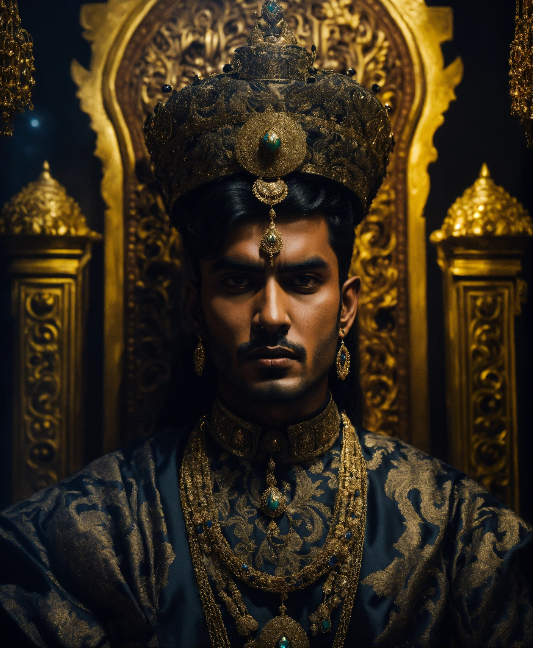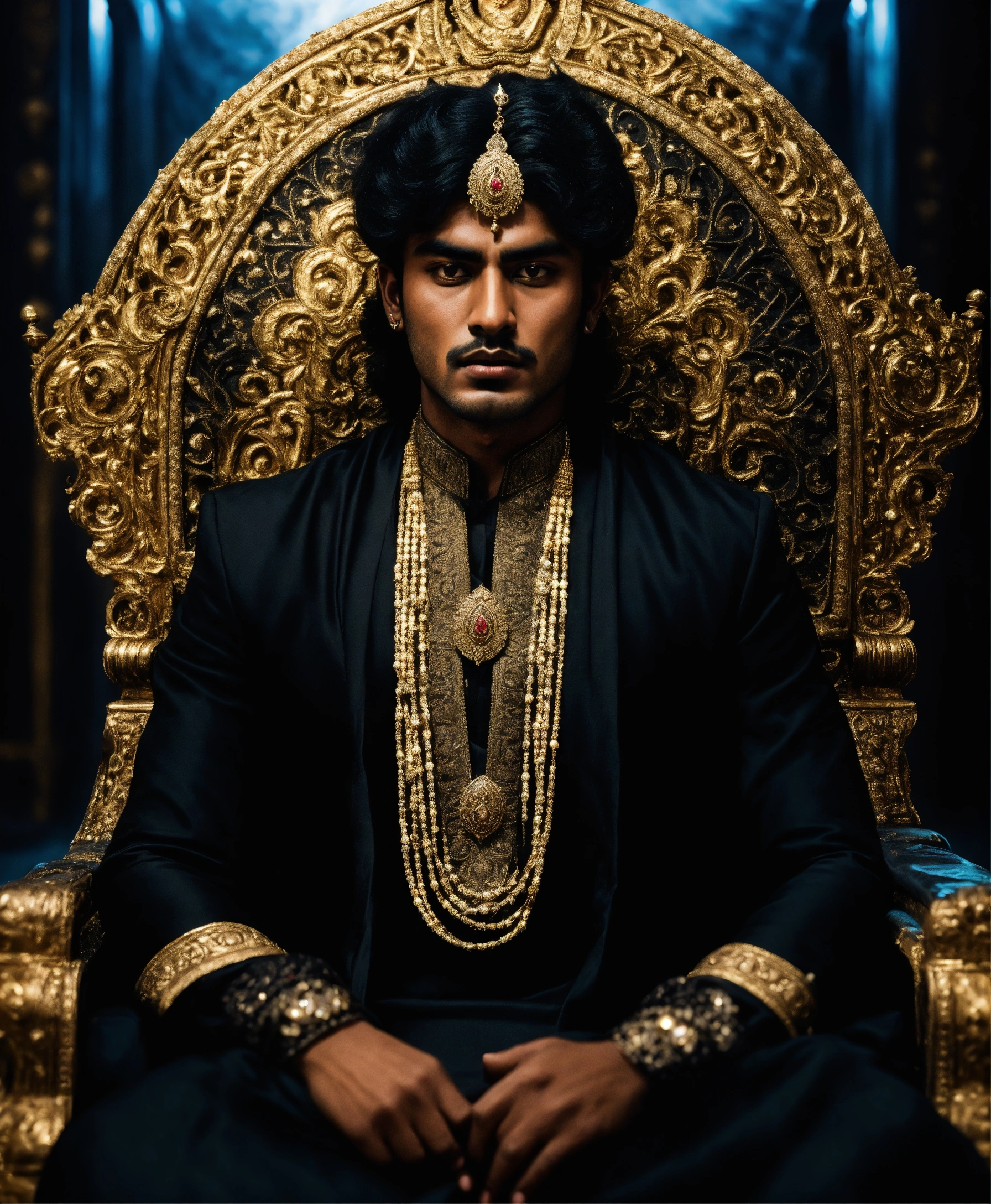 Dark, mysterious and dramatic portrait of a young handsome south asian evil ruler with a hypnotic stare, sinister aura, black elaborate ceremonial clothes and ornate jewellery in a menacing throne room, where shadows dance and ancient spells linger.