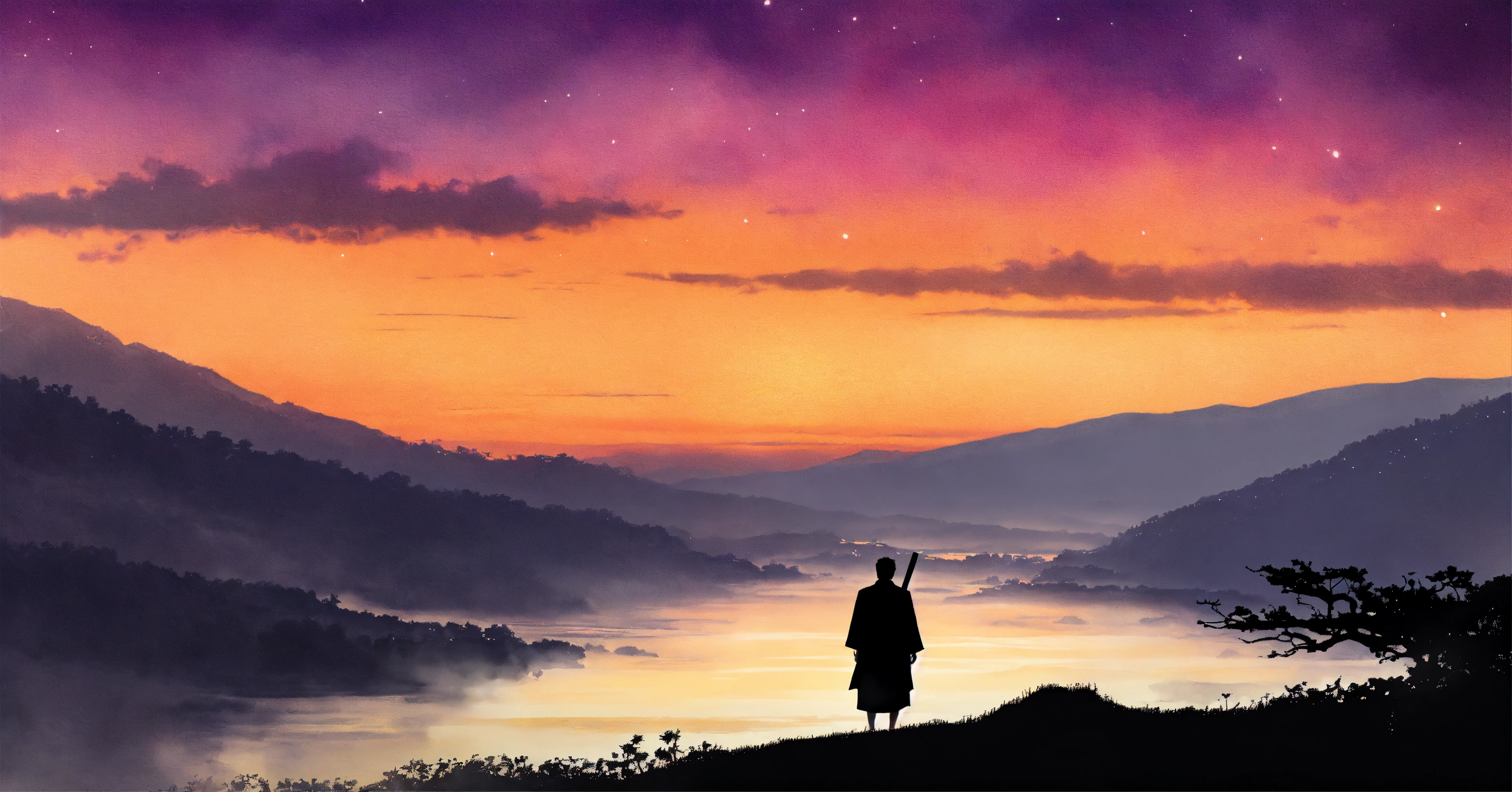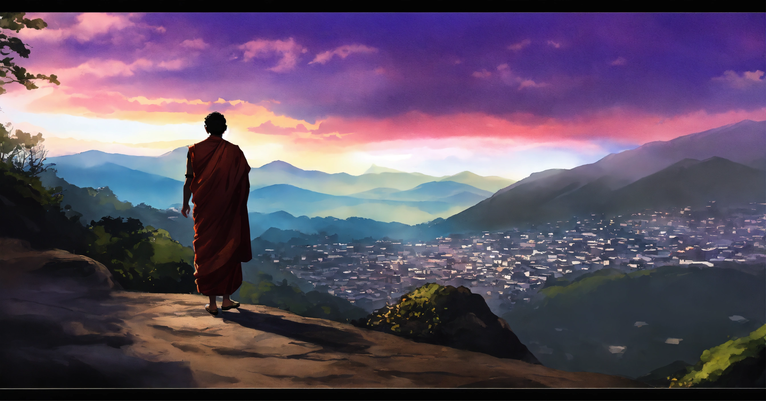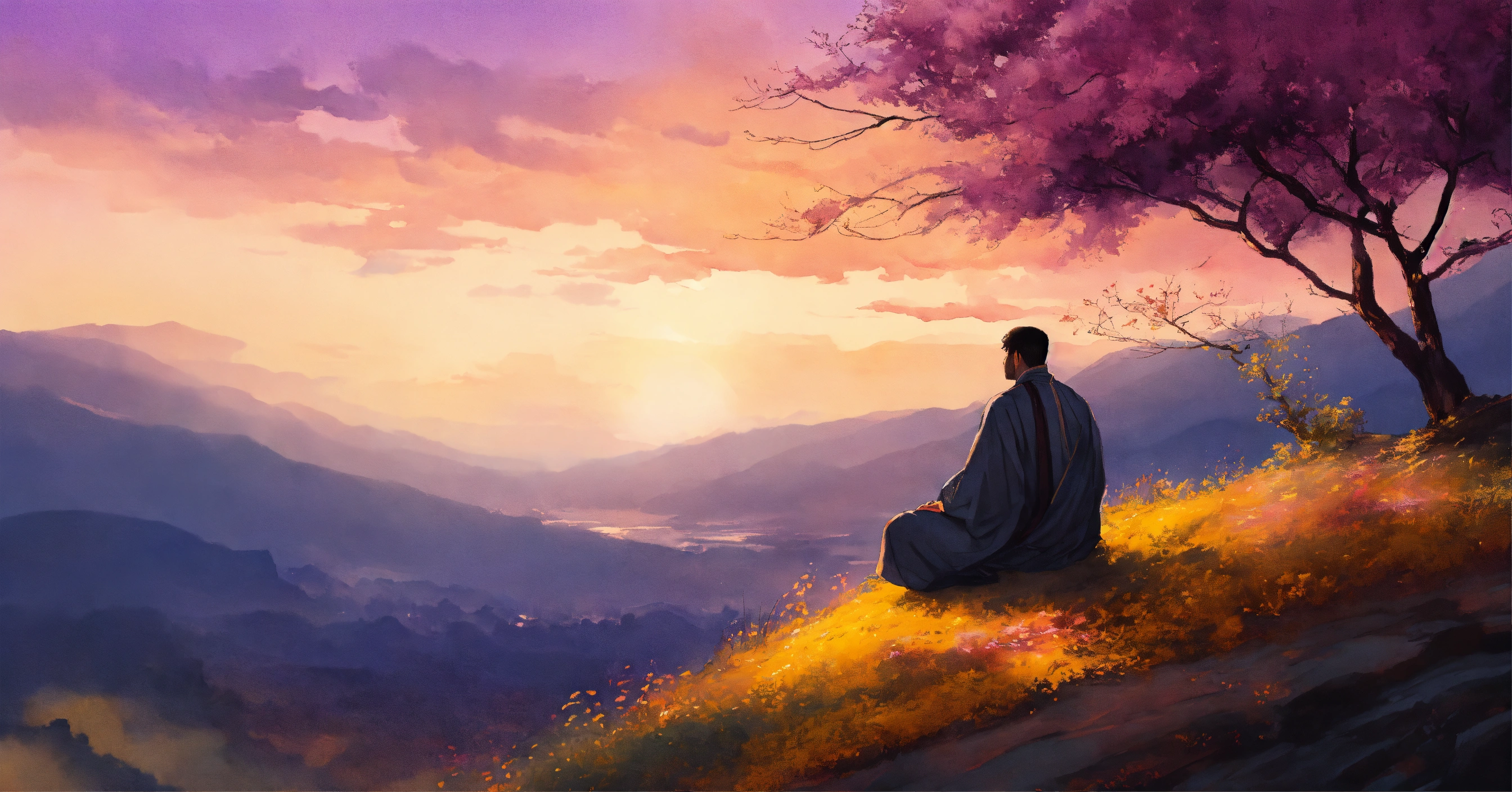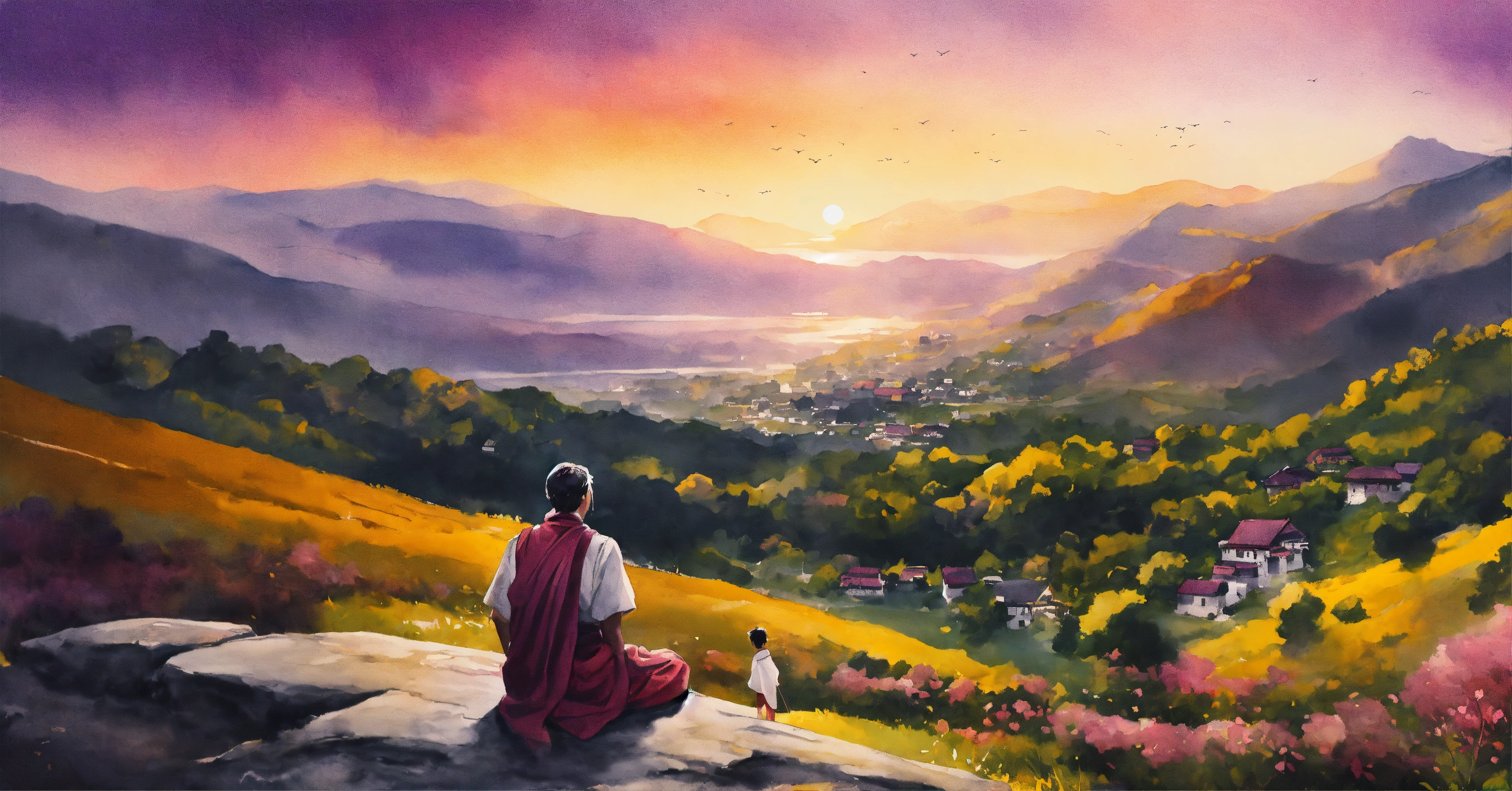 Create a black and white watercolor illustration capturing a serene scene from a story. the setting is a picturesque village nestled on the slopes of a grand mountain. a monk named keshava, known for his deep meditation, sits on a cliff edge, his silhouette outlined against the backdrop of a setting sun that casts a myriad of gold and purple hues across the sky. beside him, a younger villager named arjun approaches, curiosity evident in his posture. the vastness of the sky, the grandeur of the mountain, and the tranquility of the two figures should emphasize the fleeting beauty of the moment. the overall tone should evoke a sense of mindfulness, the beauty of the present, and the profound simplicity of nature. black and white.