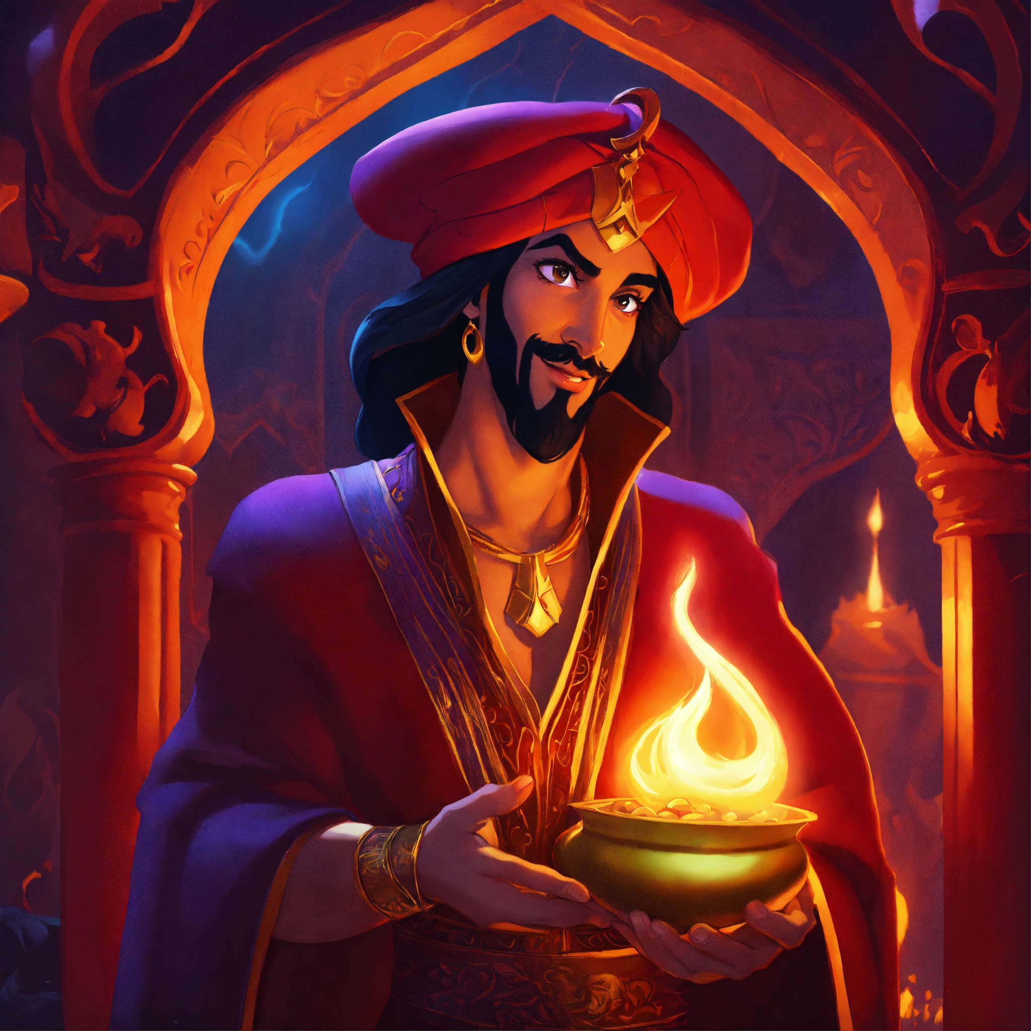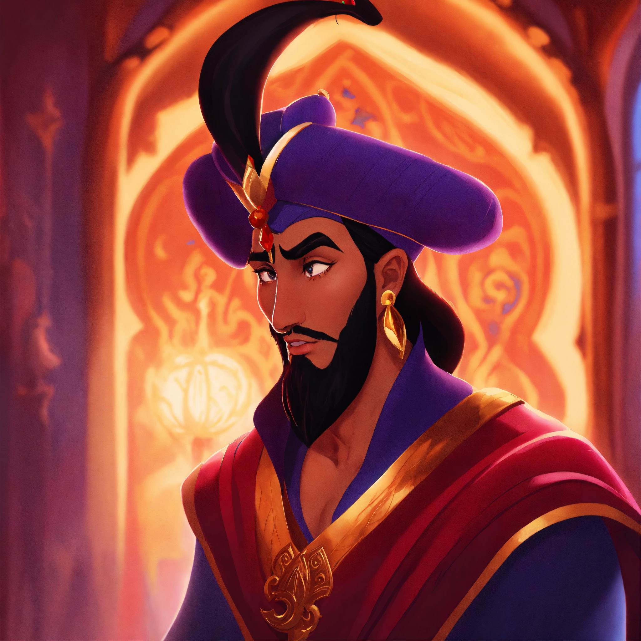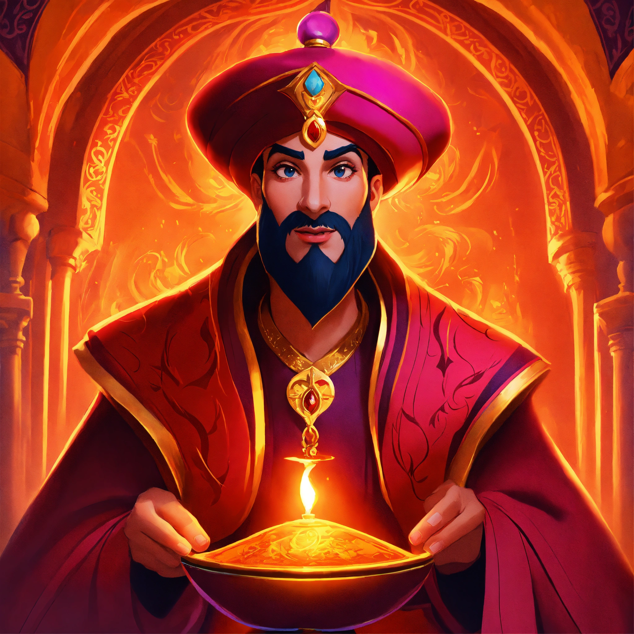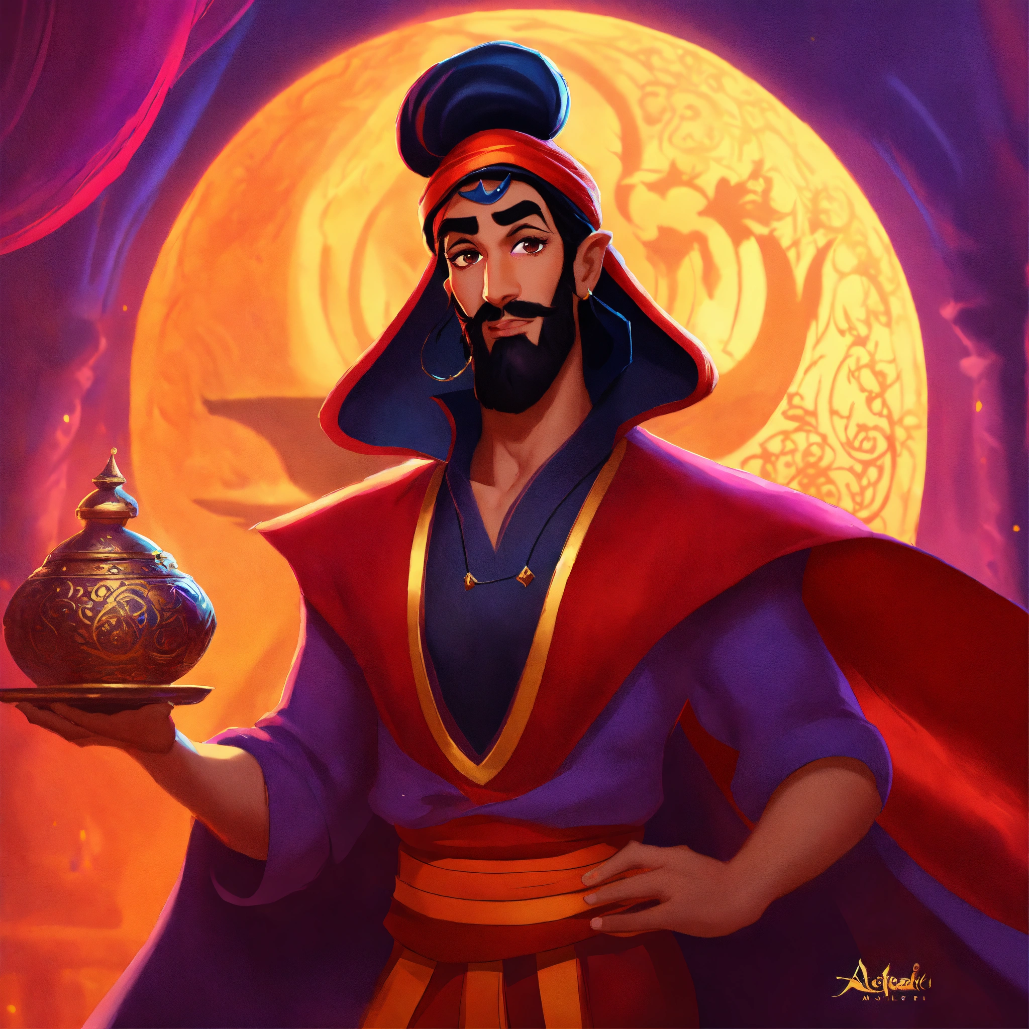 Jafar from the movie aladdin and the magic lamp, volumetric cartoon oil paint, 2d book illustration style, sharp focus, bright color, digital paint character design, trending on artstation, high details, simple lines, art by viktoria gavrilenko, josé luis ágreda and camilla d'errico
