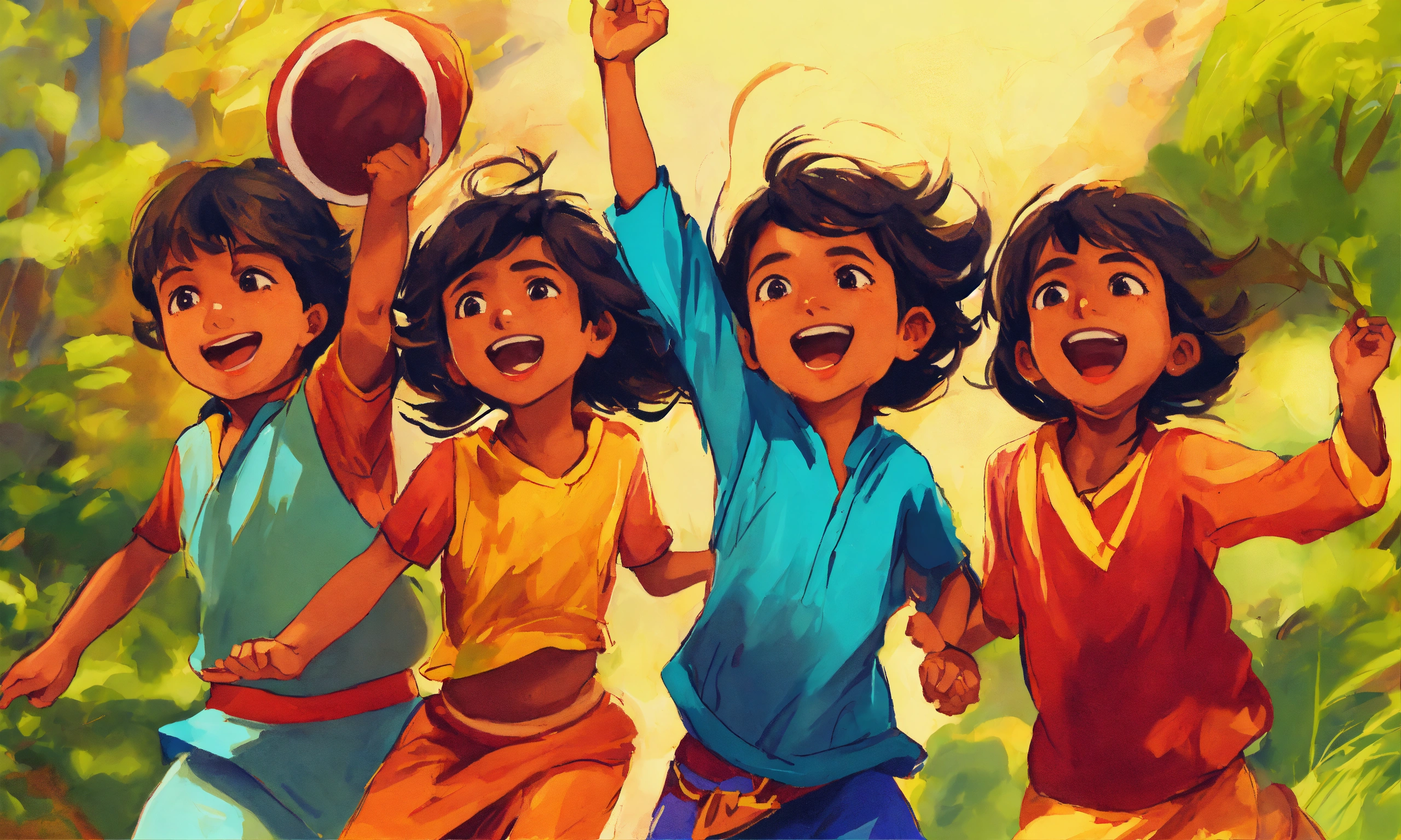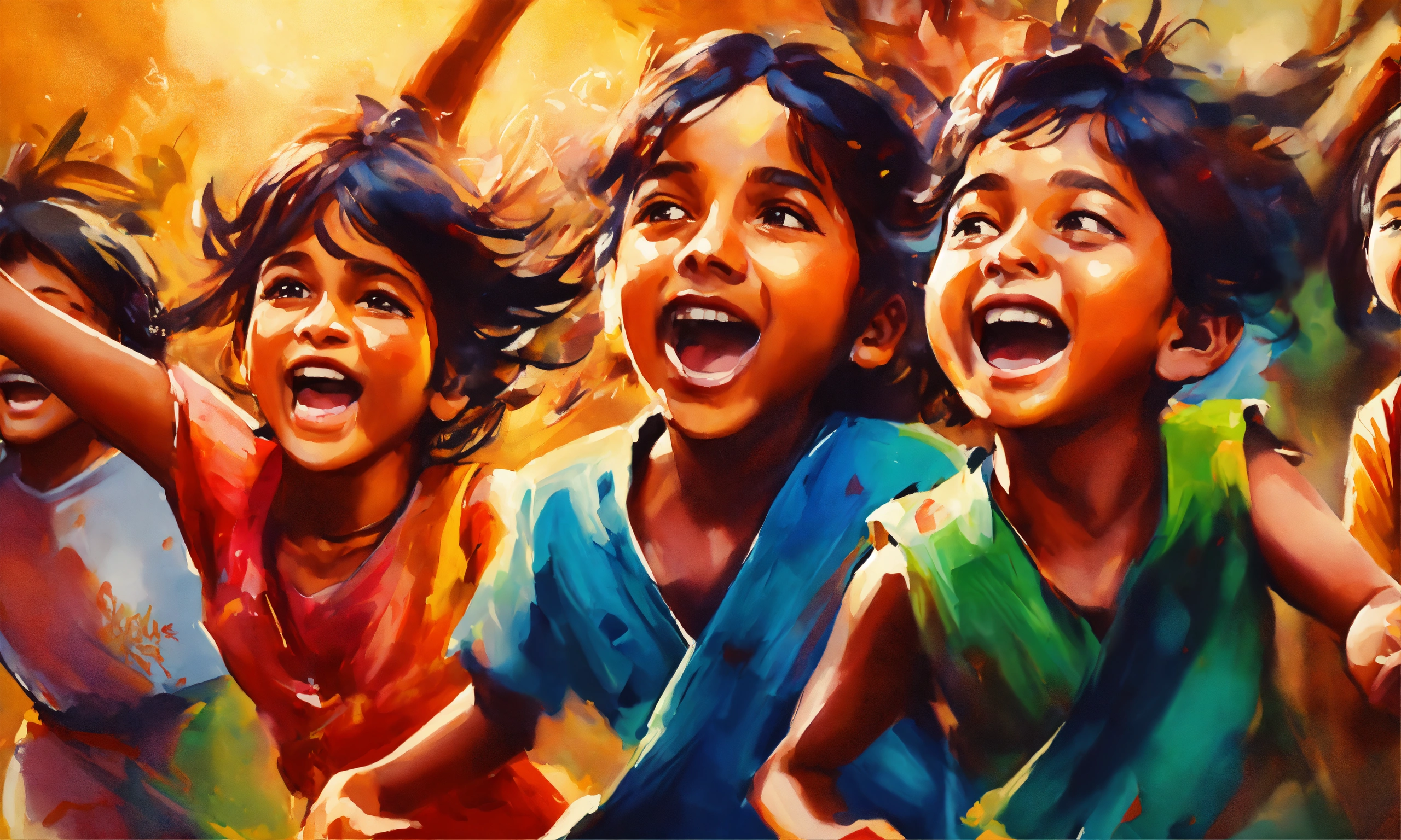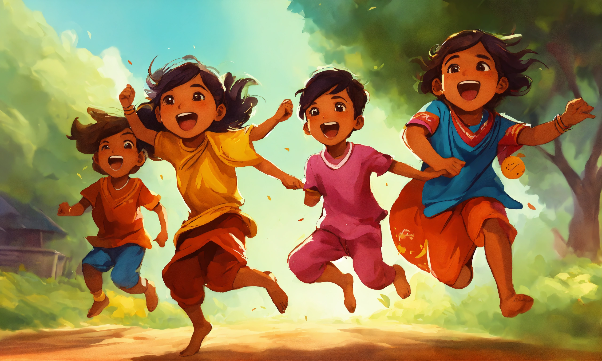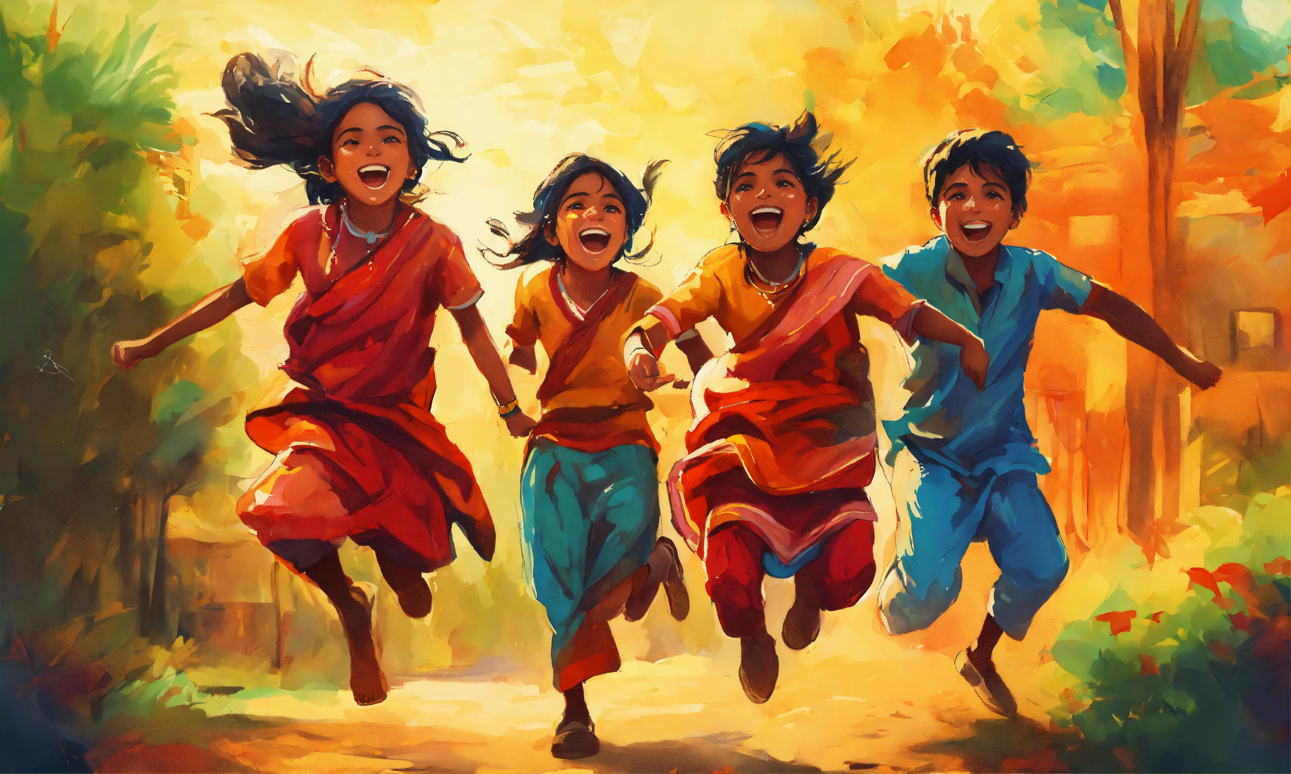 A hand drawn painting of a group of indian children jumping with joy and exuberance, 4k, sharp, vibrant, lively