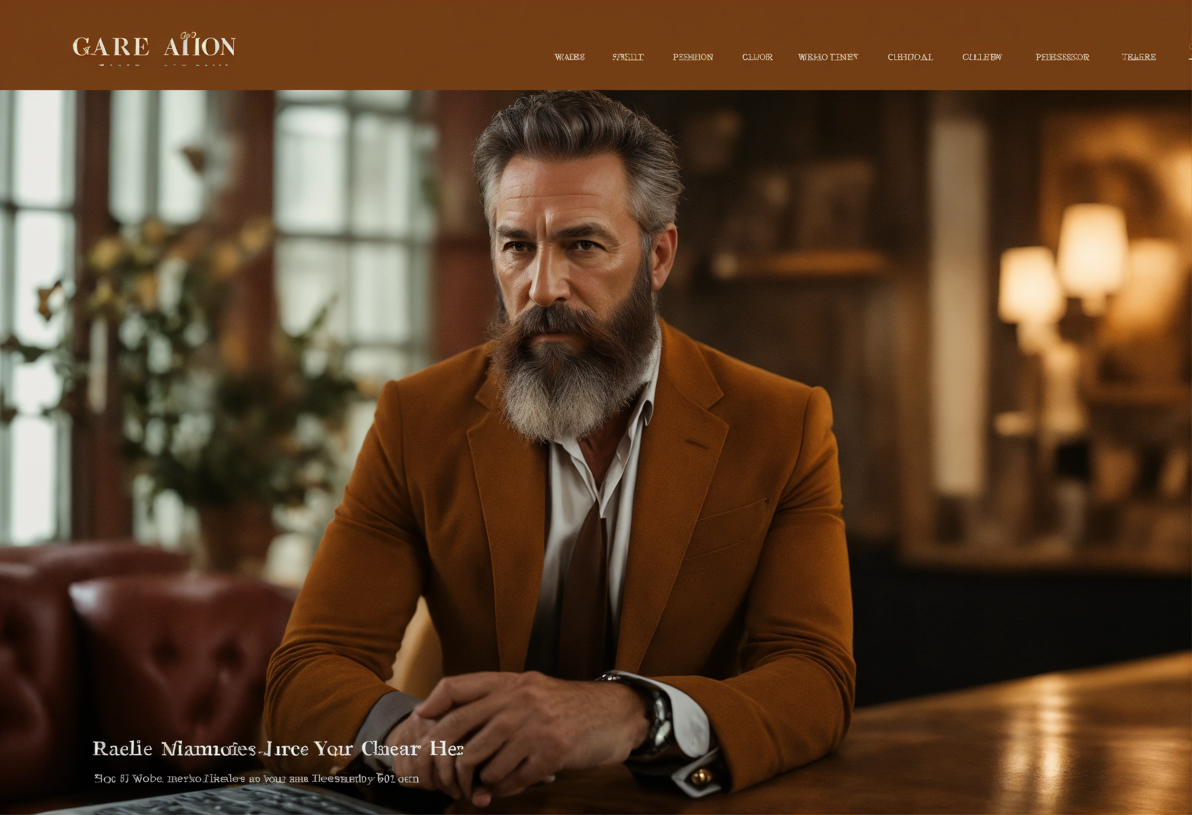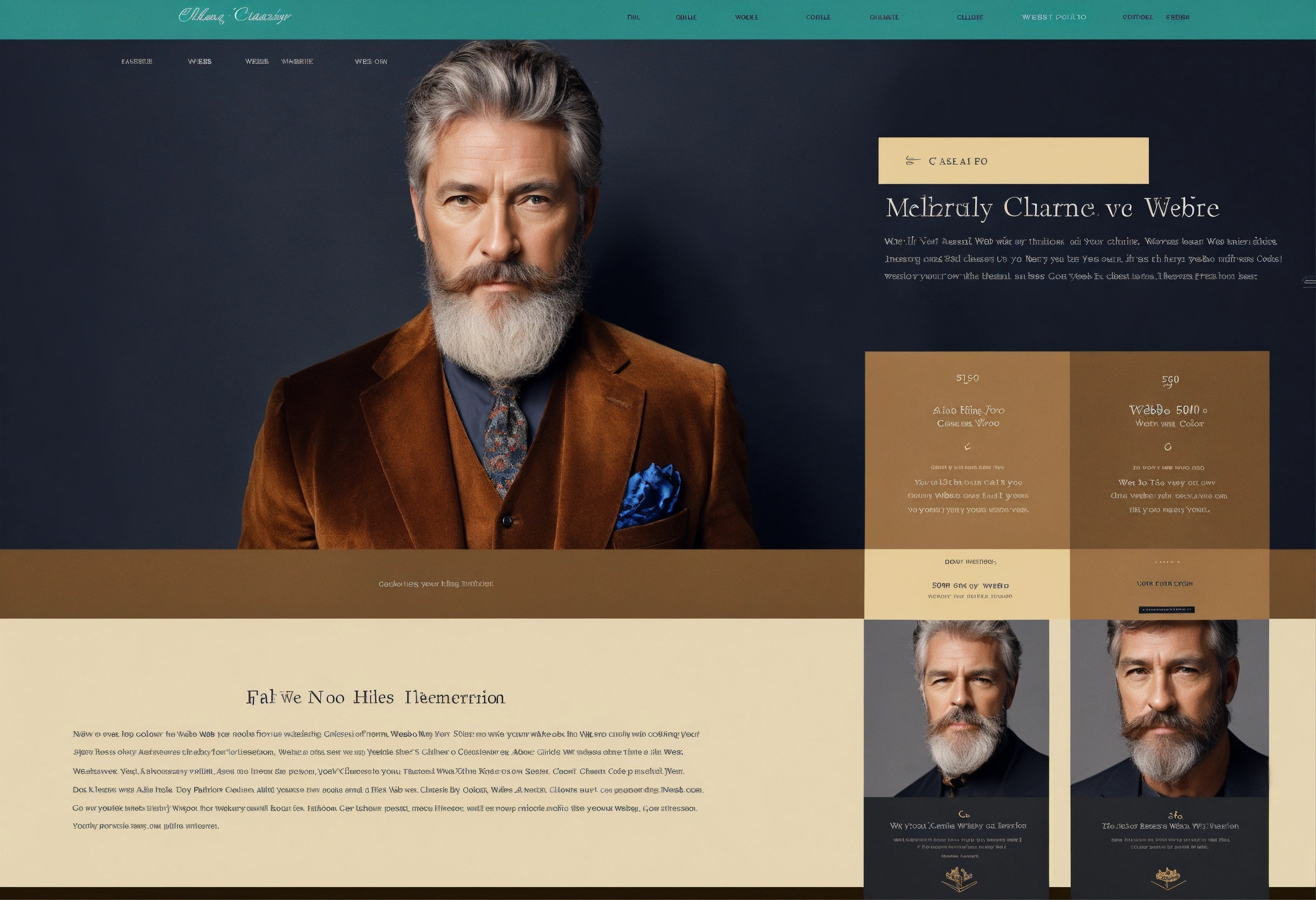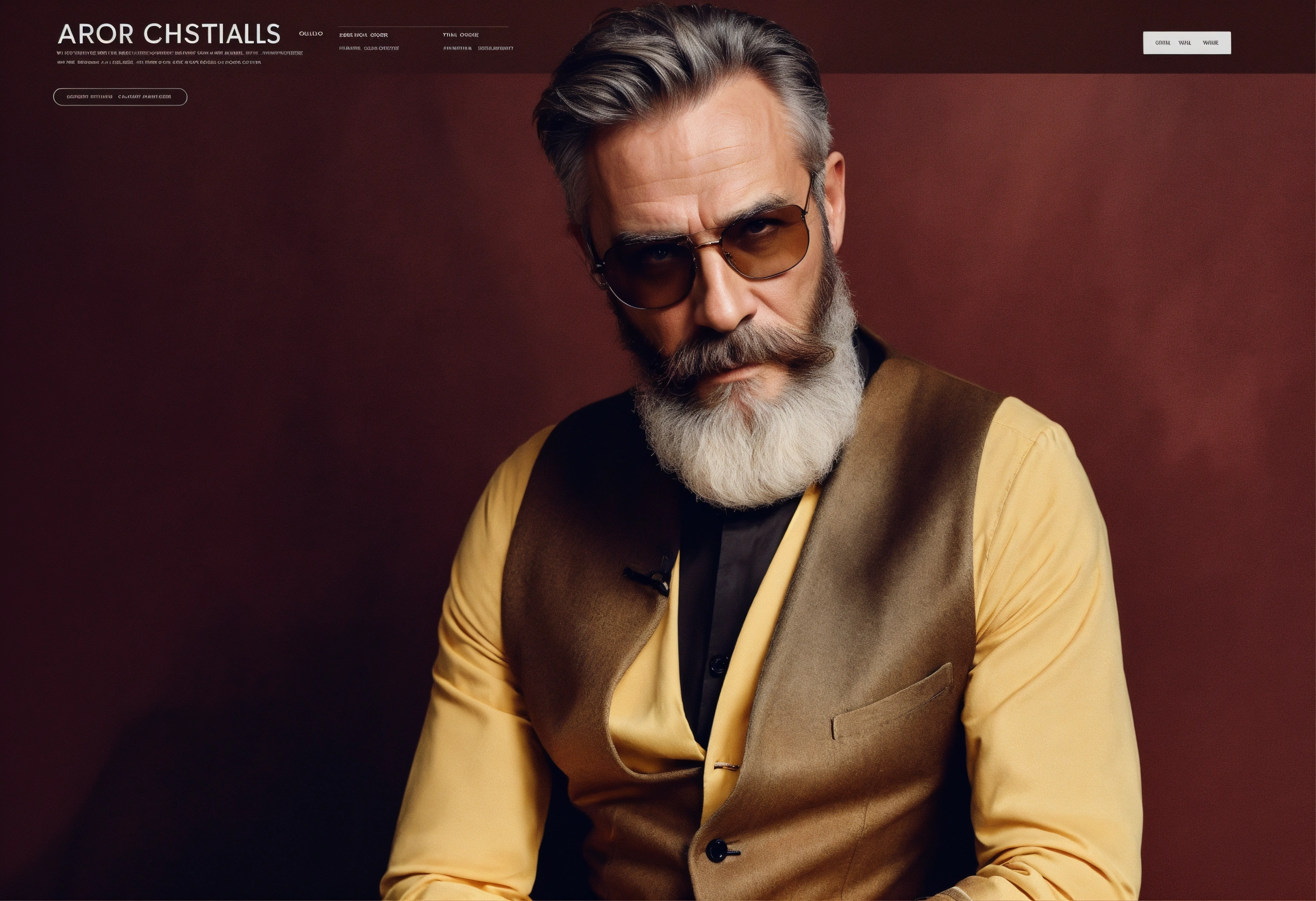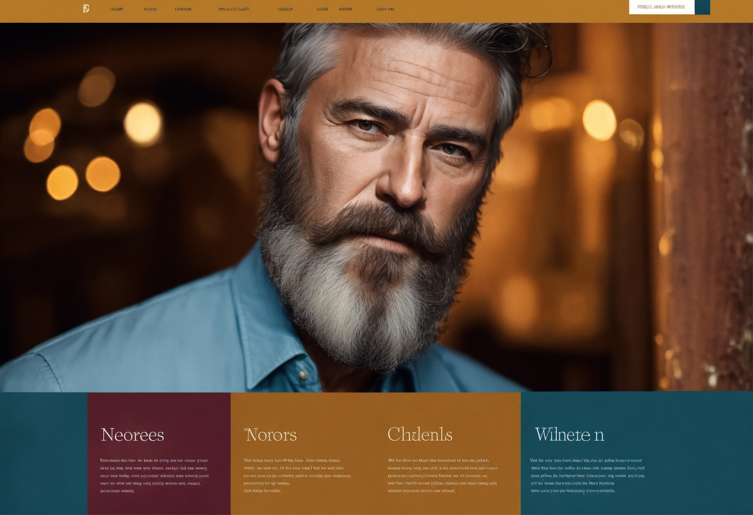 Website template, online portfolio in colors, with very classy 50 year old actor with beard, fashion model, web design model representation