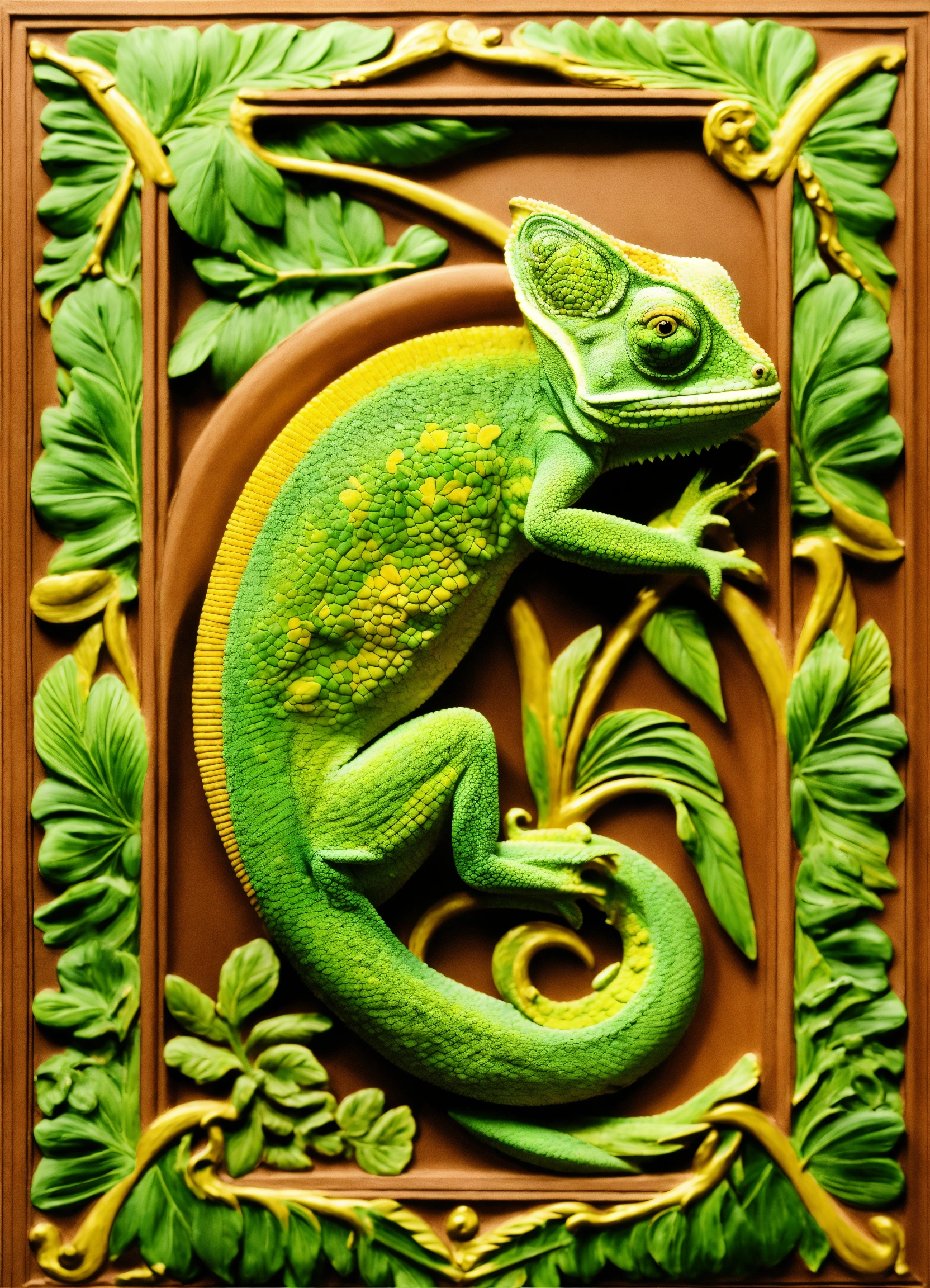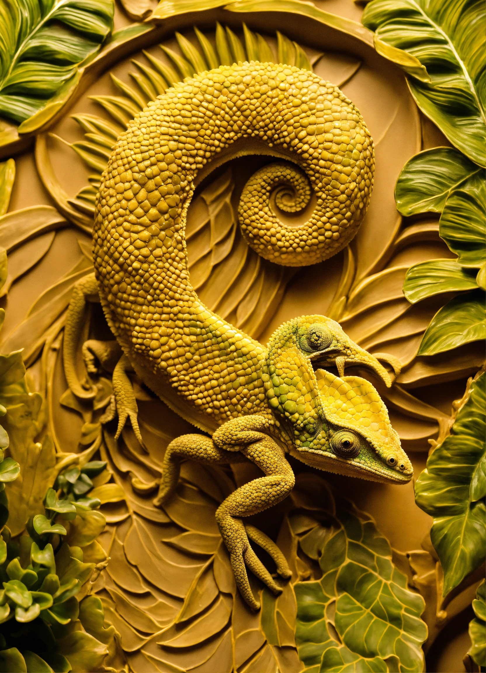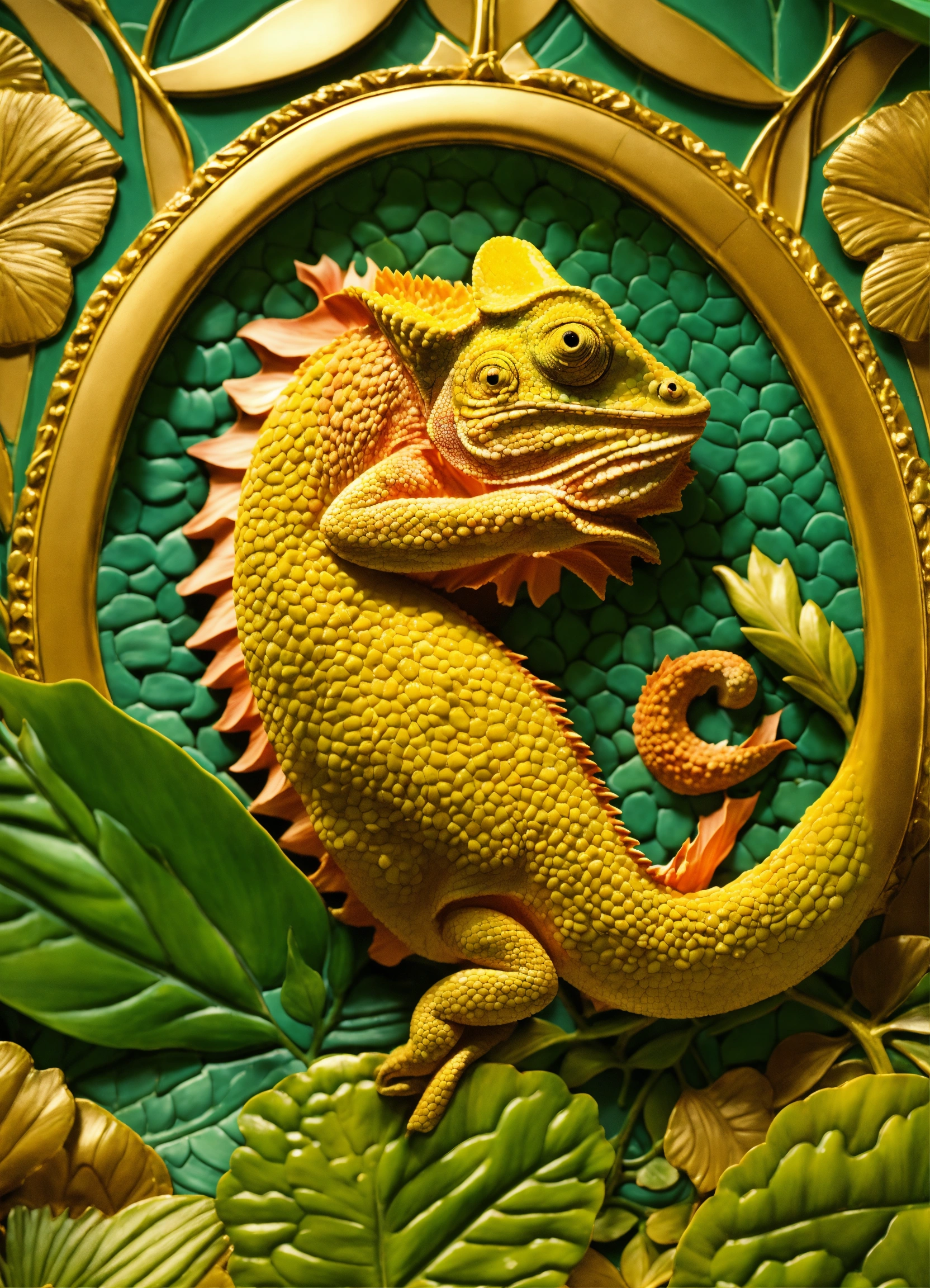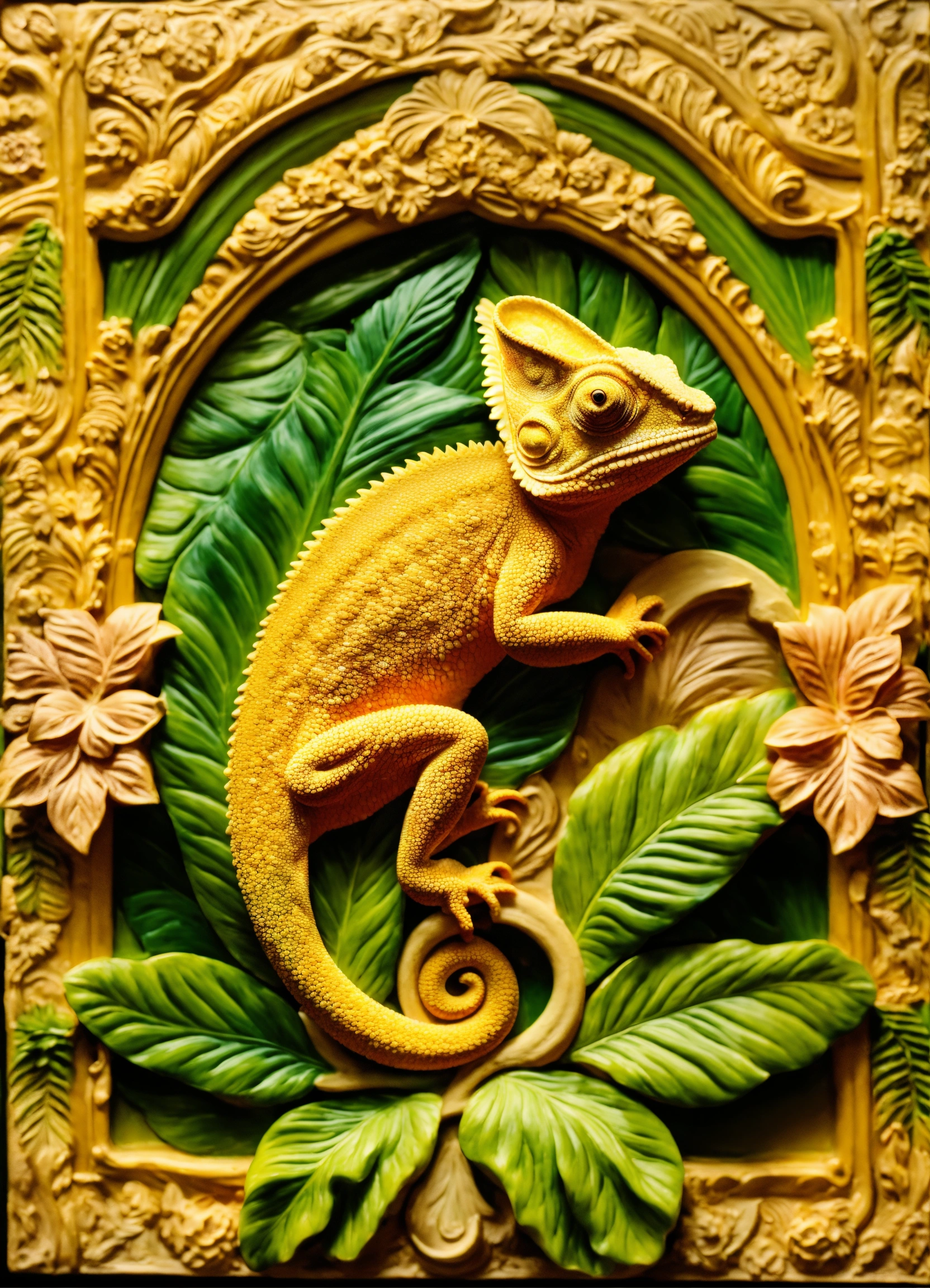 Chameleon, paint-relief, plaster, symmetry ornament exotic plants, ornament tropical plants, 4k, volume, high detail, sculpture, plants, the background is golden, smooth, gypsum, center, decorative pattern, motif, highly detailed volumetric plaster work, bas-relief, painting, beautiful composition, the golden ratio, the big picture, the composition is beautiful, chameleon in tropical plants
