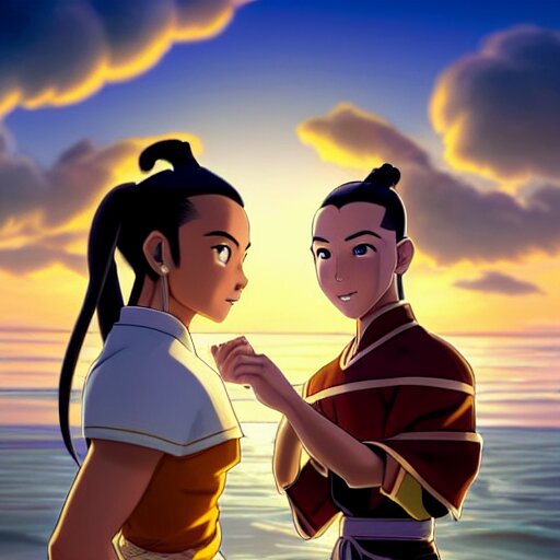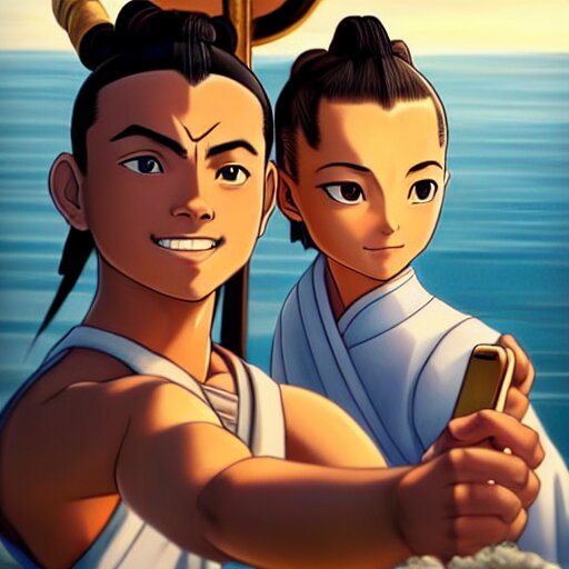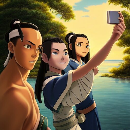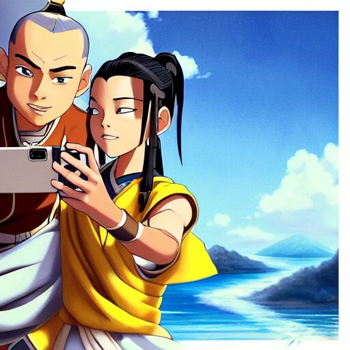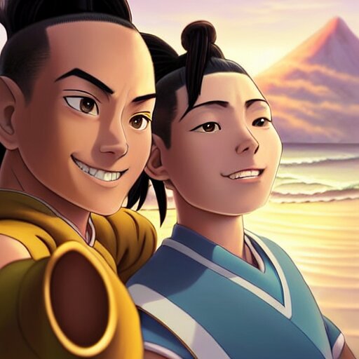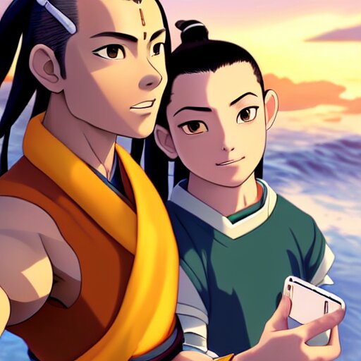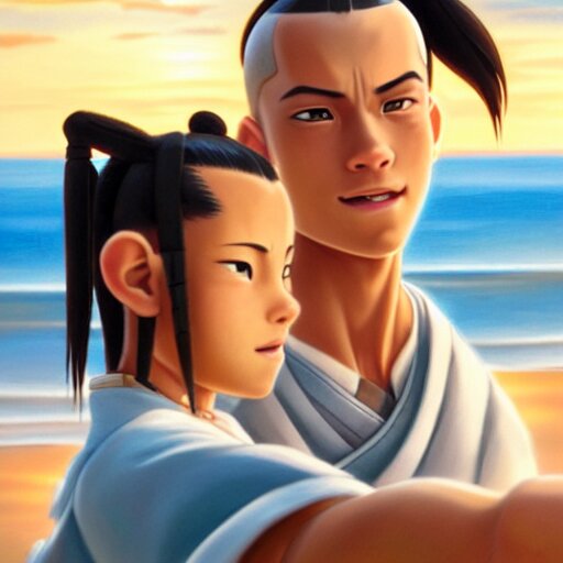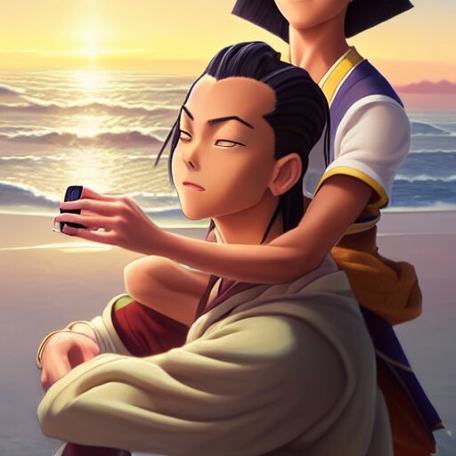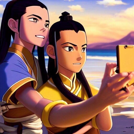 Beautiful serene intricate portrait of sokka and toph from avatar the last airbender taking a selfie, smiling softly, relaxing on the beach, golden hour, soft focus, 8 k, art by irakli nadar, hyperrealism, hyperdetailed, ultra realistic