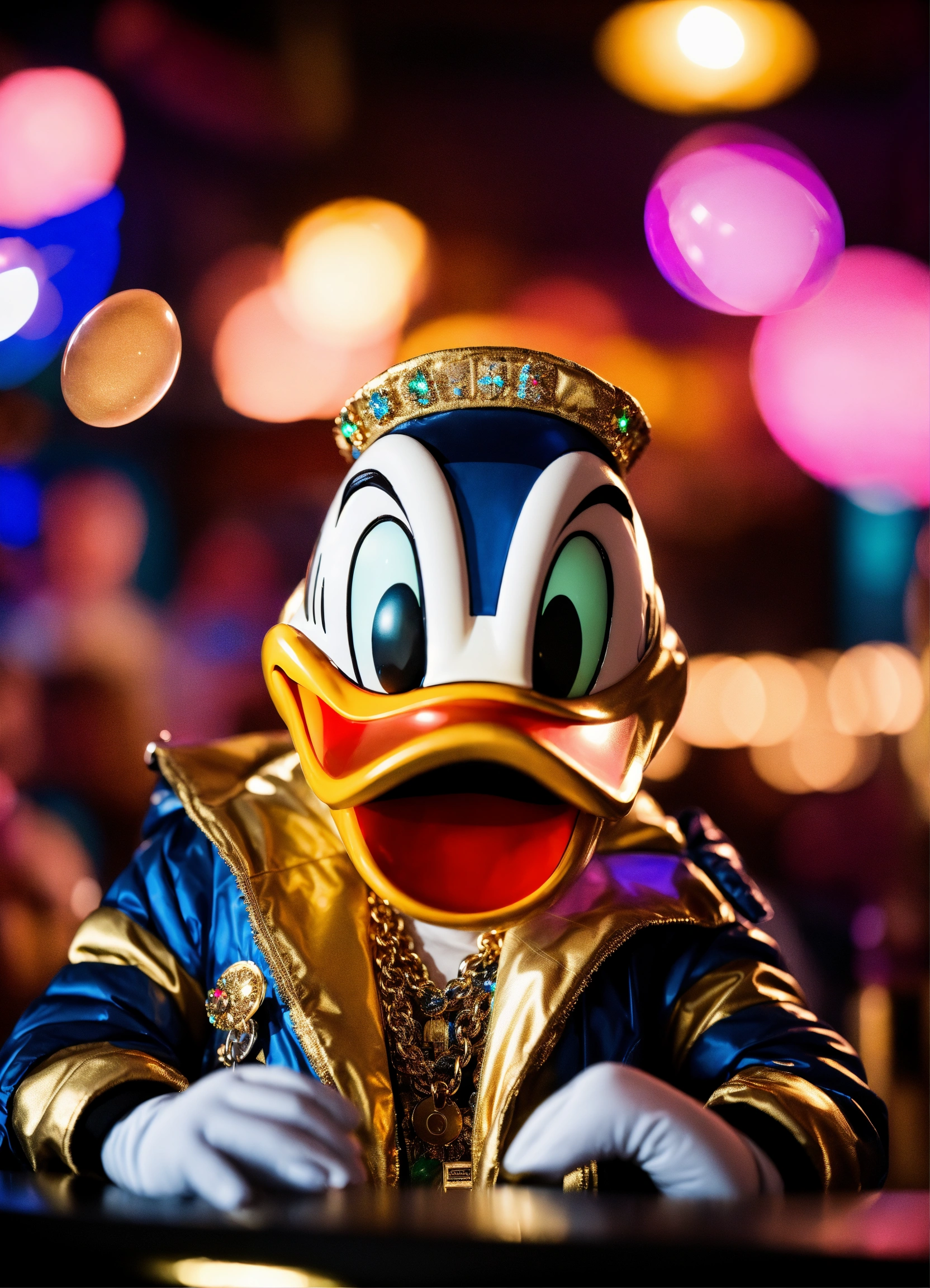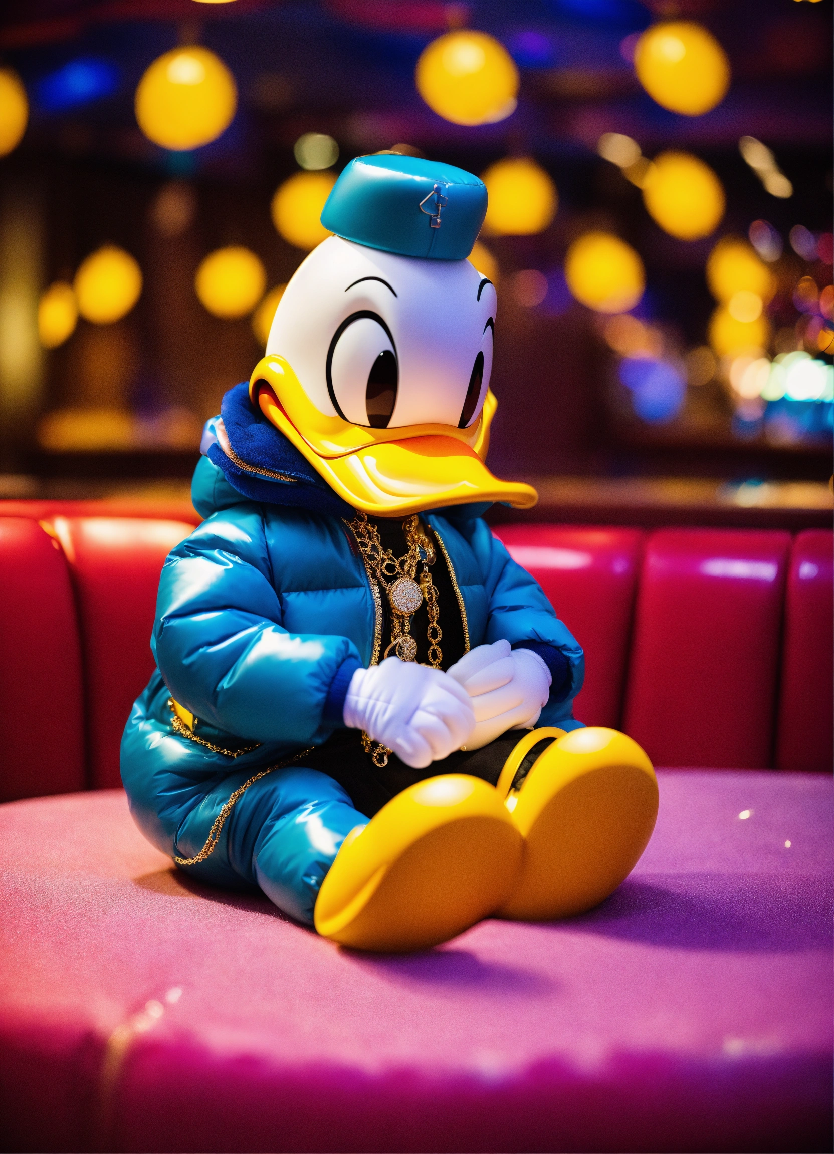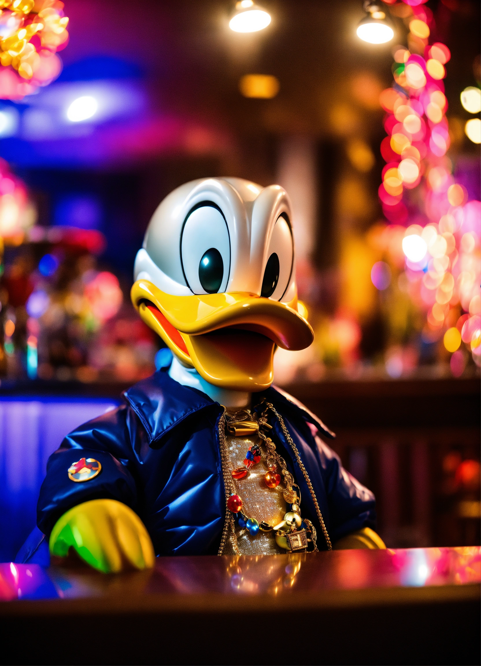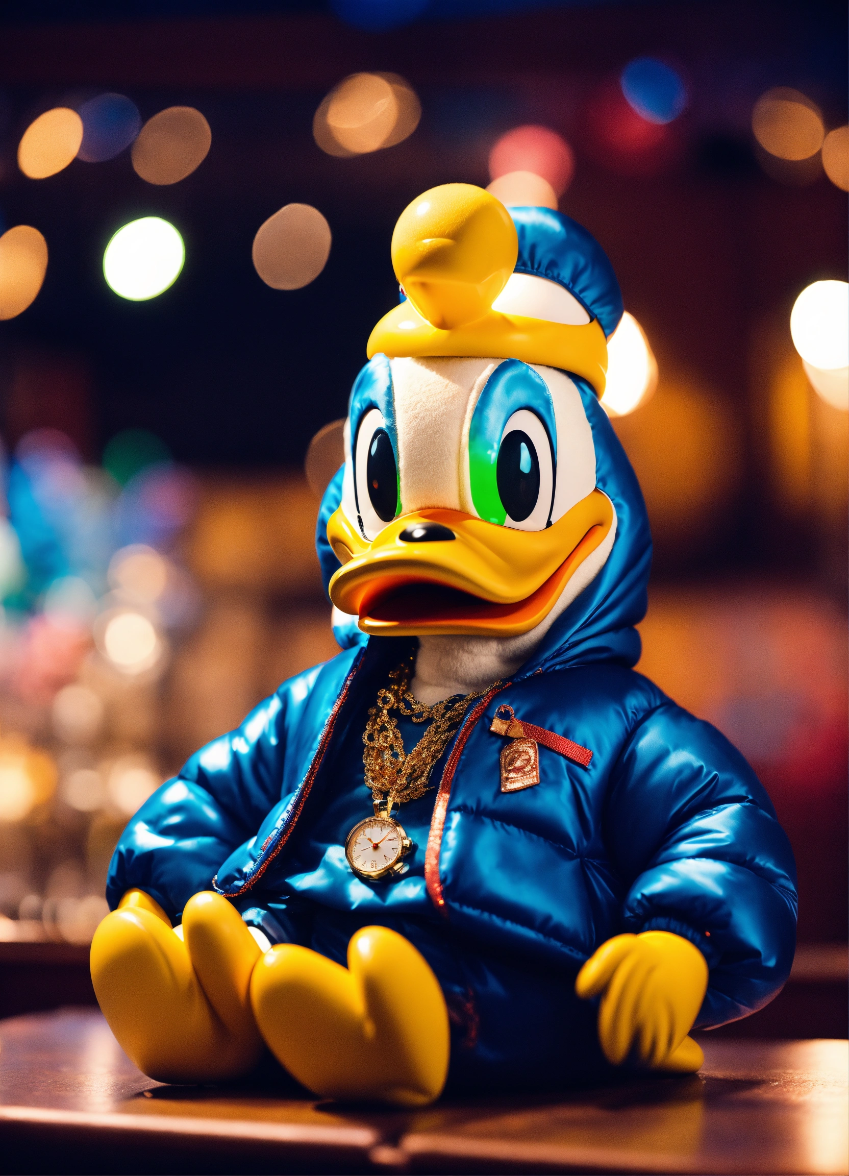 Donald duck sitting in a club, wearing a bubble jacket, large necklace, gold watch, colorful lights, depth of field
