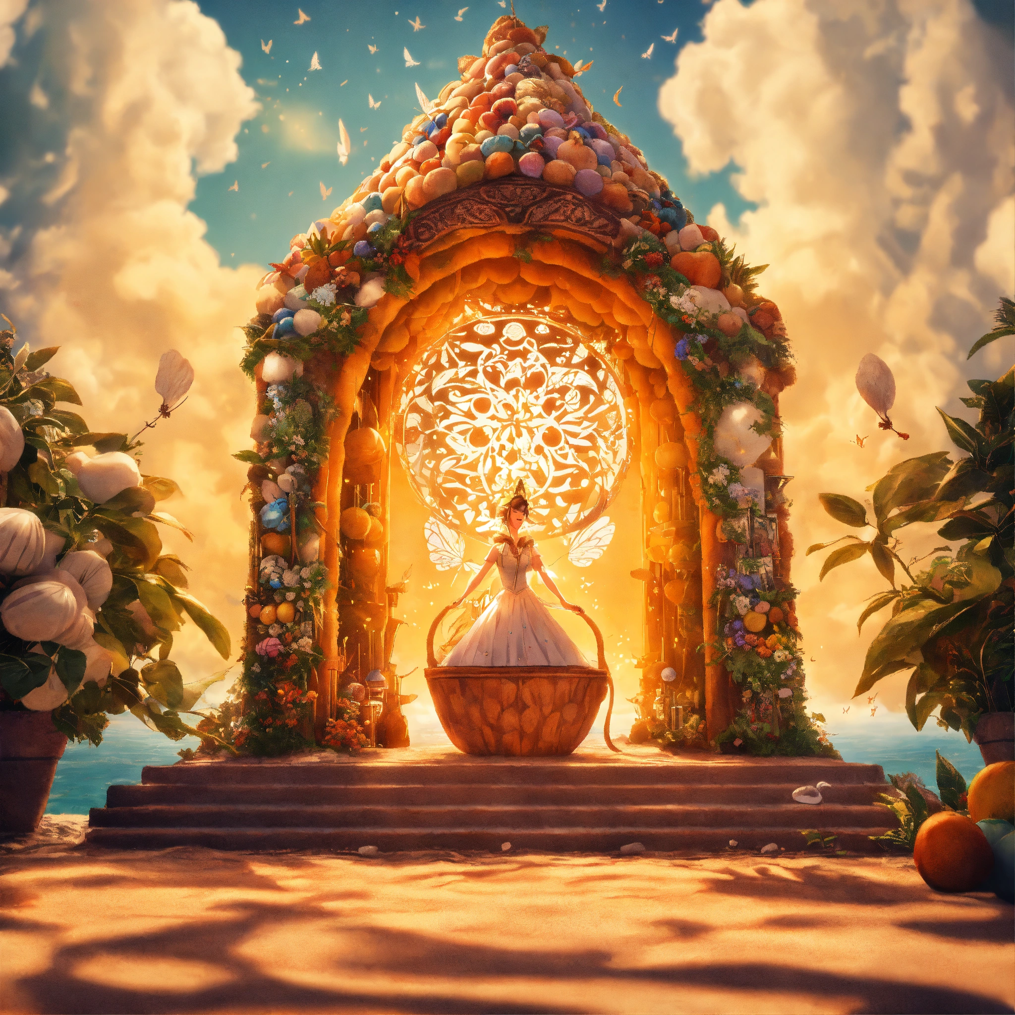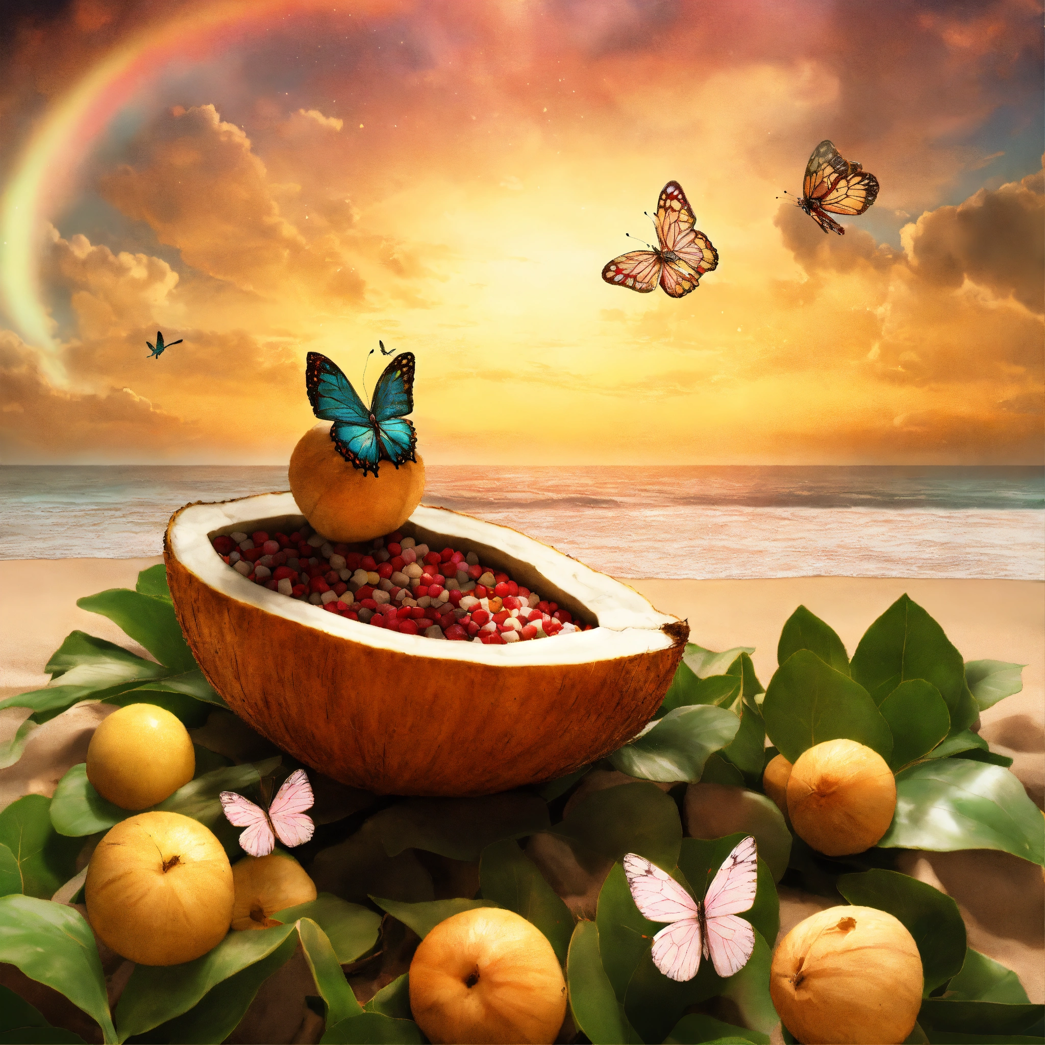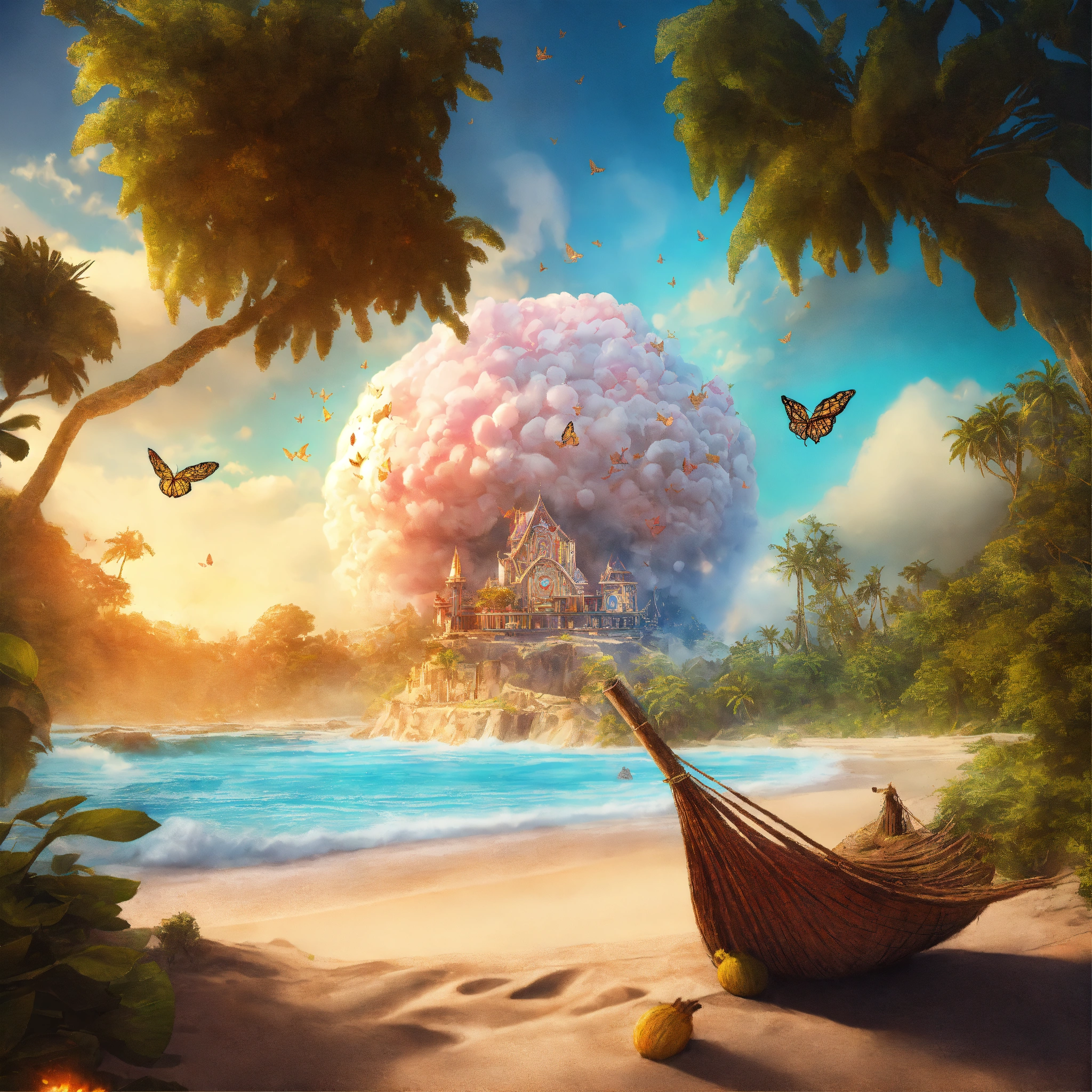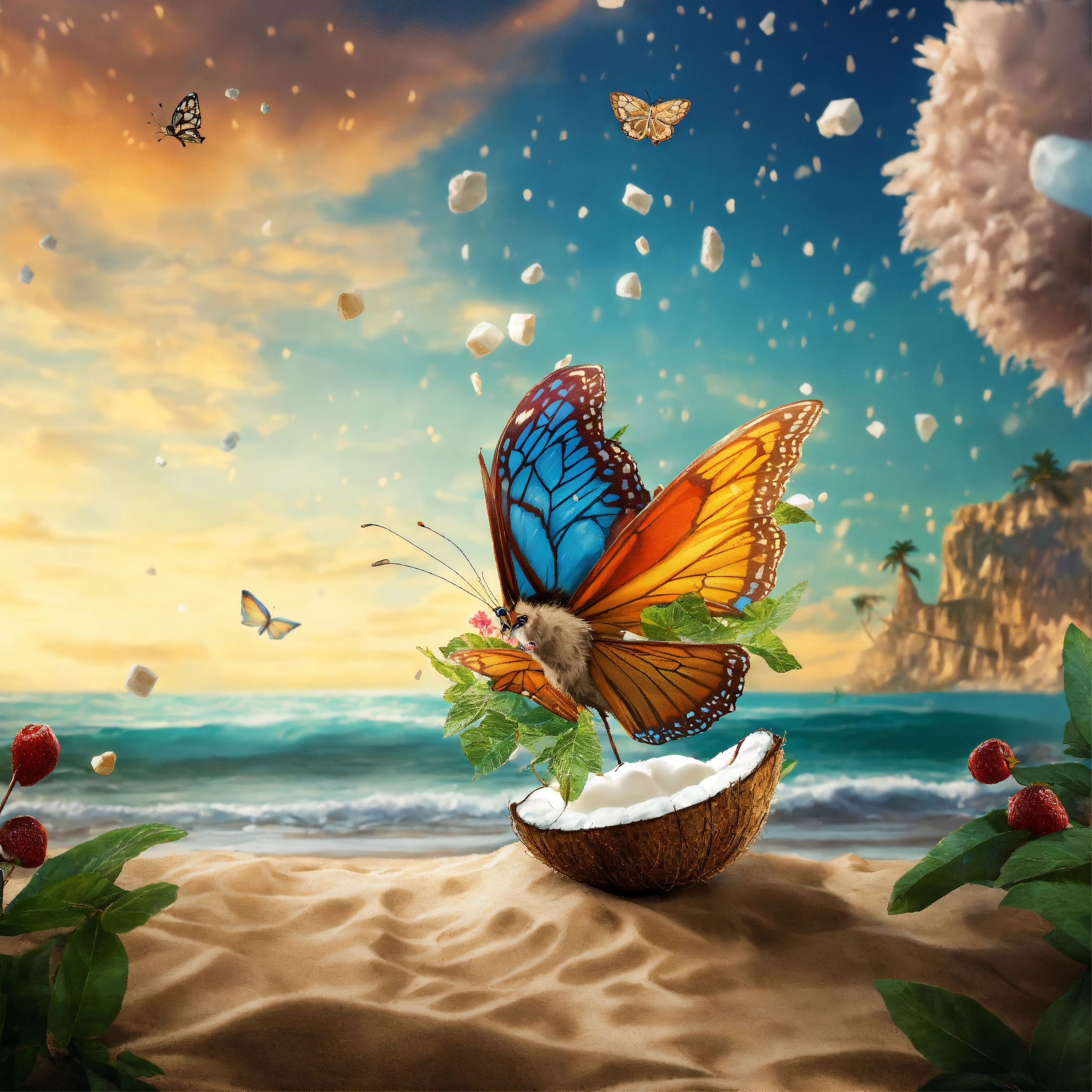 Image. illustrate a laughing giant butterfly on a coconut milk ocean beach, surrounded by giant marshmallow clouds. long exposure photography style, cartoon style, x-ray style, in the style of tim burton, lion king, the chronicles of narnia, beauty and the beast, and peter pan. with native american and sacred geometric patterns on the body. enchanting aura. the chronicles of narnia, wizard of oz, and alice in wonderland background and fruit trees with white leaves.