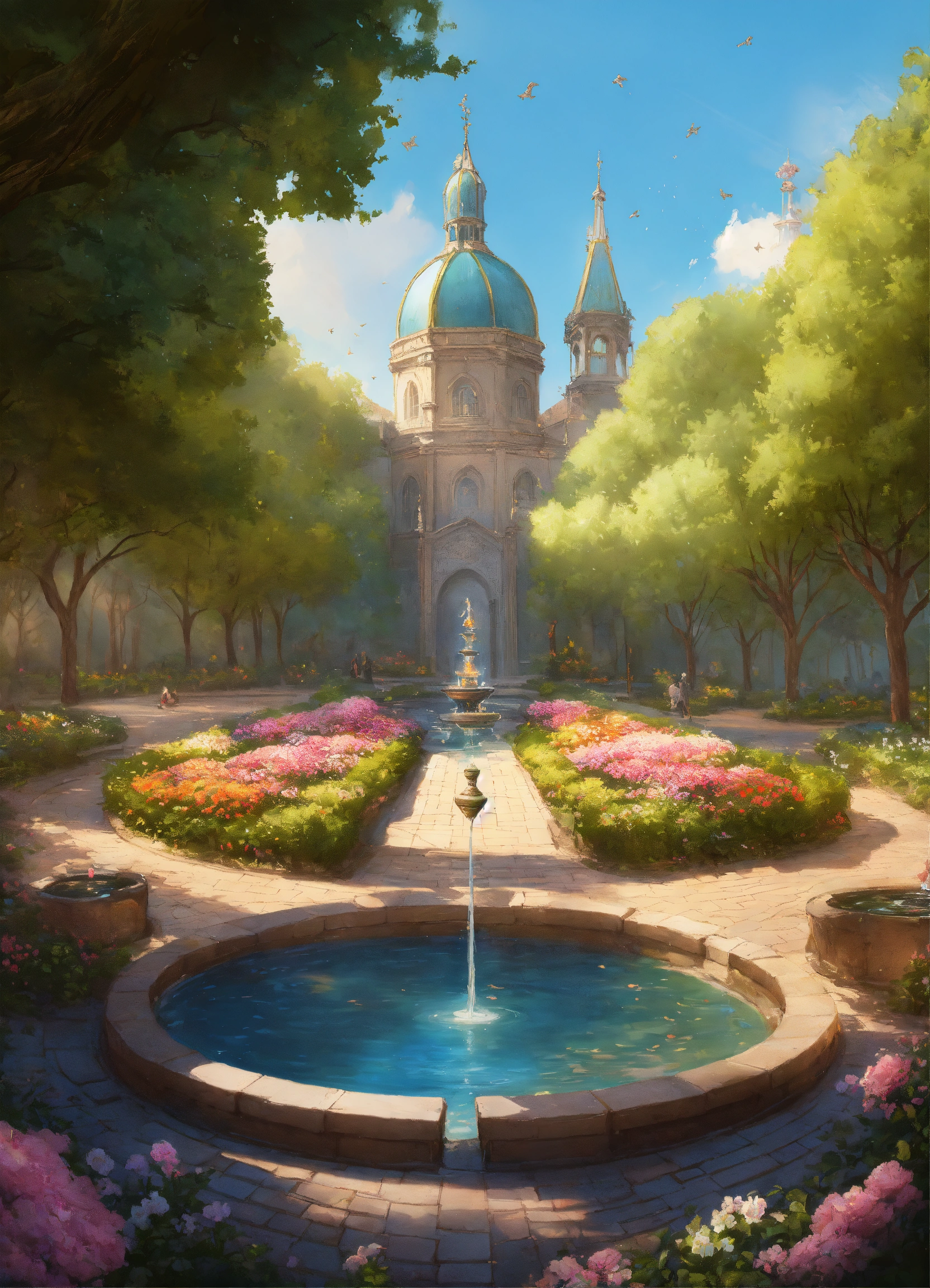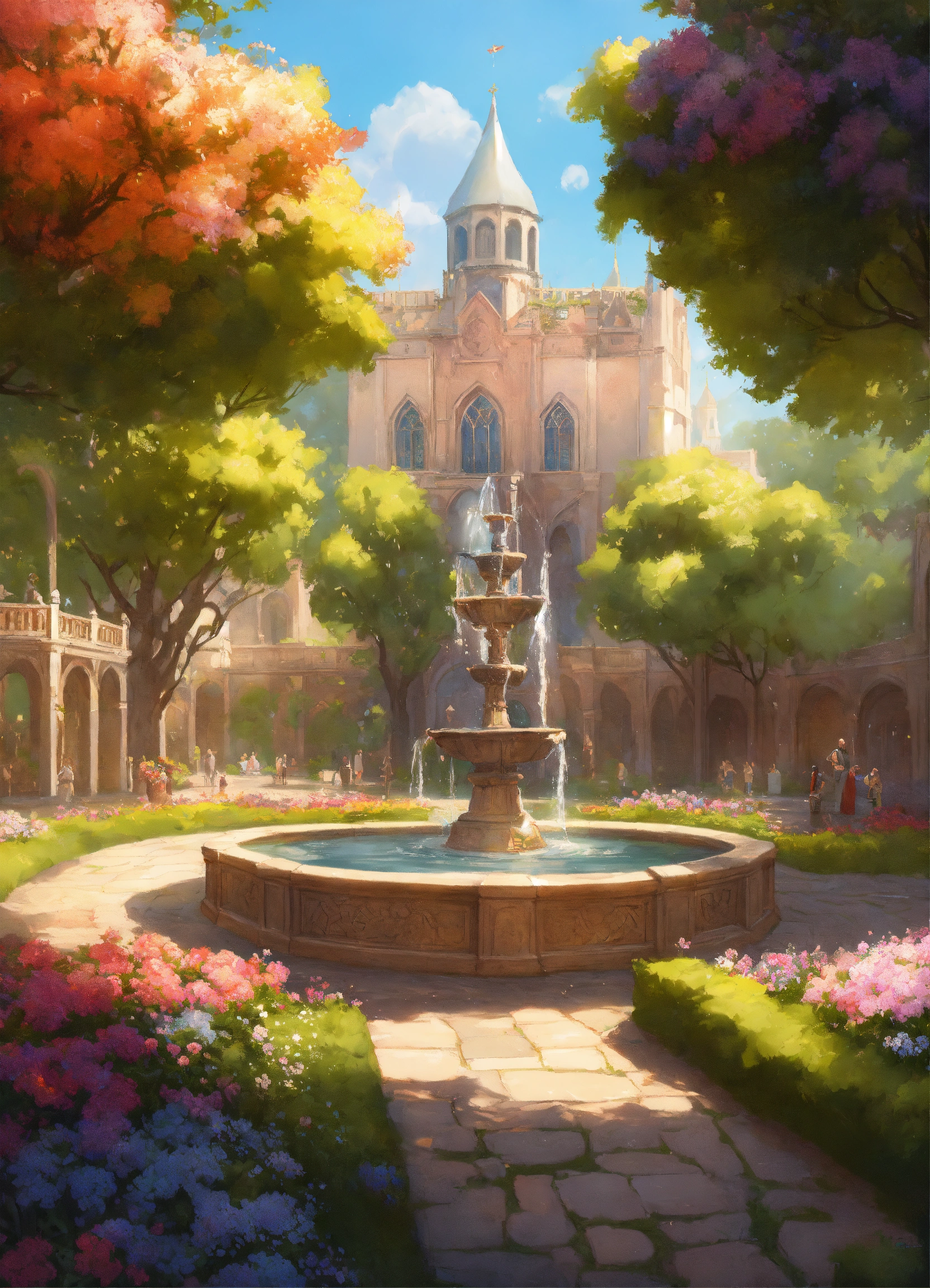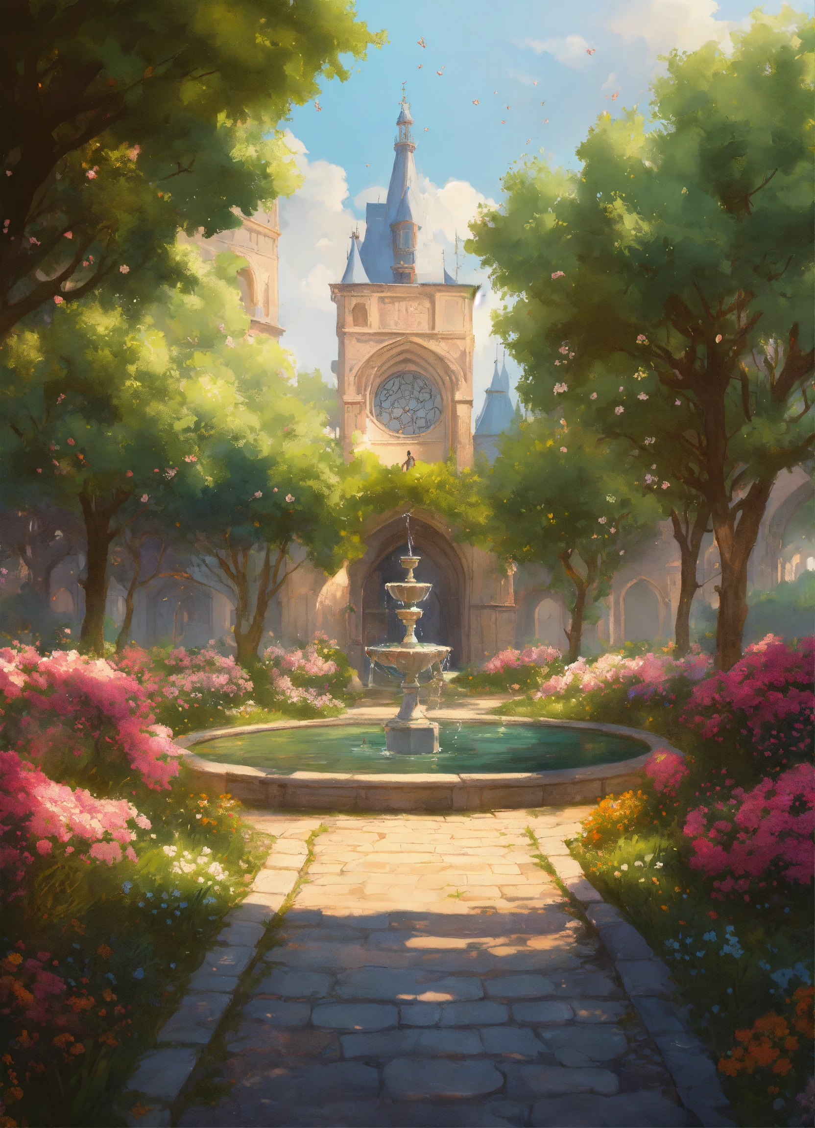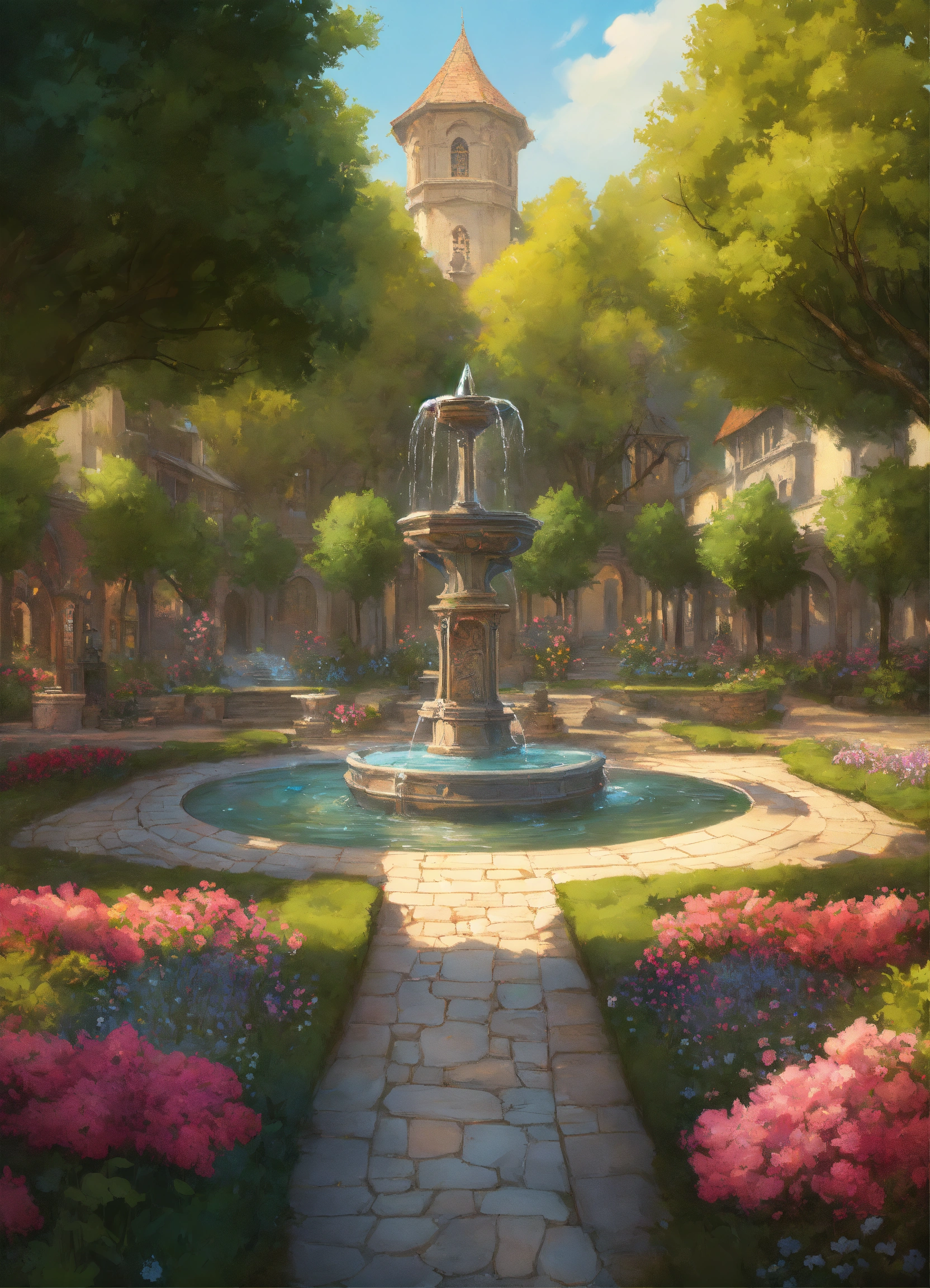 Image of a medieval large parc with a fountain in the center of the image, flowers, trees and pathways, d & d, fantasy, highly detailed, digital painting, trending on artstation, concept art, sharp focus, illustration, art by artgerm and greg rutkowski and magali villeneuve, bright pastel colors