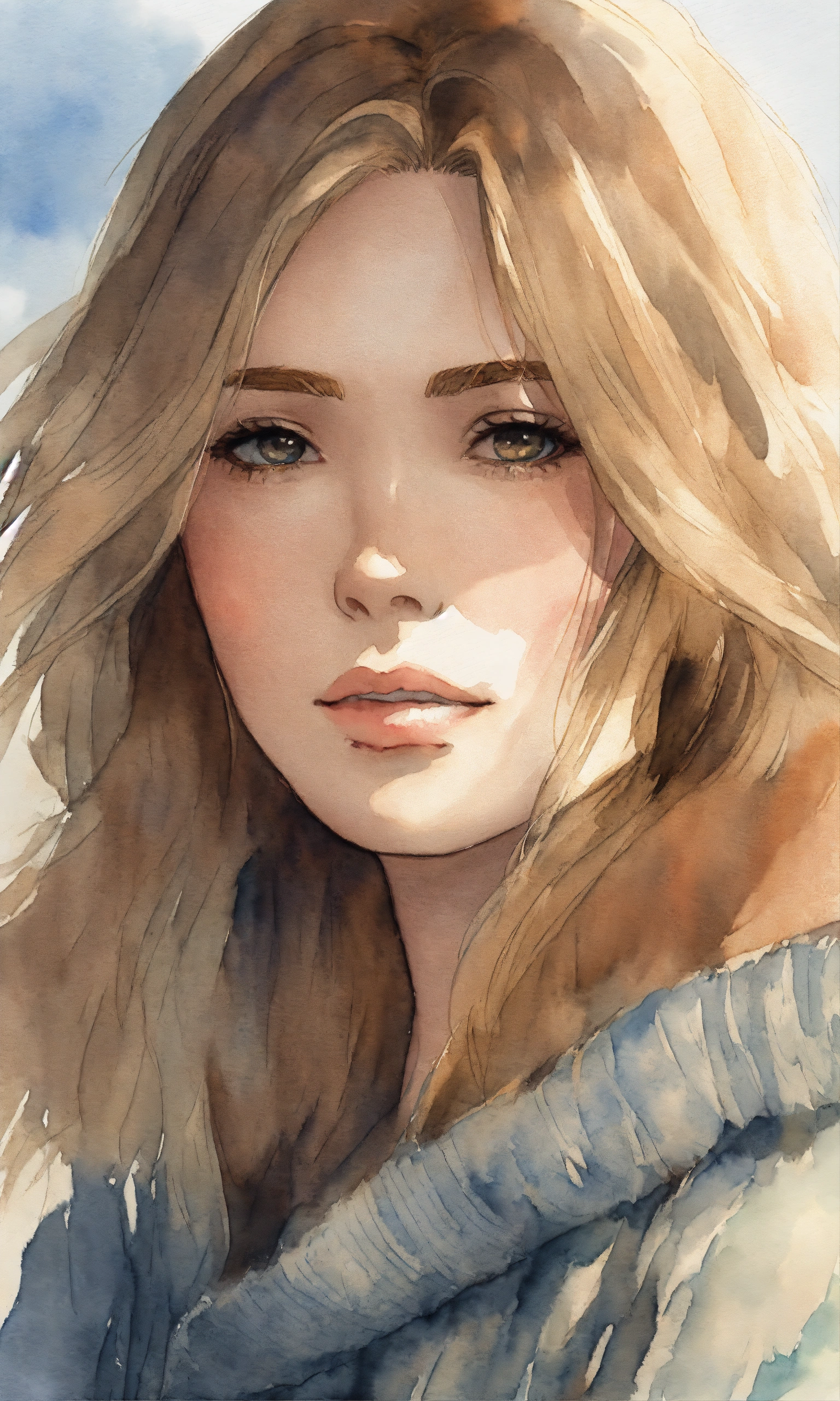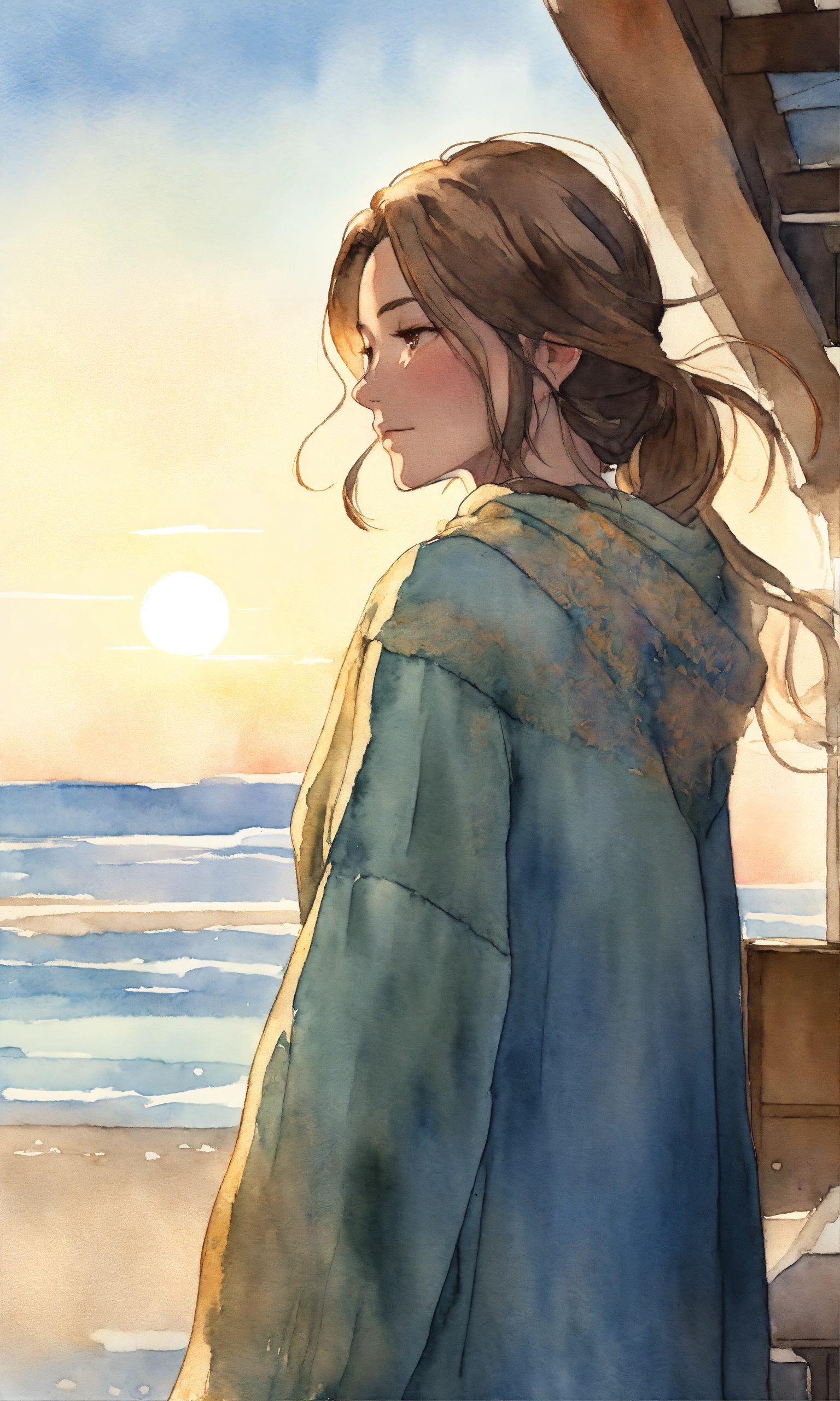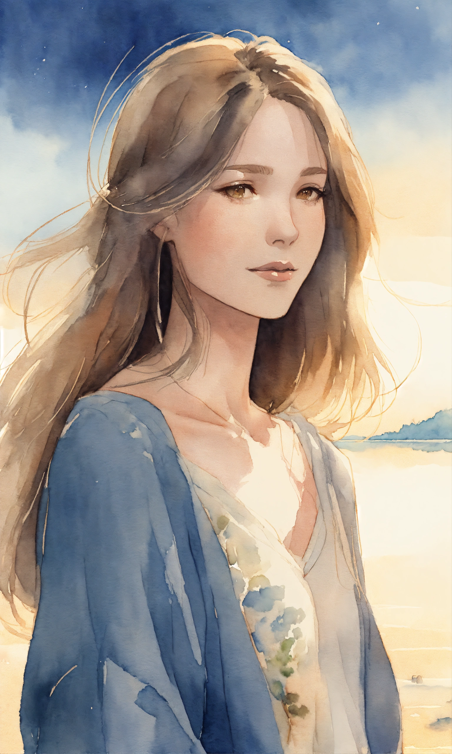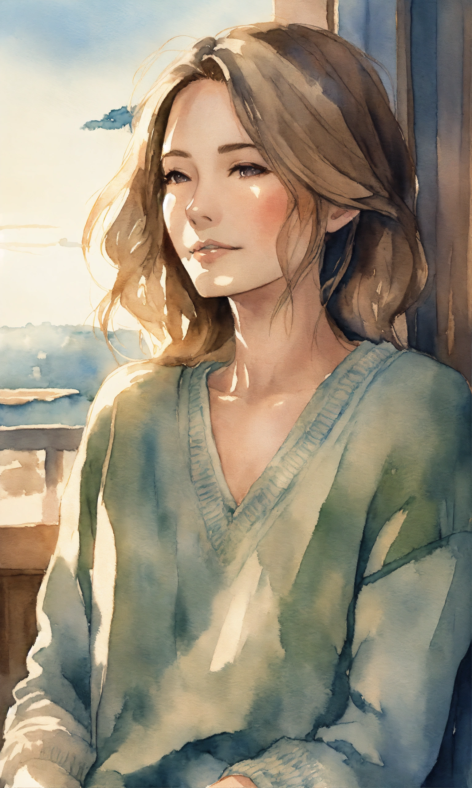 Half body watercolor illustration of an 42 year woman, dark blonde hair, wearing a long boho sweater, comfortable, stylish, chic, no makeup, effortless, relaxed, casual, laid-back, frontal facing, beautiful light sky, low saturation, muted colors, animation, fantasy art, by makoto shinkai