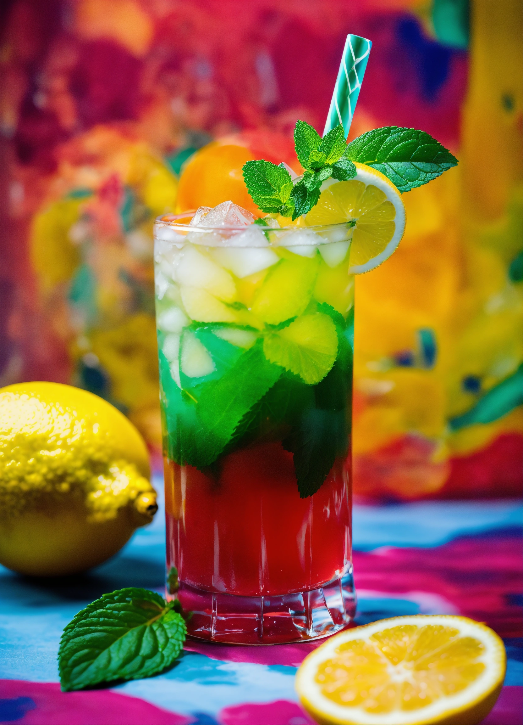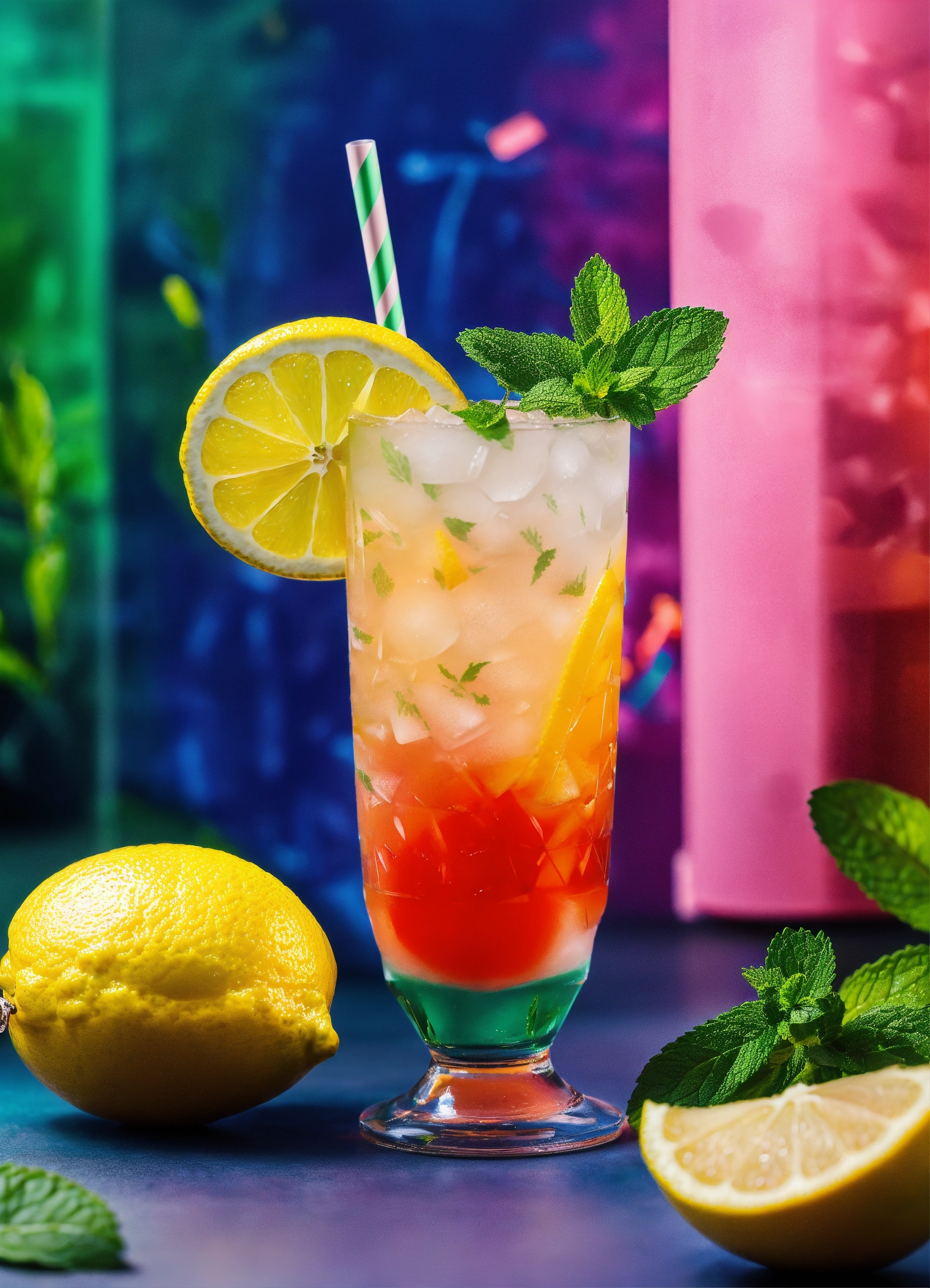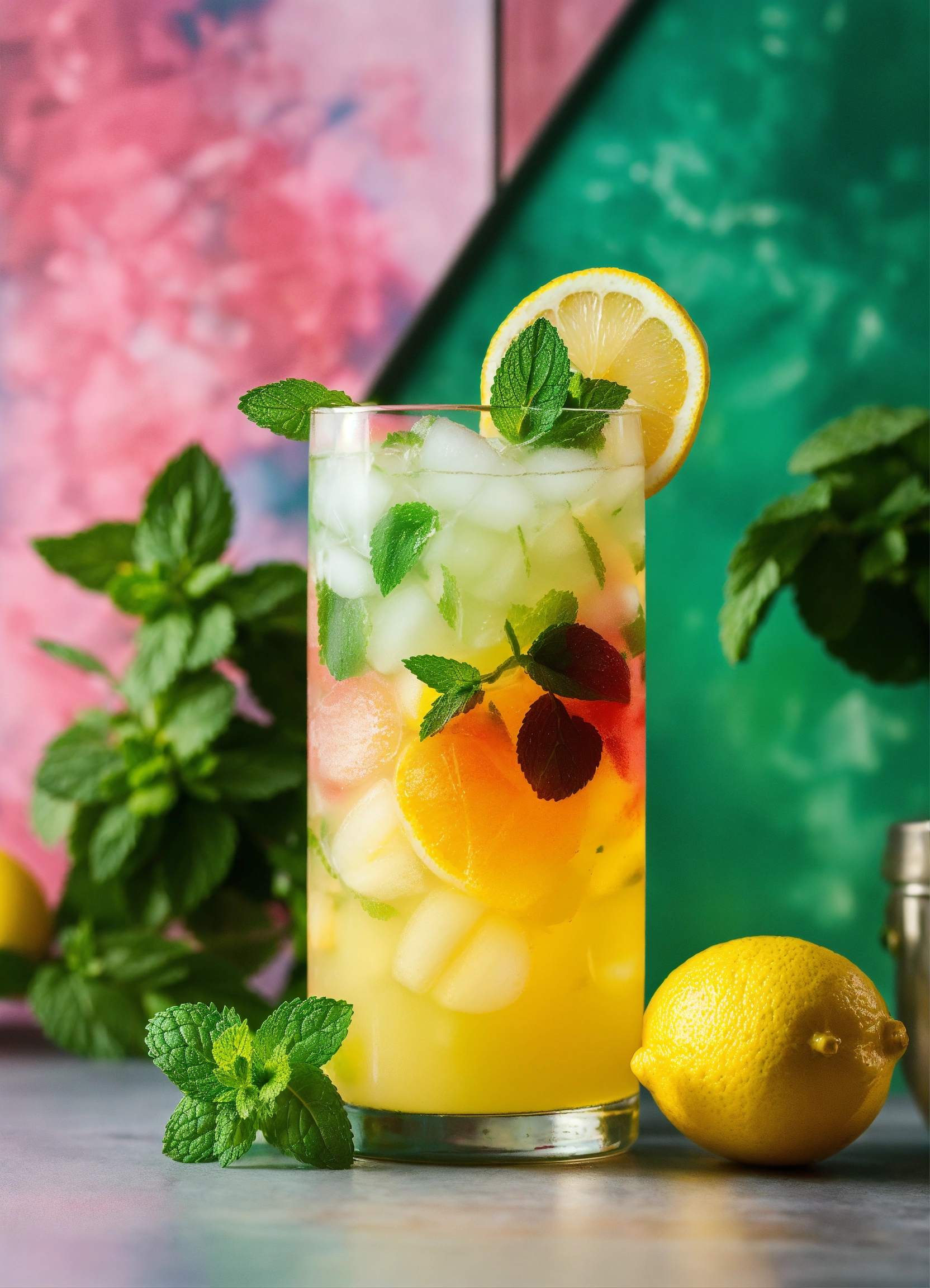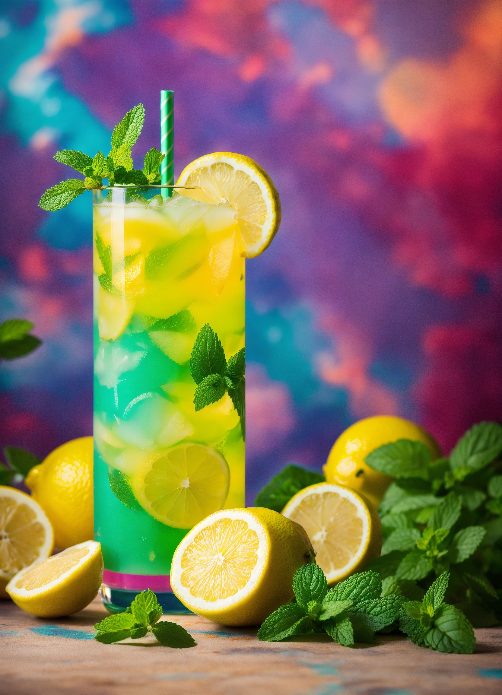 A photo of a colorful lemon mocktail can with mint leaves with an abstract background,