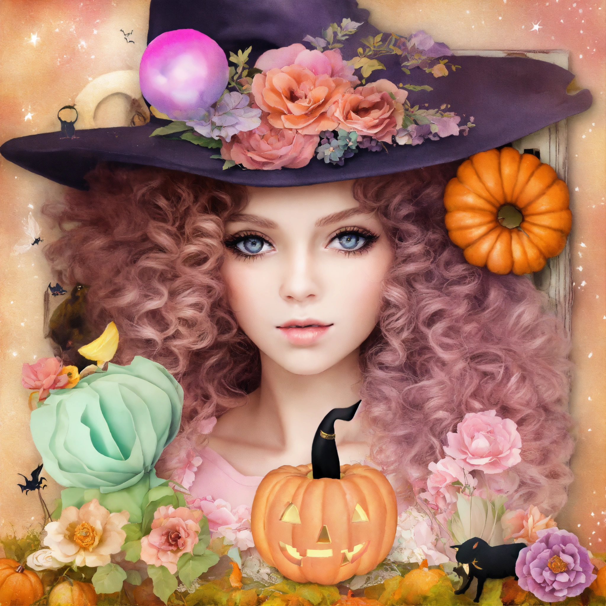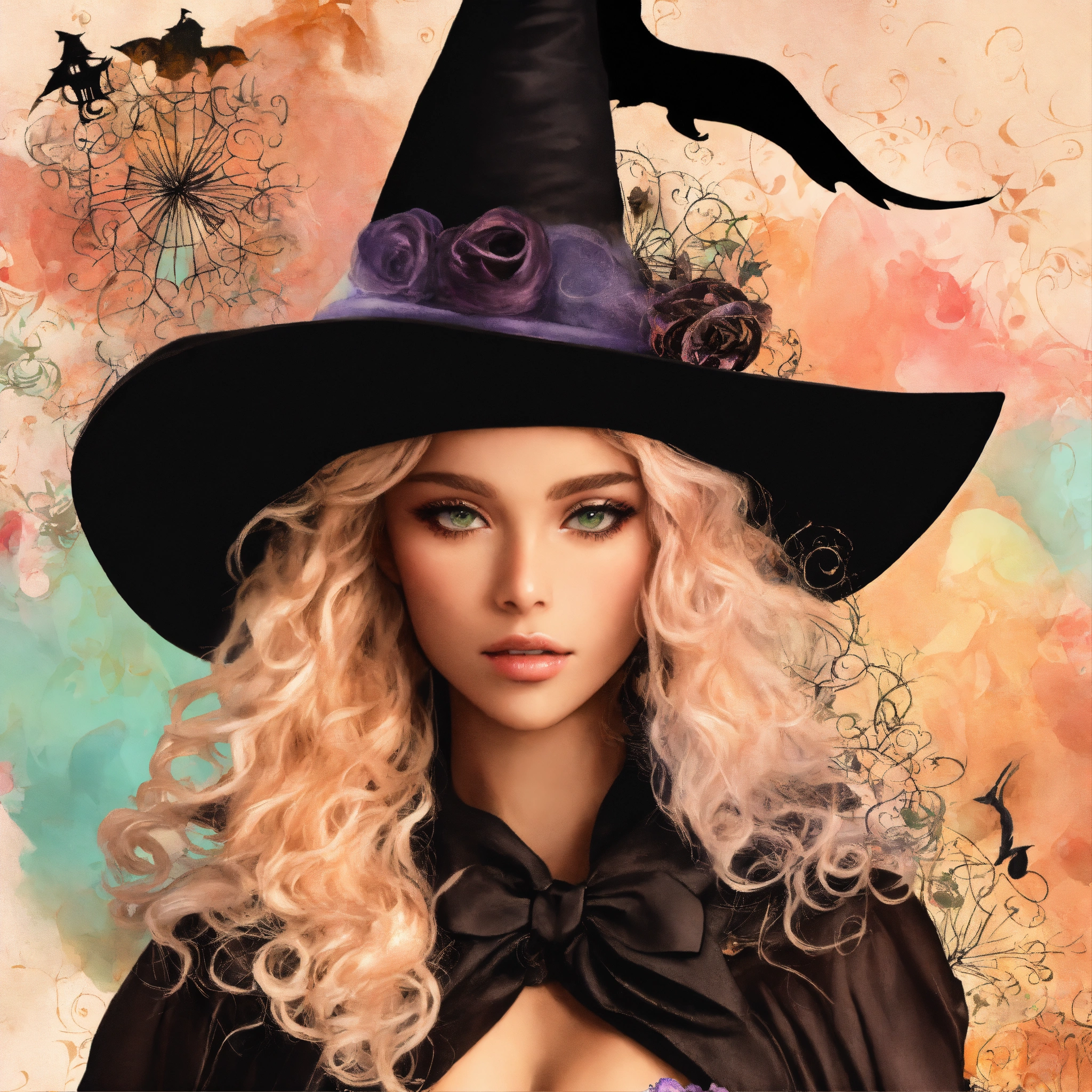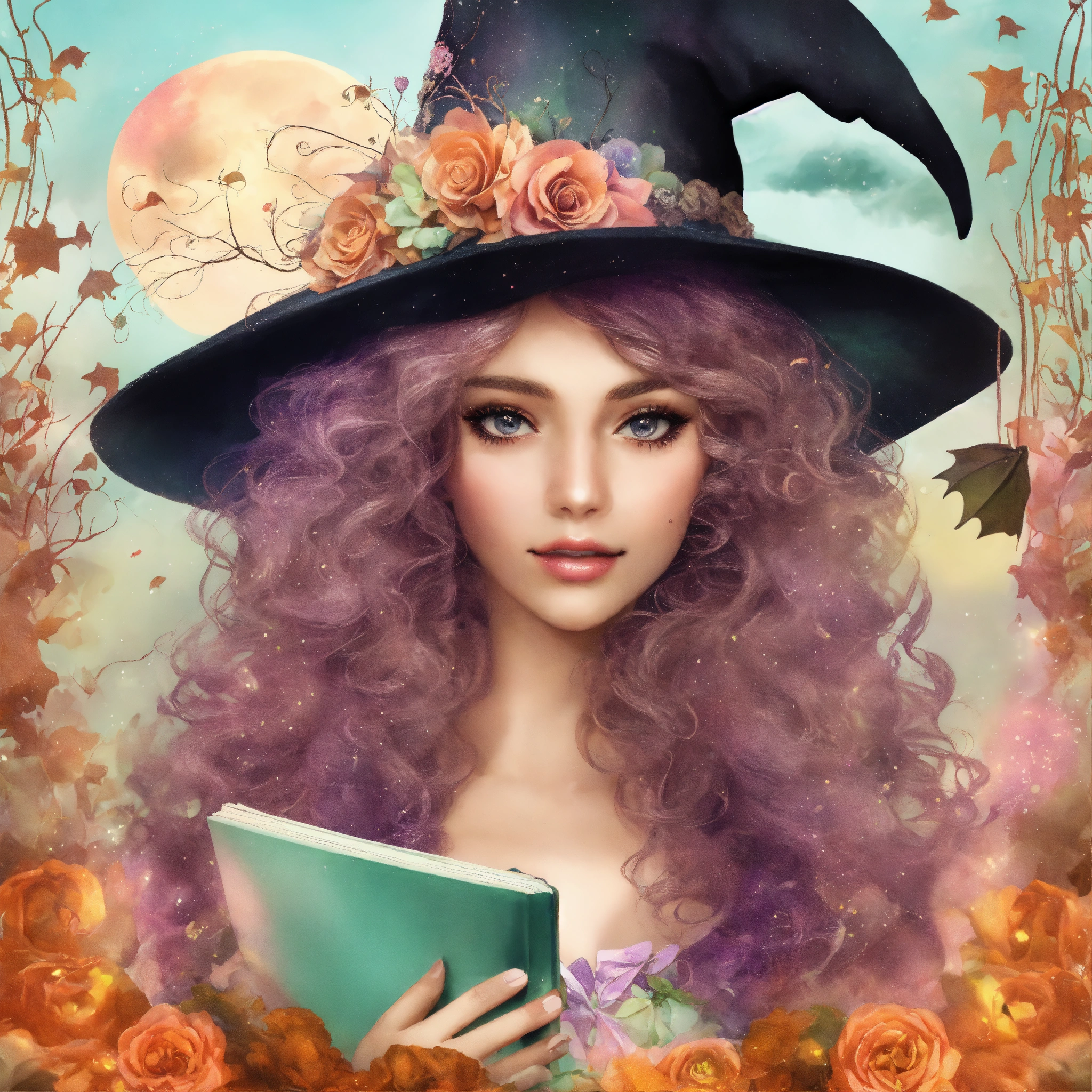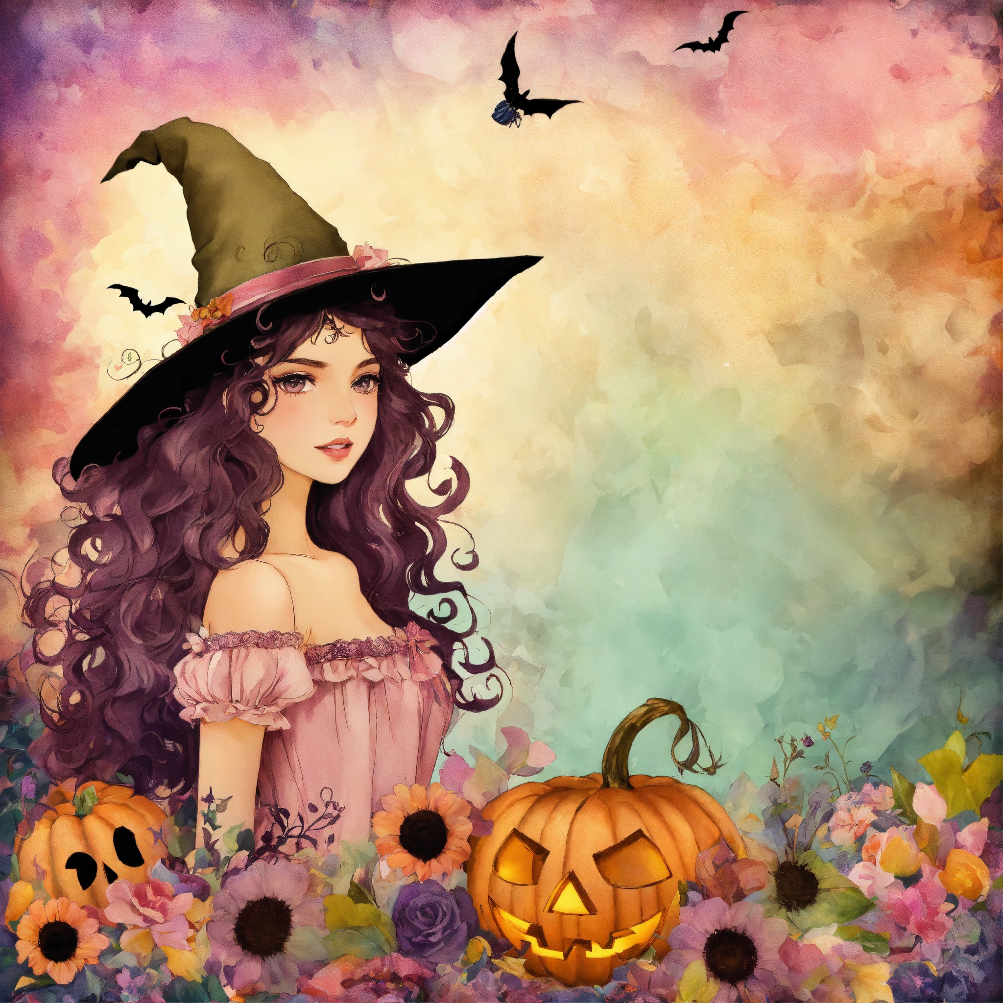Shabby chic dreamy mist pastel junk journals halloween country girl with curly hair and a witch's hat clipart, digital download, girls, junk journal, scrapbooking, card making embellishments, planner graphics swirling magical fairytale abstract art style