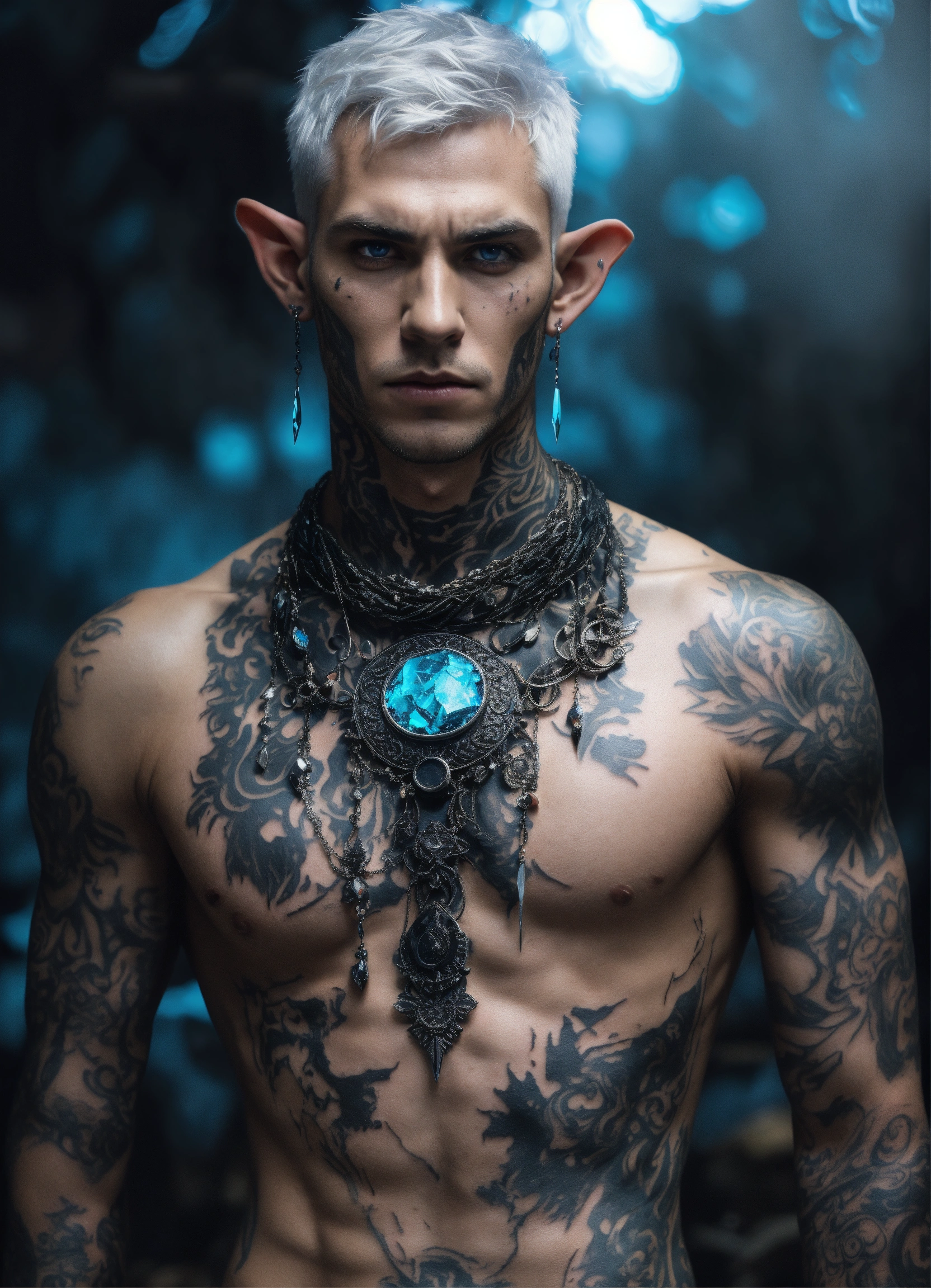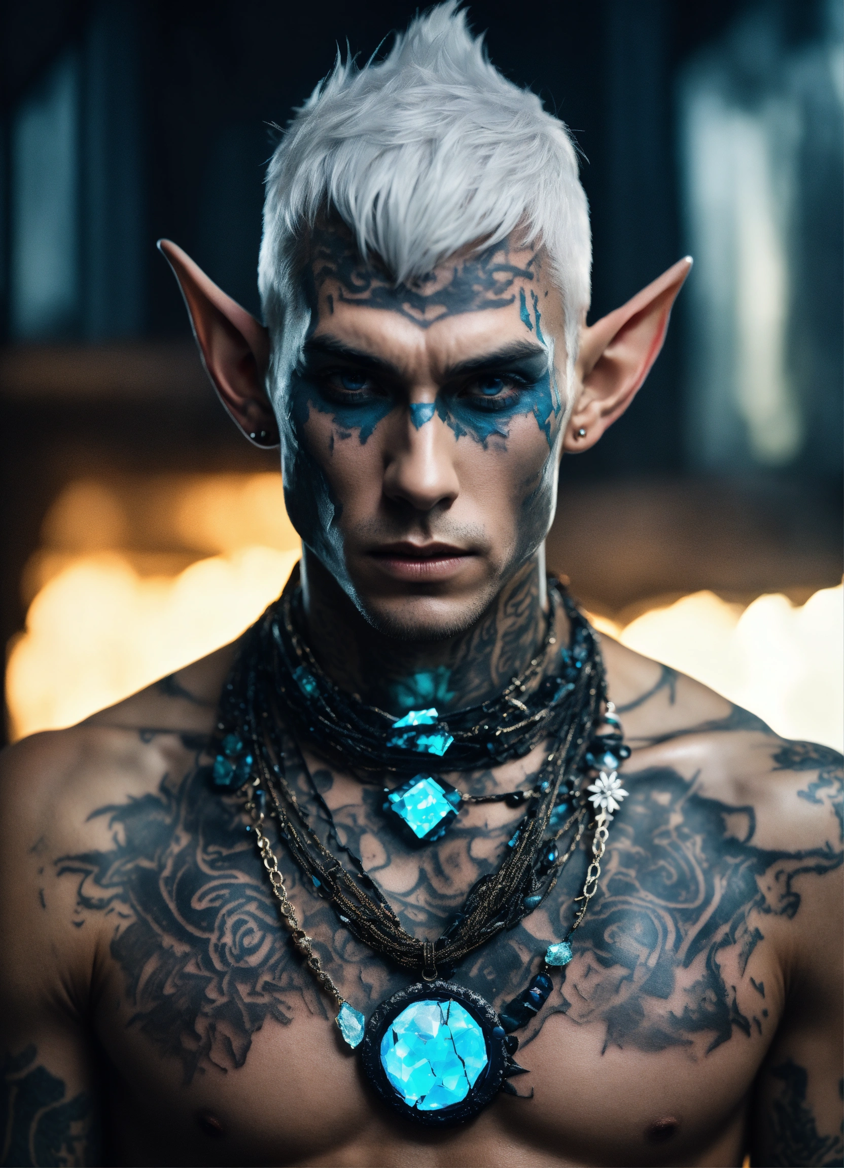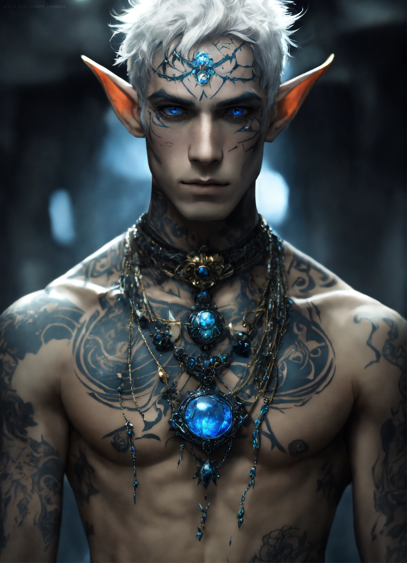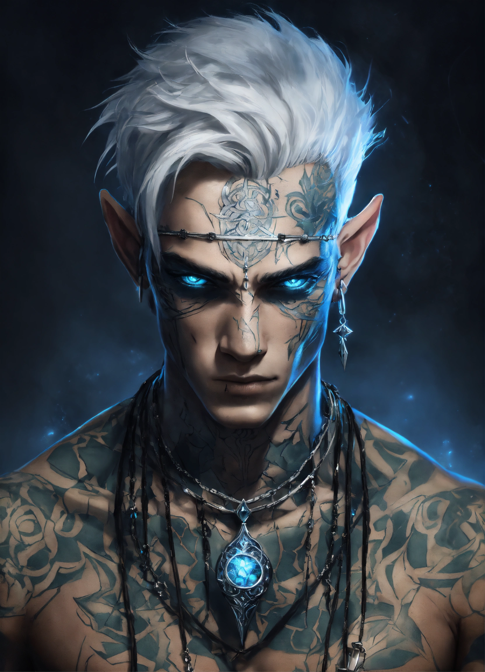 Fantasy torso shot of a tatooed male elf, sickly thin, gaunt body type, monk, grey skin, black shattered skin, black cracked face, broken skin, inocent expression, pointy chin, glowing white hair, wide blue eyes, lost expression, black shadow magic, ultra detailed, necklace, piercings