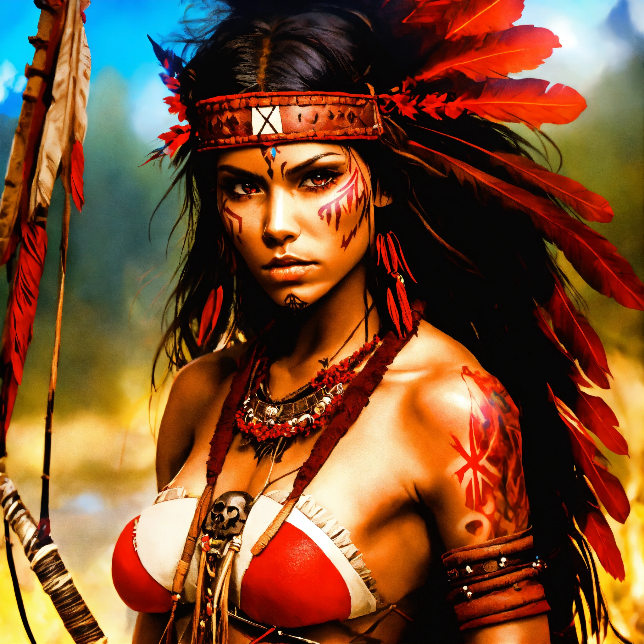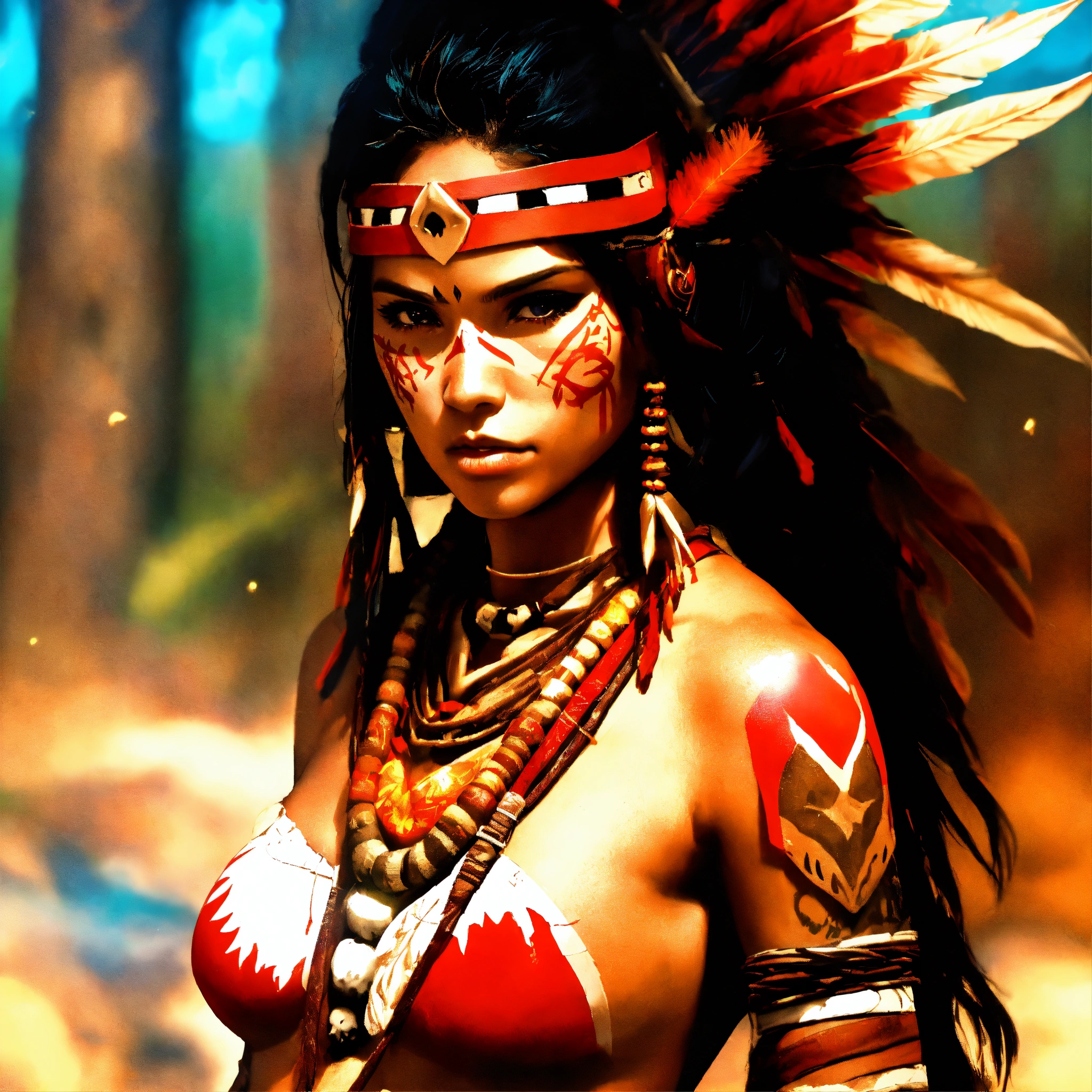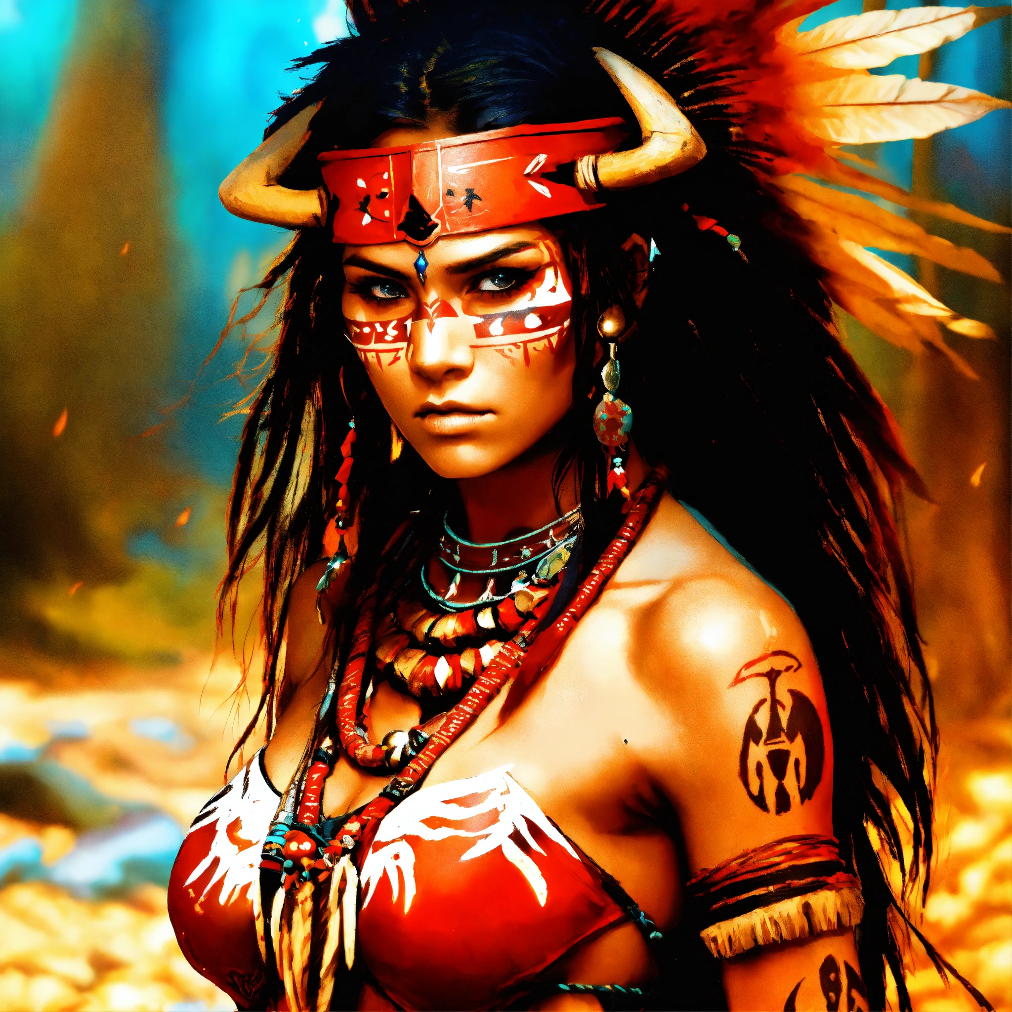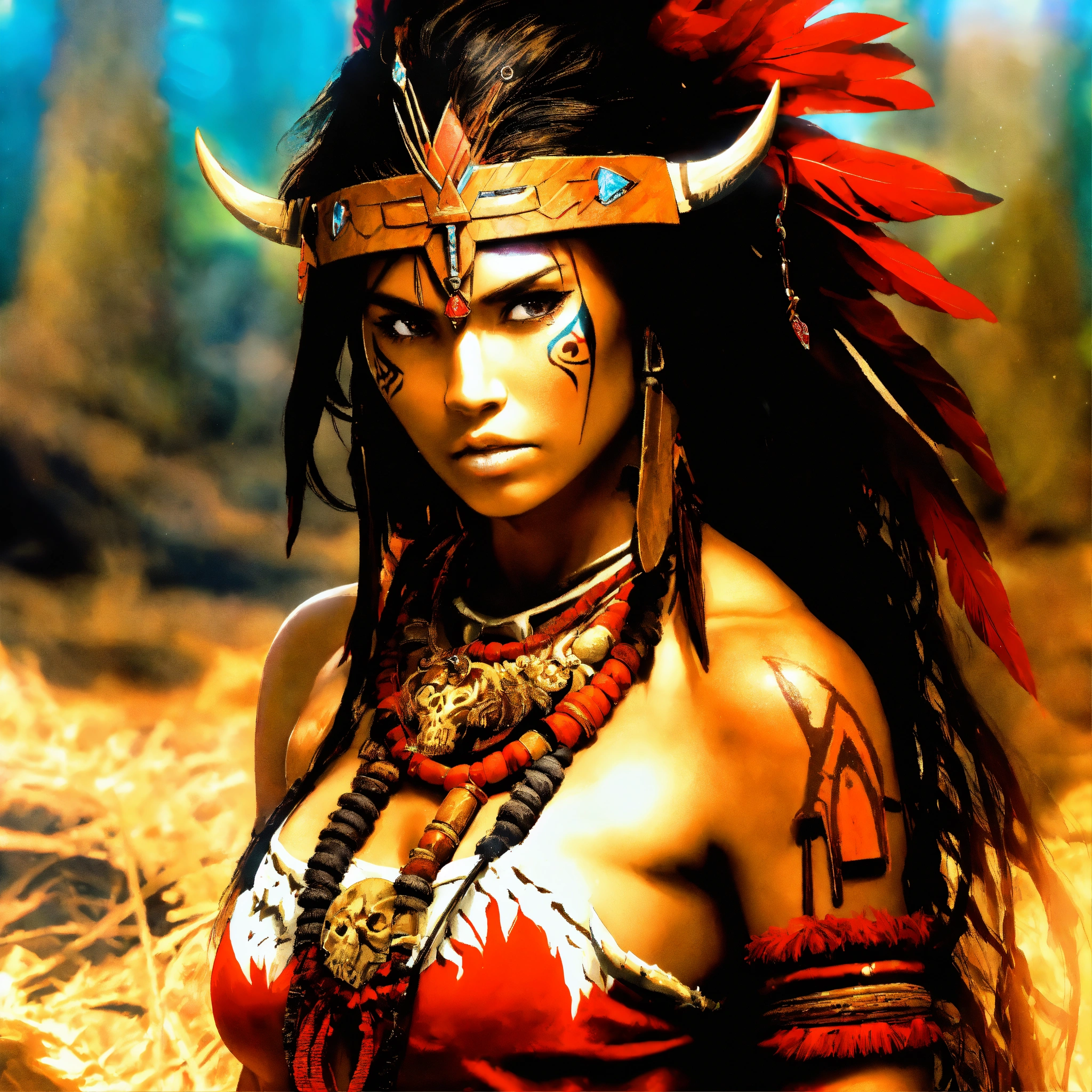 A fierce beautiful native american warrior in an enchanted forest. wild tribe girl, tanned, red and white marks and tattoo on face and body, primeval tribe female shaman, bone armor, skull mask, shaman necromancer female, manga, louis royo style, anime, cinematic, image creation lexica v3.0