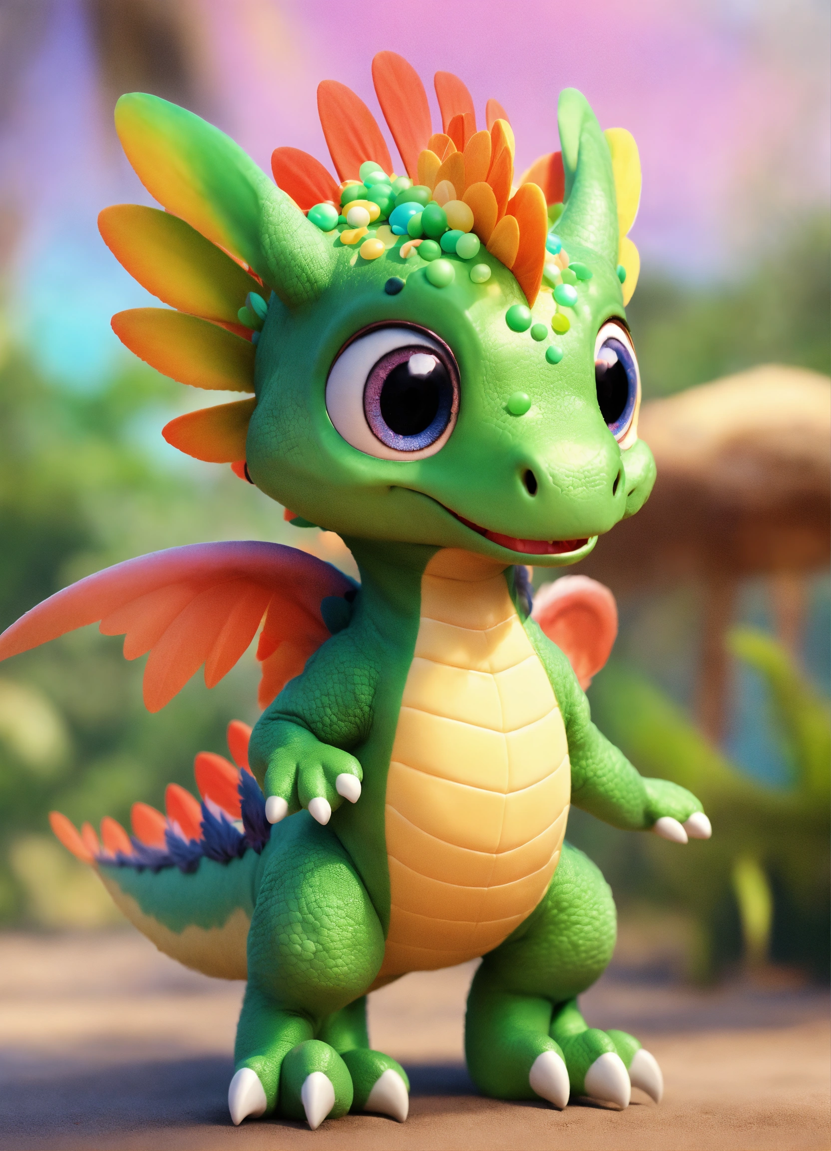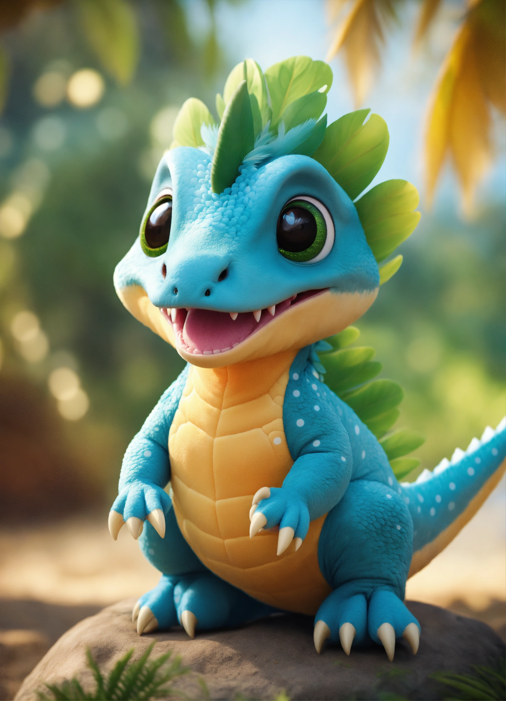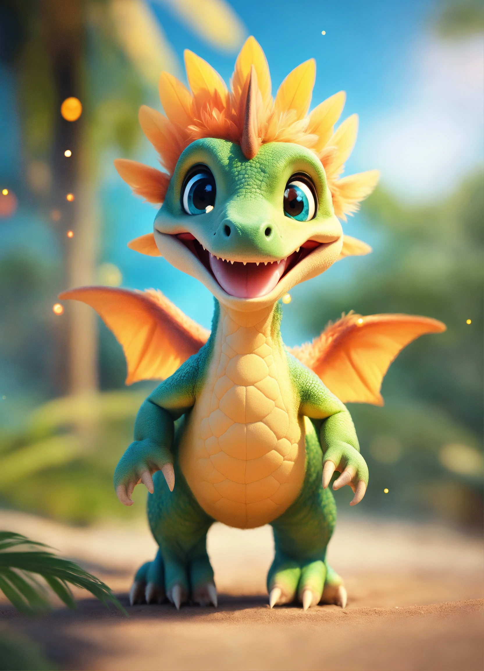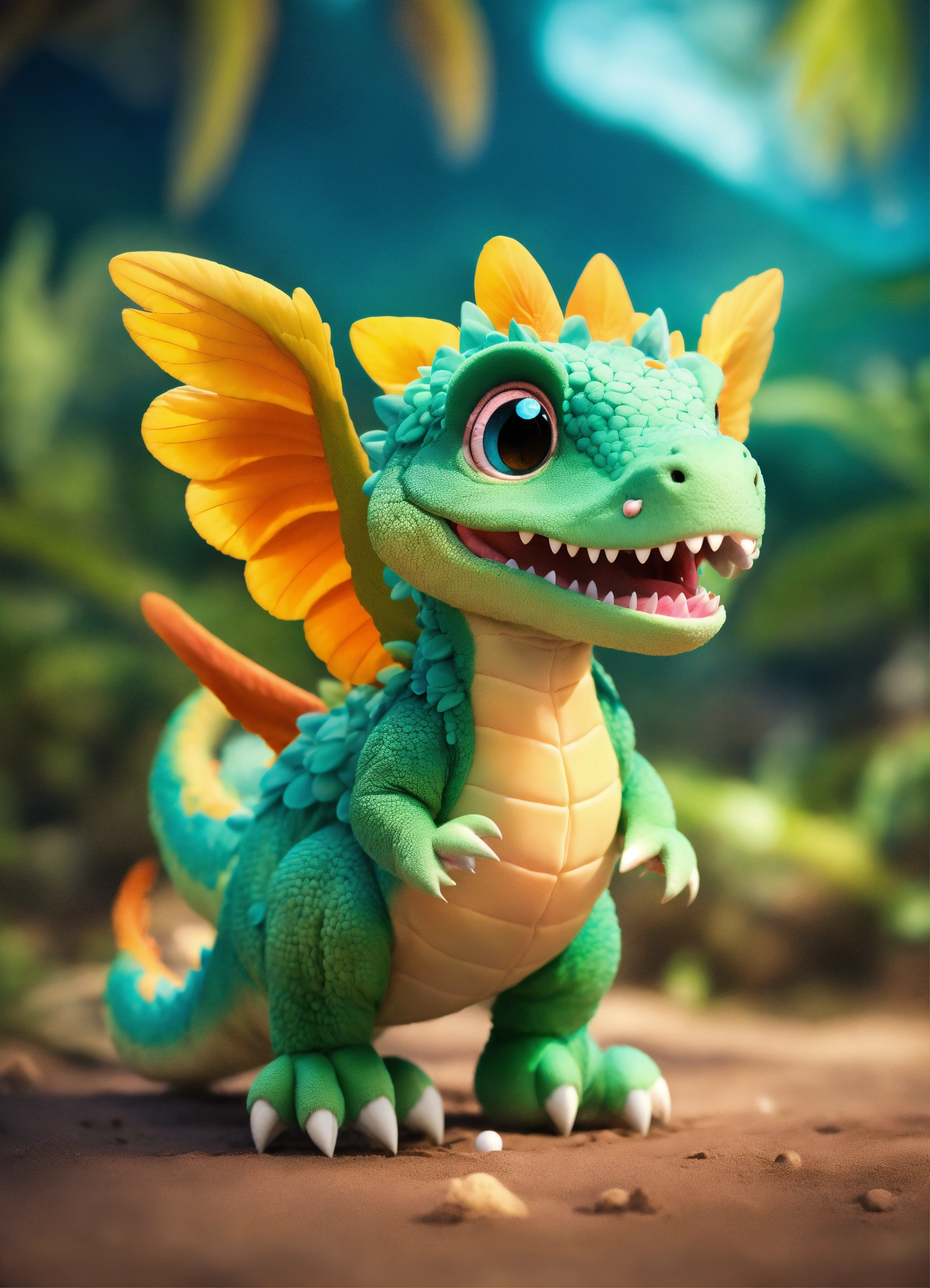 An adorable and fluffy baby fantasy dinosaur with big color eyes and big ears, with soft feathers and wings, dots on skin, tusks, smiling and happy, tropical island, with blur background, high quality, 8k