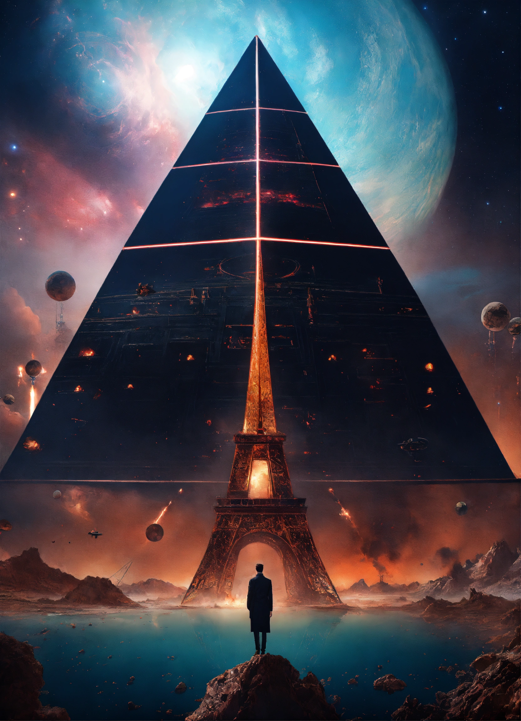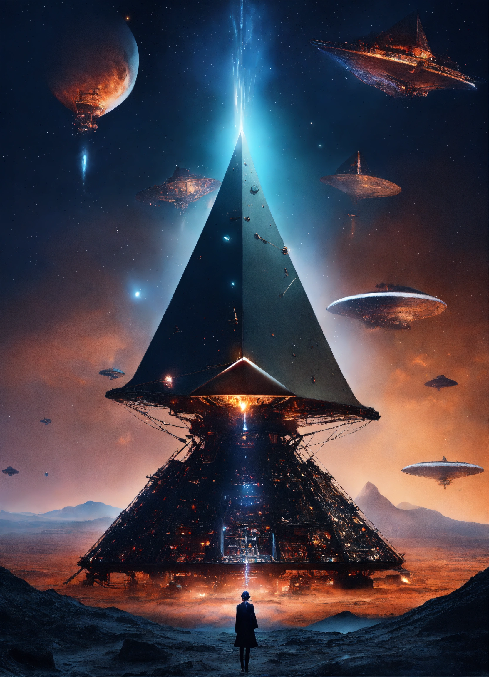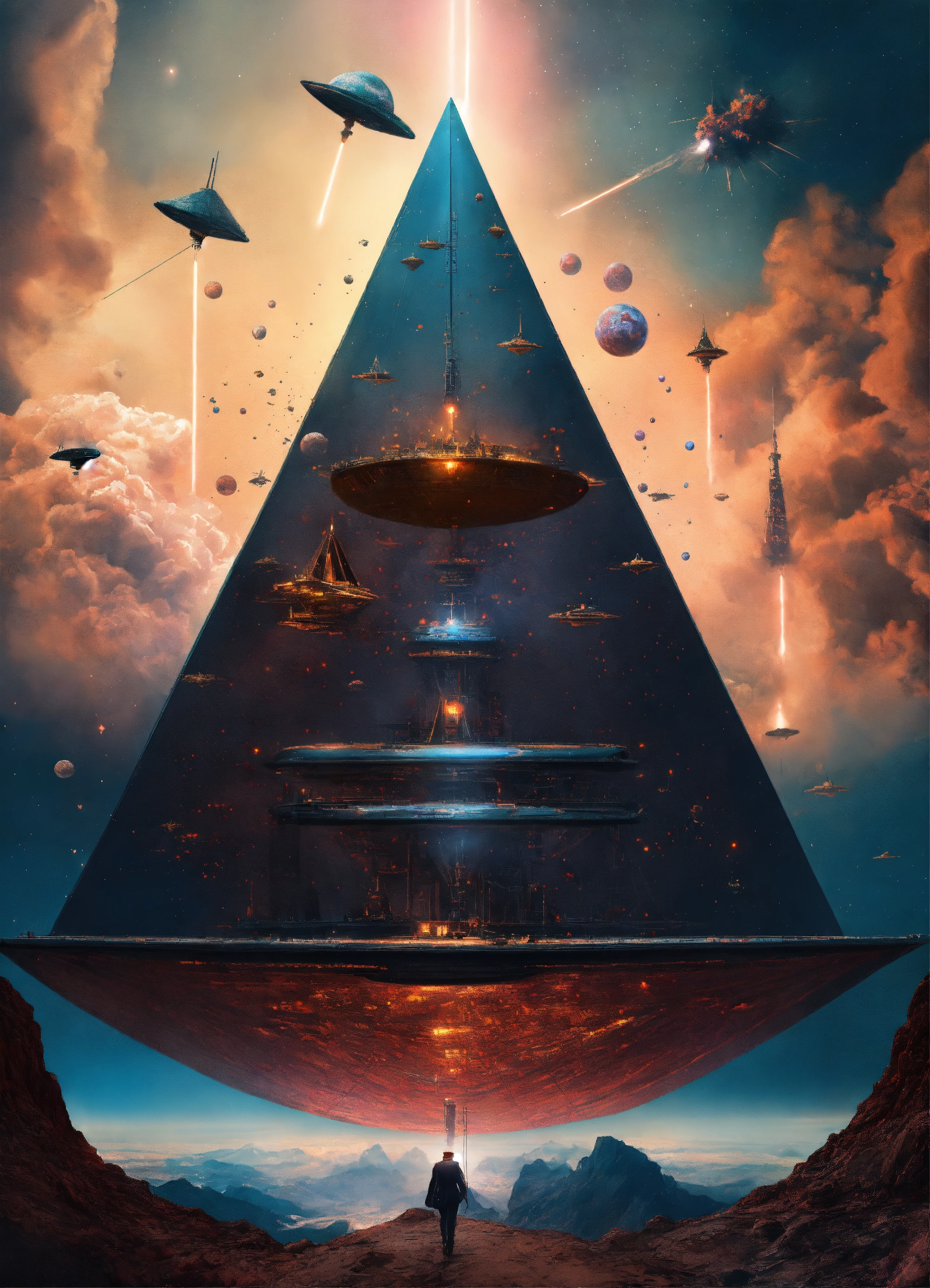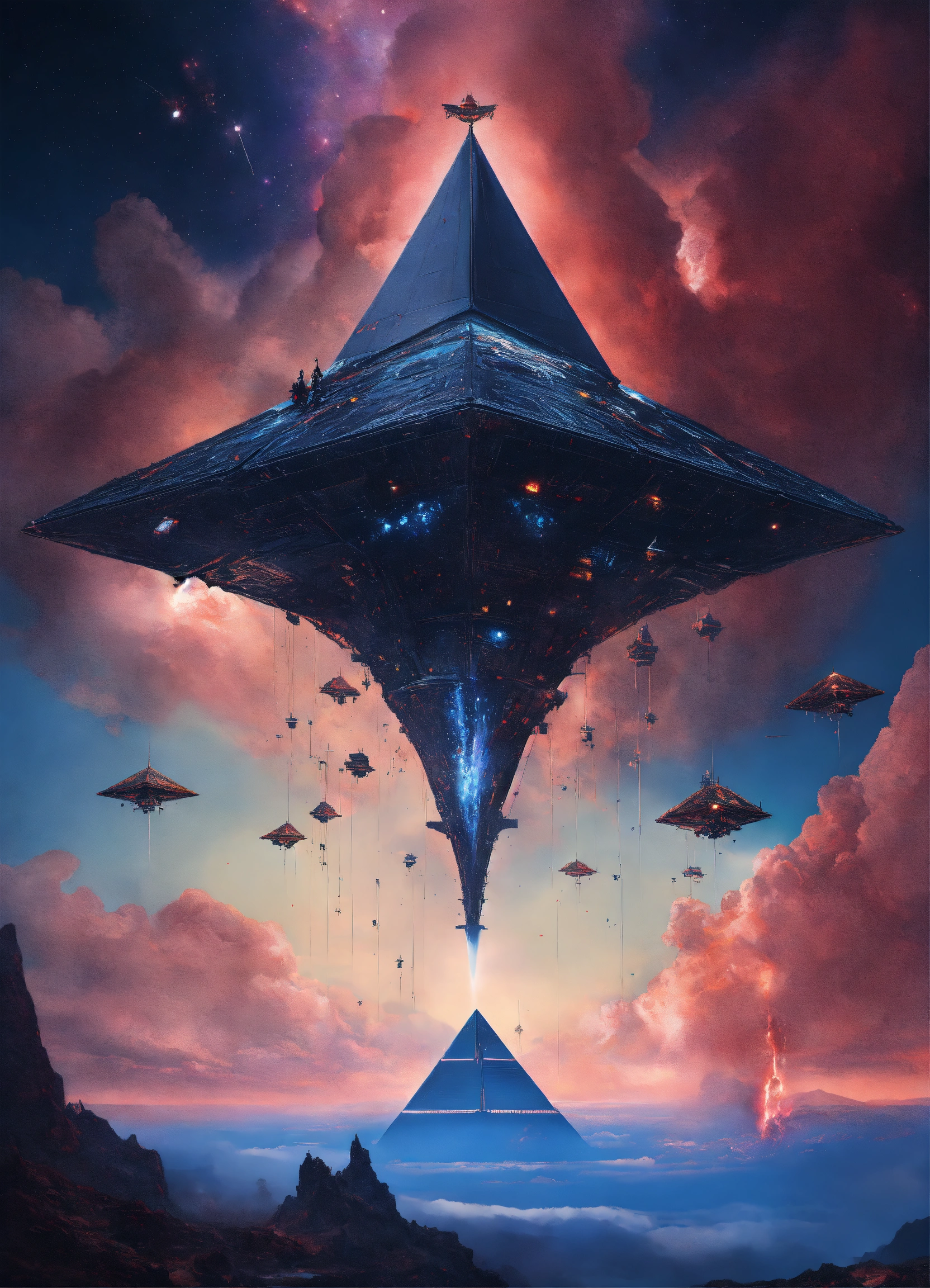 Large landscape photography, a large futuristic dark pyramidal spaceship sailing in deep space is attacked by enemy rockets, 80 degree view, art by sergio lopez, natalie shau, james jean and salvador dali