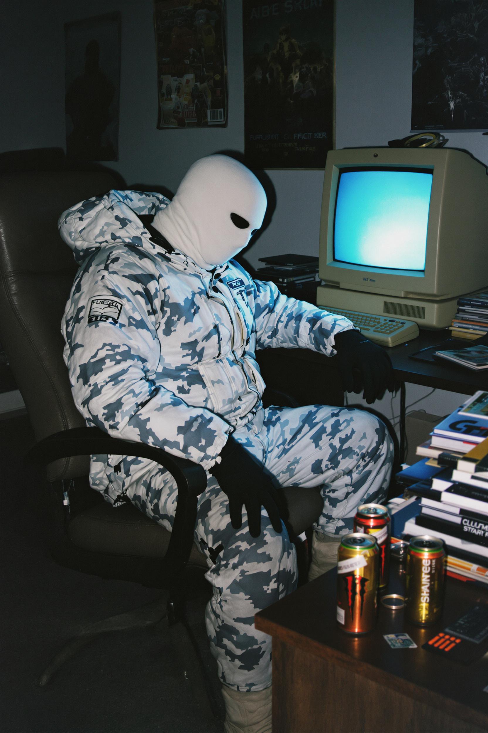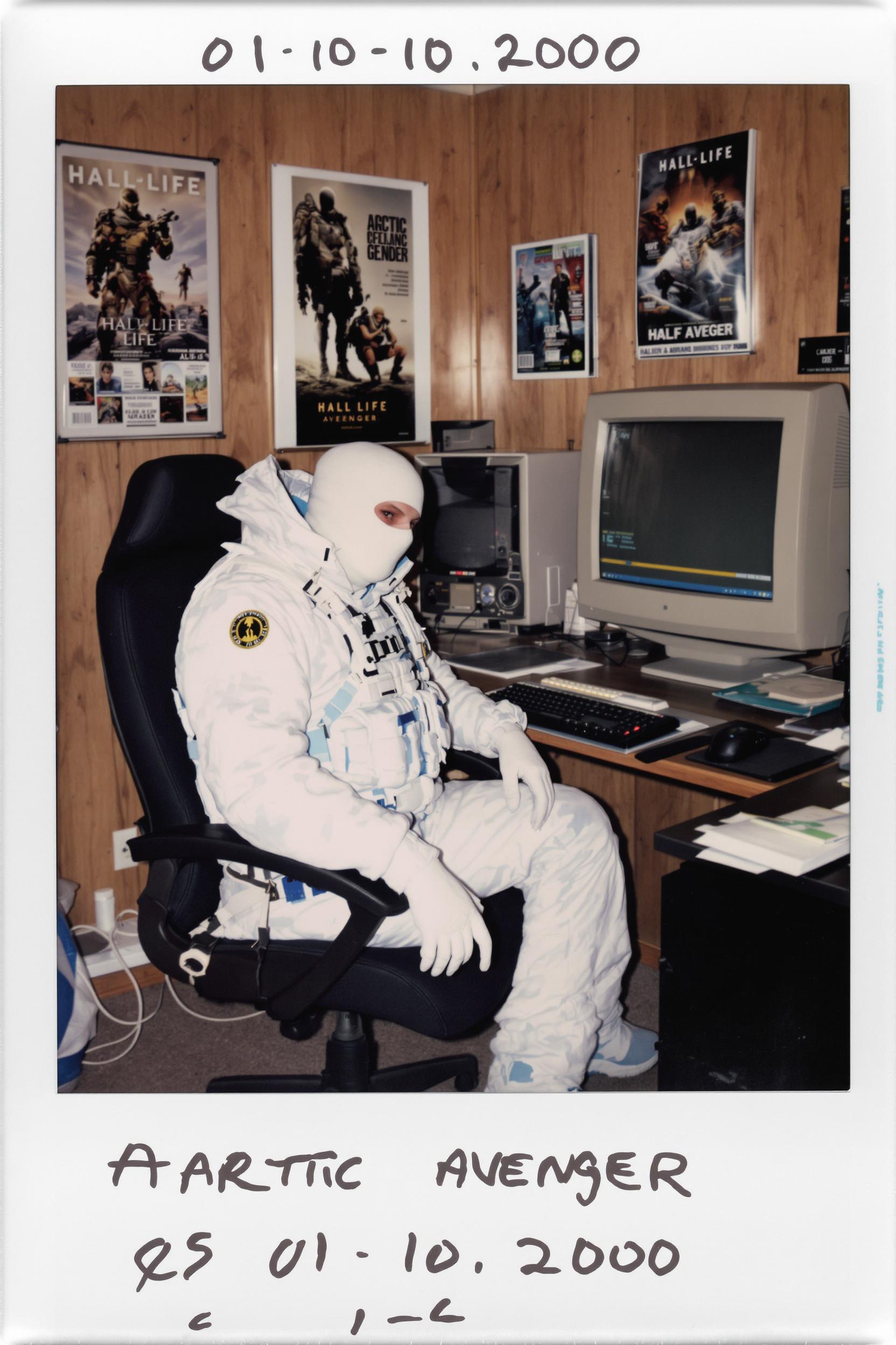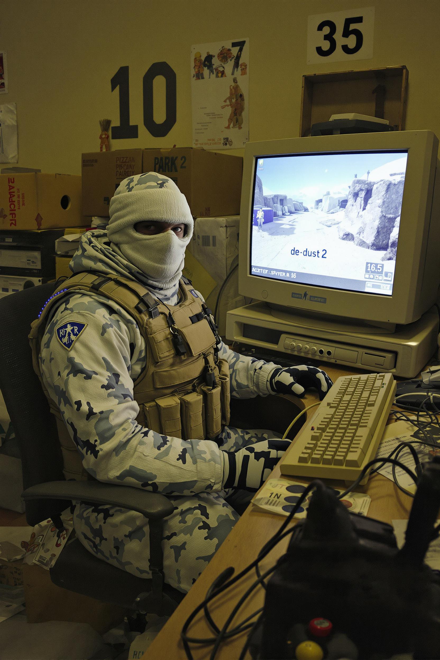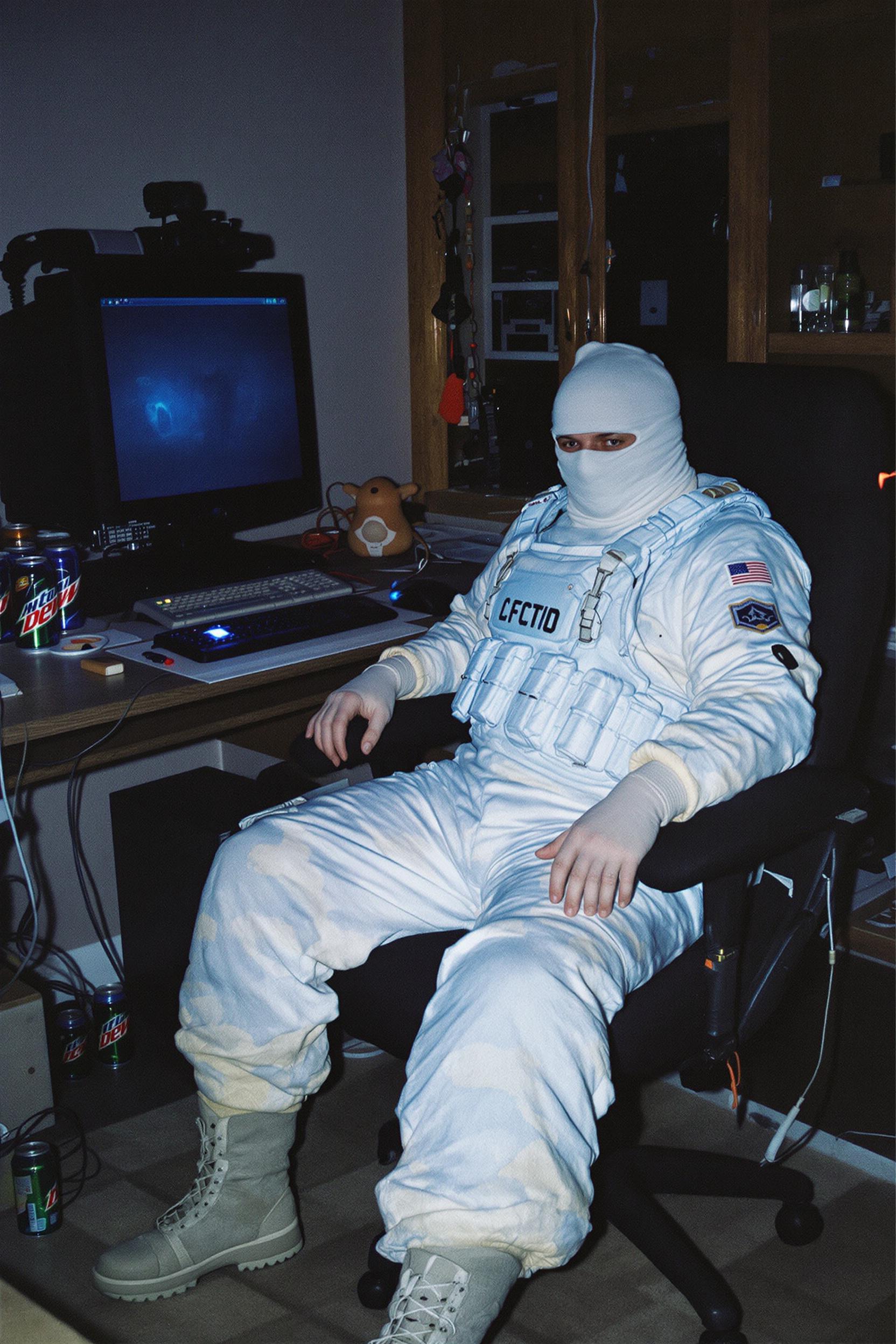 Grungy analog photo, late 90s/early 2000s style, of the 'arctic avenger' terrorist character model from counter-strike 1.6. he's sitting hunched in an old office chair behind a cluttered desk dominated by a bulky, glowing crt monitor in a dimly lit, messy room. crucially, he is wearing his exact, distinct in-game clothing and gear