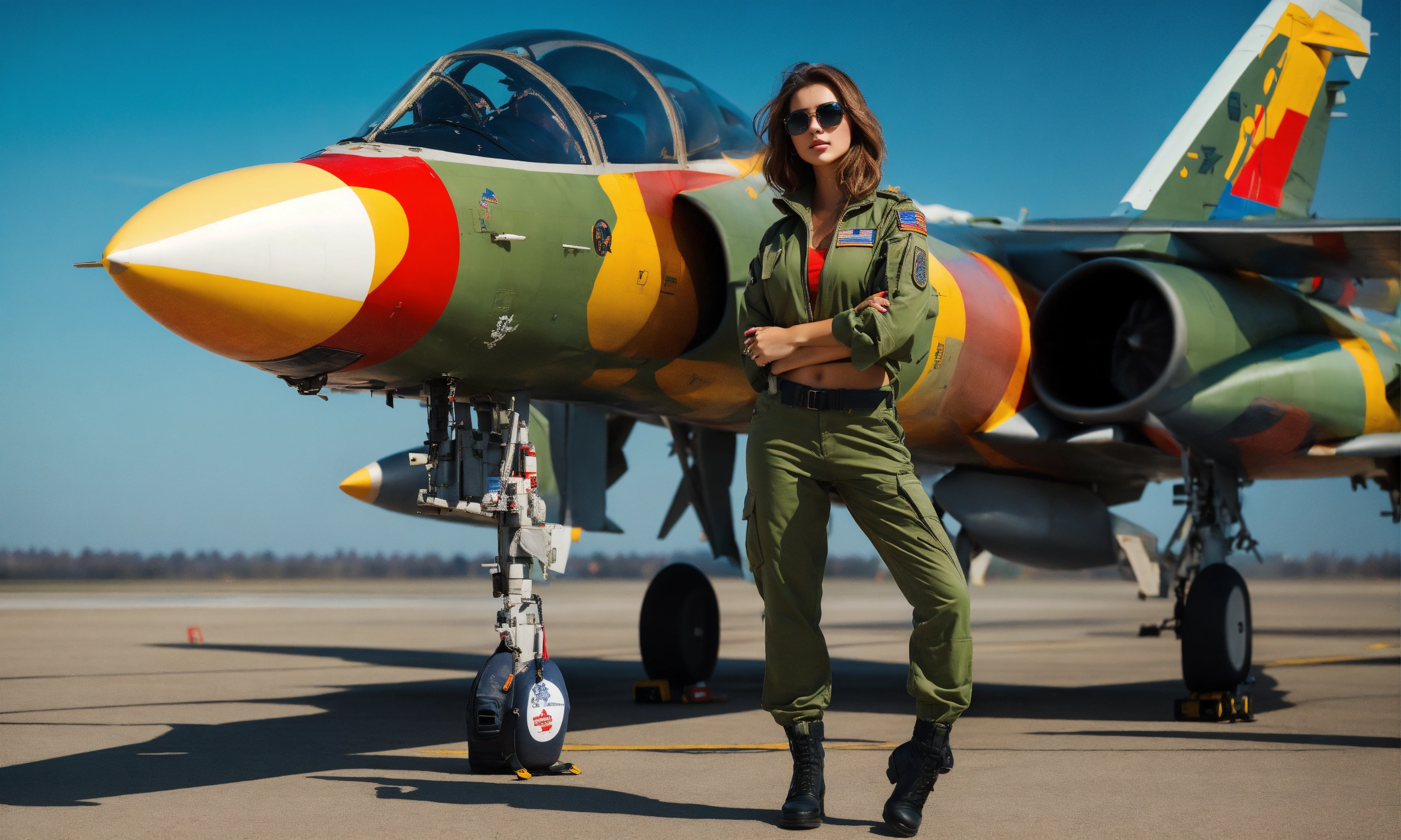 Cool models girl standing a little be on the side of a military jet, hands in the pants, colorful image, 8k, high quality, perfect view