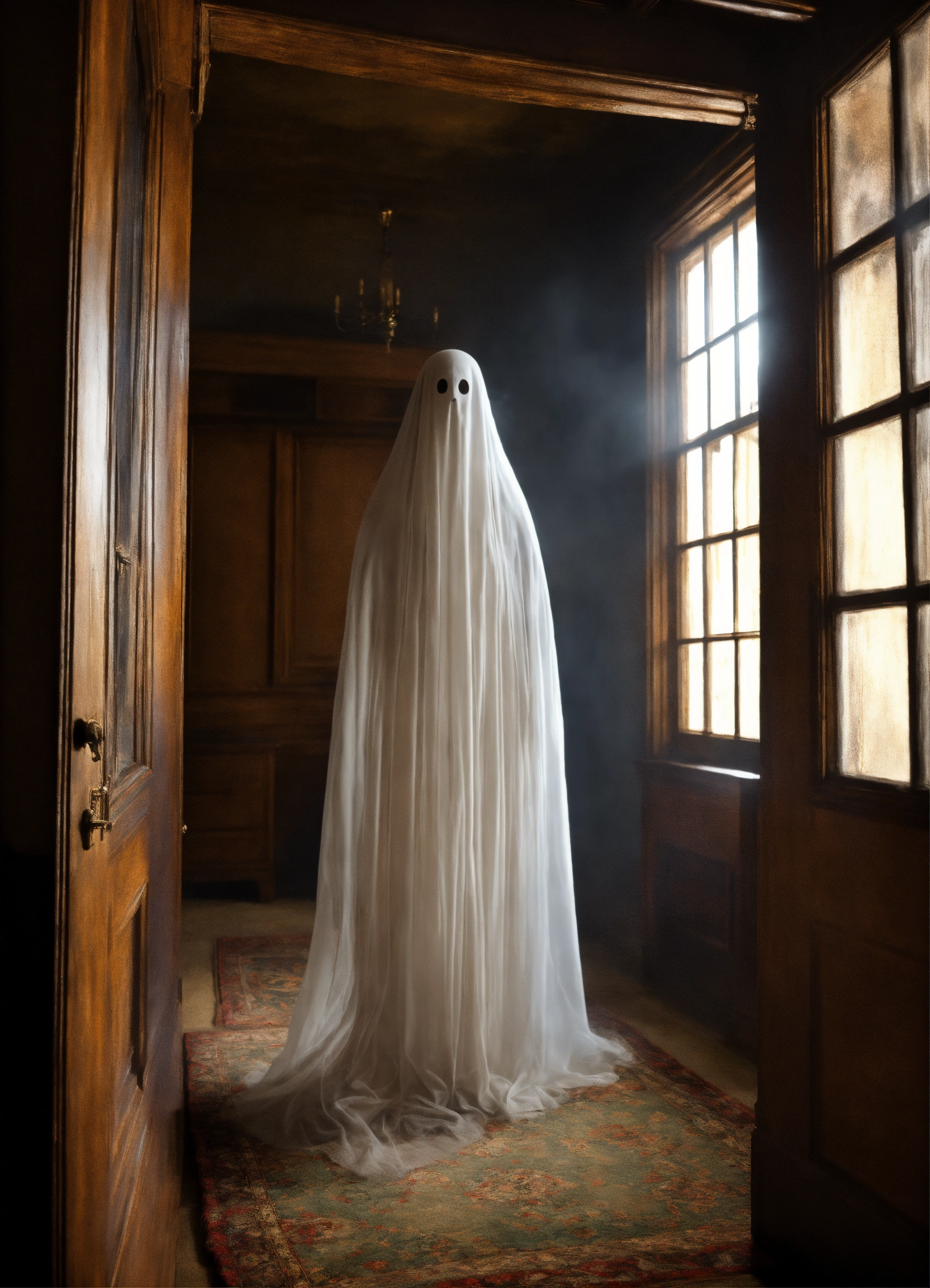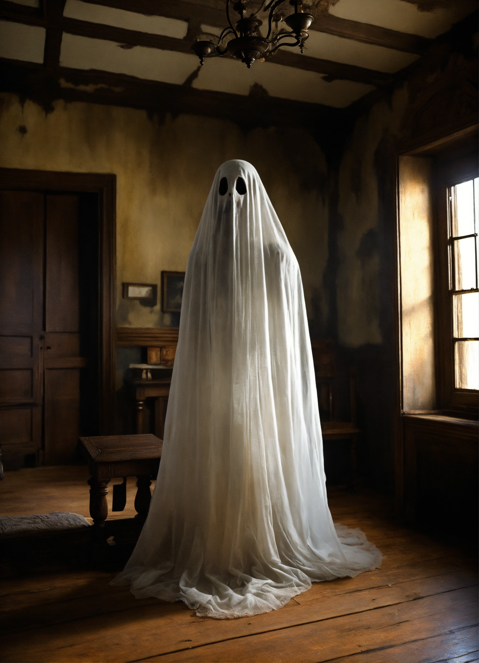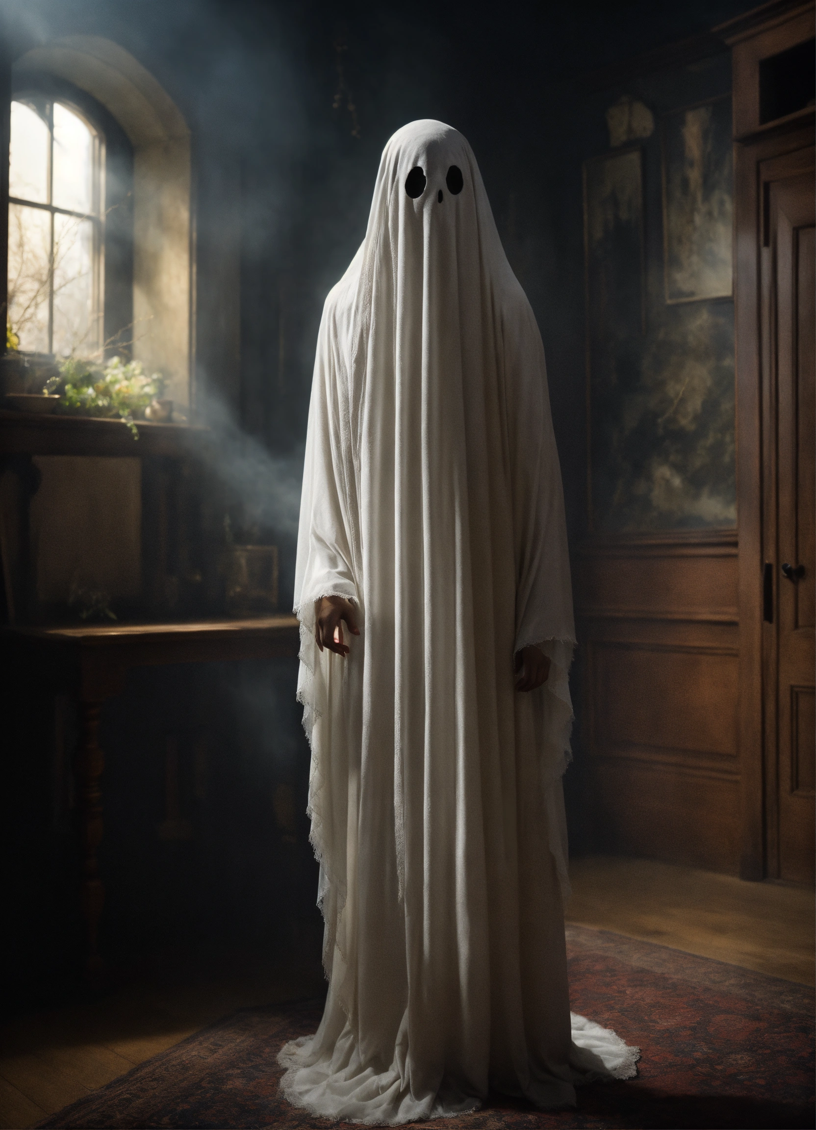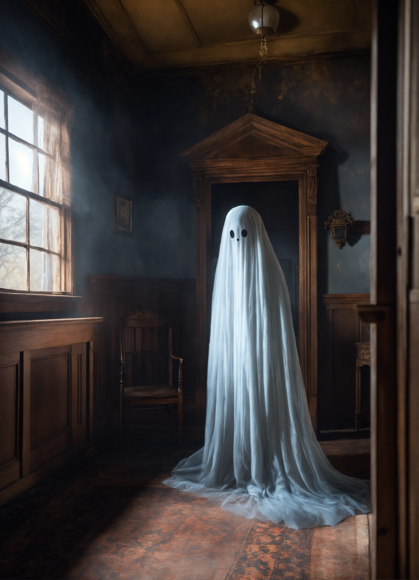 A realistic wispy ghost in a haunted house perfect clarity photorealistic high definition