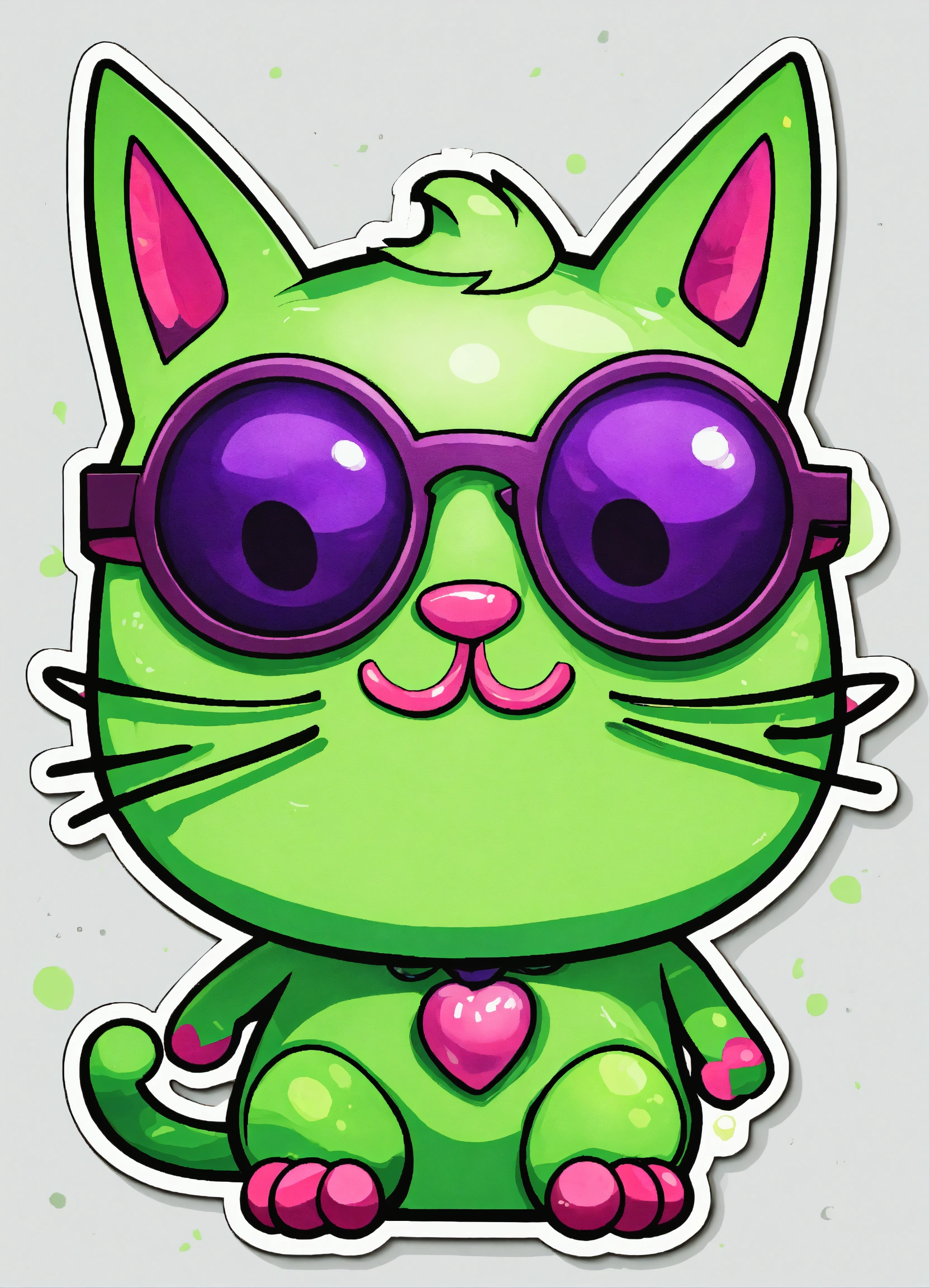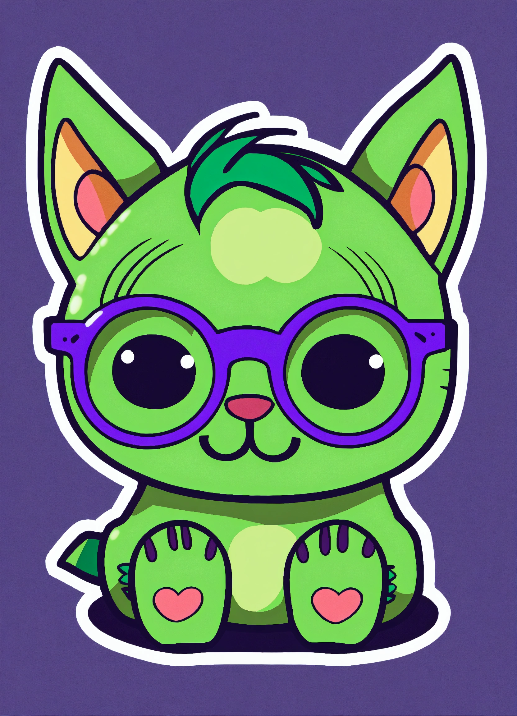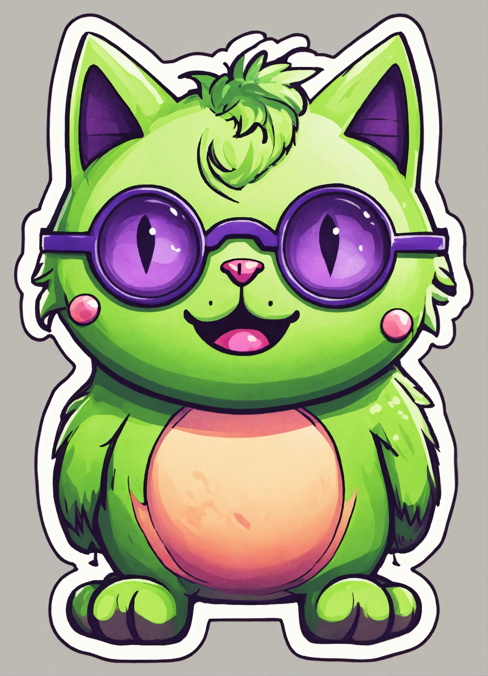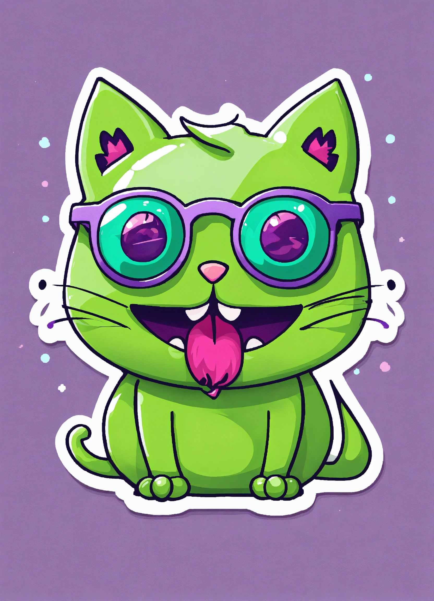 A cute green happy childish one-eyed monster with glasses and two purple cat ears in sticker style icon