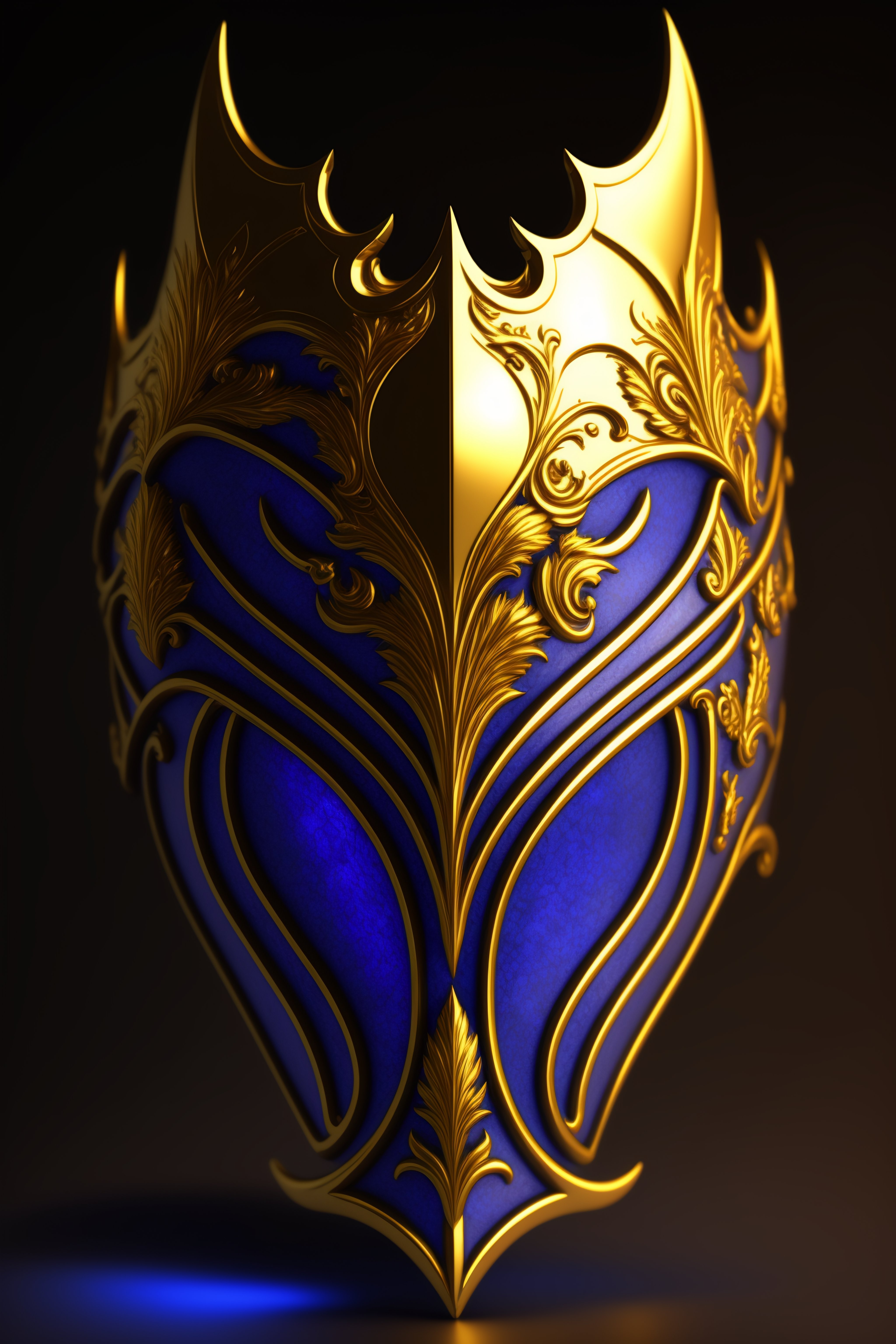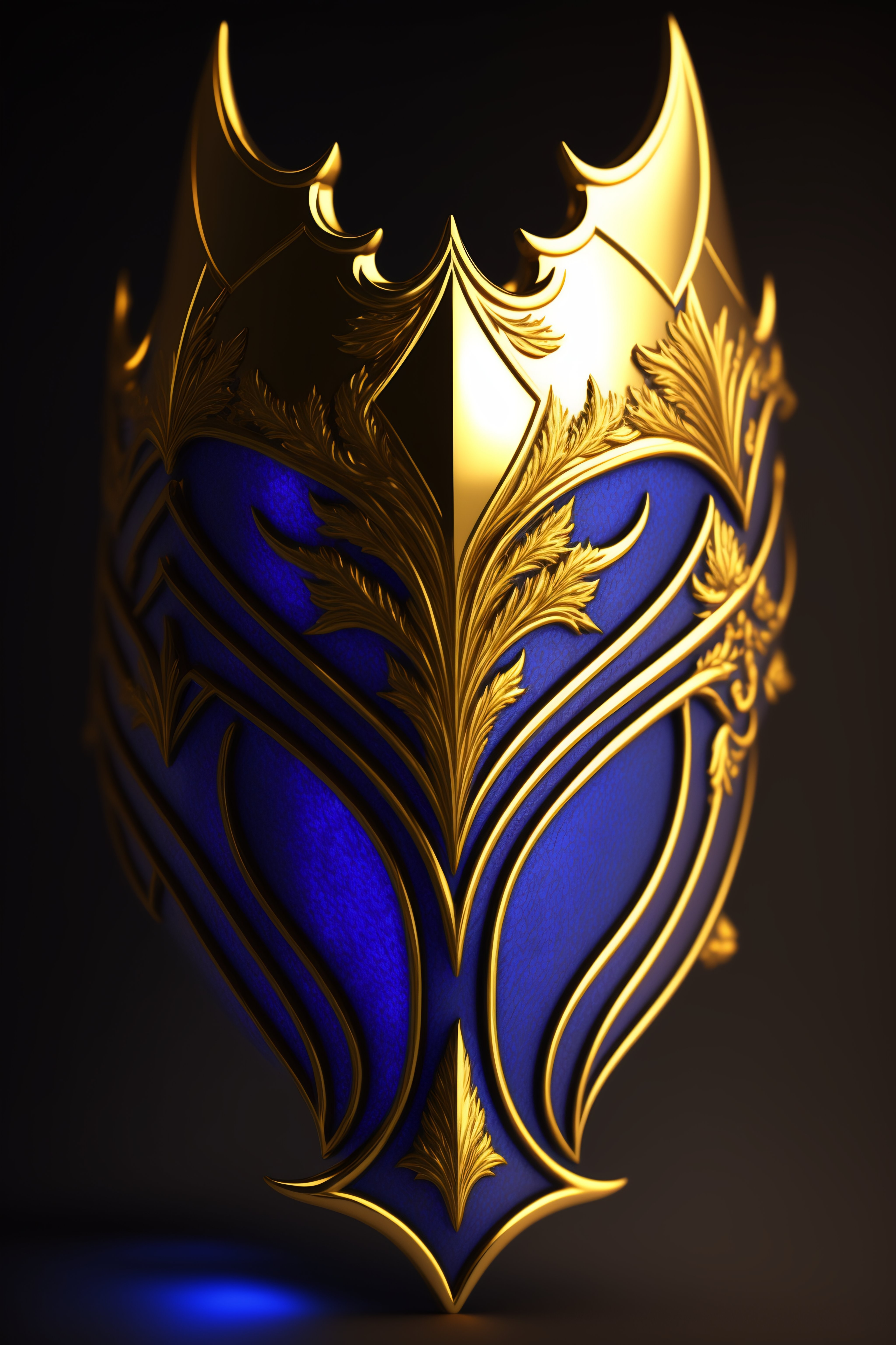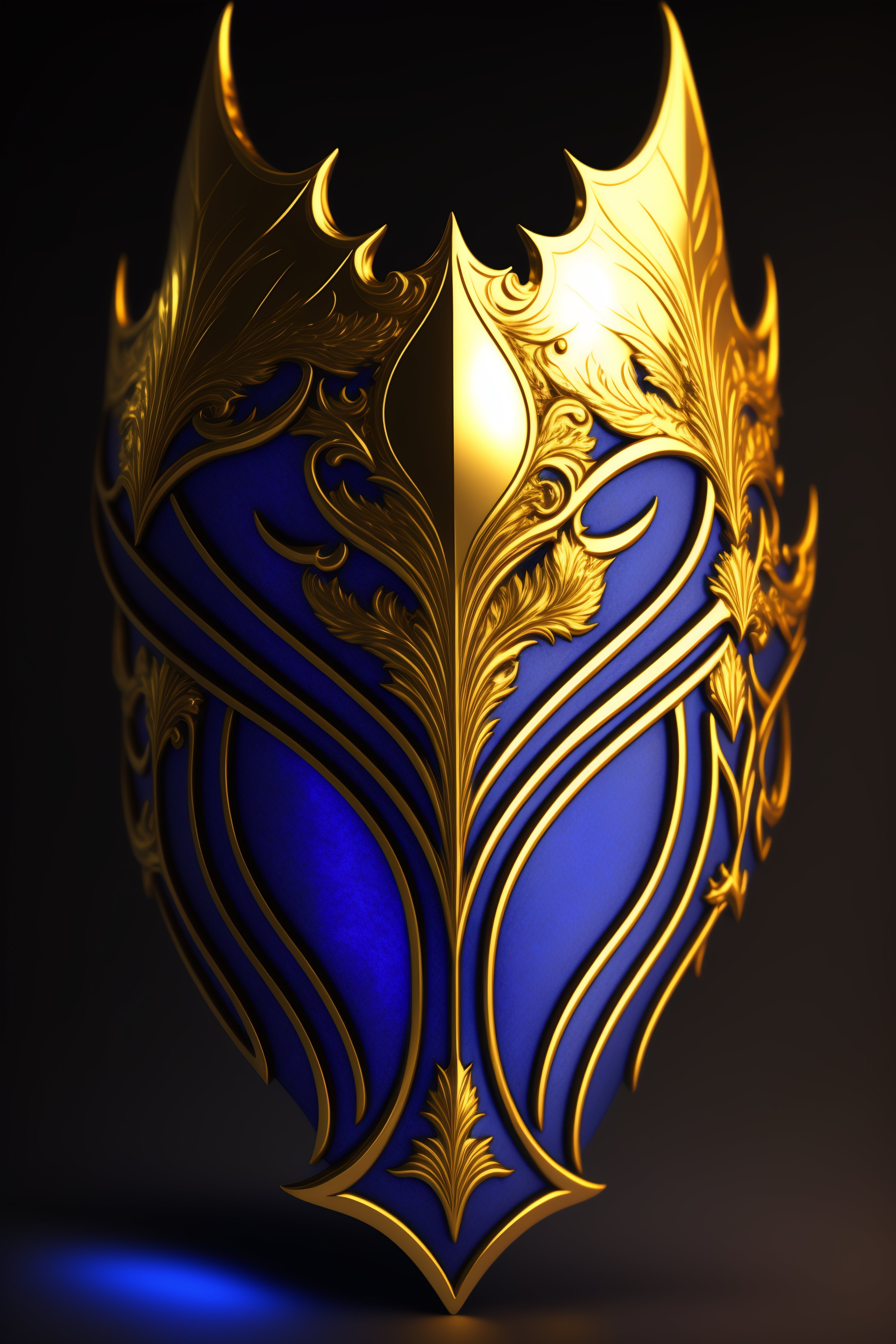 A gothic golden shield logo high fantasy in gold and blue, highly detailed, front view, transparent background