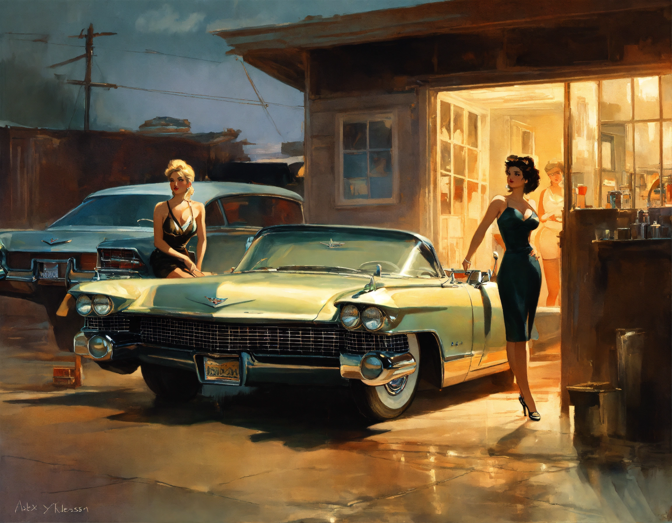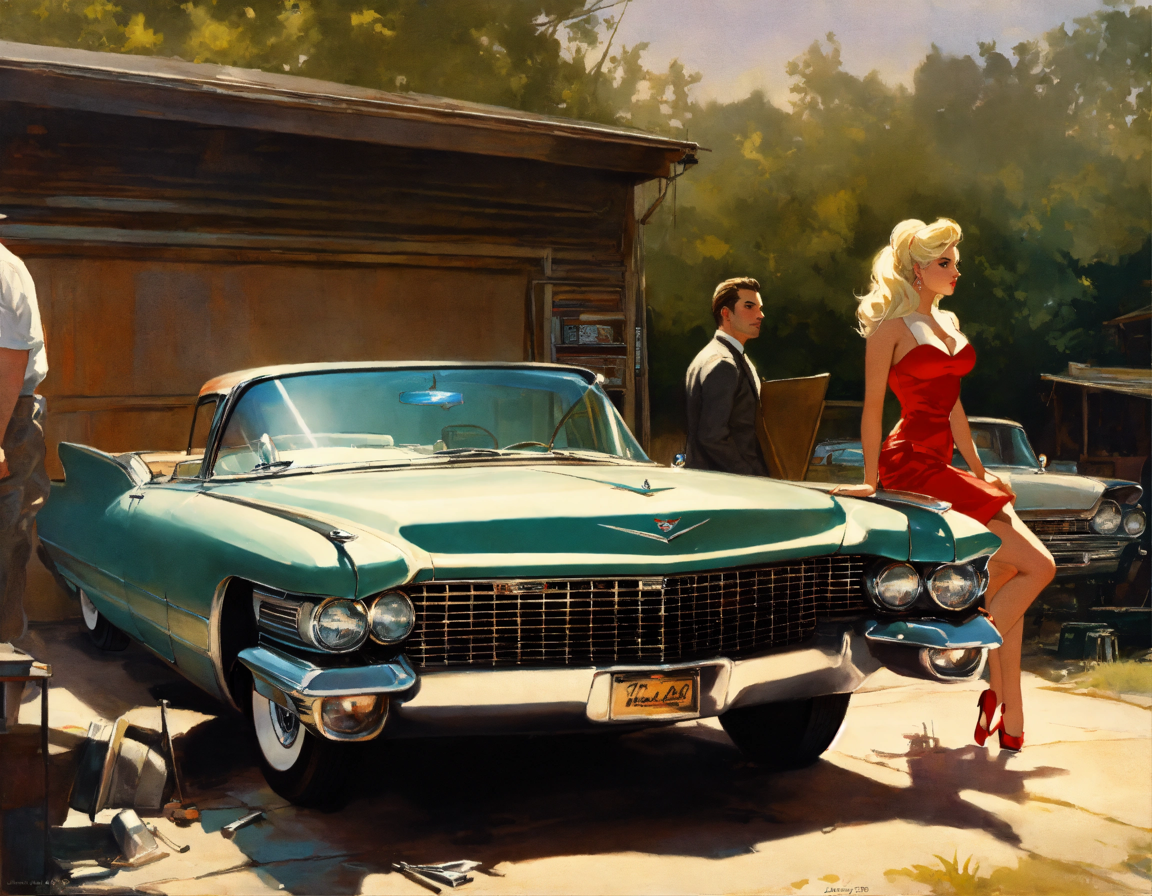 Shed scene, vintage atmosphere, with a cadillac eldorado 1959, mechanic, and pinup, art by, alex ross, jeremy mann, yossi kolter