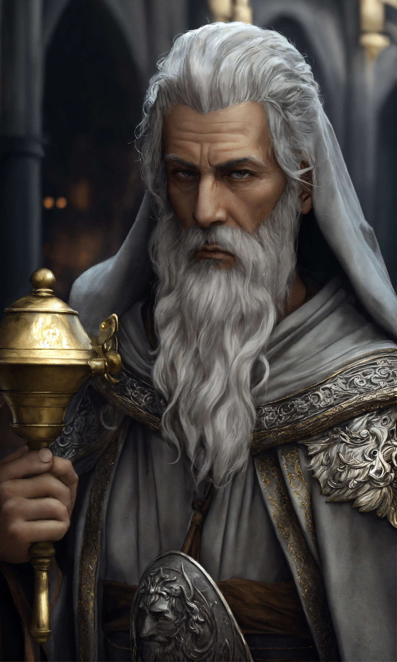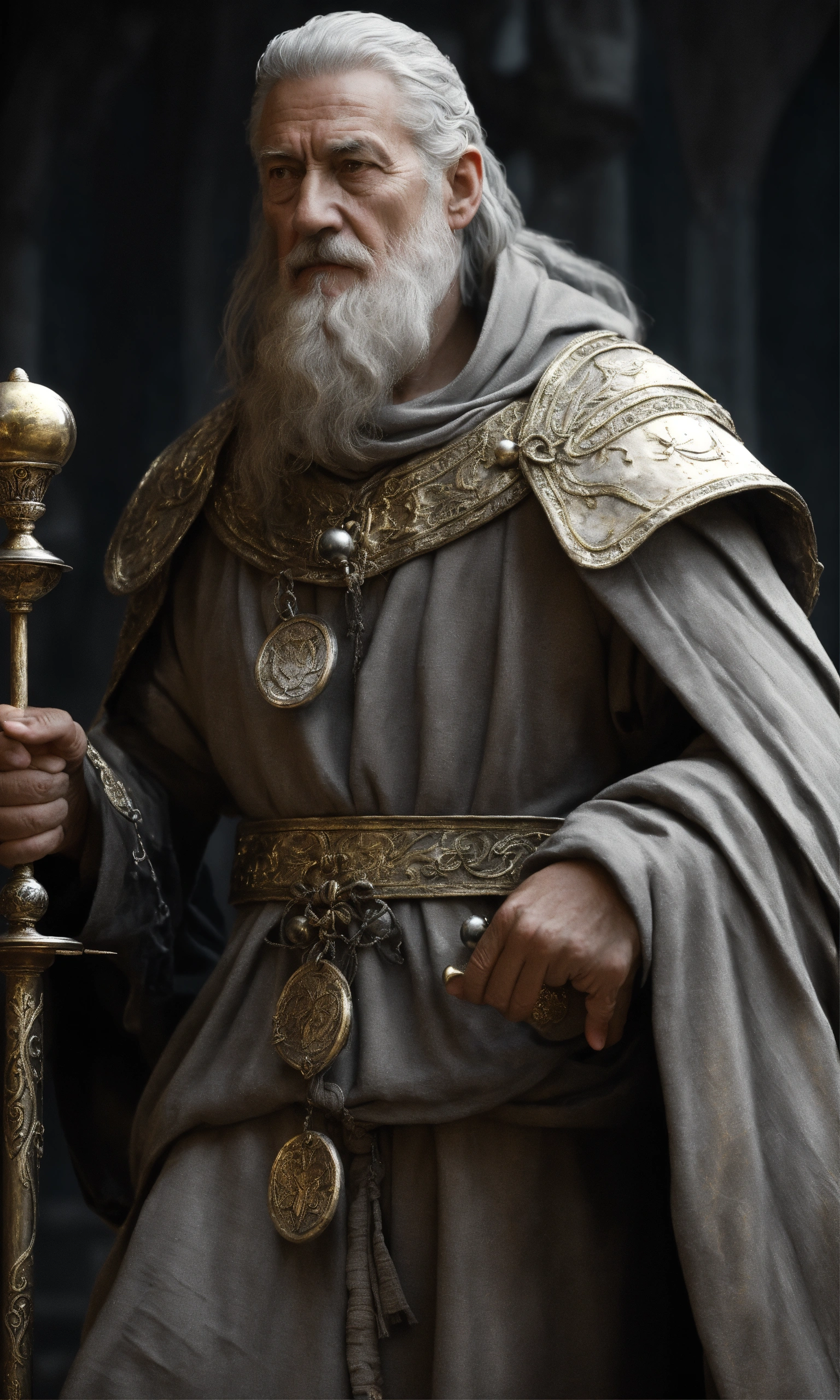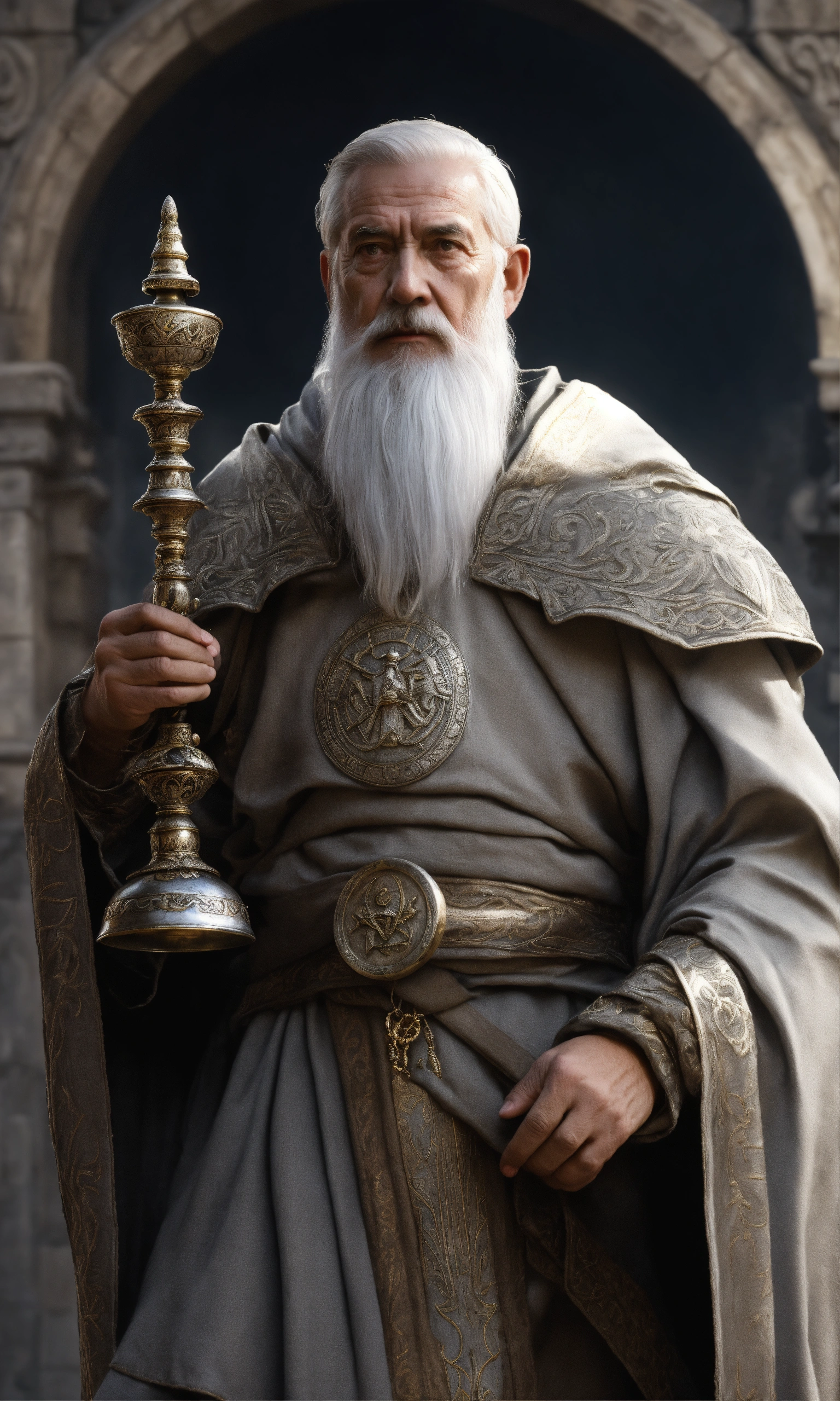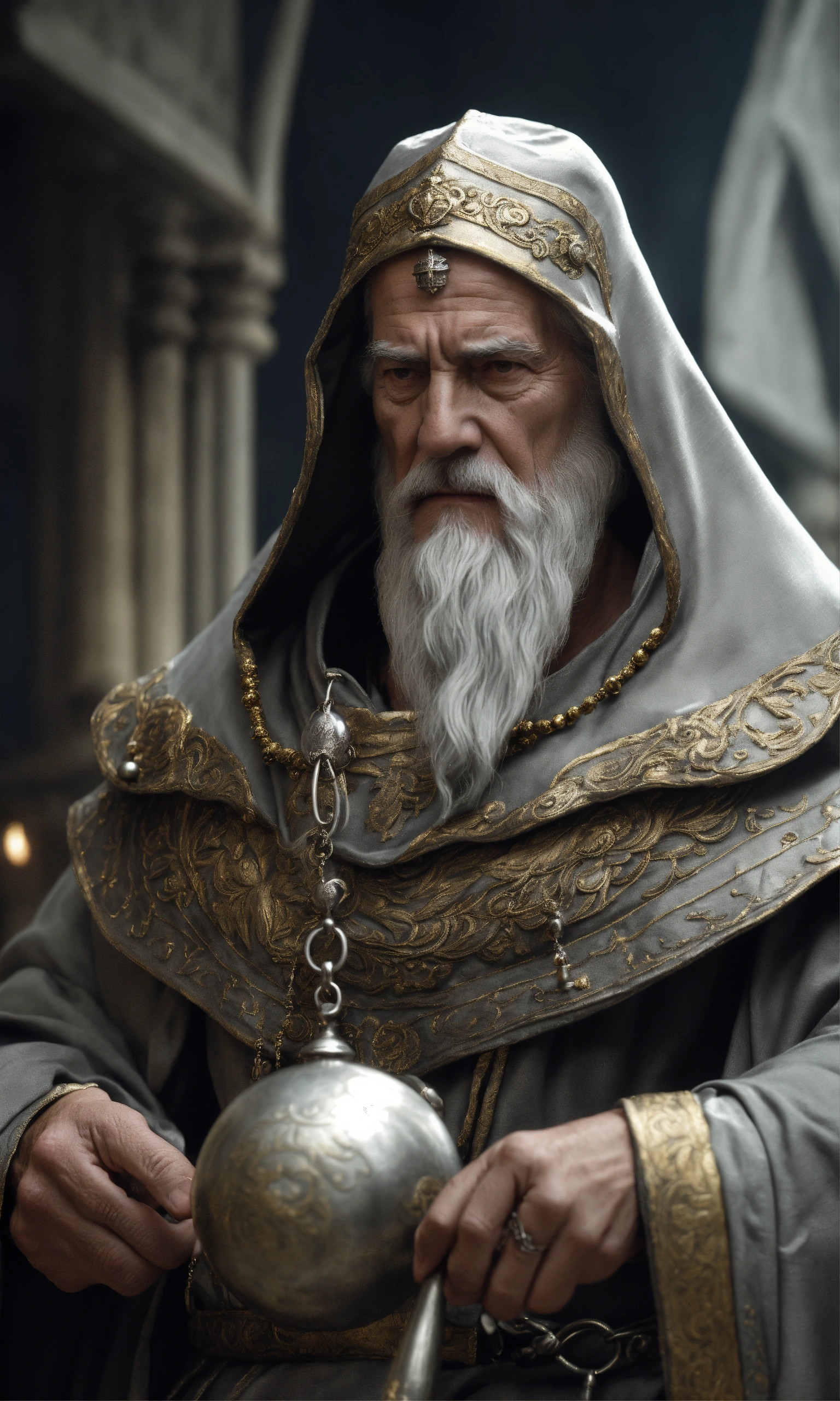 Tacitus, god of silence ashen silver is his colour. he is an old scholar in medieval monk's robes. his skin and hair are ashen grey in colour. he carries a silver bell and is telling people to be quiet with a finger in front of his mouth. dour, arrogant, condescending. 4k ultrarealistic. fantasy.