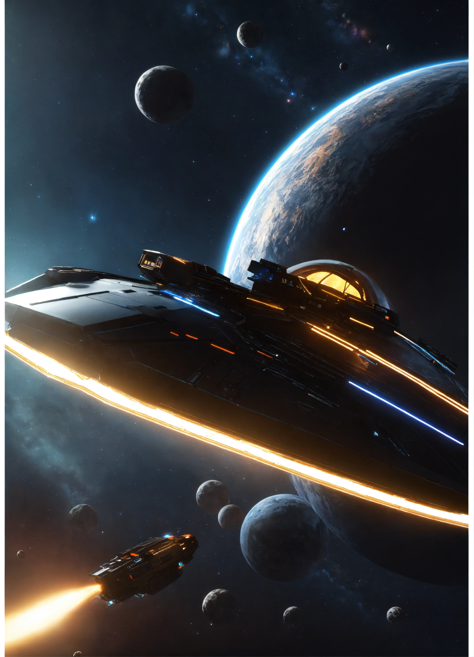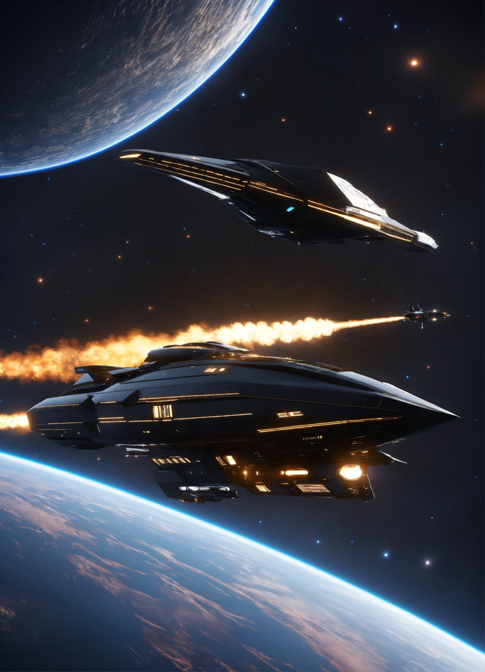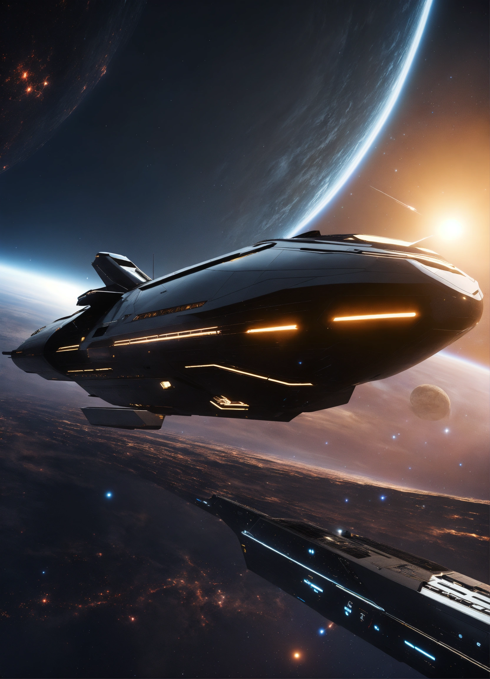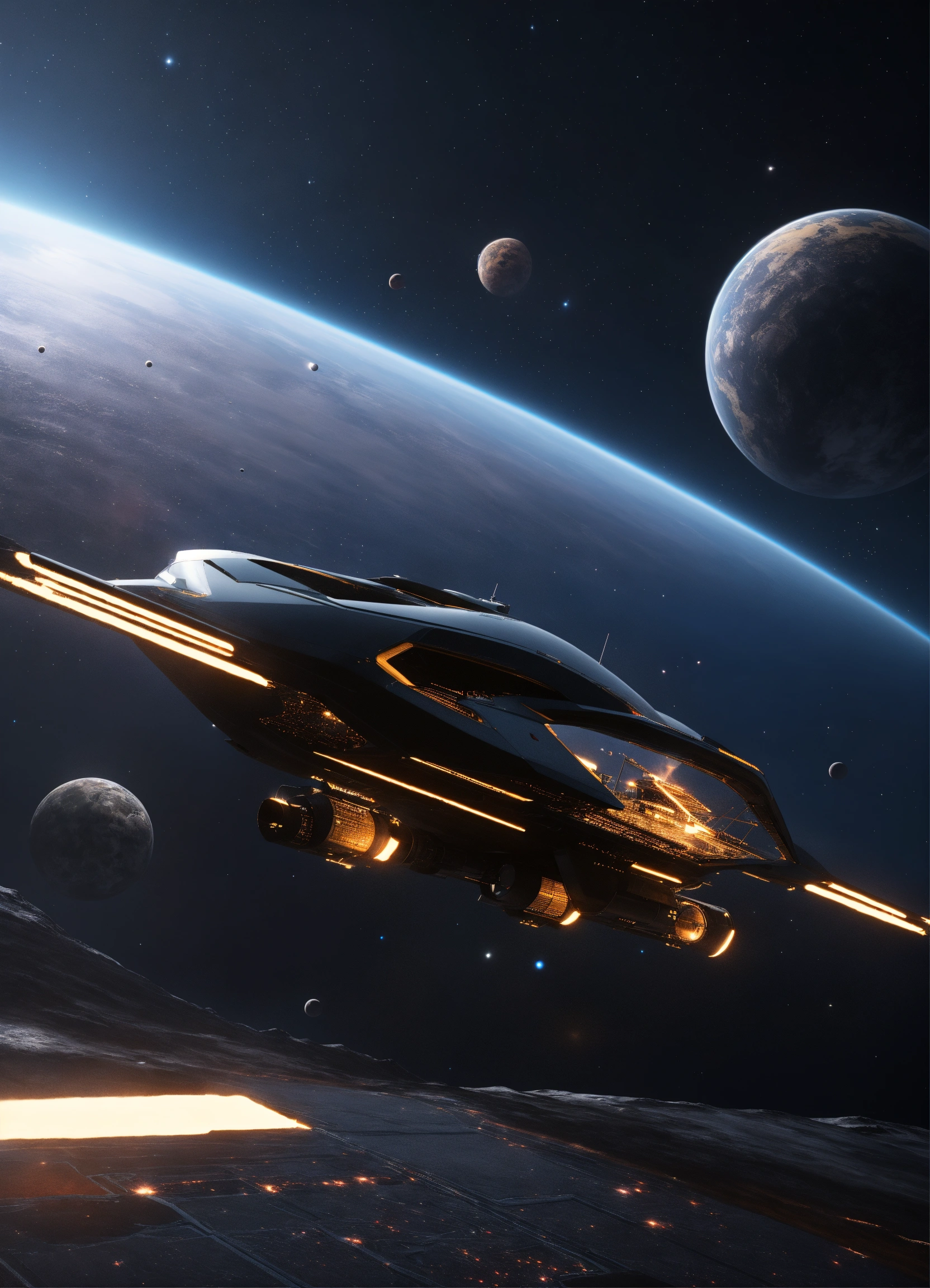Luxurious sleek black space yacht shooting out in deep space, future hi tech exterior, sci fi, unreal engine, realistic.
