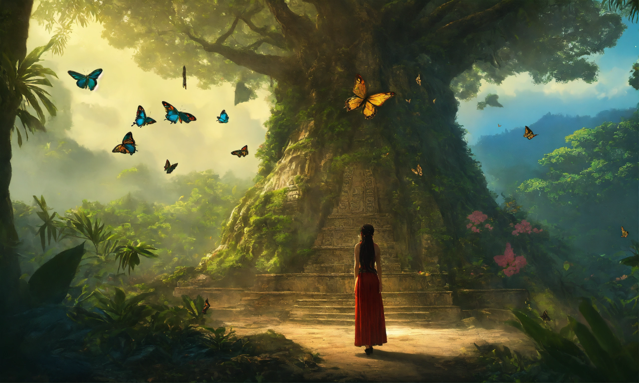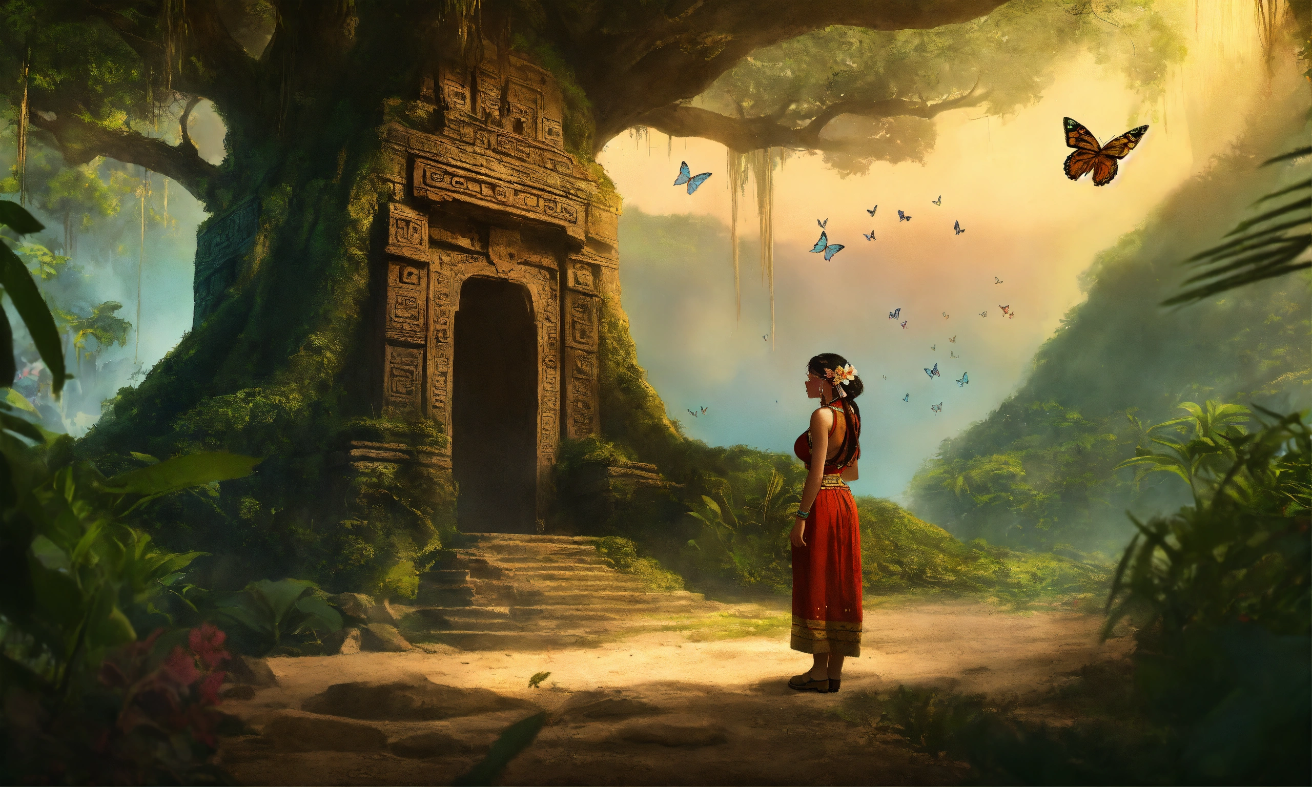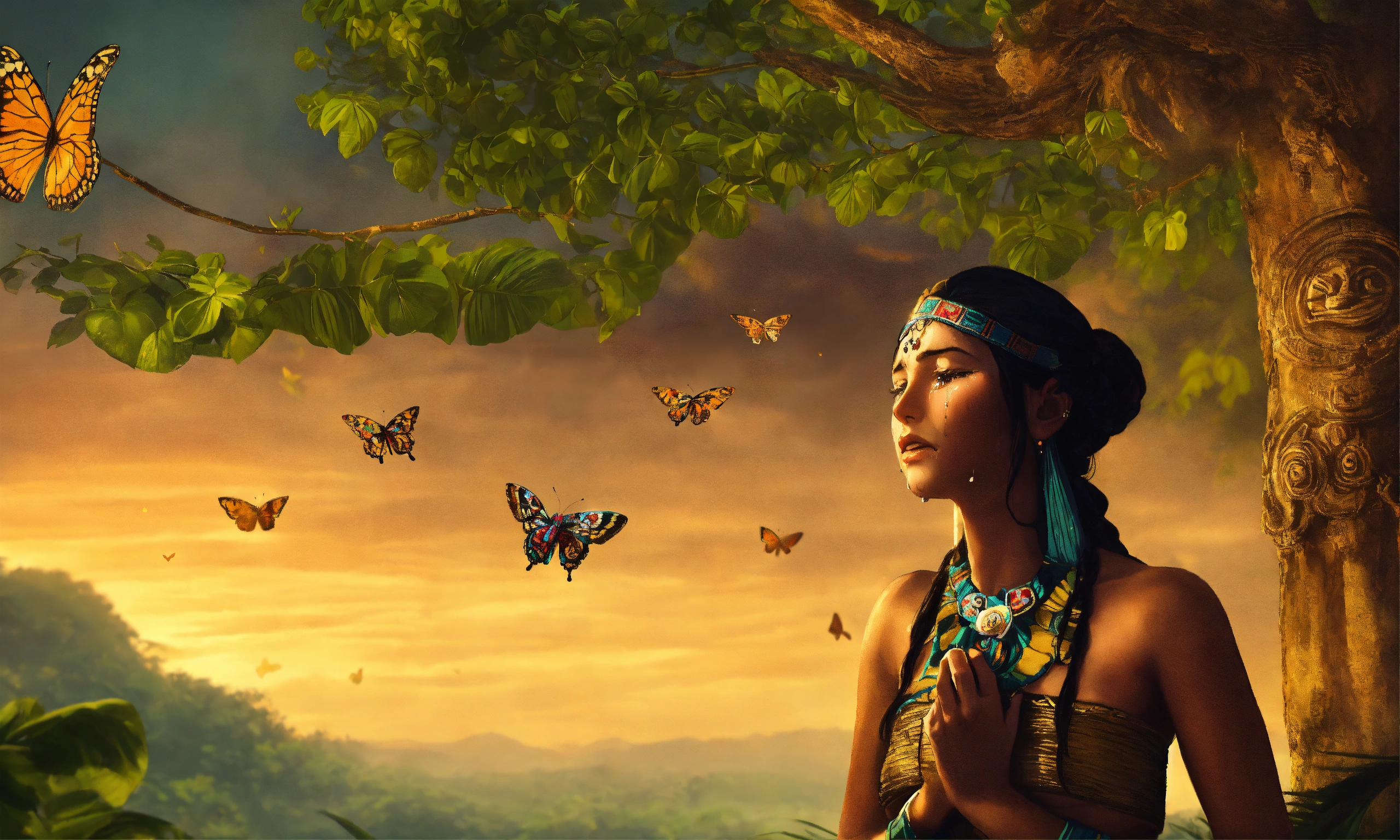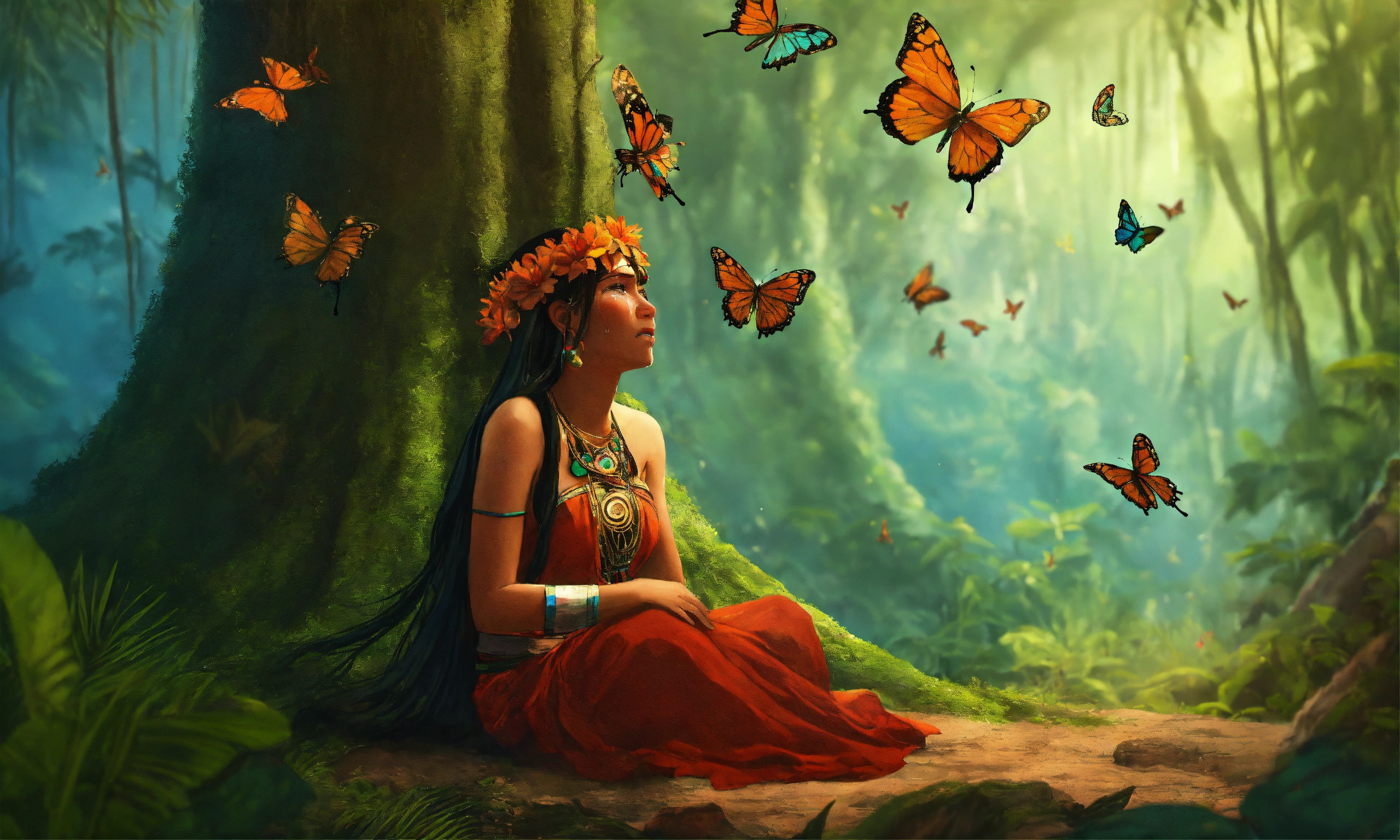 A mayan maiden is crying uncontrollably because she lost her love, under a giant tree in the mayan jungle, with butterflies flying around, she is alone and there is no one else.