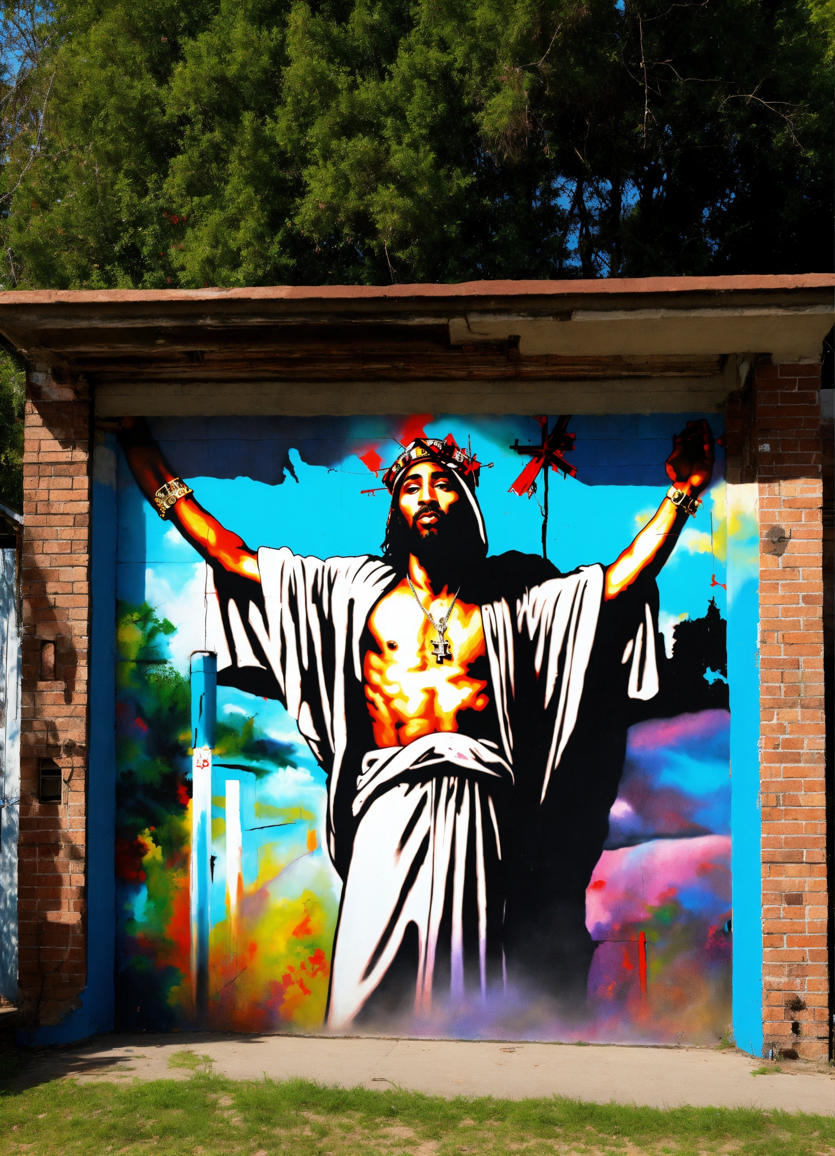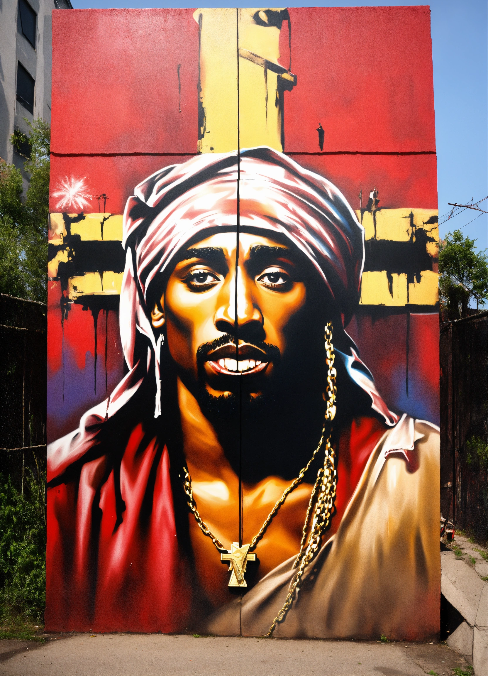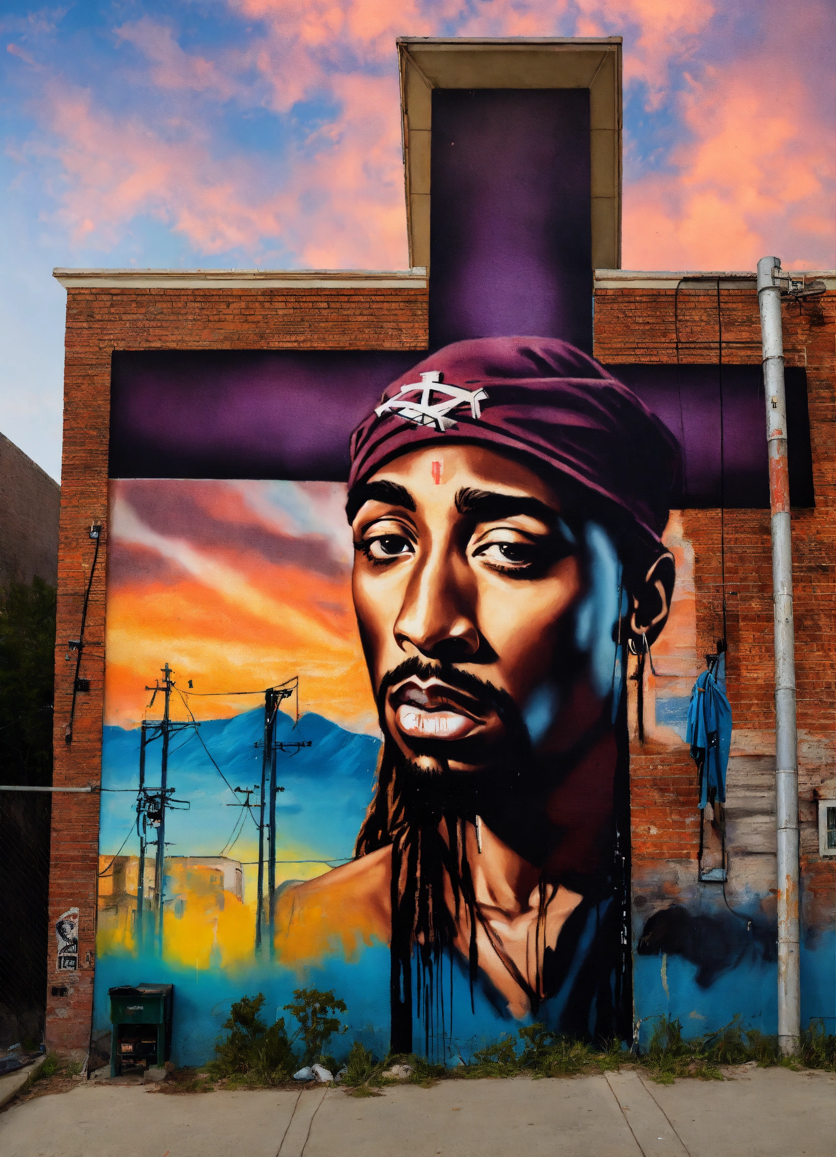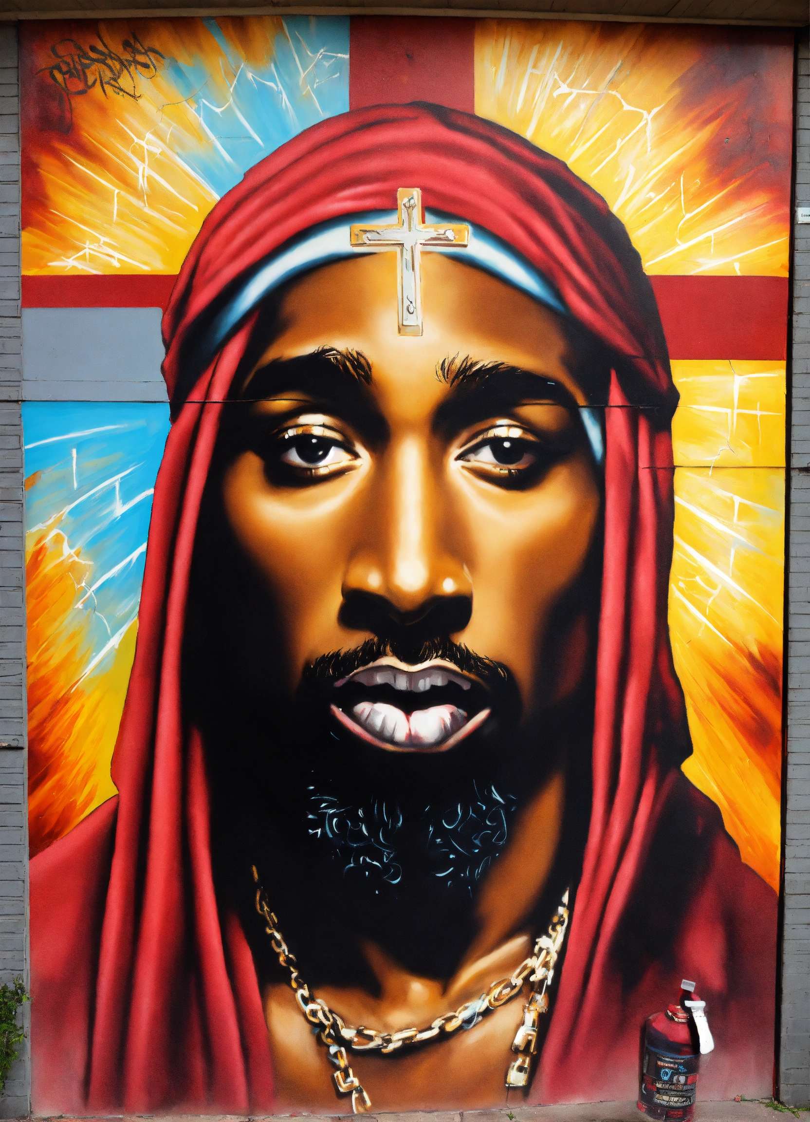 Tupac as jesus on the cross aerosol mural by griffin one