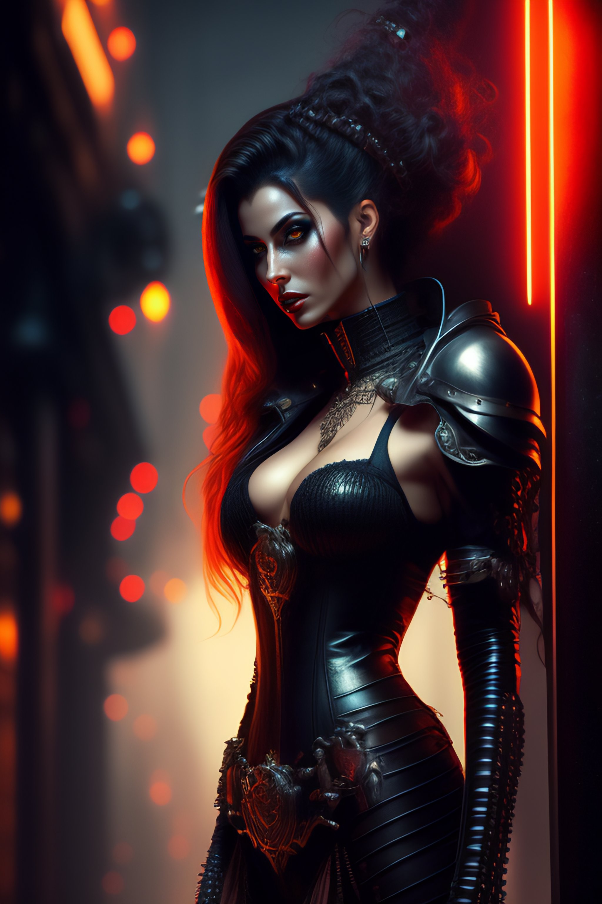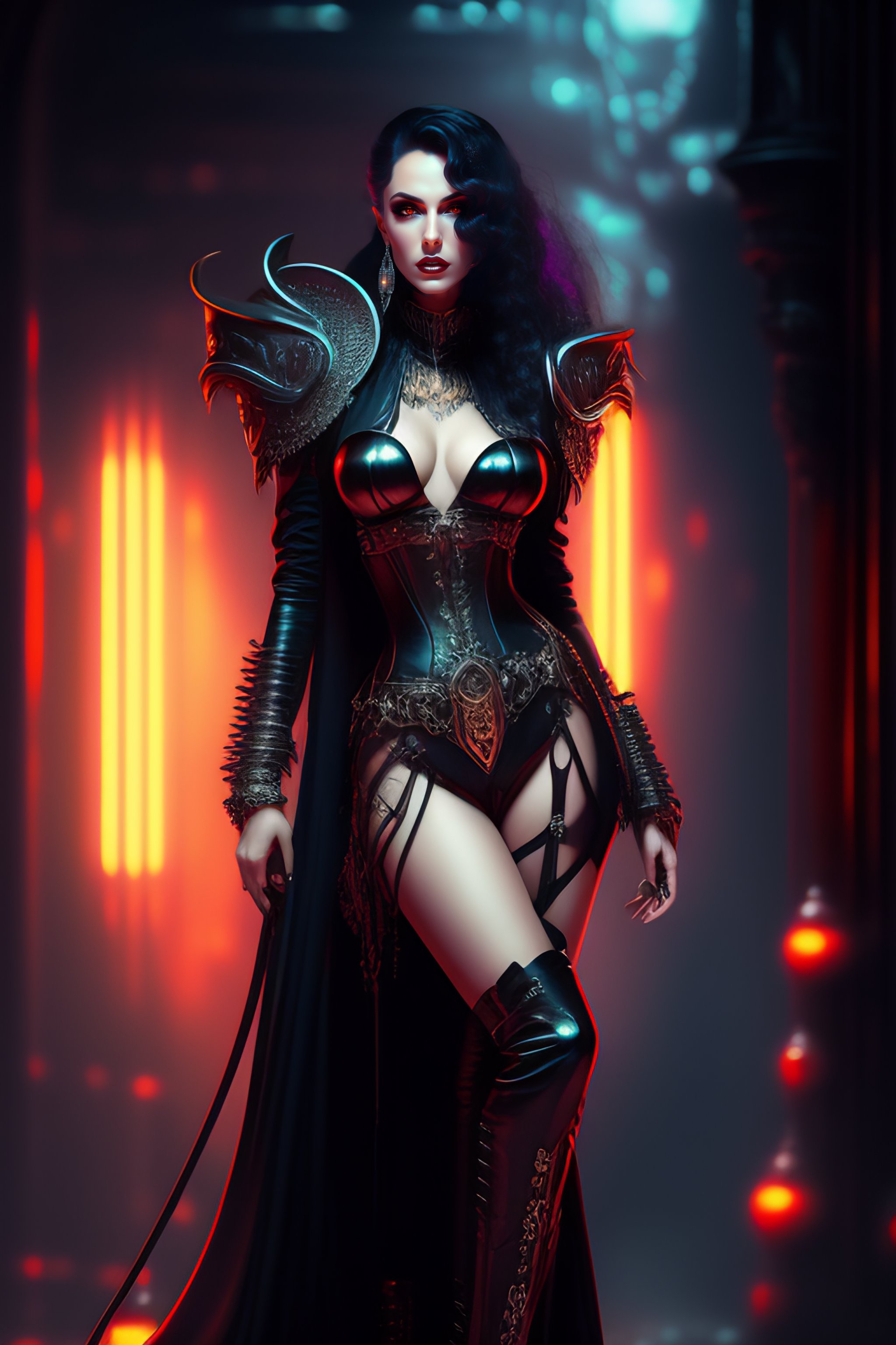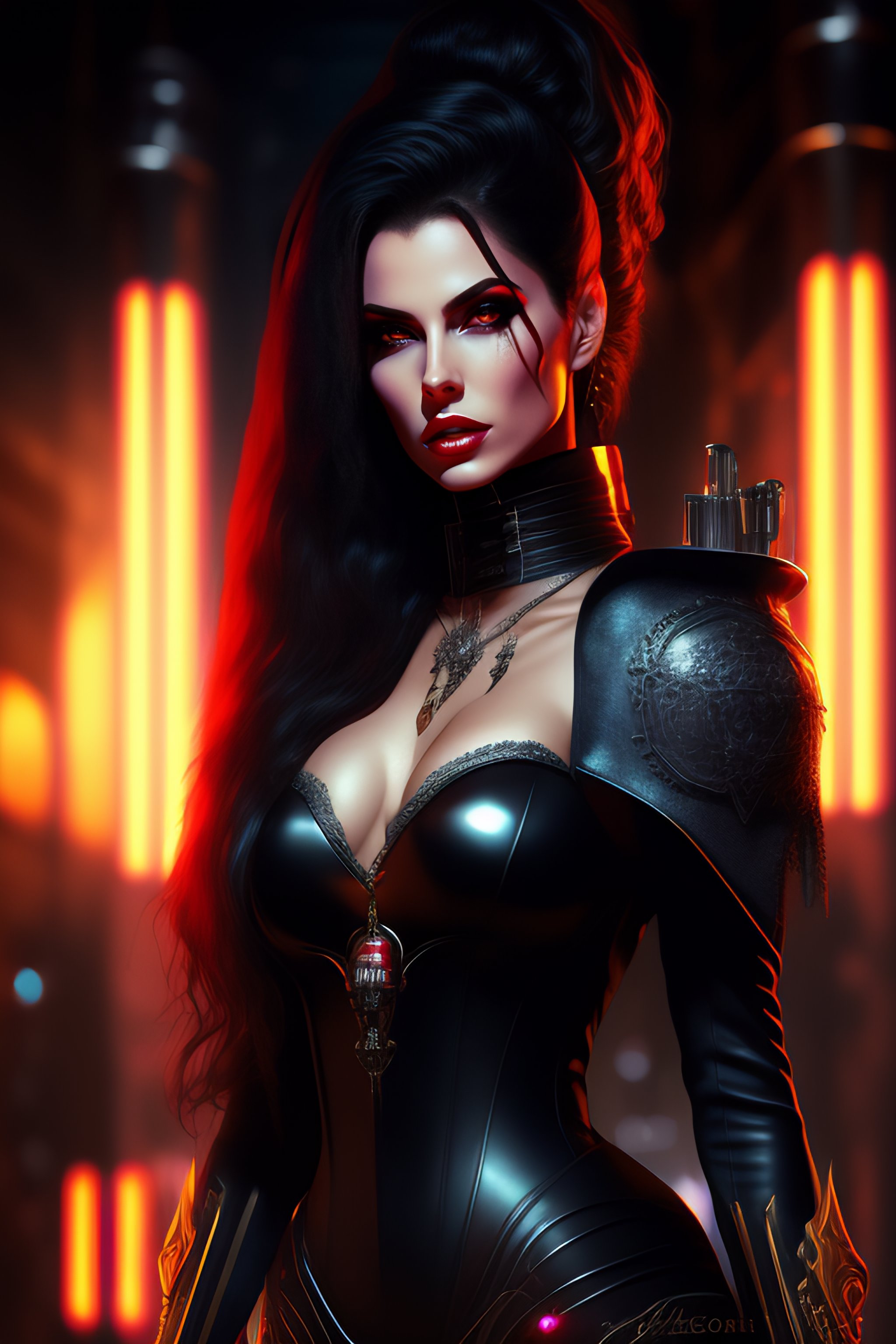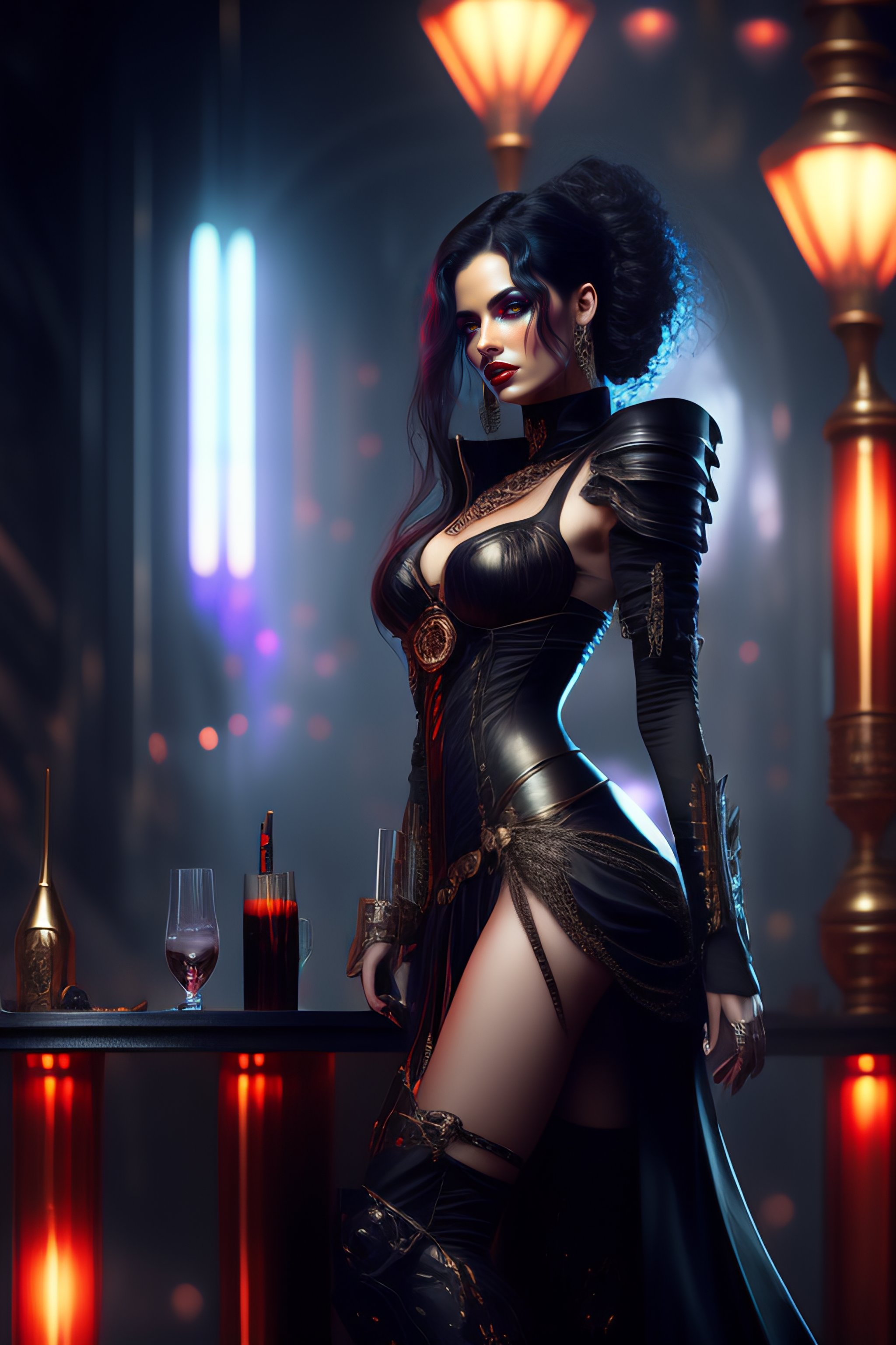 Female vampire, full body cinematic style digital art render with mechanical and futuristic details in a cyberpunk underworld, (((drinking a bloody cocktail))), moody atmospheric lighting, bizarre, dangerous, art by louis royo and giger