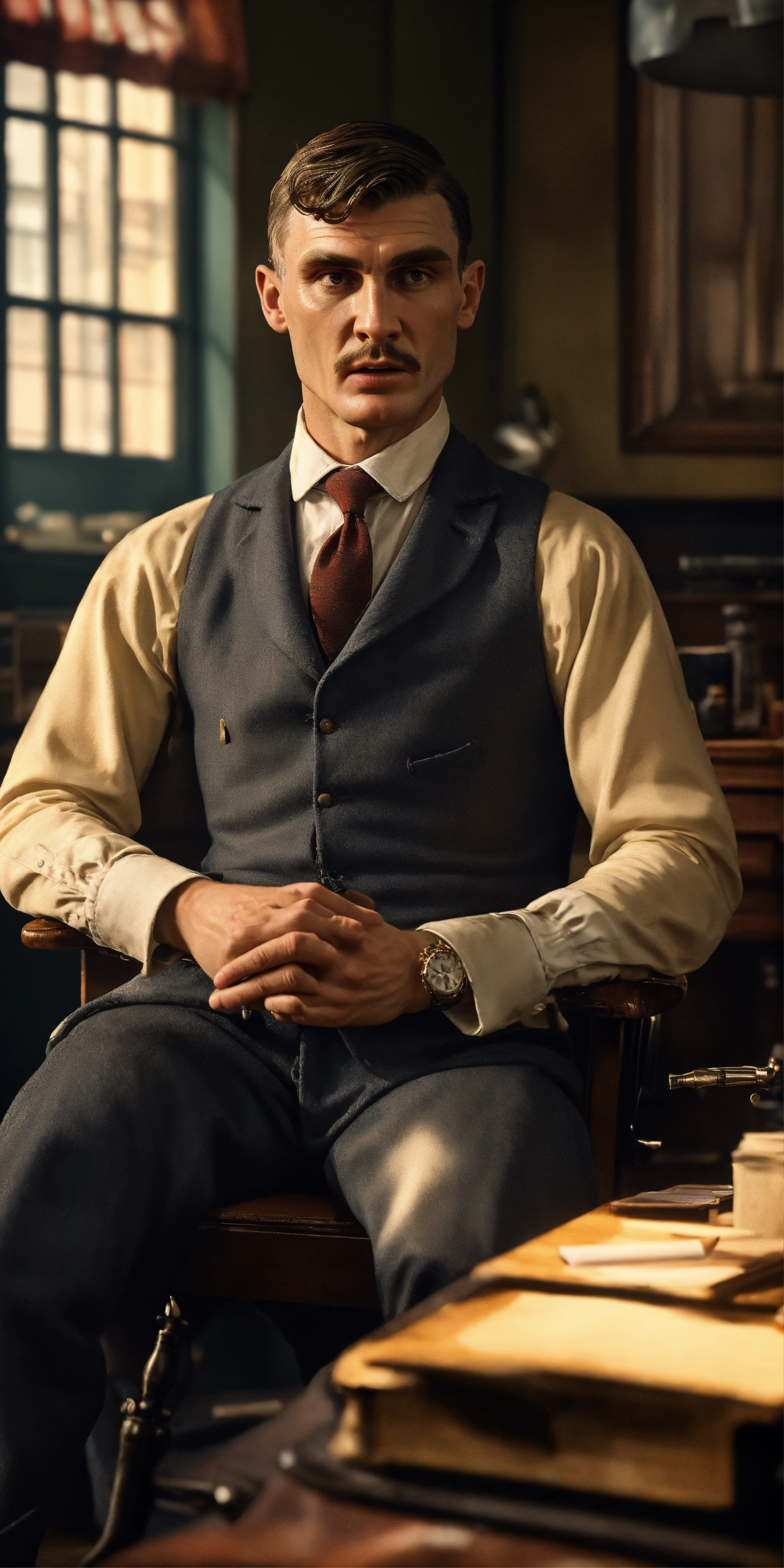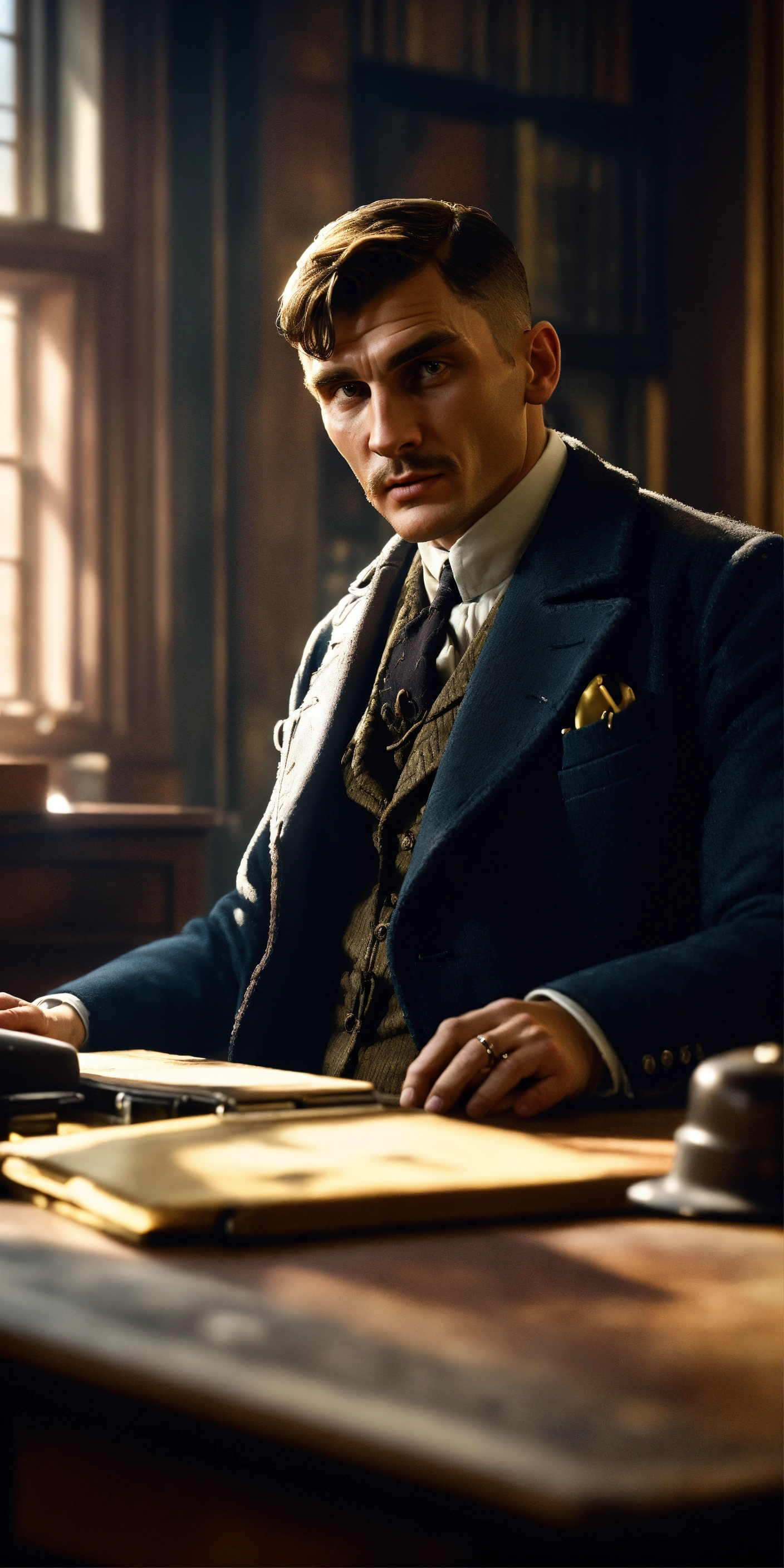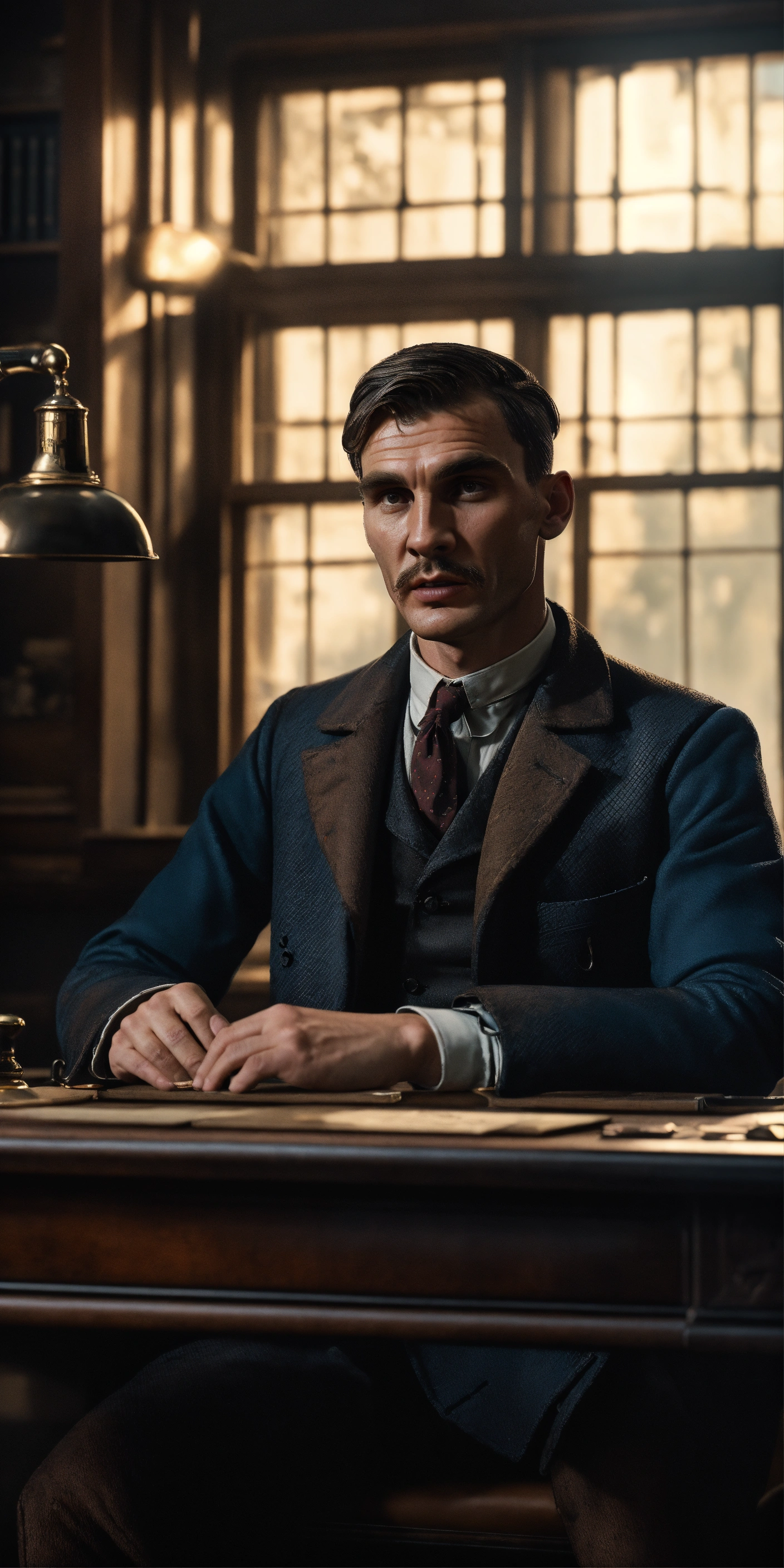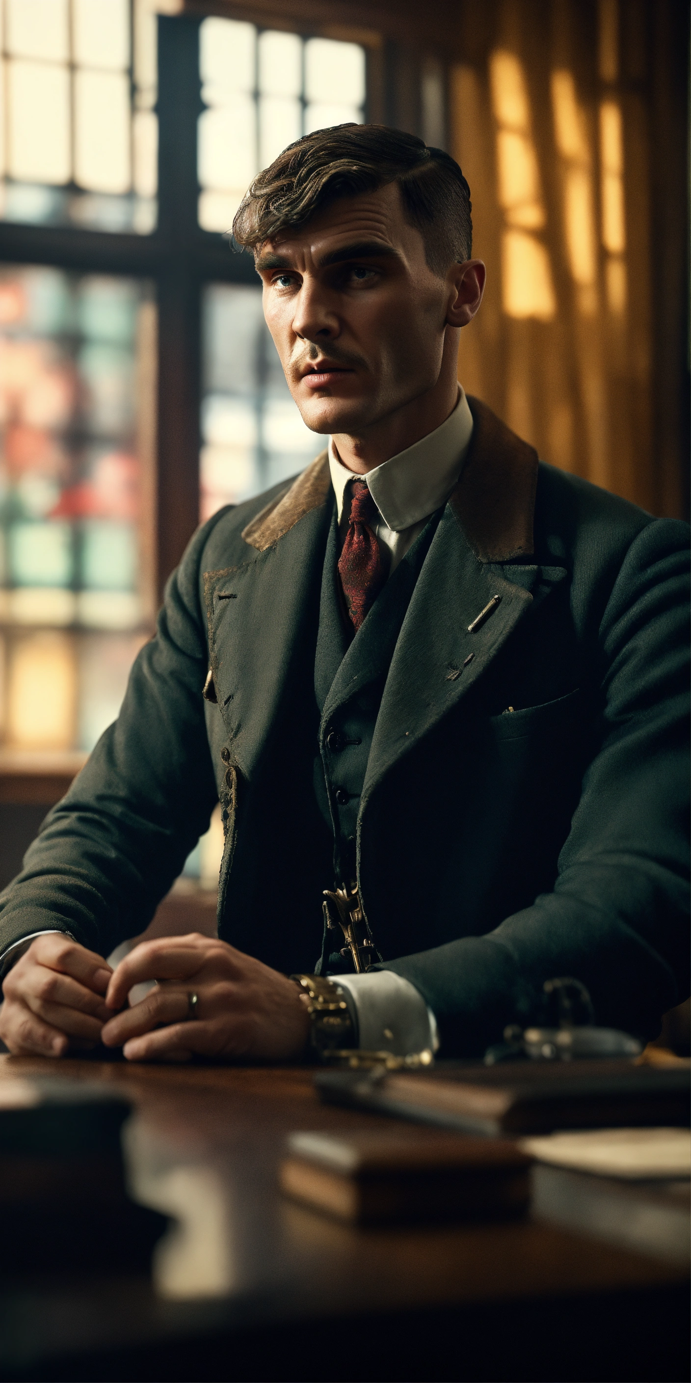 Character in the style of thomas shelby, front view, brightly colored image background, placing the character sitting behind a desk, looking towards the camera, with a large window behind, sharp focus, hyper-realistic and cinematic lighting, very detailed, 8k, autofocus creates an incredibly realistic image