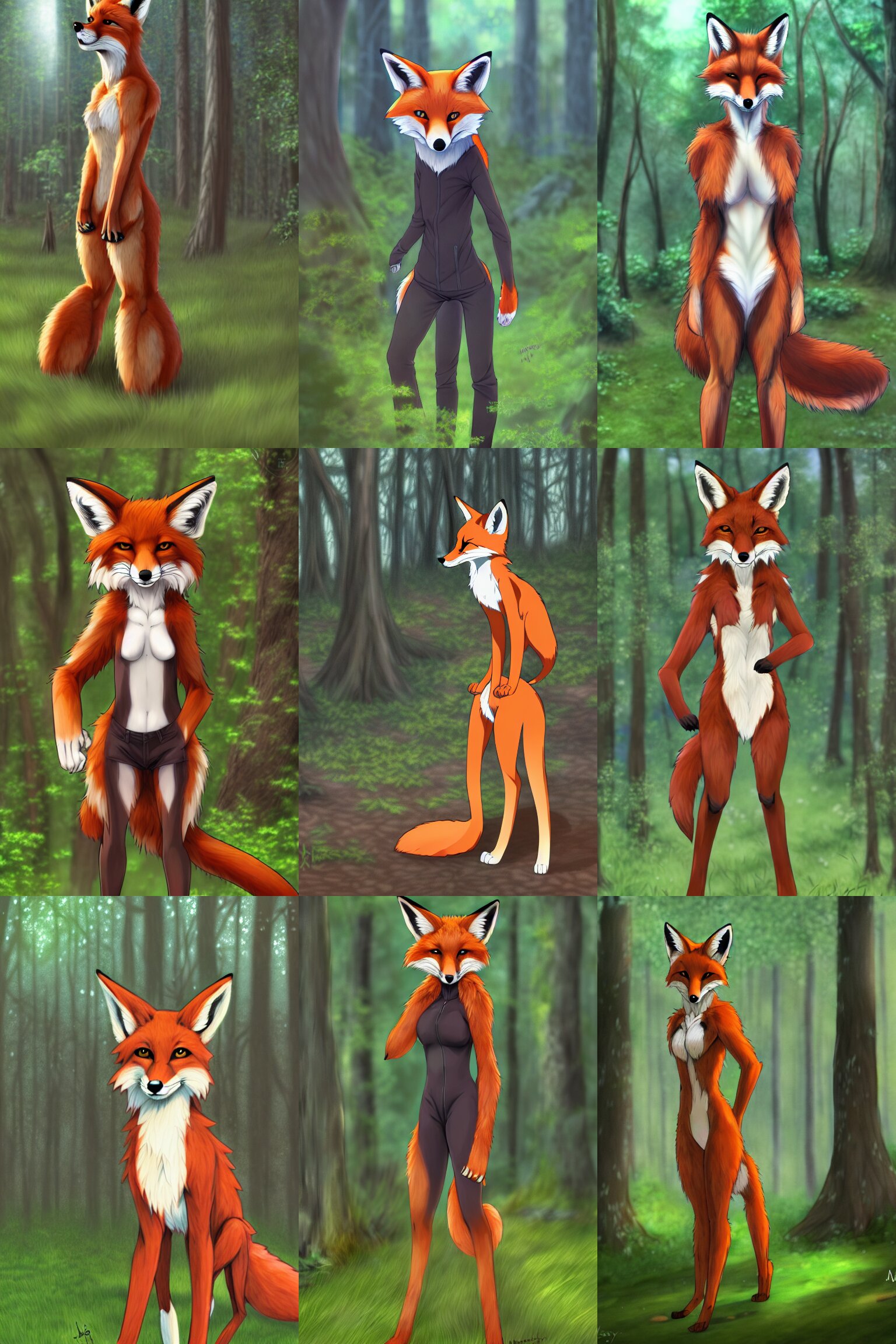 Furry art, anthro digitigrade fox standing in a forest, fursona commission, photorealistic, extremely detailed, anime key visual, pixiv, makoto shinkai, hibbary, dark natasha, goldenwolf, furaffinity, portrait