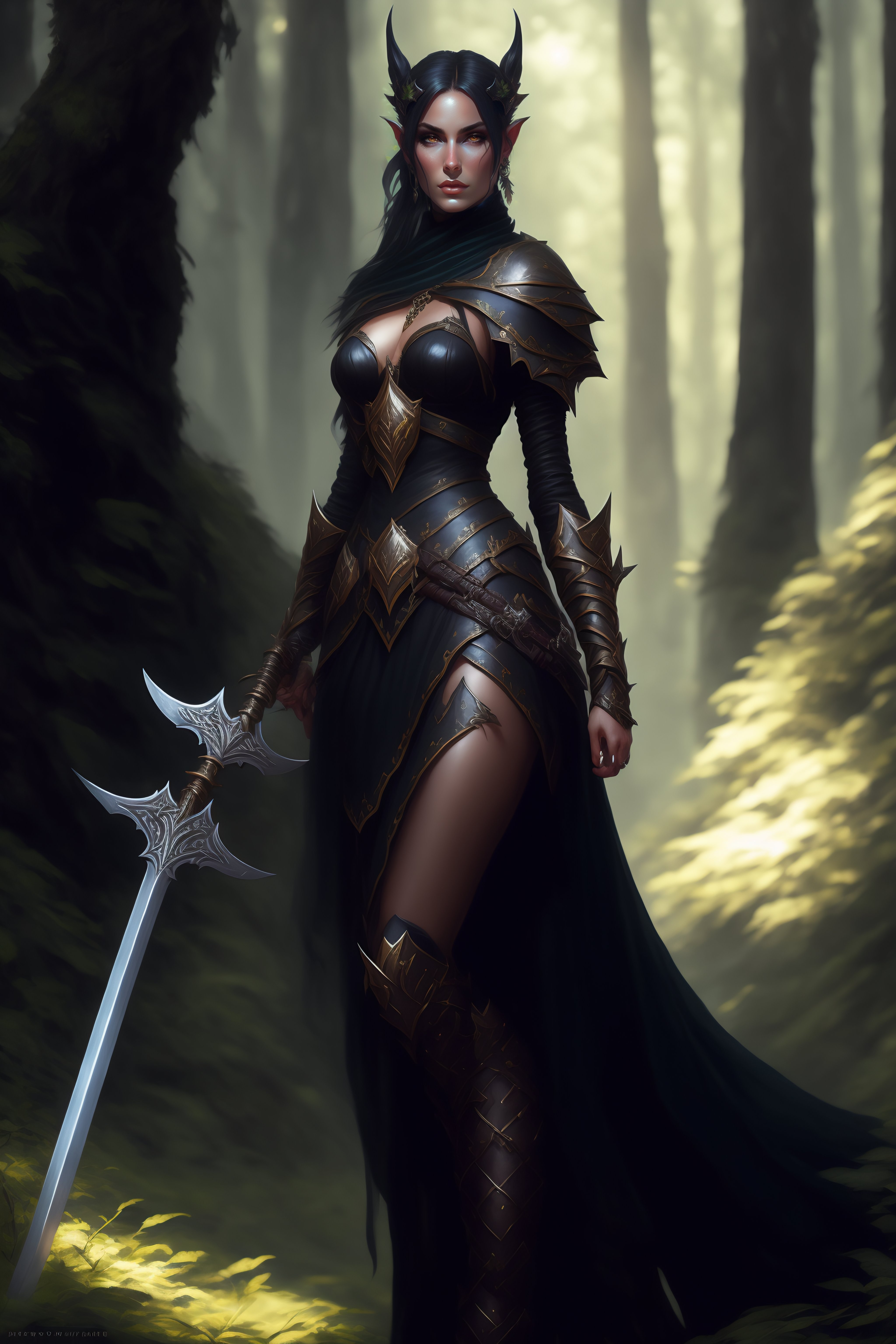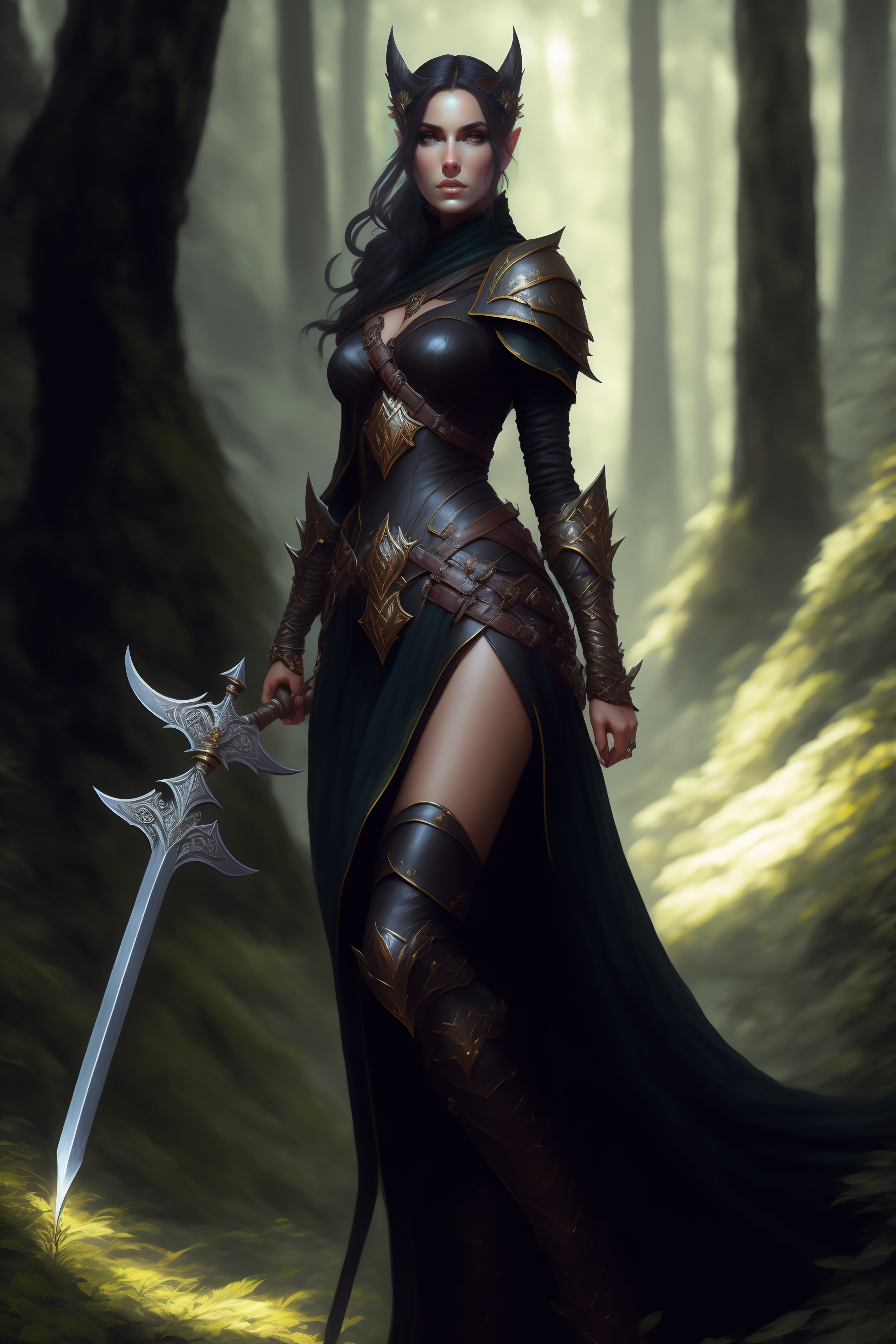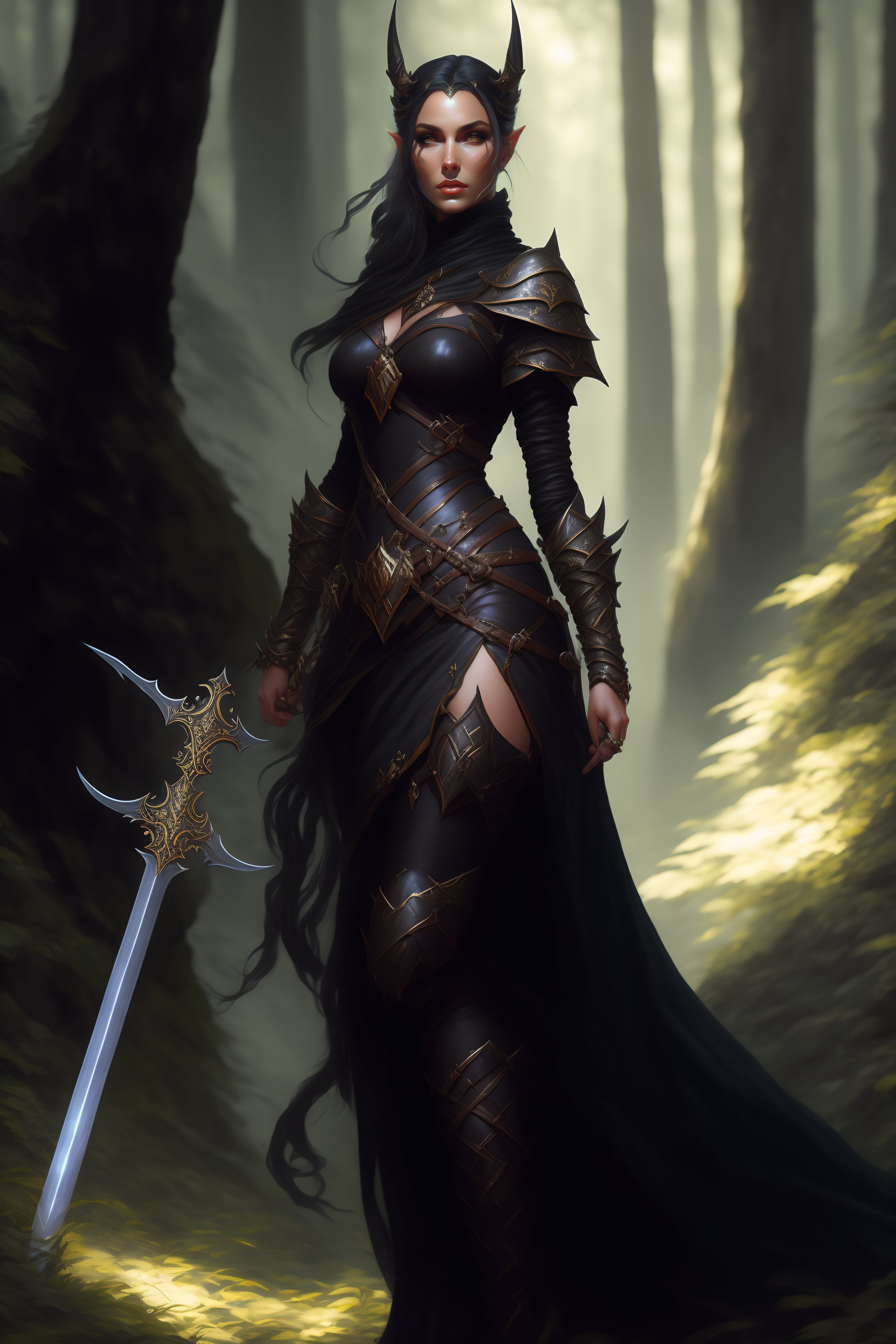 Rogue, elf female, black clothes, sword in hand, full body, forest, d&d, fantasy, intricate, elegant, highly detailed, digital painting, artstation, octane render, concept art, matte, sharp focus, illustration, hearthstone, art by artgerm and greg rutkowski and alphonse mucha