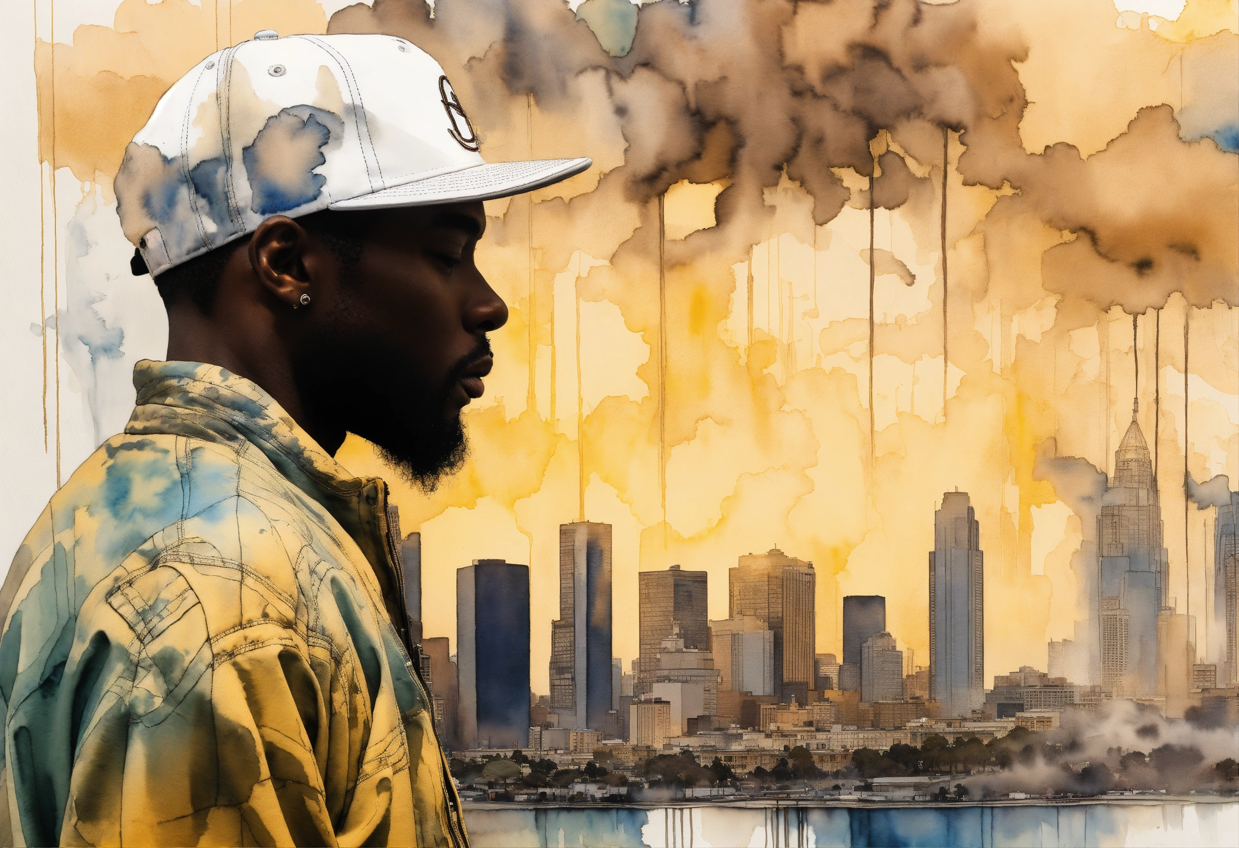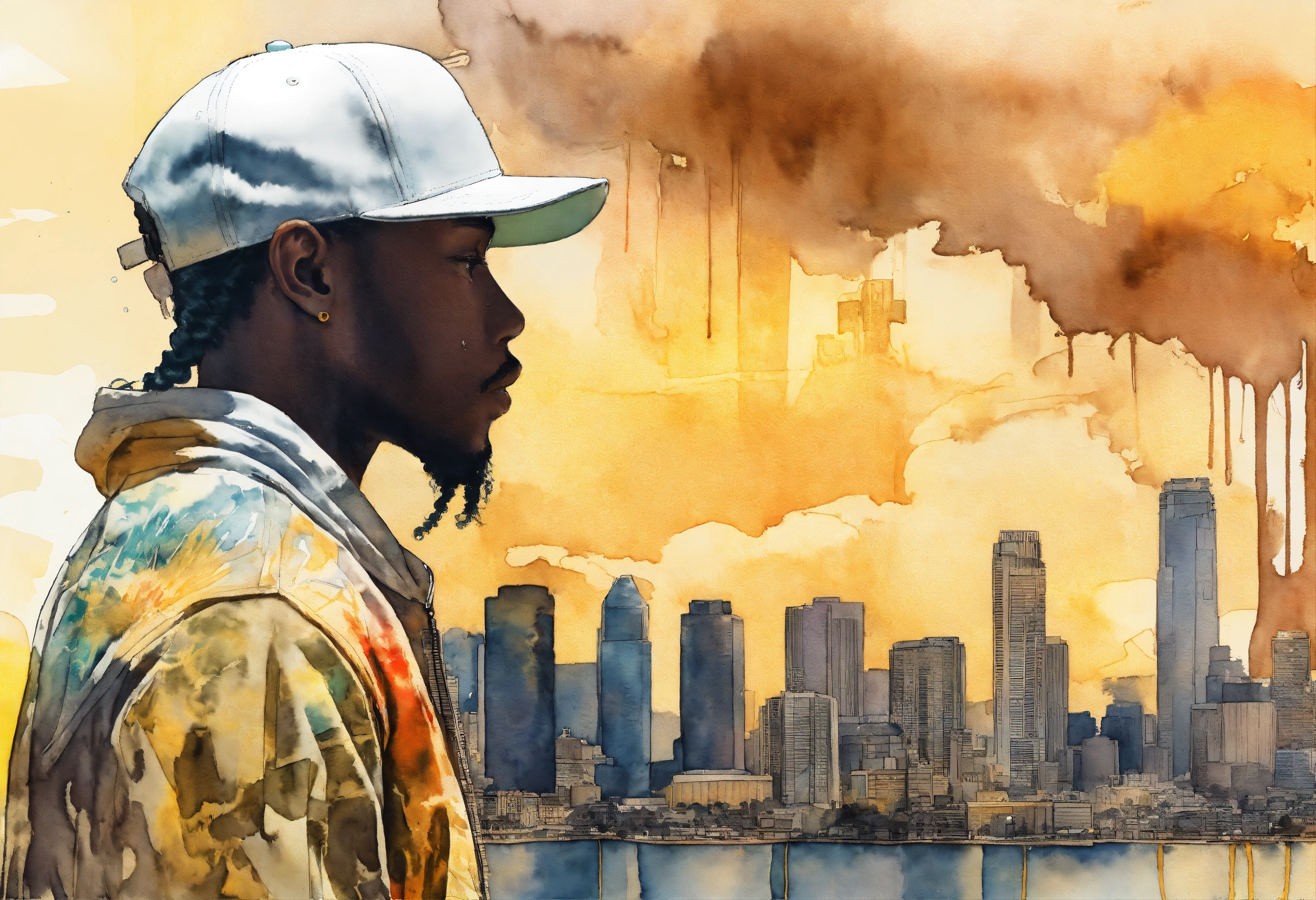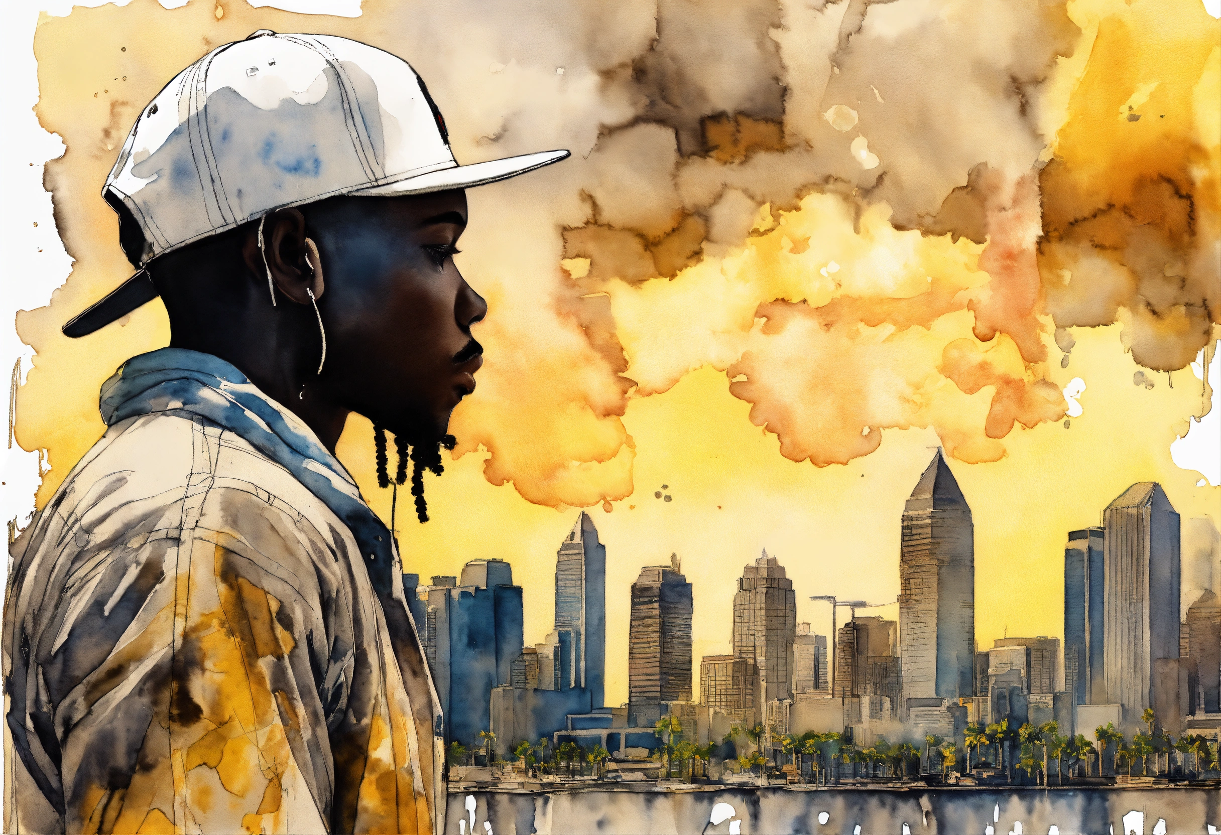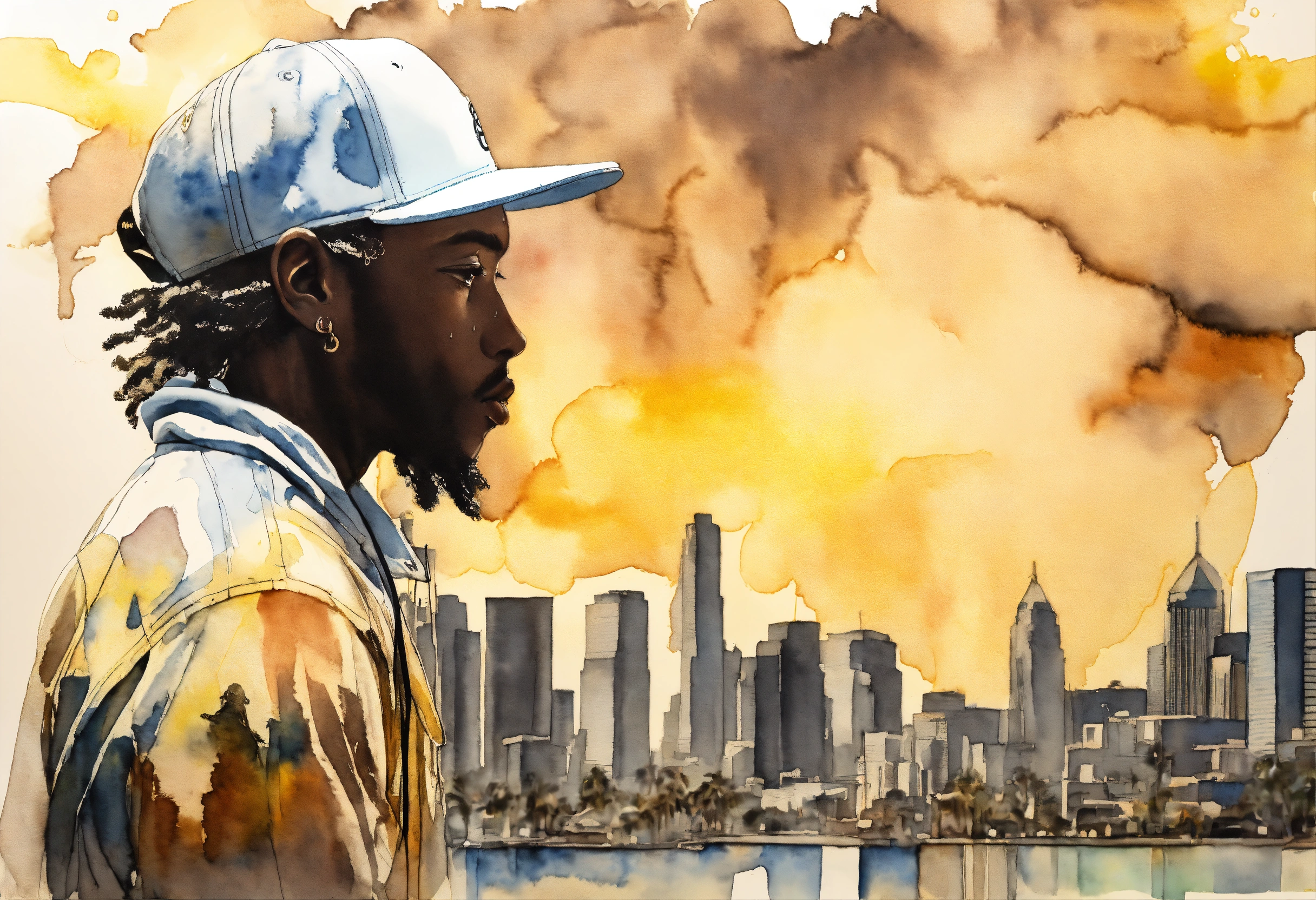 Exquisite watercolor with detailed pen and ink line drawing accents on a pure white paper background, where a faceless african american man with locs, his attire is a double exposure of the san diego, ca sunny skyline. with a snapback baseball hat on over long d-loc’s, loc twisted hairstyle, the city's landmarks become his sweat suit, merging beautifully double exposed with his clothing with his silhouette at 50% opacity. silhouette is half the opacity of the background to allow the skyline to be highlighted. the artwork's charm is further enhanced by ethereal colors of grey, brown, yellow and white represented in the smoke and a dramatic paint splash. double exposure overlay. manga kewpie faceless cartoon style
