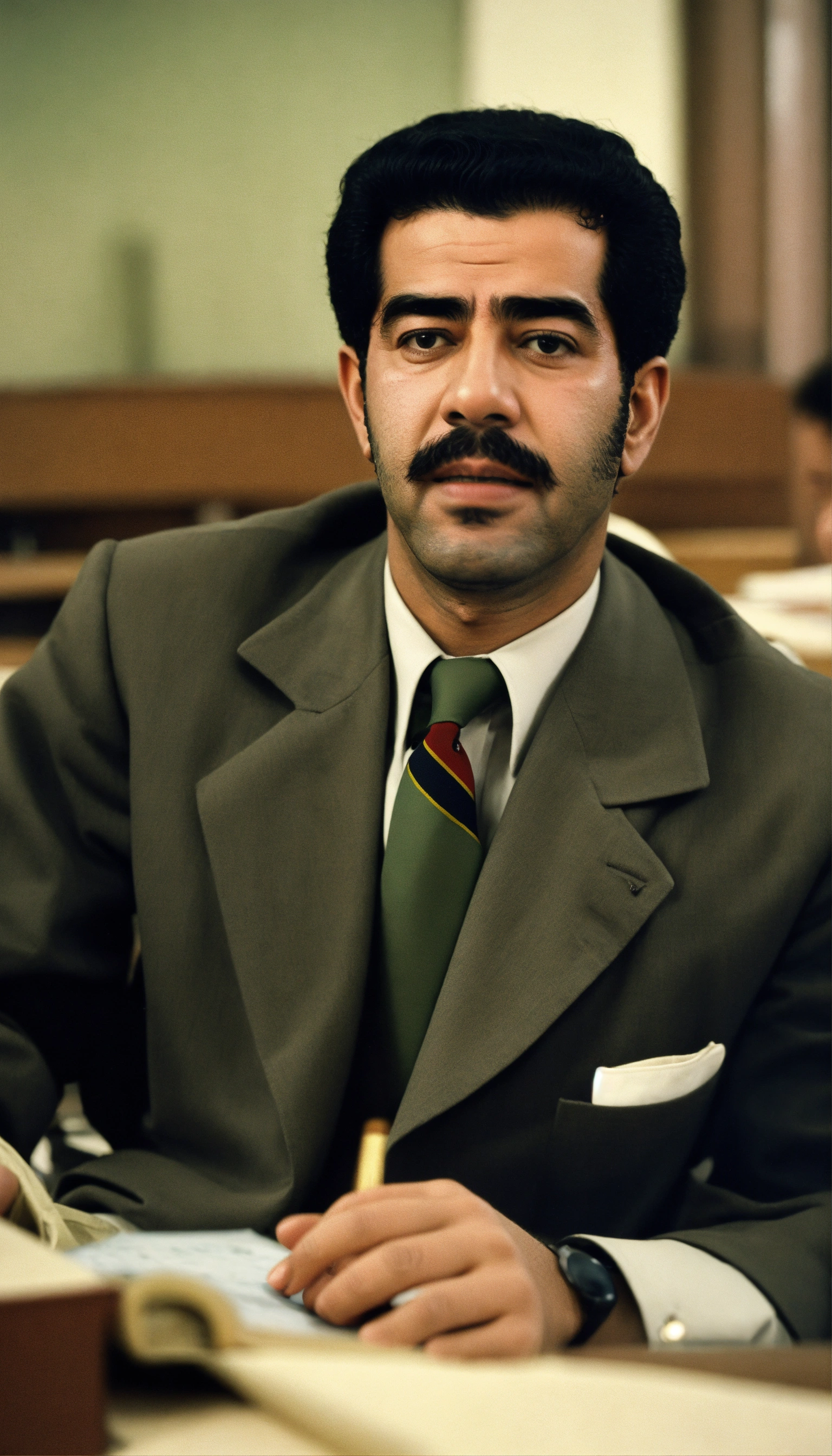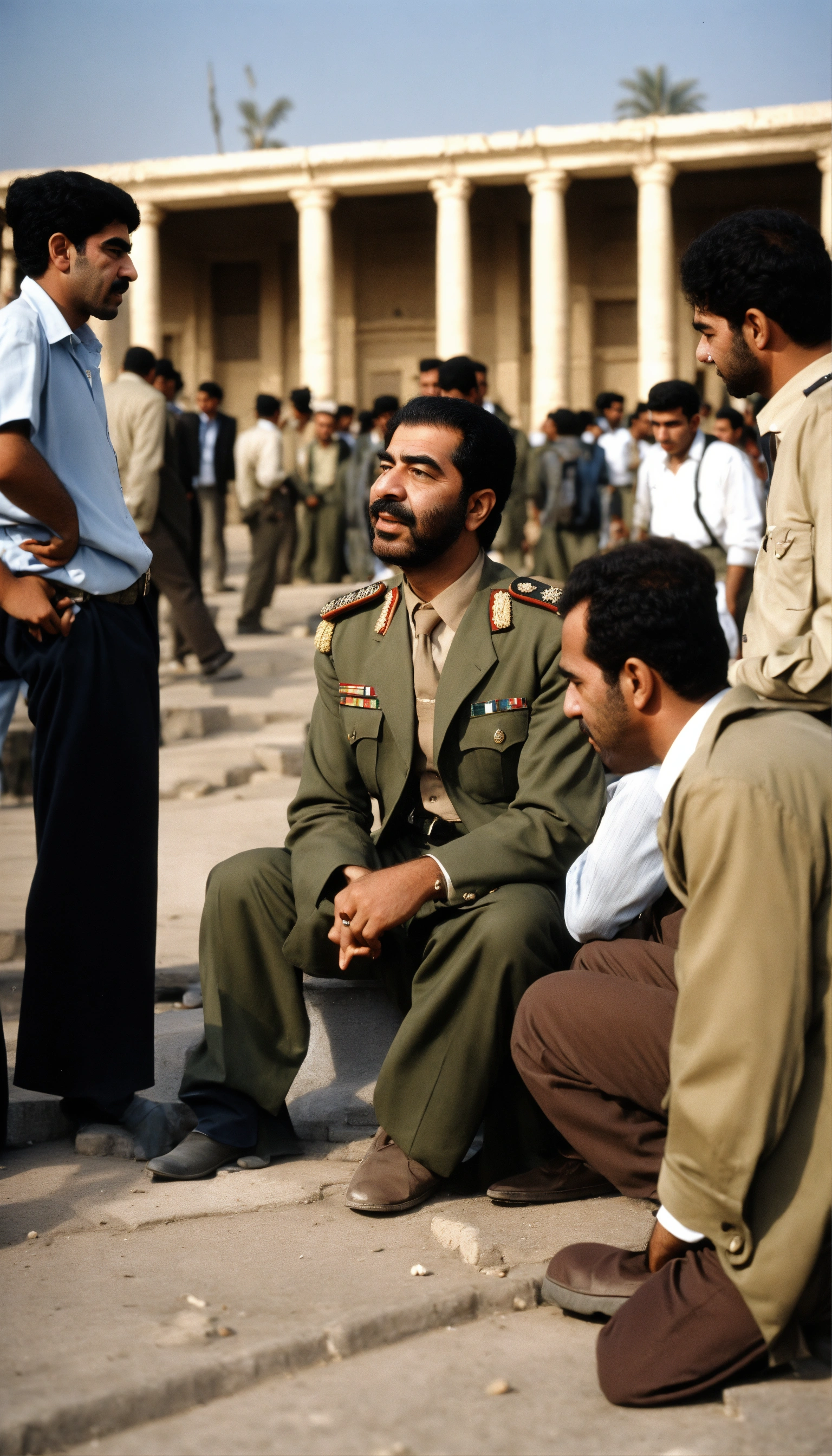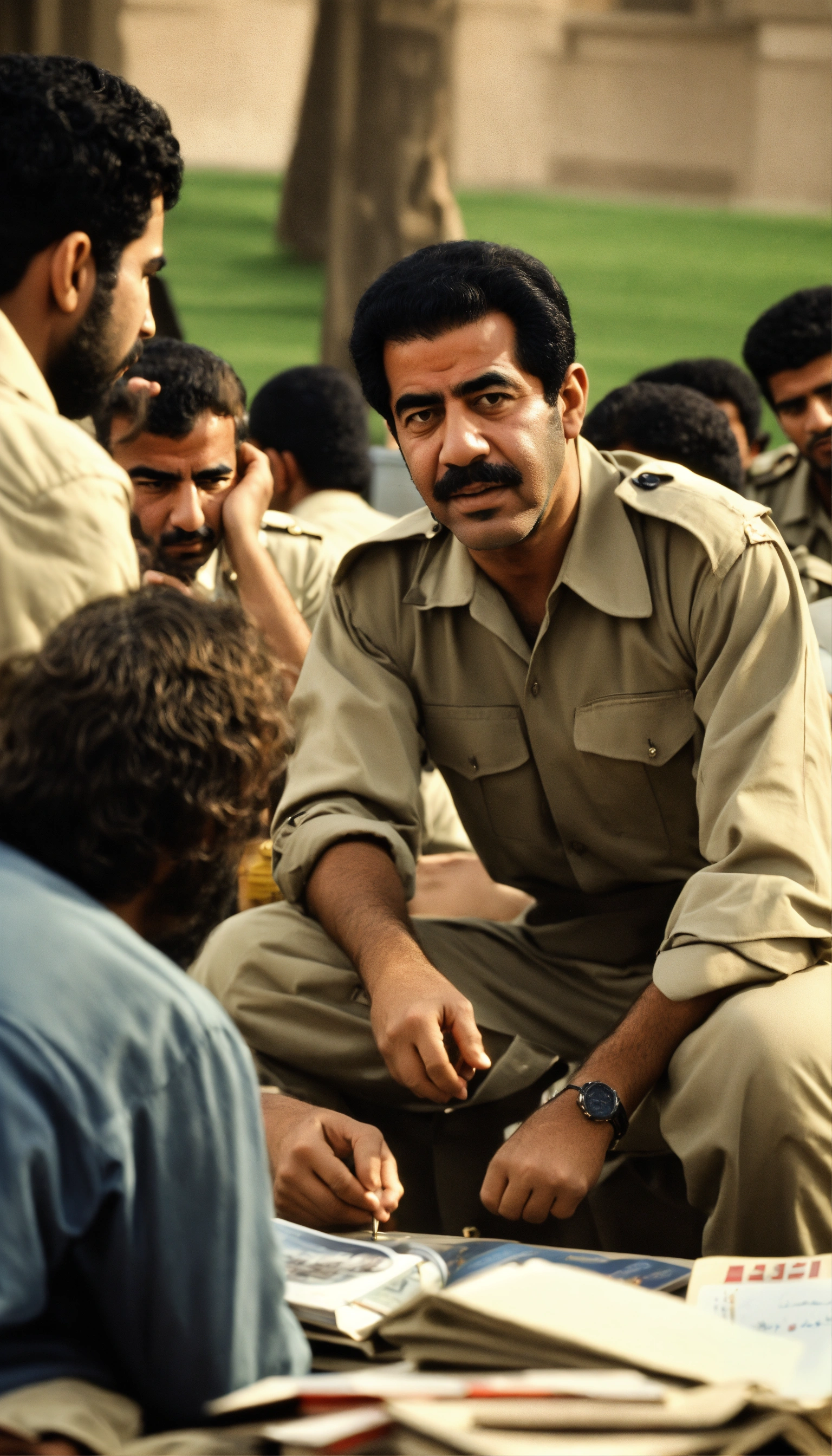 A young saddam hussein is having a discussion with other students on egypt's cairo university campus