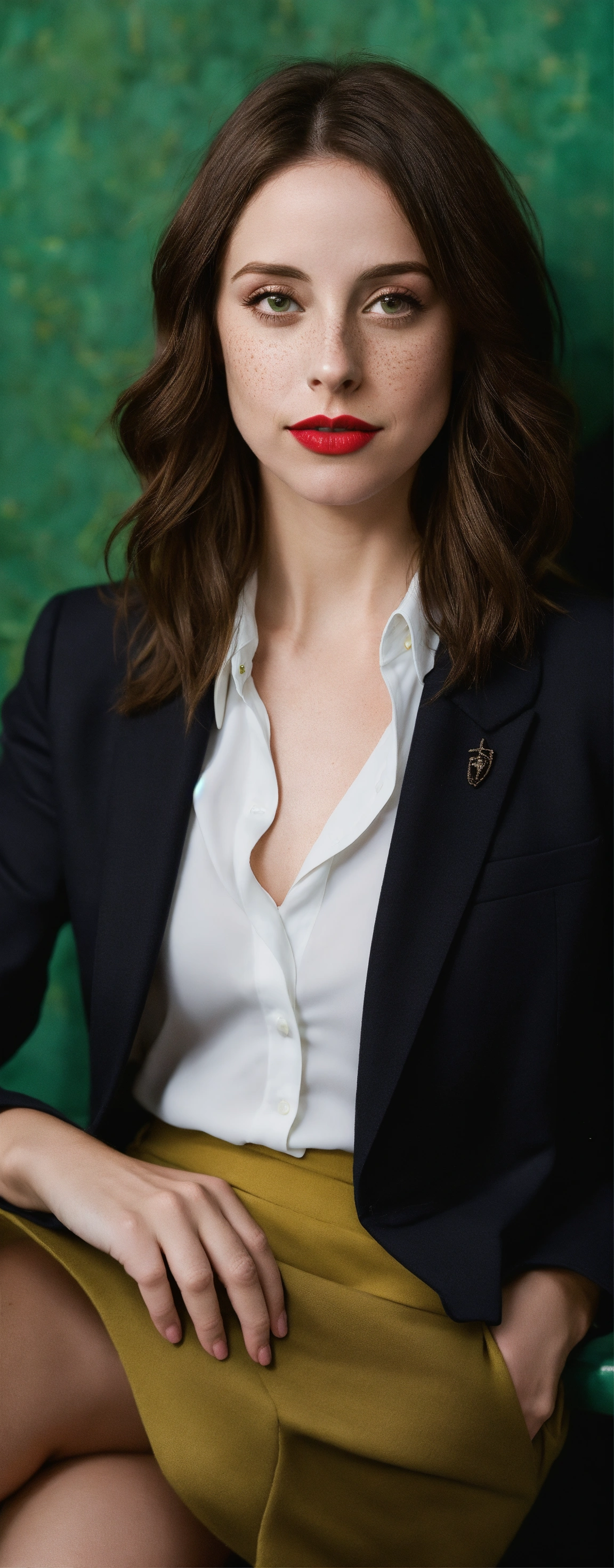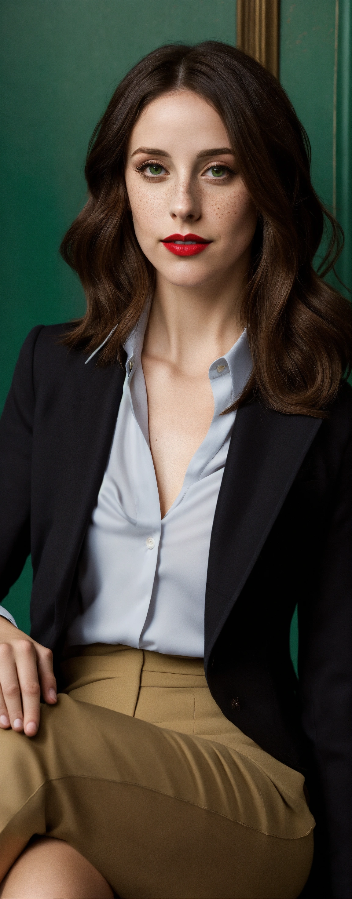 A photographic portrait of alison brie with neck lengthened, untied, greater bust, tight shirt, wide bust, she has green eyes, freckles on her face and red lipstick, form-fitting, curve-hugging, snug, tailored, close-cut, sculpted, defined, pronounced curves, shapely, casual, relaxed, laid-back, undone, informal, nonchalant, easygoing, disheveled, carefree, unbuttoned, unstructured, effortless, she wears a black suit jacket with a white shirt and black tie. her head is triangle shaped, preppy, elite, well-dressed, polished, sophisticated, form-fitting shirt, stylish, prestigious, private school attire, layered, hosiery, affluent, knee-high socks, upscale, traditional