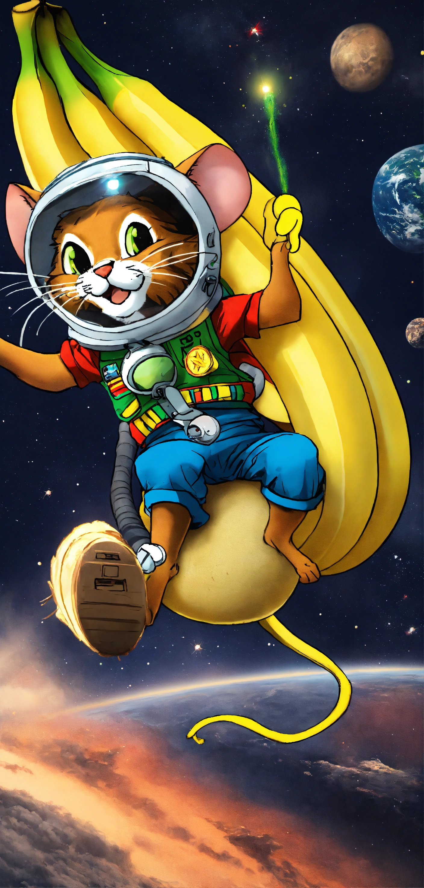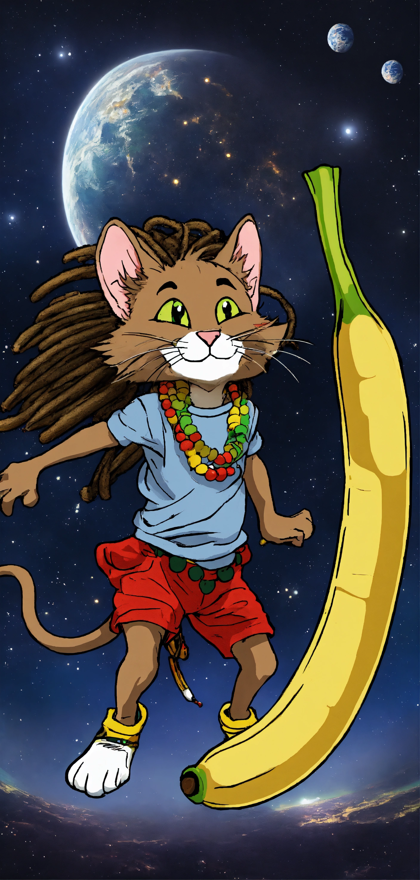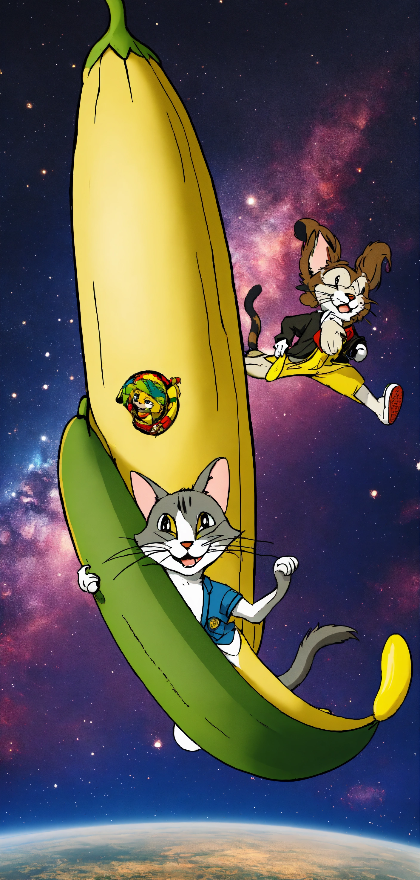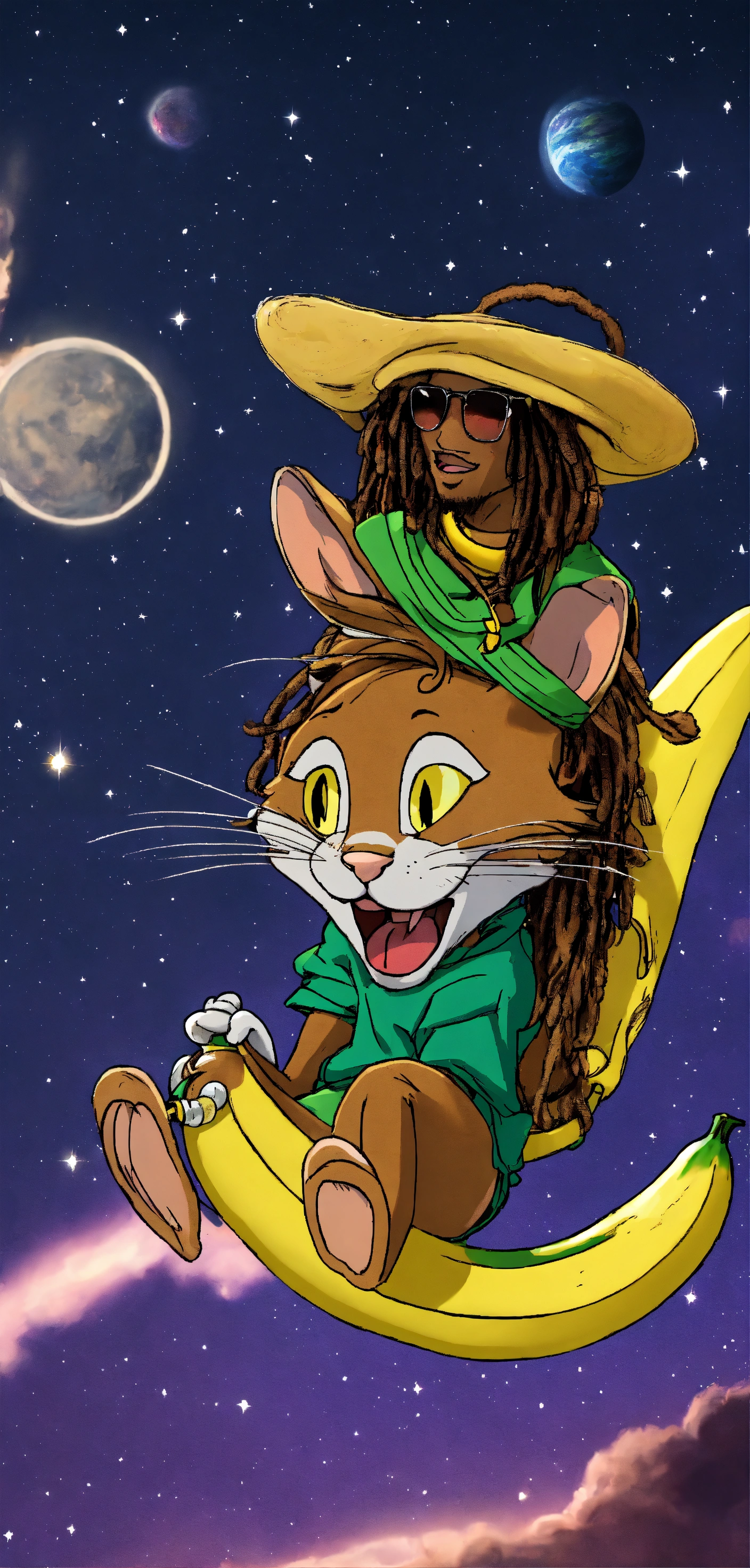 Rasta tom and jerry with dreadlocks riding a banana into space