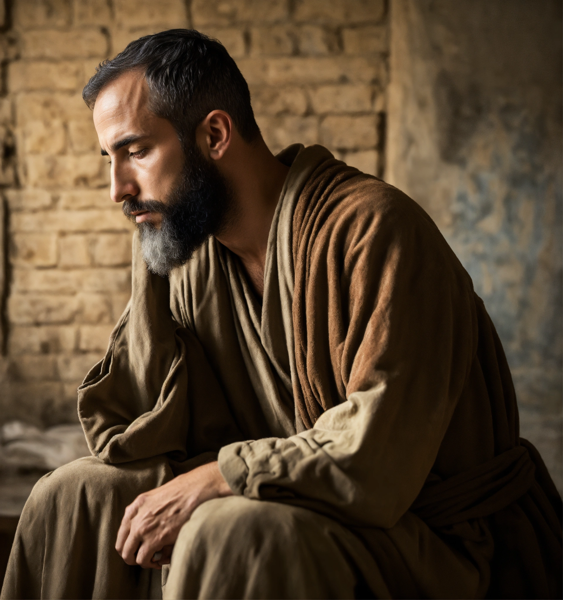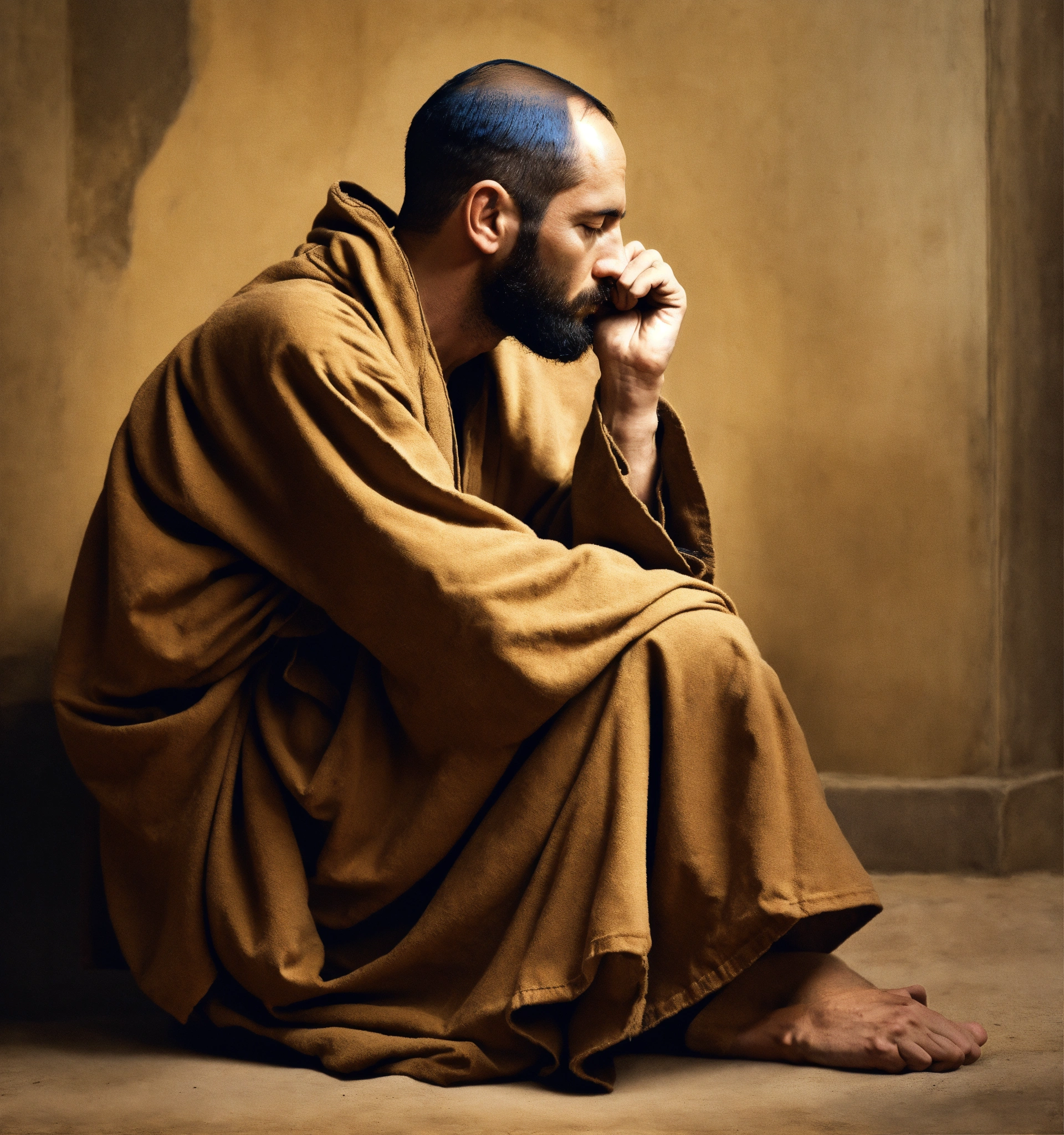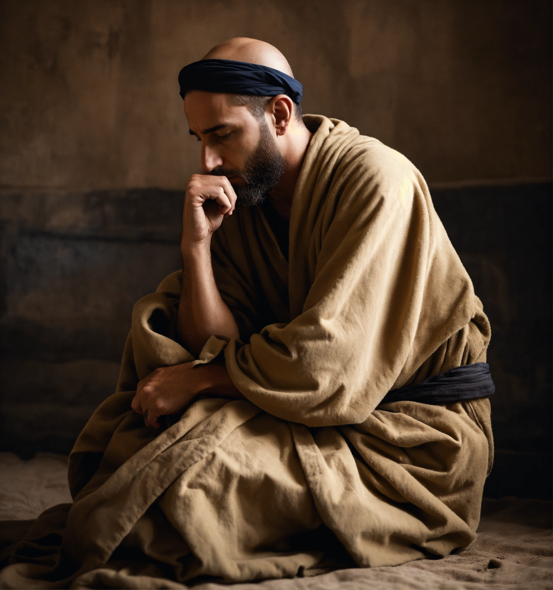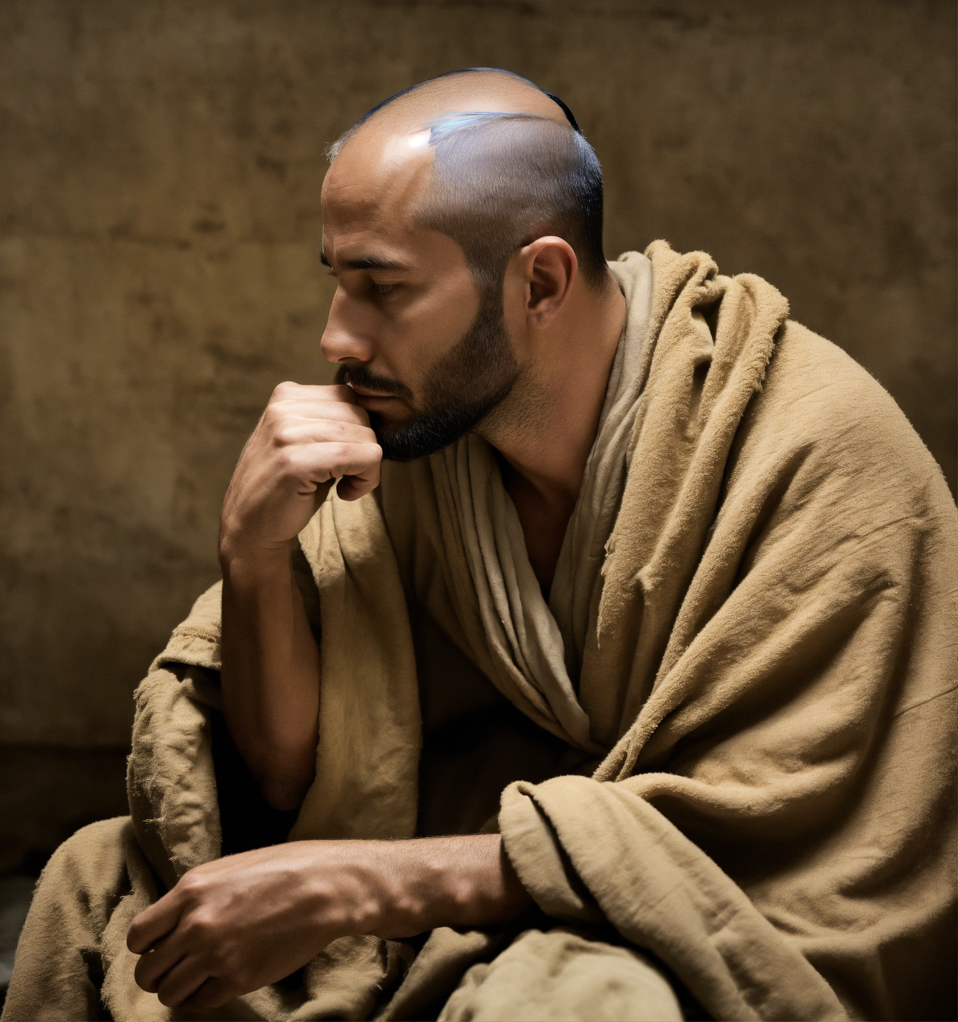 Side profile of an israel man clothes in dirty robes, sitting and contemplating, thinking deeply, 40 years old, his head is resting on a close fist, realistic, sharp